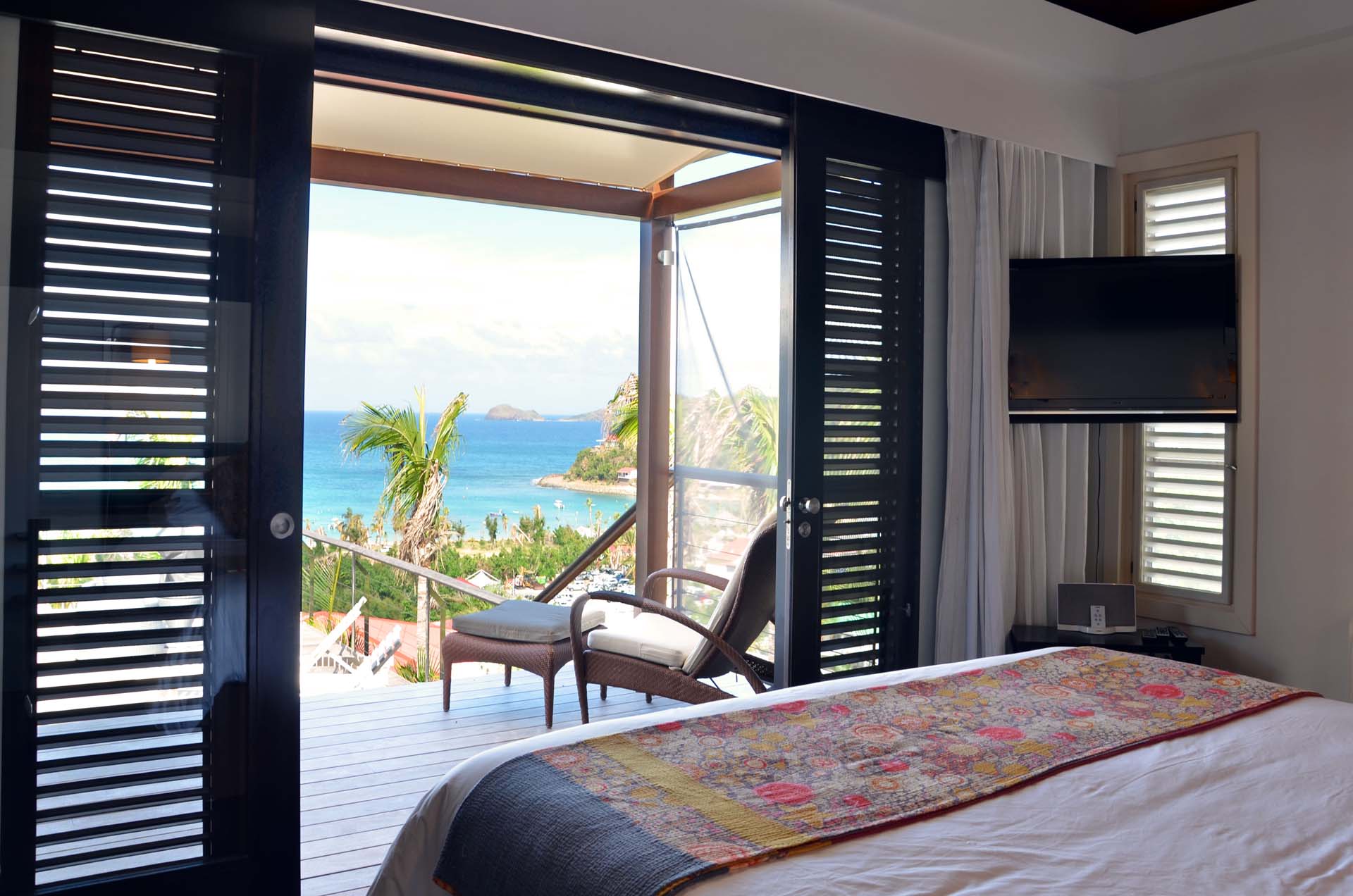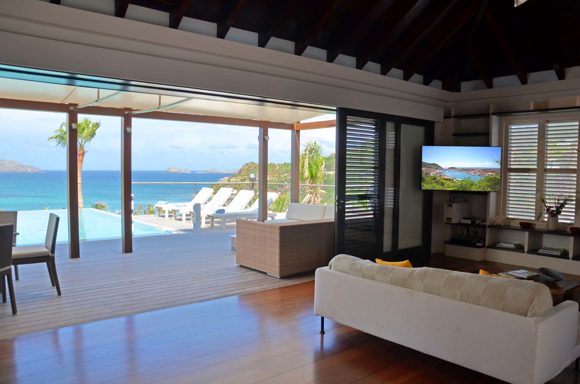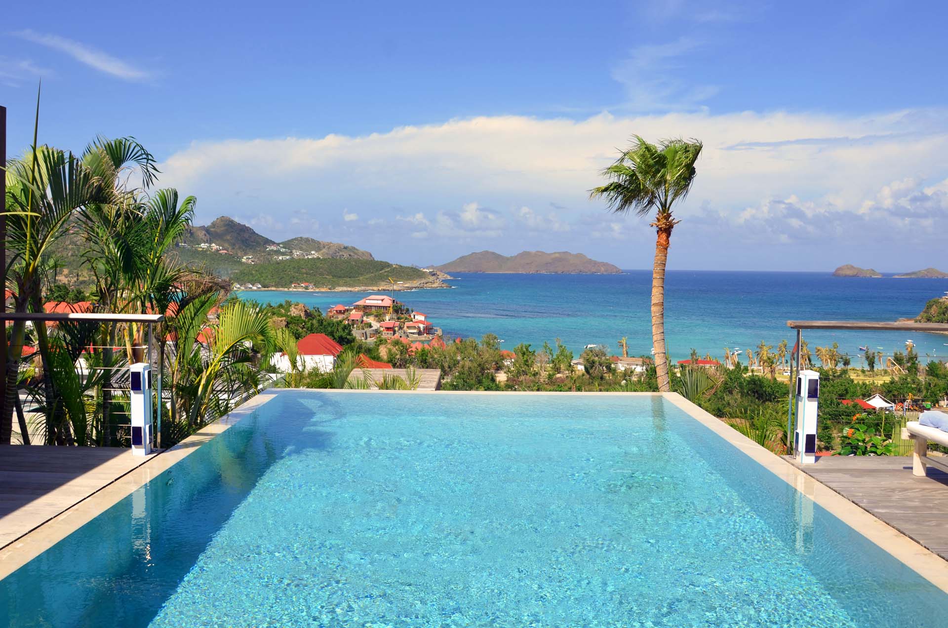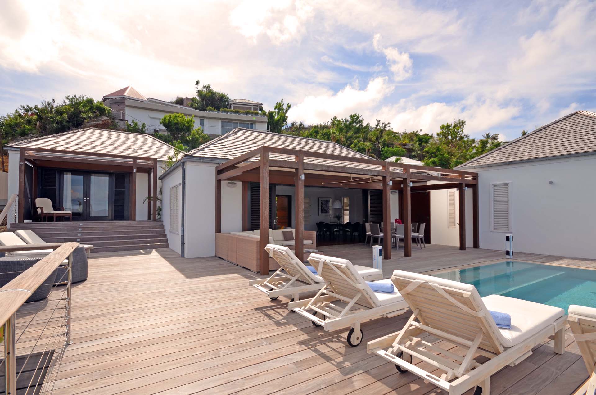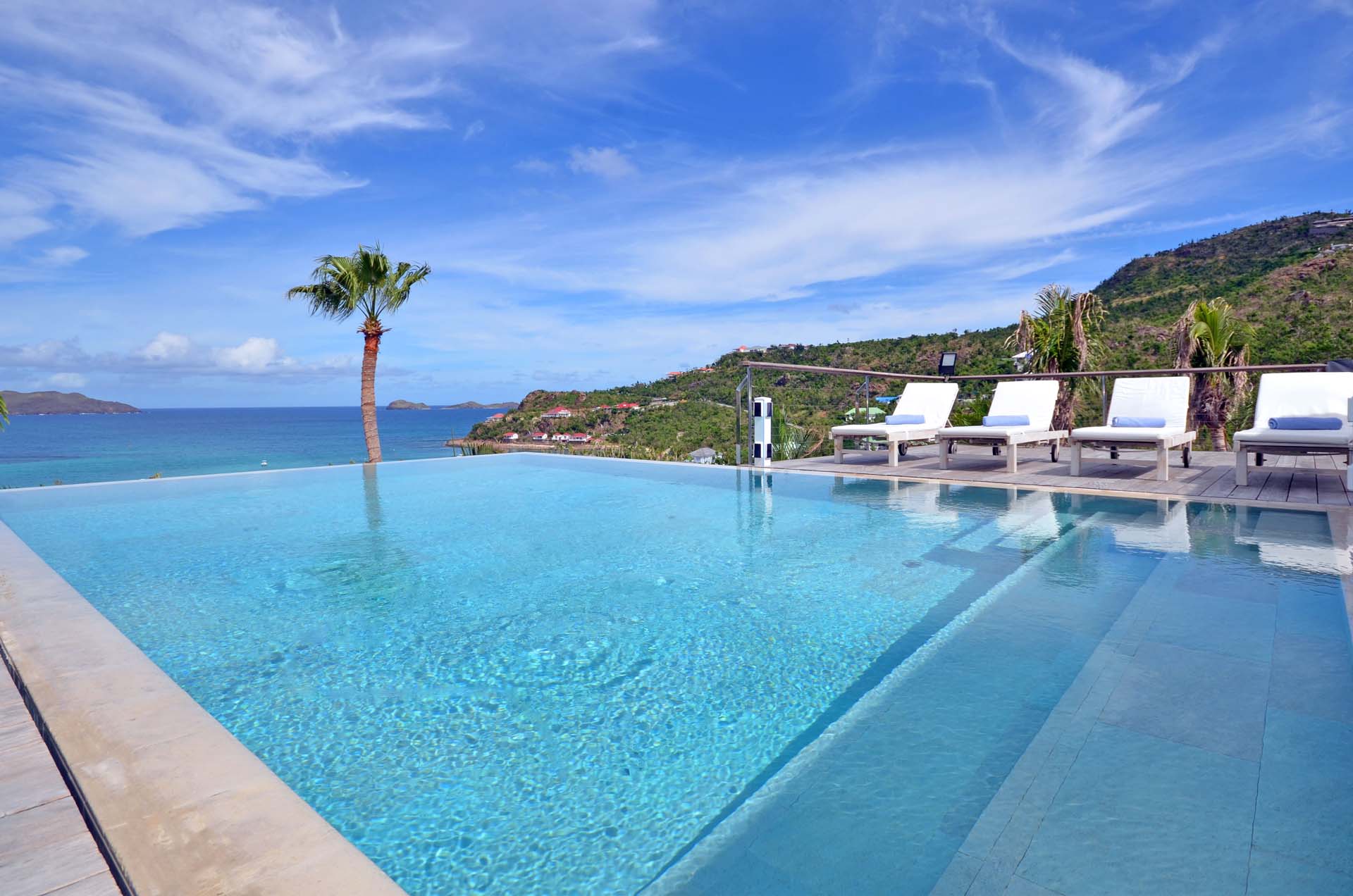 Poised hillside in popular St. Jean, this 3 bedroom villa offers casually elegant comfort making it ideal for a St. Barth villa vacation. An infinity edge pool is the focal point of an expansive deck and is an optimum spot to relax – toes up – and take in the stunning views, delightful breezes and the sound of rustling palms. A pergola is comfortably furnished for outdoor living and dining. Compact and sleek, the kitchen is outfitted to please a gourmet cook. It opens to a dining area that flows into the living space - ideal for TV viewing (Apple TV). The 3 spacious air-conditioned bedrooms all have en suite baths. Two (with king beds) are at opposite ends of the villa; pool level, they boast ocean views. The third is lower-level (its king bed is convertible to twins) and has a garden view. All are nice retreats.St.Jean Beach is just a short (but steep) walk away.Please fill out the form to begin your inquiry and we will connect you with a seasoned villa rental specialist.
