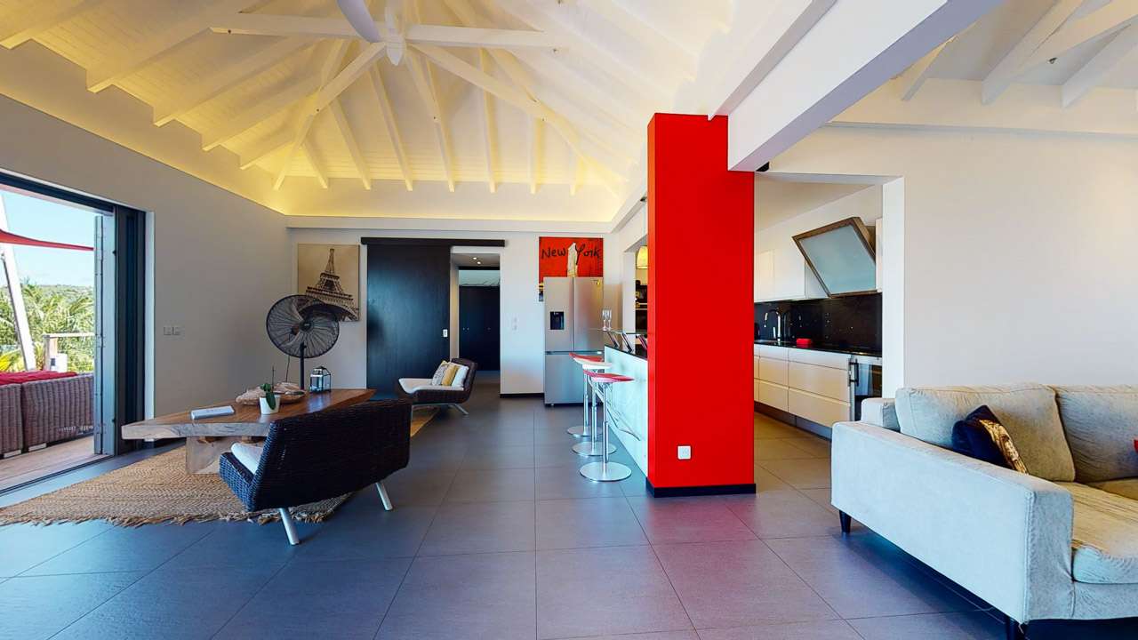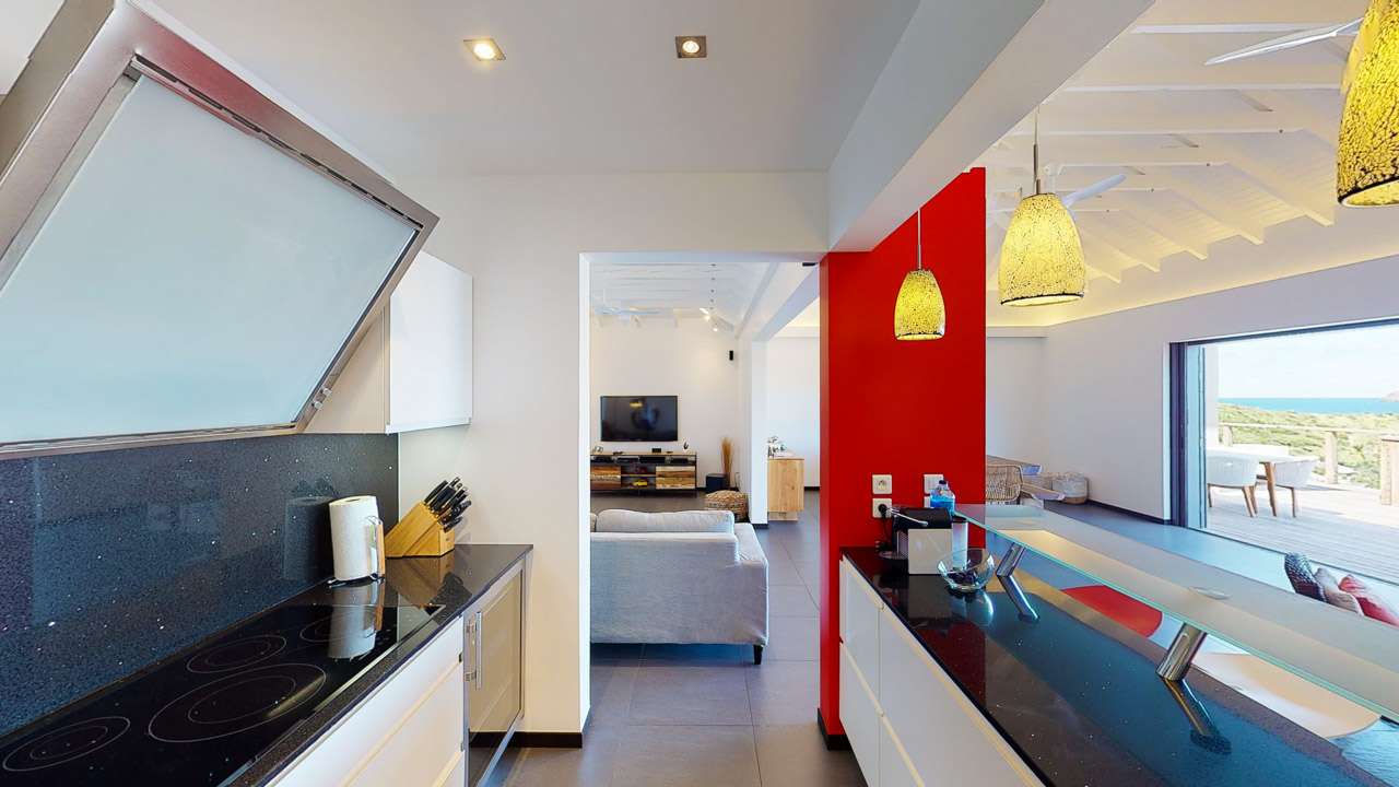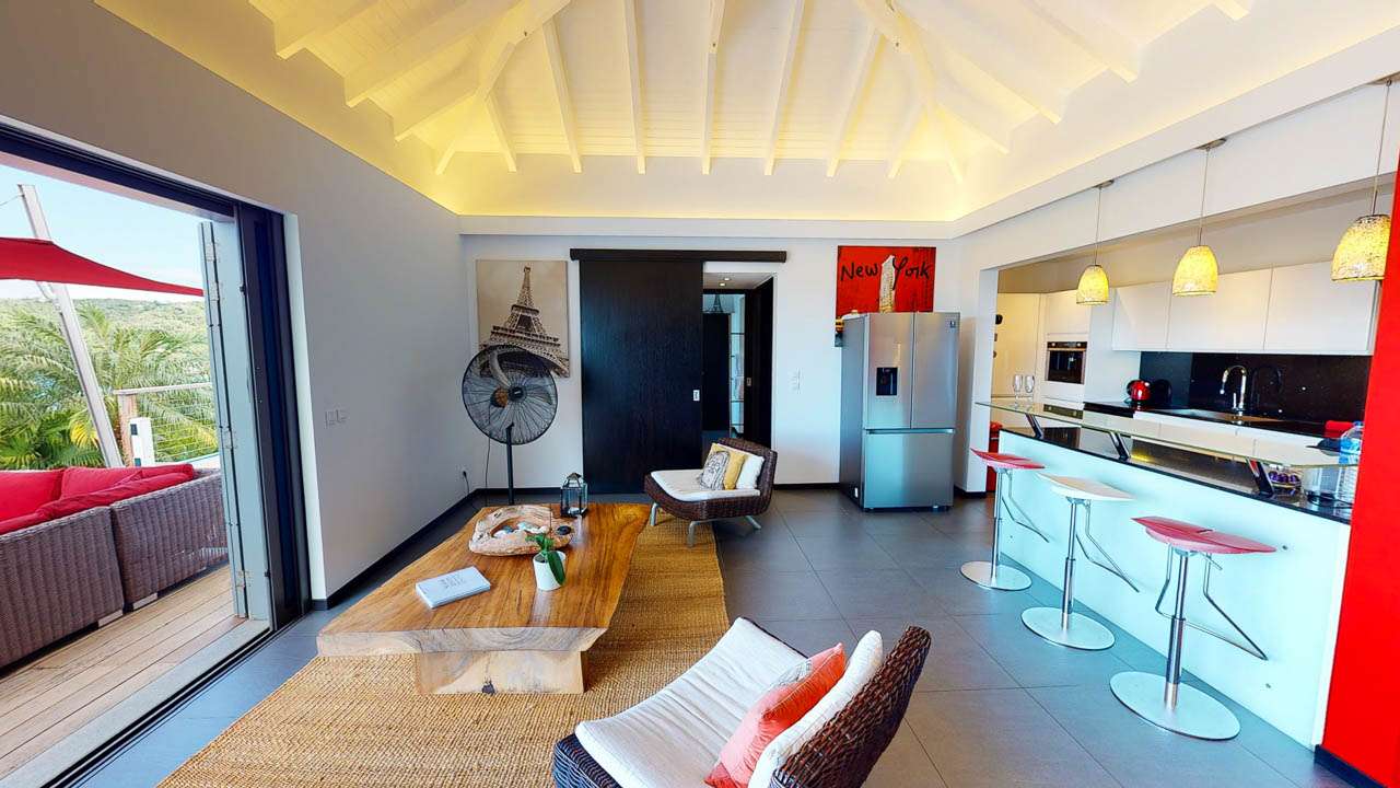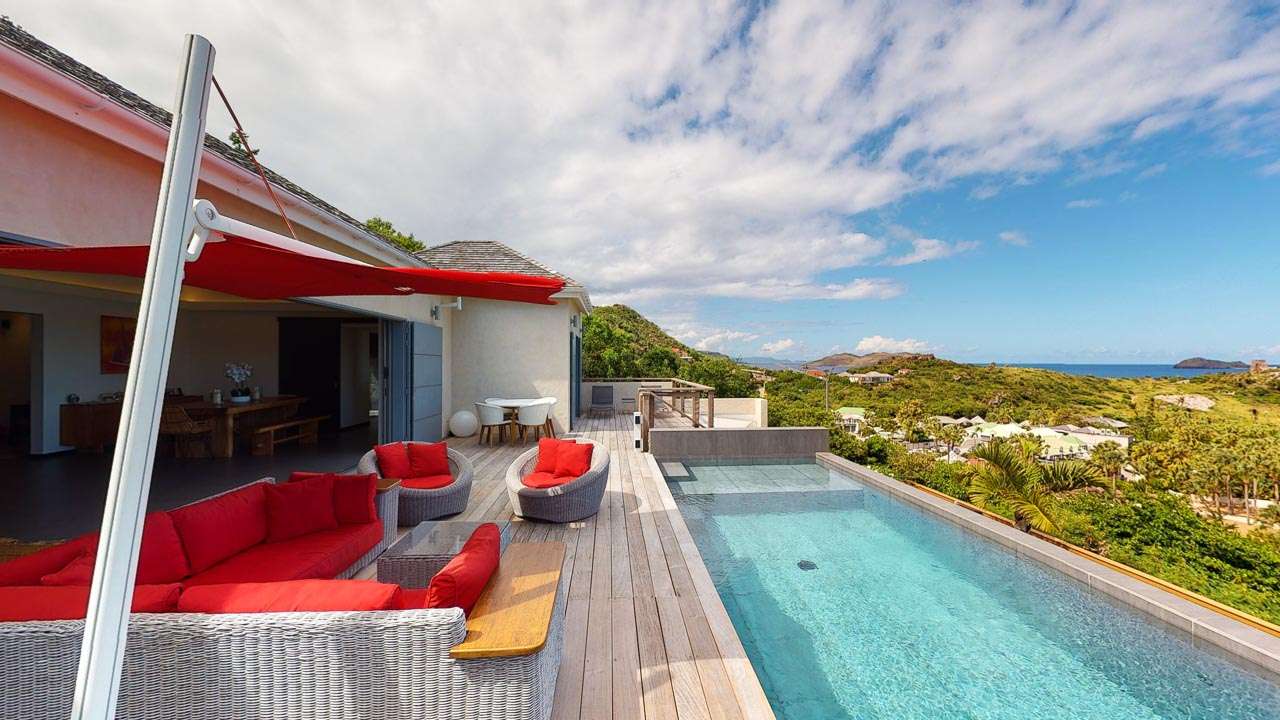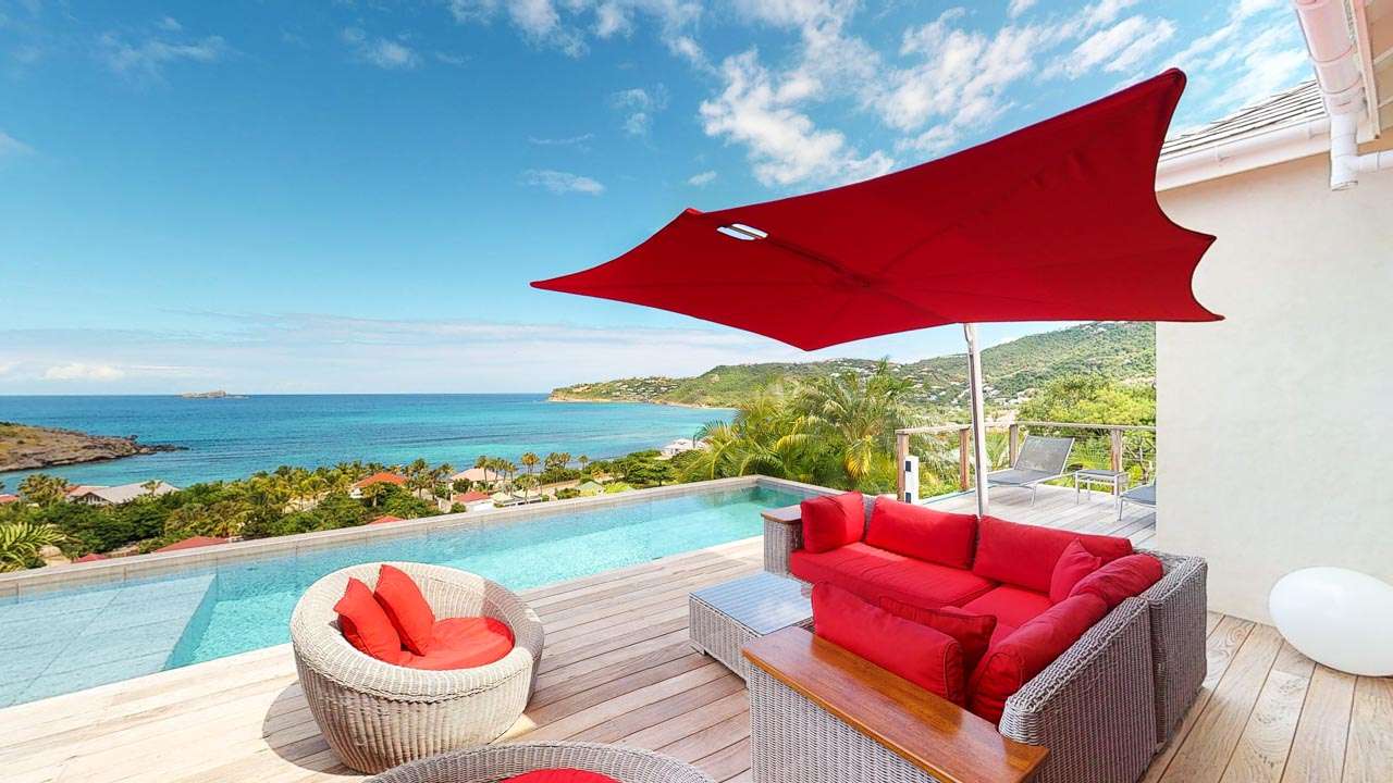 Welcome to Villa Nita (villa code: WV ITA), a breathtaking 3-bedroom villa located in Lorient, St. Barts nestled in the hills above the bay, offering stunning ocean views. Modern, contemporary, and with dashes of retro flair, the interiors of Villa Nita are trendy and cool. Prints of Paris and New York hang on the walls, while accents of red and black run throughout and enhance the chic, movie-star atmosphere. Ideally located close to Lorient Beach, the shop and restaurants in St. Jean are just 5 minutes away. The capital city of Gustavia is less than 10 minutes away. The open-plan villa features a large great room, with a kitchen, dining room, sitting area, and TV room. The entire space opens to the outdoor terrace and the ocean views. The sitting area is a nice spot to settle in for your morning coffee, admiring as the sun emerges from behind the hills of St. Barts. For something a bit cozier, the TV room features a plush sofa in front of a large screen, ideal for movie nights. The modern kitchen at Villa Nita has everything you’ll need to whip up gourmet meals during your stay. Sleek black countertops and side-by-side red SMEG fridges add a contemporary touch. To make things easy, our concierge can organize grocery pre-stocking or delivery, catered meals, or arrange private chef service for a special occasion. The dining table has seating for up to six guests, a great spot to enjoy some sumptuous island cuisine. From here, the views make for a superb accompaniment to classic flavors and ingredients from St. Barts. There are 3 bedrooms at Villa Nita, spread across the property to ensure peace and quiet for each guest. The chic and modern theme continues in each, as do the incredible views over the shimmering Caribbean. On the main level, on either side of the living room is a bedroom, both with queen-sized beds and spacious ensuites. Descending to the lower level reveals the third bedroom, featuring its own private terrace space with an outdoor sofa. On Villa Nita’s outdoor terrace, a wicker sofa and set of chairs are the best seats in the house to enjoy the stunning sunsets. Facing out across the water, the views take in Île Toc Vers, Île Frégate, and Île Bonhomme, as well as St. Martin and Anguilla in the distance. The large infinity pool is an inviting place to spend your day, hopping in to cool off, and then relaxing in the loungers on the terrace to bask in the island sun. Following the steps to the lower level reveals a beautiful lawn on one side, another nice spot to set yourself up for a sunbathing session. Also down here is a gas grill, encouraging you to fry up some fresh fish or a succulent steak for dinner. Lorient Beach is just a short drive downhill, offering soft sand and turquoise waters. Head west for 5 minutes in the car to arrive at St. Jean, with a beach and plenty of restaurants and shopping options. For something more low-key, Marigot Bay Beach is a 5-minute drive to the east. During the December holidays the villa rents at the full occupancy rate regardless of how many bedrooms are used.Please fill out the form to begin your inquiry and we will connect you with a seasoned villa rental specialist.