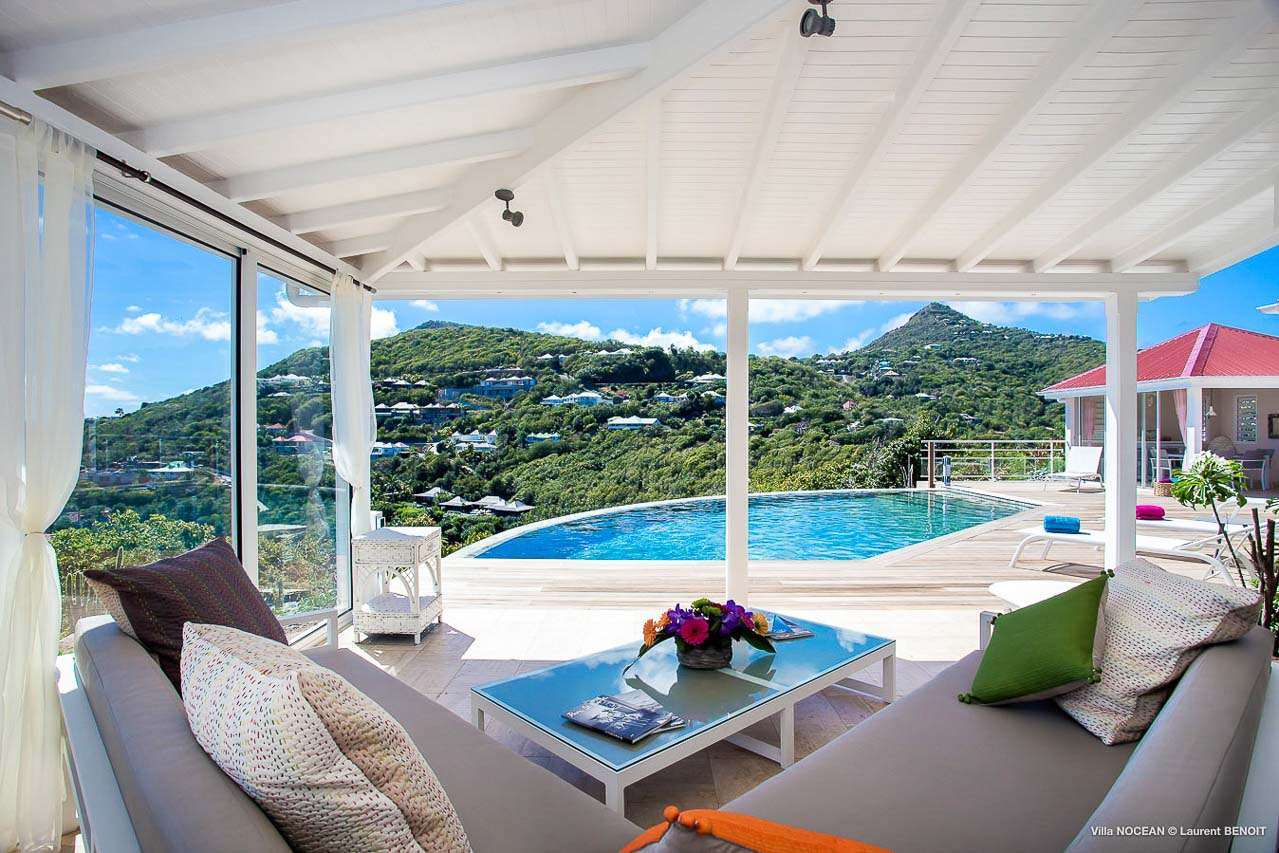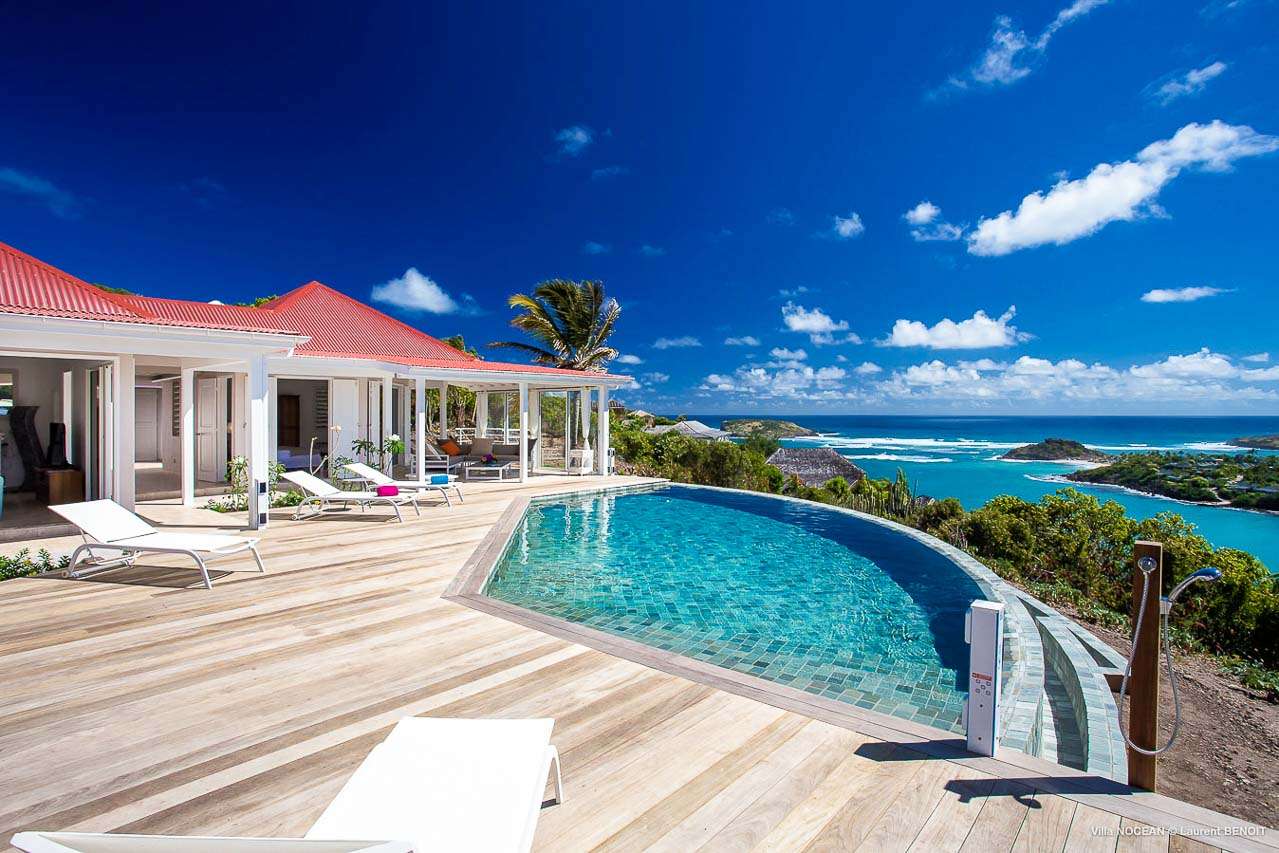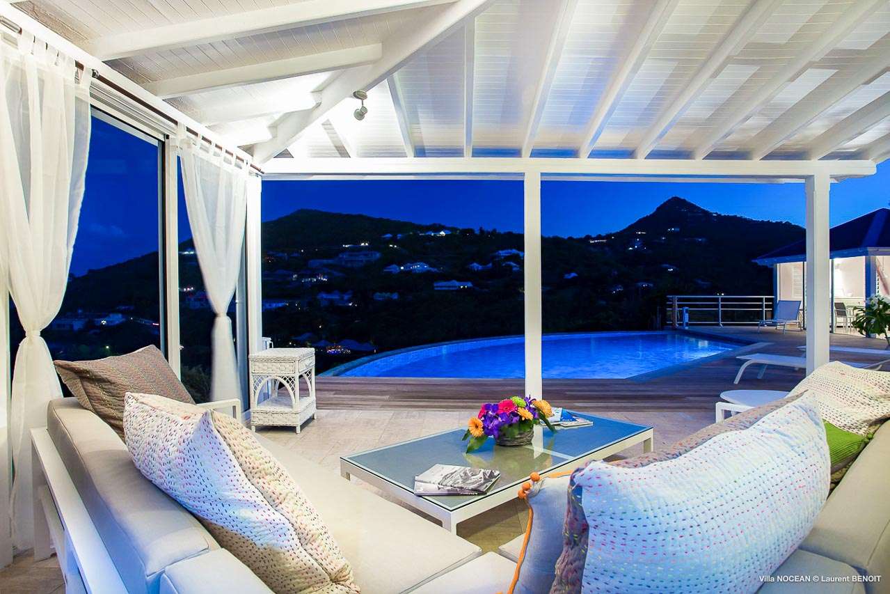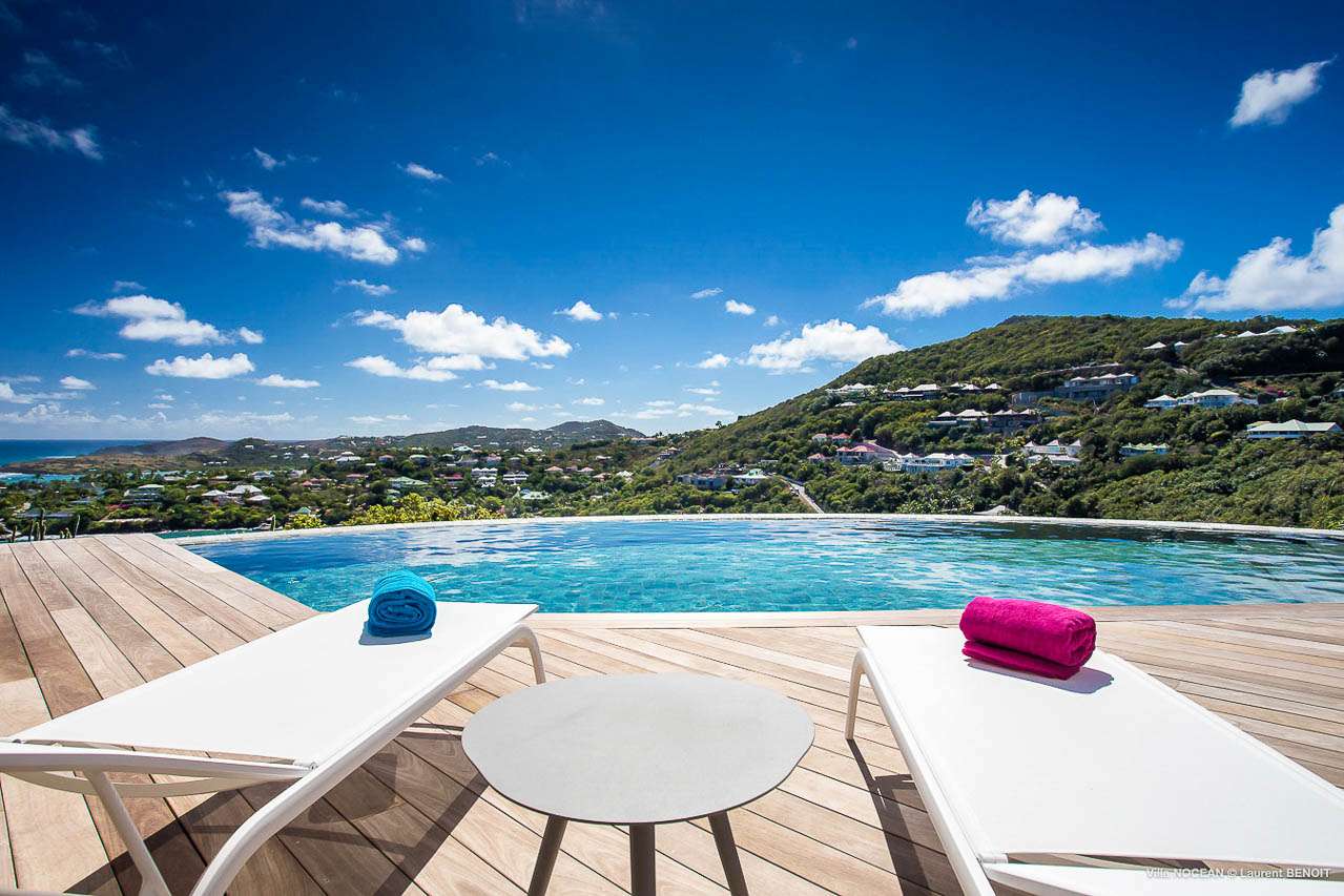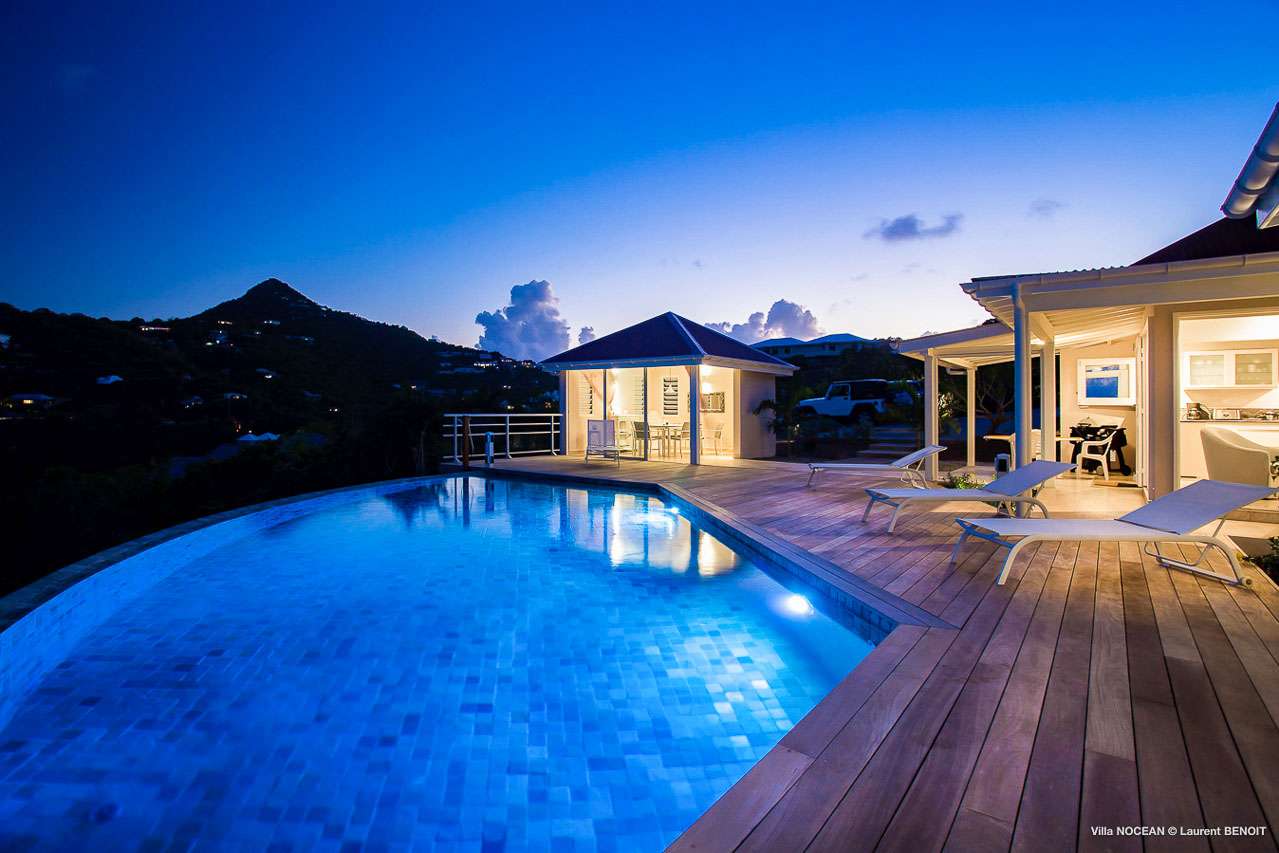 Villa Nocean is a contemporary 2-bedroom villa located in Mont Jean. This villa within a gated community enjoys gorgeous sea views. Villa Nocean was designed for outdoor living. The focal point is a large infinity swimming pool, which divides the outdoor living area into separate sections. Located on the far side is a semi-open pavilion, which serves as a dining area. Sliding glass doors partially protect this area from wind or rain. On the other side of the pool is an outdoor living room, which also features glass sliding doors. A separate seating area is placed in front of the kitchen. The spacious terrace offers the perfect setting for sunbathing nearly all day long. The cozy, open indoor living room can also be protected from the elements with glass sliding doors. The modern kitchen has a pass-through window (ideal for entertaining). The first bedroom is located just off the living room. This bedroom offers ocean views, a separate hallway bathroom, and twin beds, which can be pushed together to make a king-size bed. The second bedroom is situated in a separate bungalow. This slightly larger bedroom features a king-size bed, ensuite bathroom, and partial views. The deck with loungers frames the private pool, which faces the spectacular view. This villa also comes with air-conditioning, WiFi, U.S. and French satellite TV in the living room. Villa Nocean comes with house cleaning services six days a week. During the Thanksgiving and December holidays, the villa rents at full occupancy rates regardless of how many bedrooms are used.Please fill out the form to begin your inquiry and we will connect you with a seasoned villa rental specialist.