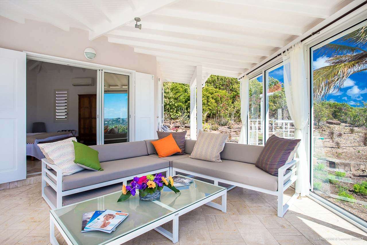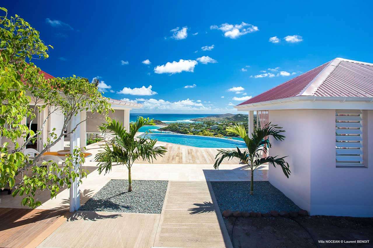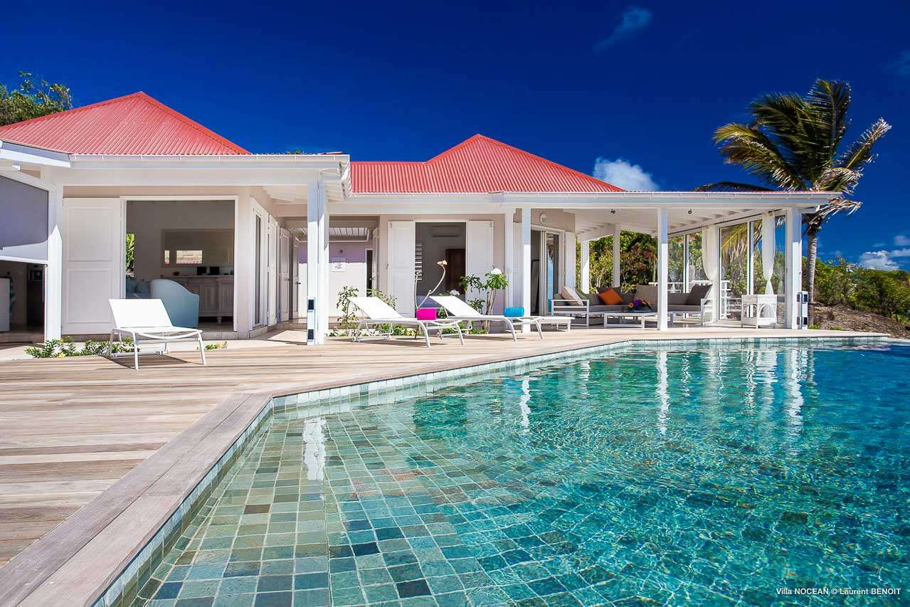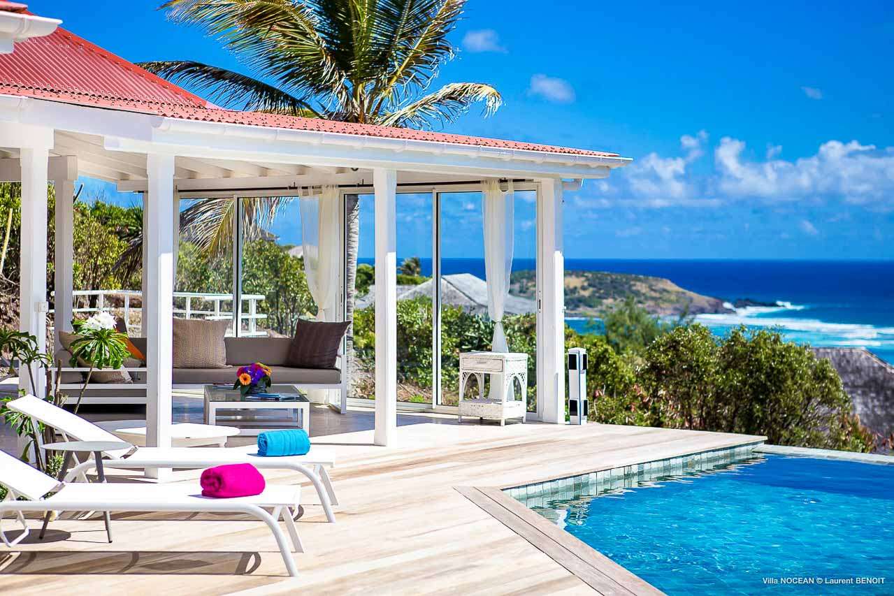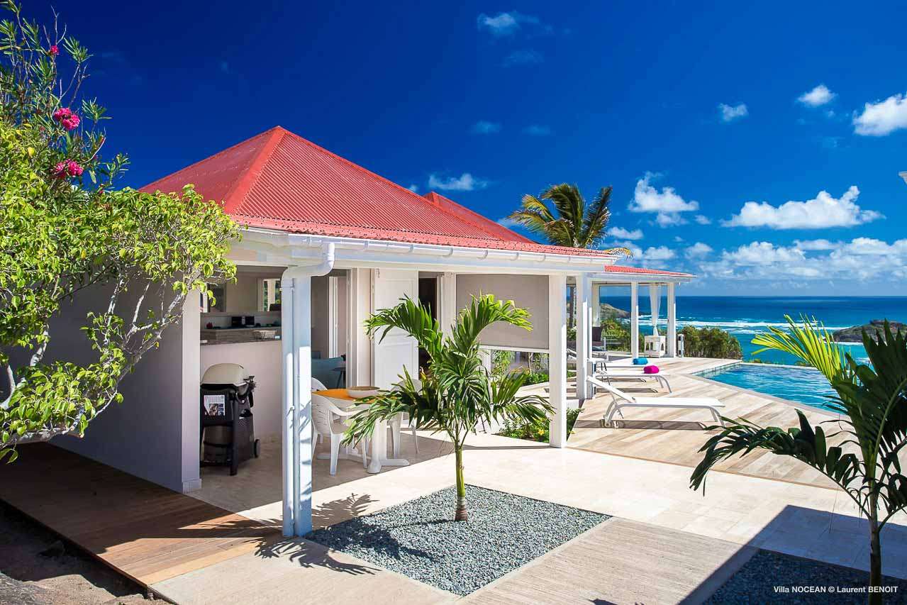 Villa Nocean is a contemporary 2-bedroom villa located in Mont Jean. This villa within a gated community enjoys gorgeous sea views. Villa Nocean was designed for outdoor living. The focal point is a large infinity swimming pool, which divides the outdoor living area into separate sections. Located on the far side is a semi-open pavilion, which serves as a dining area. Sliding glass doors partially protect this area from wind or rain. On the other side of the pool is an outdoor living room, which also features glass sliding doors. A separate seating area is placed in front of the kitchen. The spacious terrace offers the perfect setting for sunbathing nearly all day long. The cozy, open indoor living room can also be protected from the elements with glass sliding doors. The modern kitchen has a pass-through window (ideal for entertaining). The first bedroom is located just off the living room. This bedroom offers ocean views, a separate hallway bathroom, and twin beds, which can be pushed together to make a king-size bed. The second bedroom is situated in a separate bungalow. This slightly larger bedroom features a king-size bed, ensuite bathroom, and partial views. The deck with loungers frames the private pool, which faces the spectacular view. This villa also comes with air-conditioning, WiFi, U.S. and French satellite TV in the living room. Villa Nocean comes with house cleaning services six days a week. During the Thanksgiving and December holidays, the villa rents at full occupancy rates regardless of how many bedrooms are used.Please fill out the form to begin your inquiry and we will connect you with a seasoned villa rental specialist.