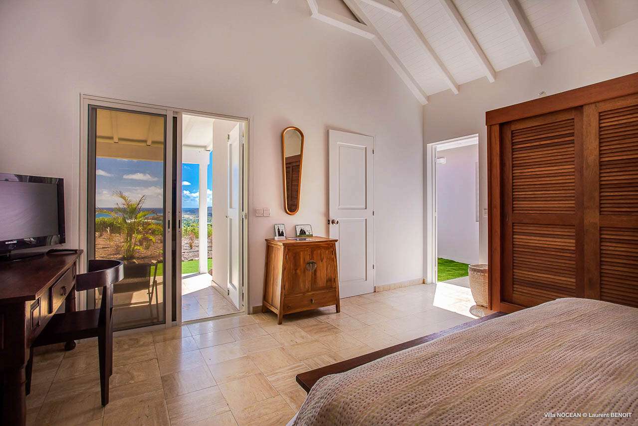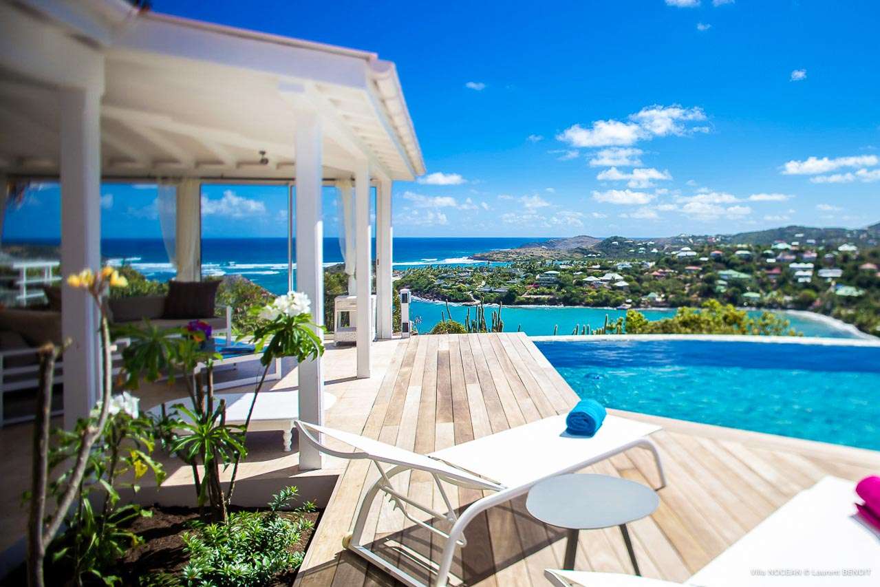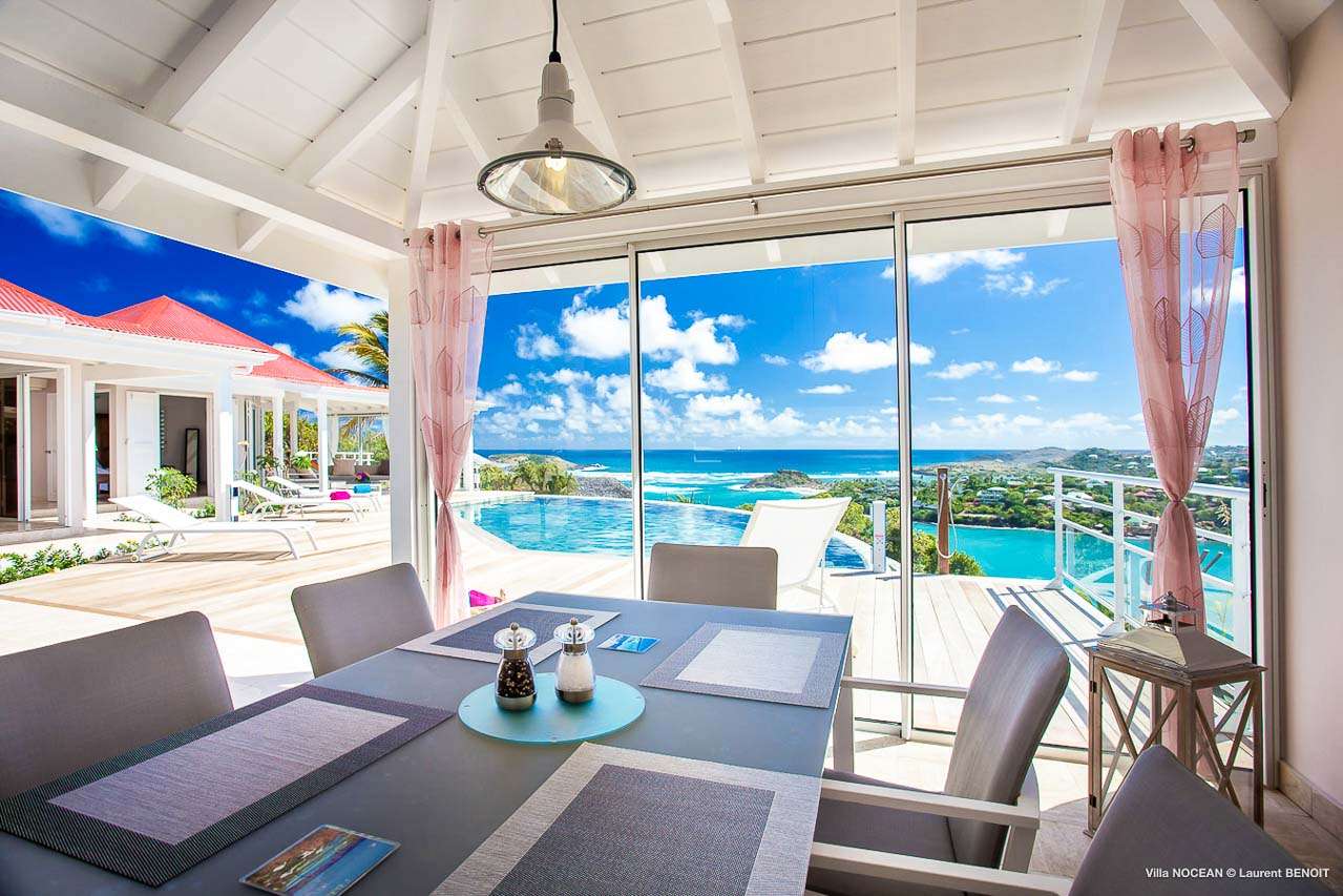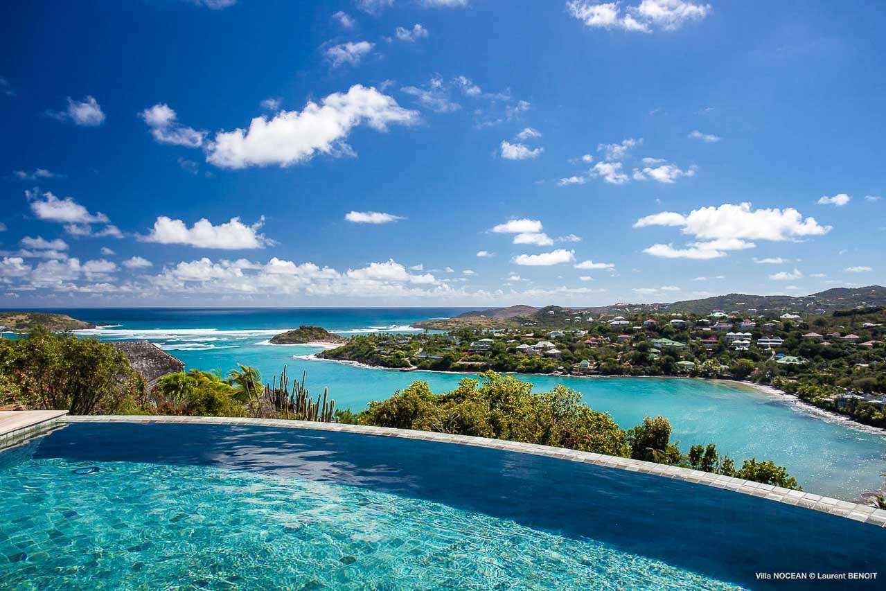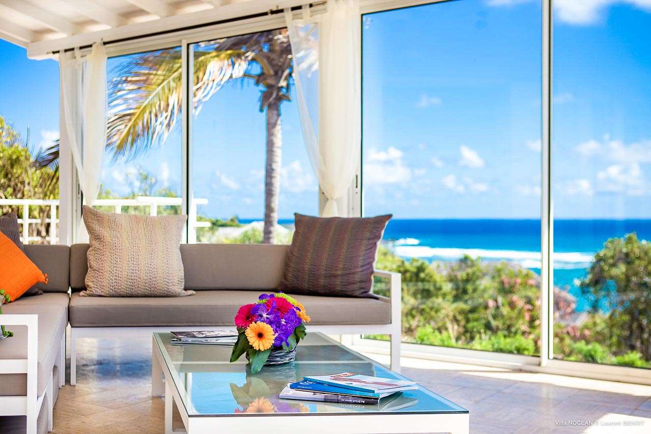 Villa Nocean is a contemporary 2-bedroom villa located in Mont Jean. This villa within a gated community enjoys gorgeous sea views. Villa Nocean was designed for outdoor living. The focal point is a large infinity swimming pool, which divides the outdoor living area into separate sections. Located on the far side is a semi-open pavilion, which serves as a dining area. Sliding glass doors partially protect this area from wind or rain. On the other side of the pool is an outdoor living room, which also features glass sliding doors. A separate seating area is placed in front of the kitchen. The spacious terrace offers the perfect setting for sunbathing nearly all day long. The cozy, open indoor living room can also be protected from the elements with glass sliding doors. The modern kitchen has a pass-through window (ideal for entertaining). The first bedroom is located just off the living room. This bedroom offers ocean views, a separate hallway bathroom, and twin beds, which can be pushed together to make a king-size bed. The second bedroom is situated in a separate bungalow. This slightly larger bedroom features a king-size bed, ensuite bathroom, and partial views. The deck with loungers frames the private pool, which faces the spectacular view. This villa also comes with air-conditioning, WiFi, U.S. and French satellite TV in the living room. Villa Nocean comes with house cleaning services six days a week. During the Thanksgiving and December holidays, the villa rents at full occupancy rates regardless of how many bedrooms are used.Please fill out the form to begin your inquiry and we will connect you with a seasoned villa rental specialist.
