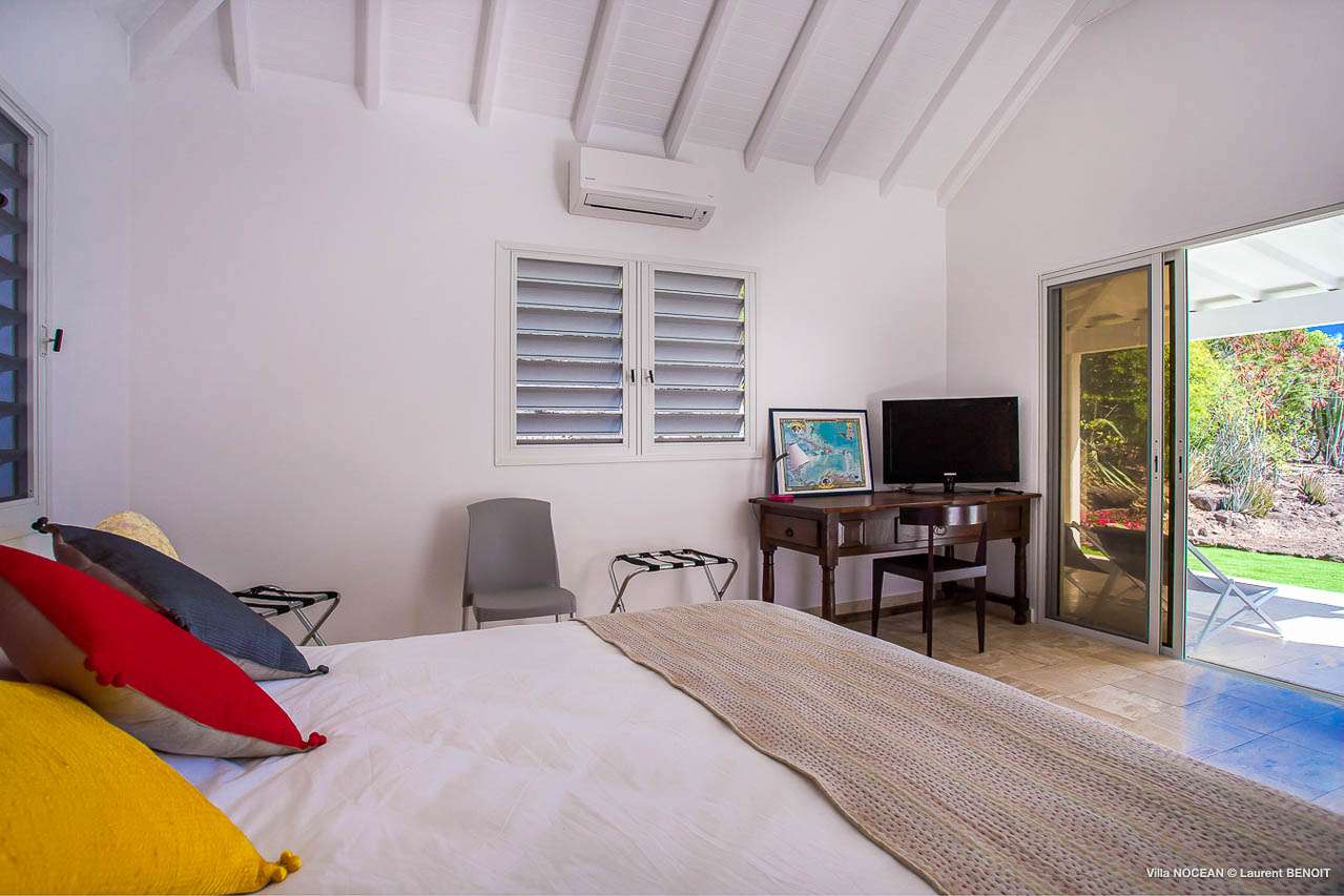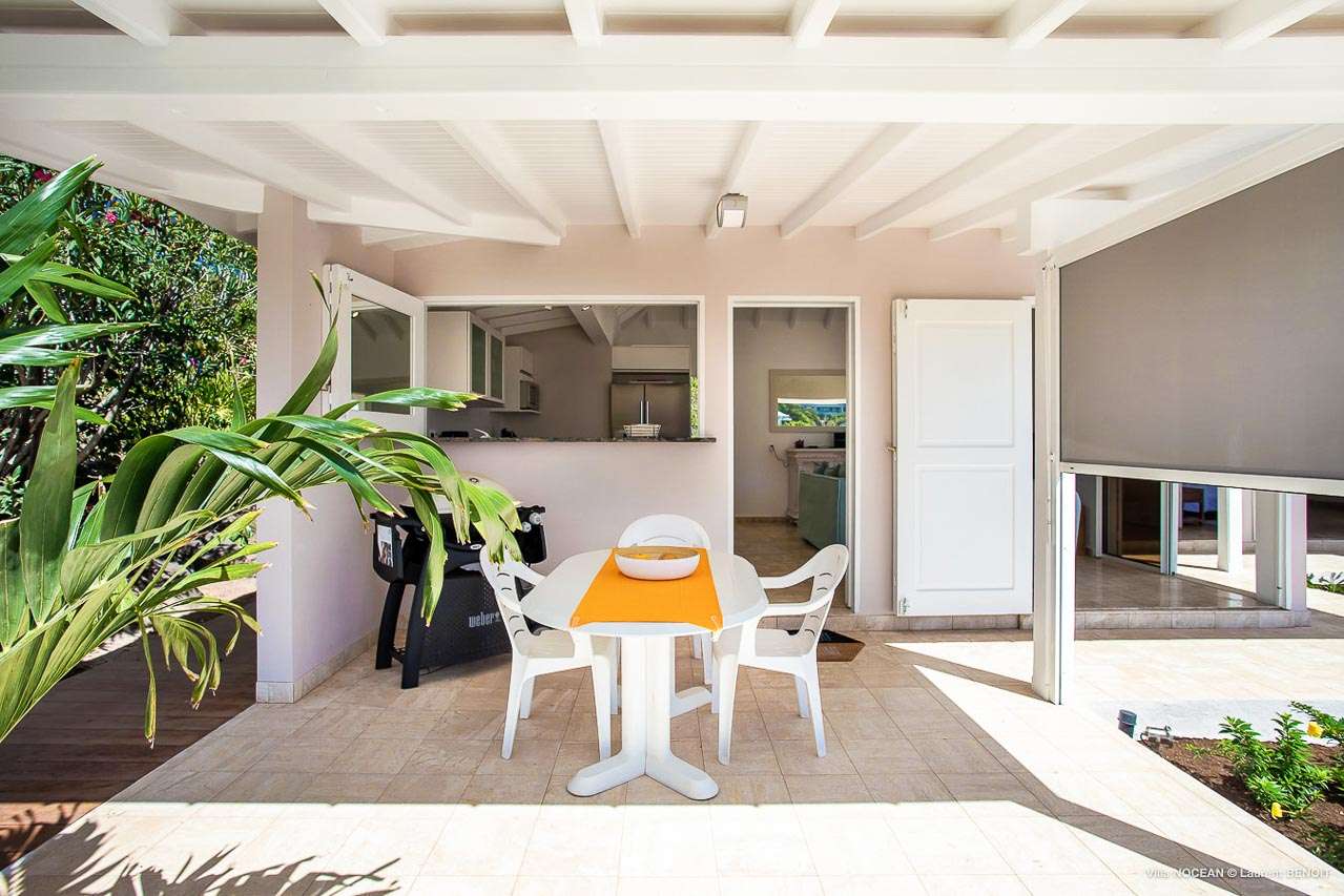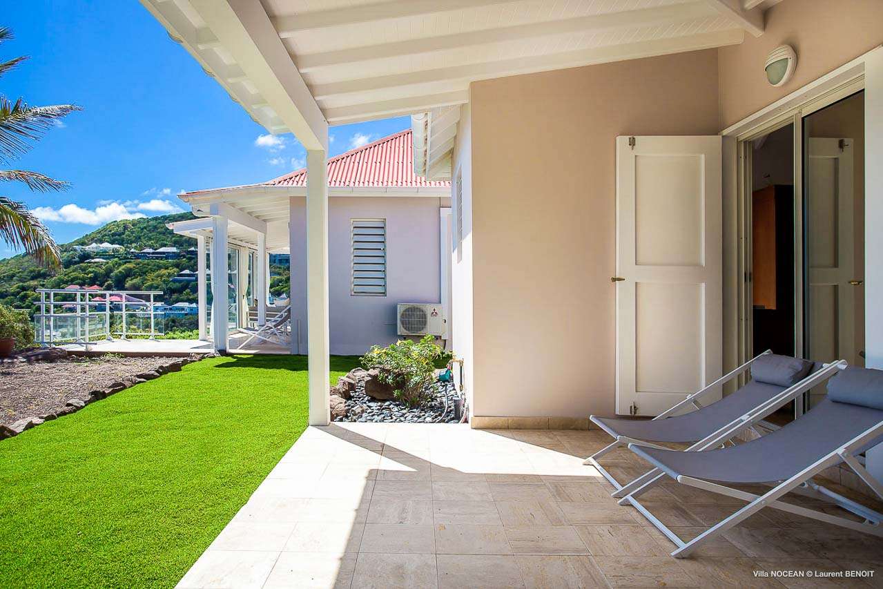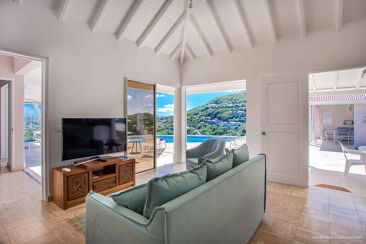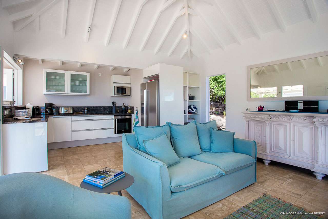 Villa Nocean is a contemporary 2-bedroom villa located in Mont Jean. This villa within a gated community enjoys gorgeous sea views. Villa Nocean was designed for outdoor living. The focal point is a large infinity swimming pool, which divides the outdoor living area into separate sections. Located on the far side is a semi-open pavilion, which serves as a dining area. Sliding glass doors partially protect this area from wind or rain. On the other side of the pool is an outdoor living room, which also features glass sliding doors. A separate seating area is placed in front of the kitchen. The spacious terrace offers the perfect setting for sunbathing nearly all day long. The cozy, open indoor living room can also be protected from the elements with glass sliding doors. The modern kitchen has a pass-through window (ideal for entertaining). The first bedroom is located just off the living room. This bedroom offers ocean views, a separate hallway bathroom, and twin beds, which can be pushed together to make a king-size bed. The second bedroom is situated in a separate bungalow. This slightly larger bedroom features a king-size bed, ensuite bathroom, and partial views. The deck with loungers frames the private pool, which faces the spectacular view. This villa also comes with air-conditioning, WiFi, U.S. and French satellite TV in the living room. Villa Nocean comes with house cleaning services six days a week. During the Thanksgiving and December holidays, the villa rents at full occupancy rates regardless of how many bedrooms are used.Please fill out the form to begin your inquiry and we will connect you with a seasoned villa rental specialist.