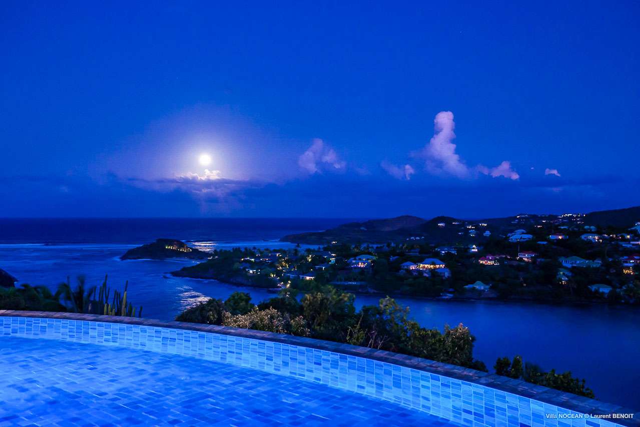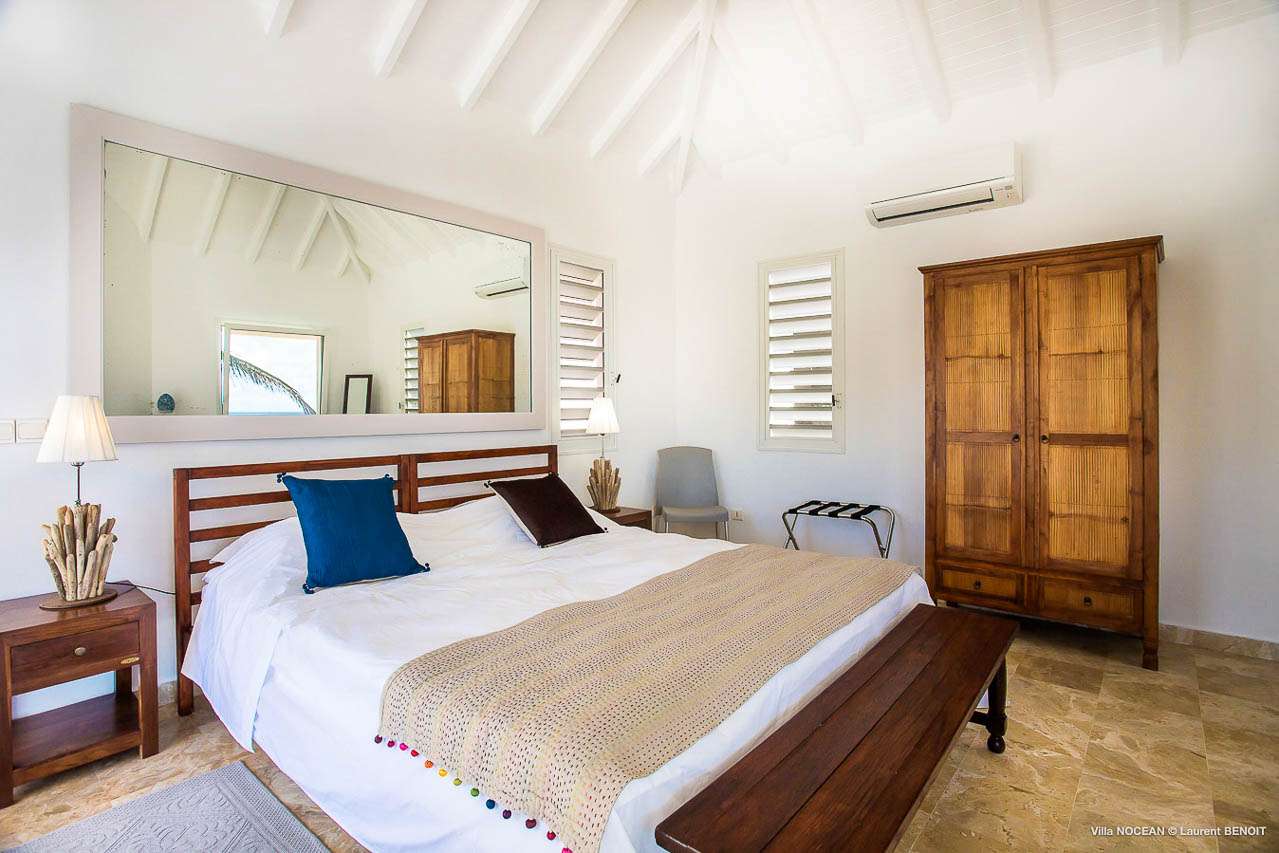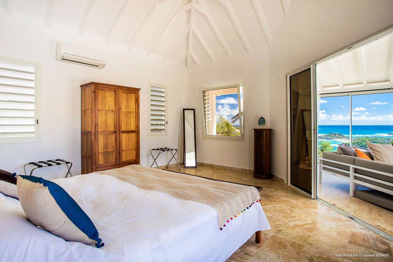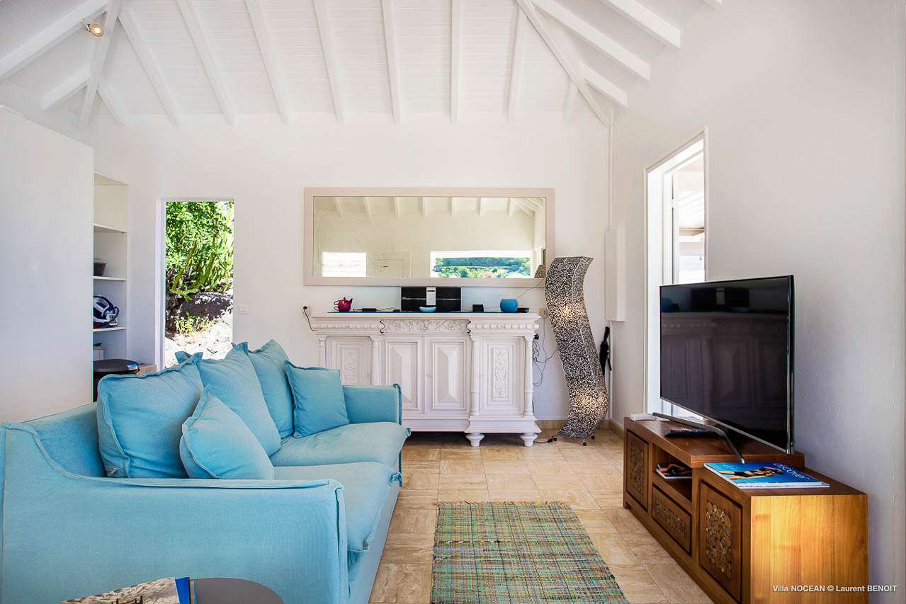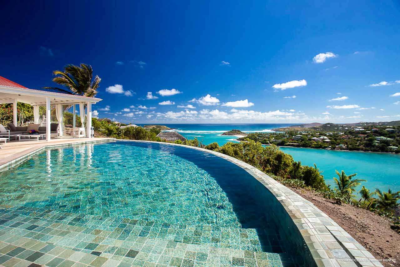 Villa Nocean is a contemporary 2-bedroom villa located in Mont Jean. This villa within a gated community enjoys gorgeous sea views. Villa Nocean was designed for outdoor living. The focal point is a large infinity swimming pool, which divides the outdoor living area into separate sections. Located on the far side is a semi-open pavilion, which serves as a dining area. Sliding glass doors partially protect this area from wind or rain. On the other side of the pool is an outdoor living room, which also features glass sliding doors. A separate seating area is placed in front of the kitchen. The spacious terrace offers the perfect setting for sunbathing nearly all day long. The cozy, open indoor living room can also be protected from the elements with glass sliding doors. The modern kitchen has a pass-through window (ideal for entertaining). The first bedroom is located just off the living room. This bedroom offers ocean views, a separate hallway bathroom, and twin beds, which can be pushed together to make a king-size bed. The second bedroom is situated in a separate bungalow. This slightly larger bedroom features a king-size bed, ensuite bathroom, and partial views. The deck with loungers frames the private pool, which faces the spectacular view. This villa also comes with air-conditioning, WiFi, U.S. and French satellite TV in the living room. Villa Nocean comes with house cleaning services six days a week. During the Thanksgiving and December holidays, the villa rents at full occupancy rates regardless of how many bedrooms are used.Please fill out the form to begin your inquiry and we will connect you with a seasoned villa rental specialist.