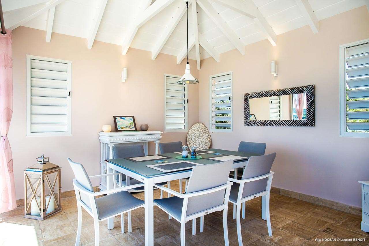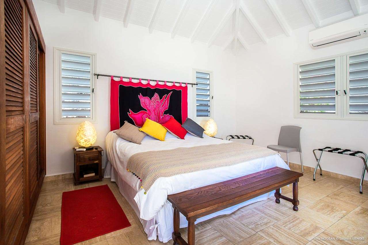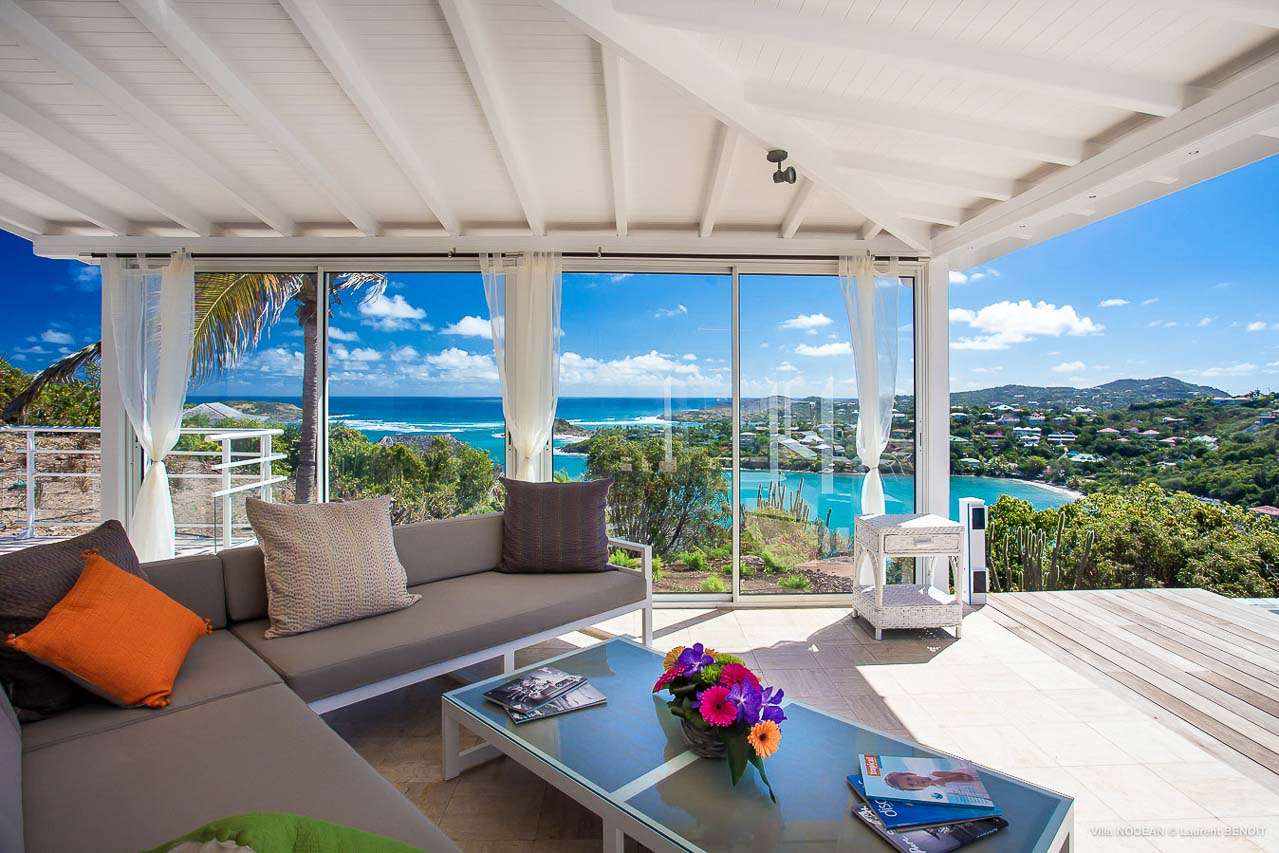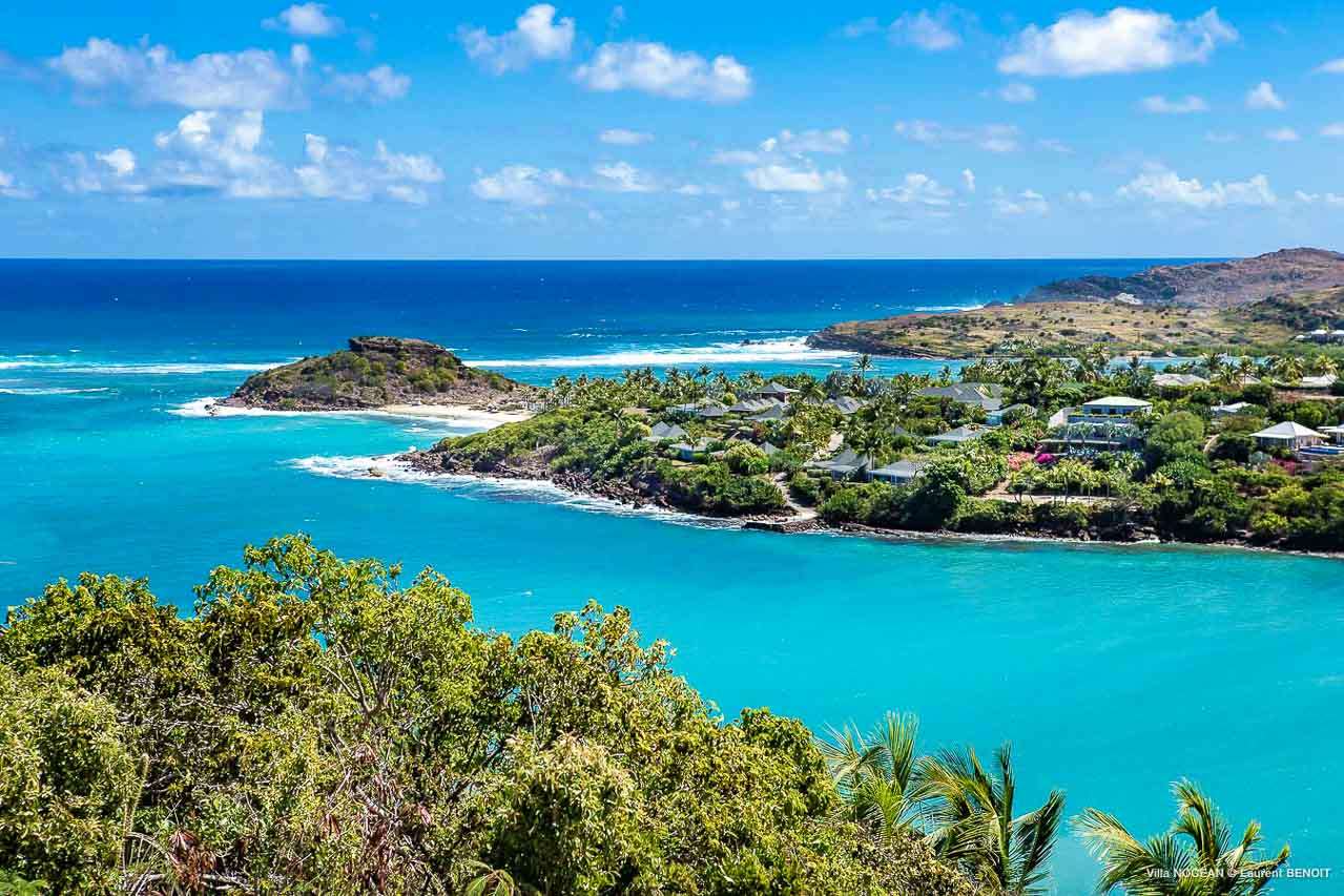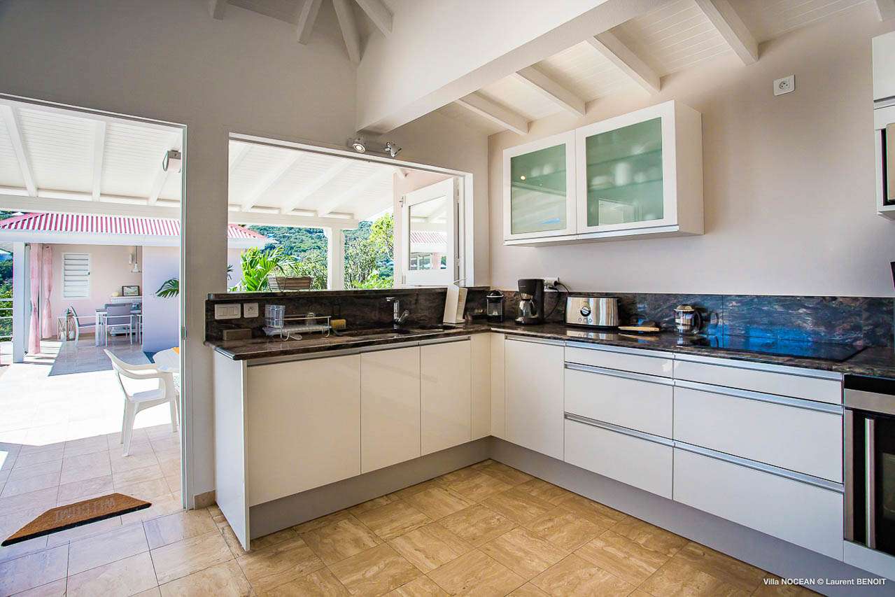 Villa Nocean is a contemporary 2-bedroom villa located in Mont Jean. This villa within a gated community enjoys gorgeous sea views. Villa Nocean was designed for outdoor living. The focal point is a large infinity swimming pool, which divides the outdoor living area into separate sections. Located on the far side is a semi-open pavilion, which serves as a dining area. Sliding glass doors partially protect this area from wind or rain. On the other side of the pool is an outdoor living room, which also features glass sliding doors. A separate seating area is placed in front of the kitchen. The spacious terrace offers the perfect setting for sunbathing nearly all day long. The cozy, open indoor living room can also be protected from the elements with glass sliding doors. The modern kitchen has a pass-through window (ideal for entertaining). The first bedroom is located just off the living room. This bedroom offers ocean views, a separate hallway bathroom, and twin beds, which can be pushed together to make a king-size bed. The second bedroom is situated in a separate bungalow. This slightly larger bedroom features a king-size bed, ensuite bathroom, and partial views. The deck with loungers frames the private pool, which faces the spectacular view. This villa also comes with air-conditioning, WiFi, U.S. and French satellite TV in the living room. Villa Nocean comes with house cleaning services six days a week. During the Thanksgiving and December holidays, the villa rents at full occupancy rates regardless of how many bedrooms are used.Please fill out the form to begin your inquiry and we will connect you with a seasoned villa rental specialist.