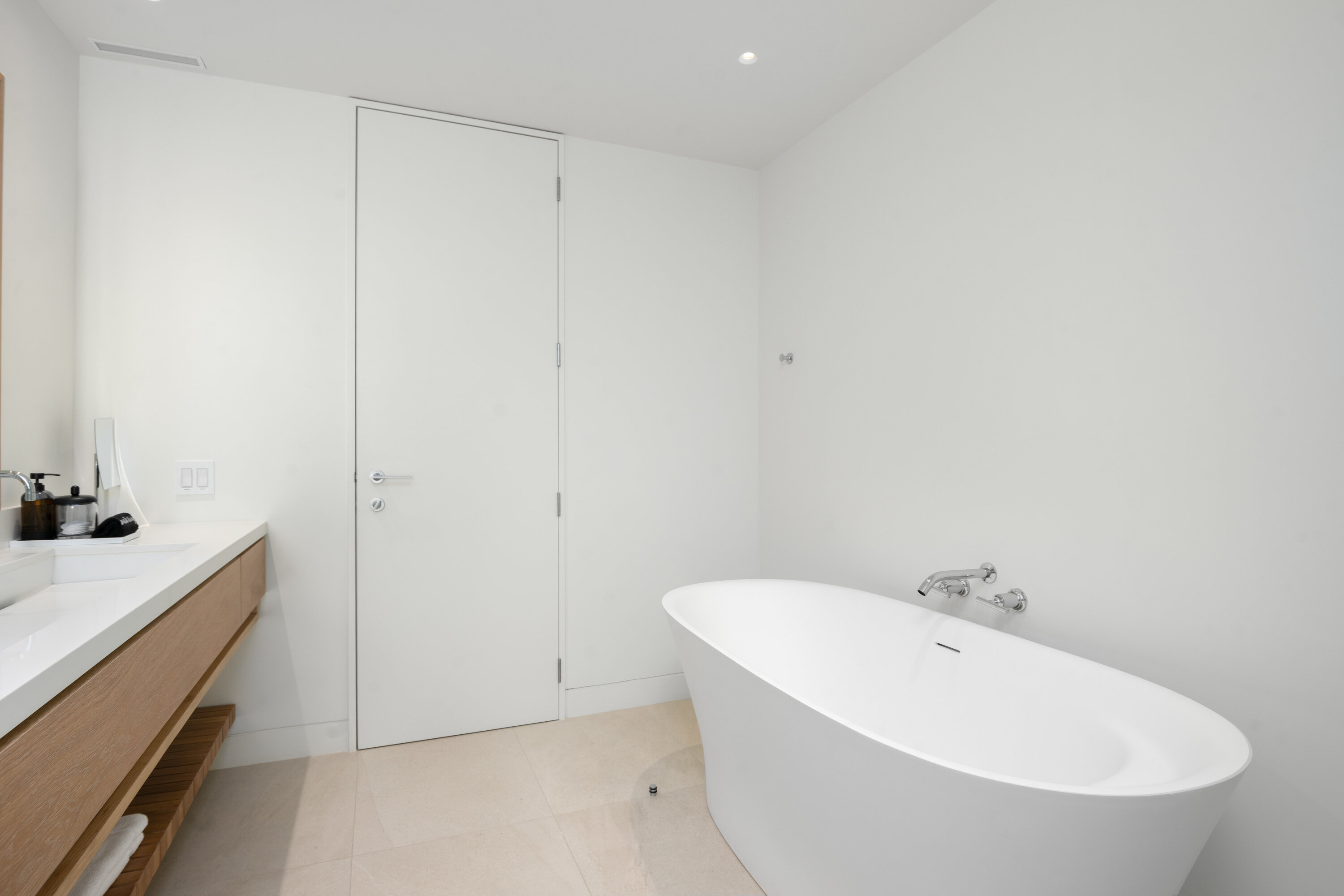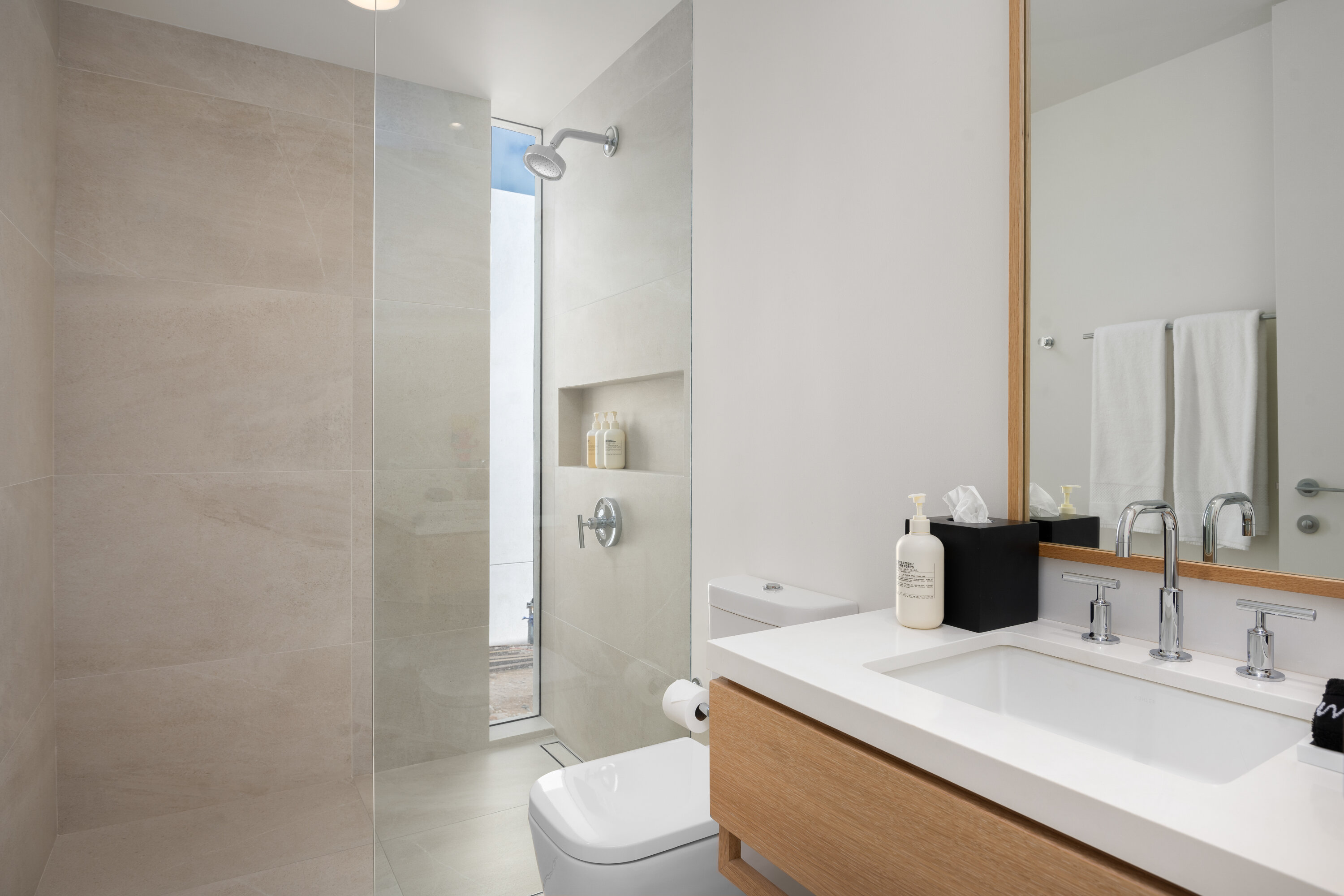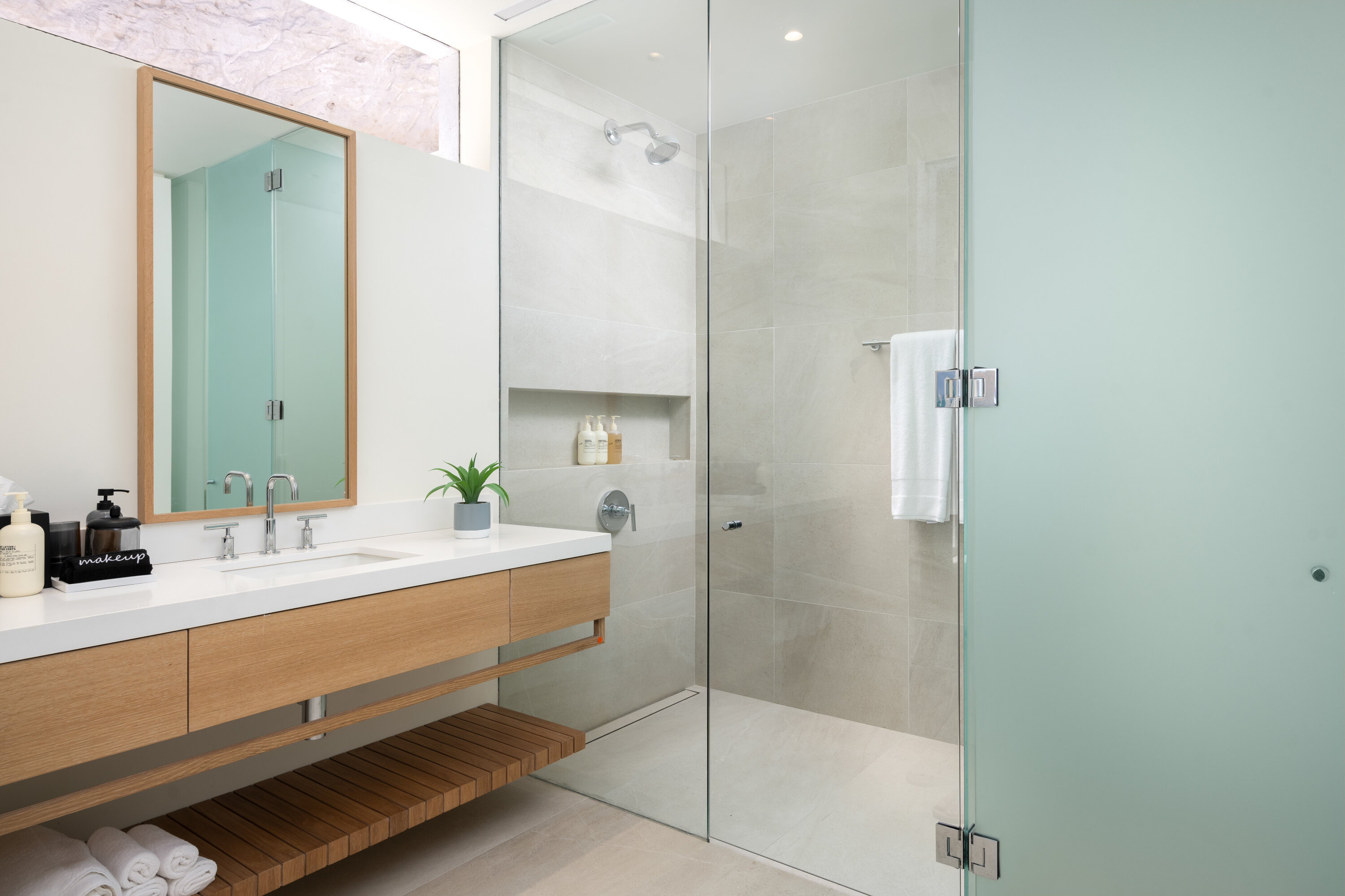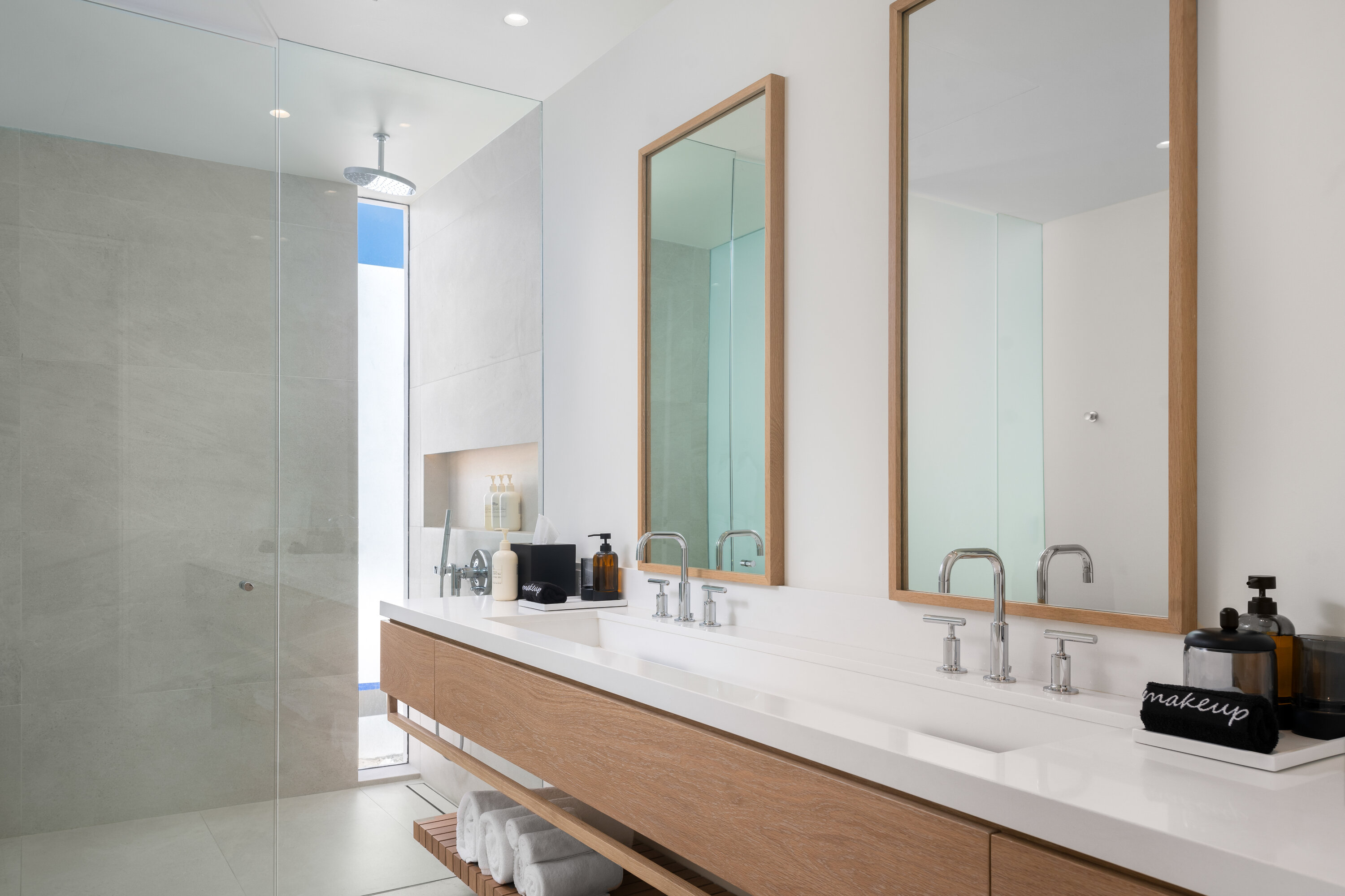 A staircase carved into the limestone cliffs leads you out onto your secluded stretch of sand, unique to each villa. The area is made even more special with a private wood deck, shaded by natural vegetation and featuring a summer kitchen, fire pit, and outdoor shower.