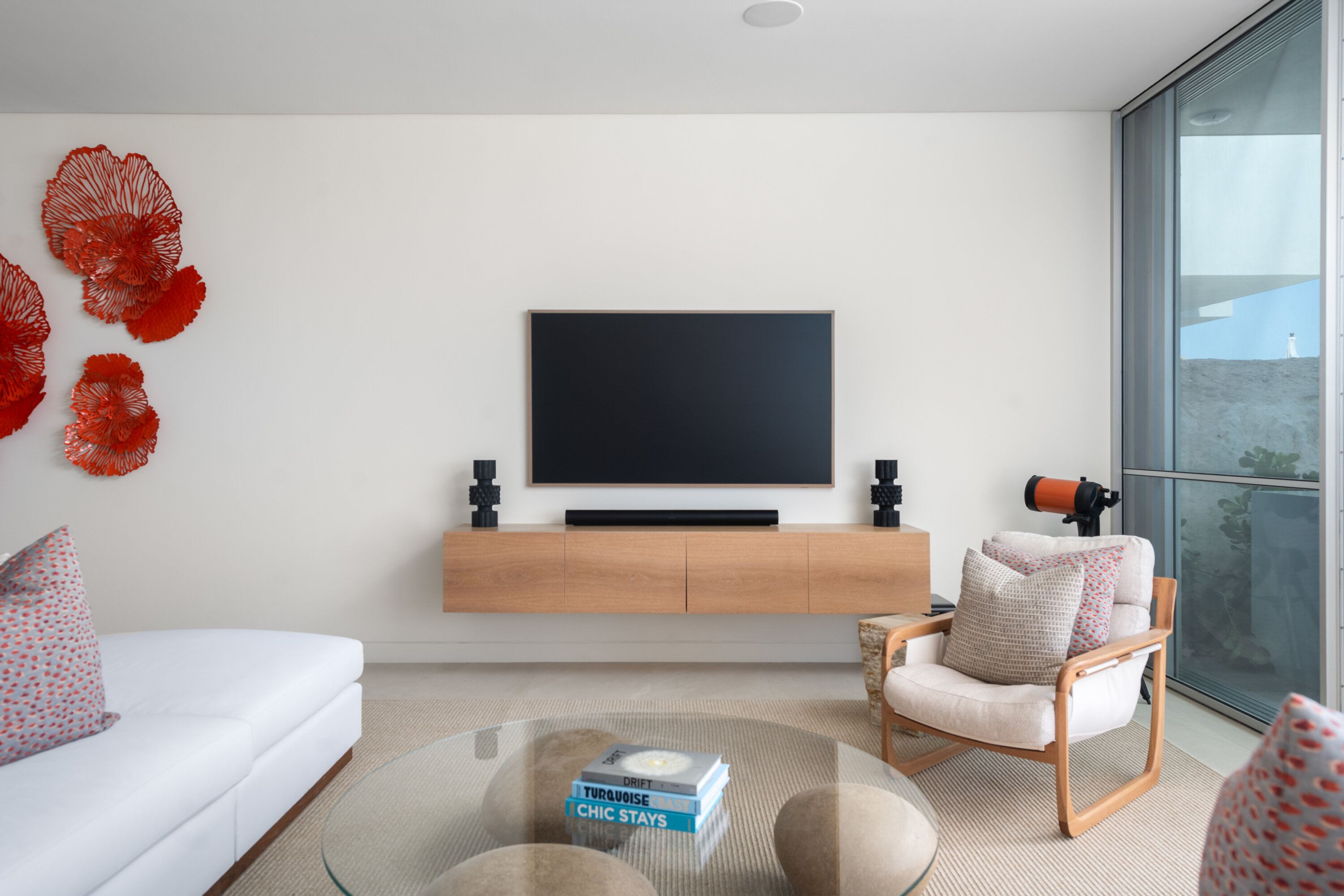 The downstairs great room is open, airy, and spacious. Clean lines and modern style make this place the perfect heart of the home, while the huge glass doors open to the tropical breezes and sounds of the sea.