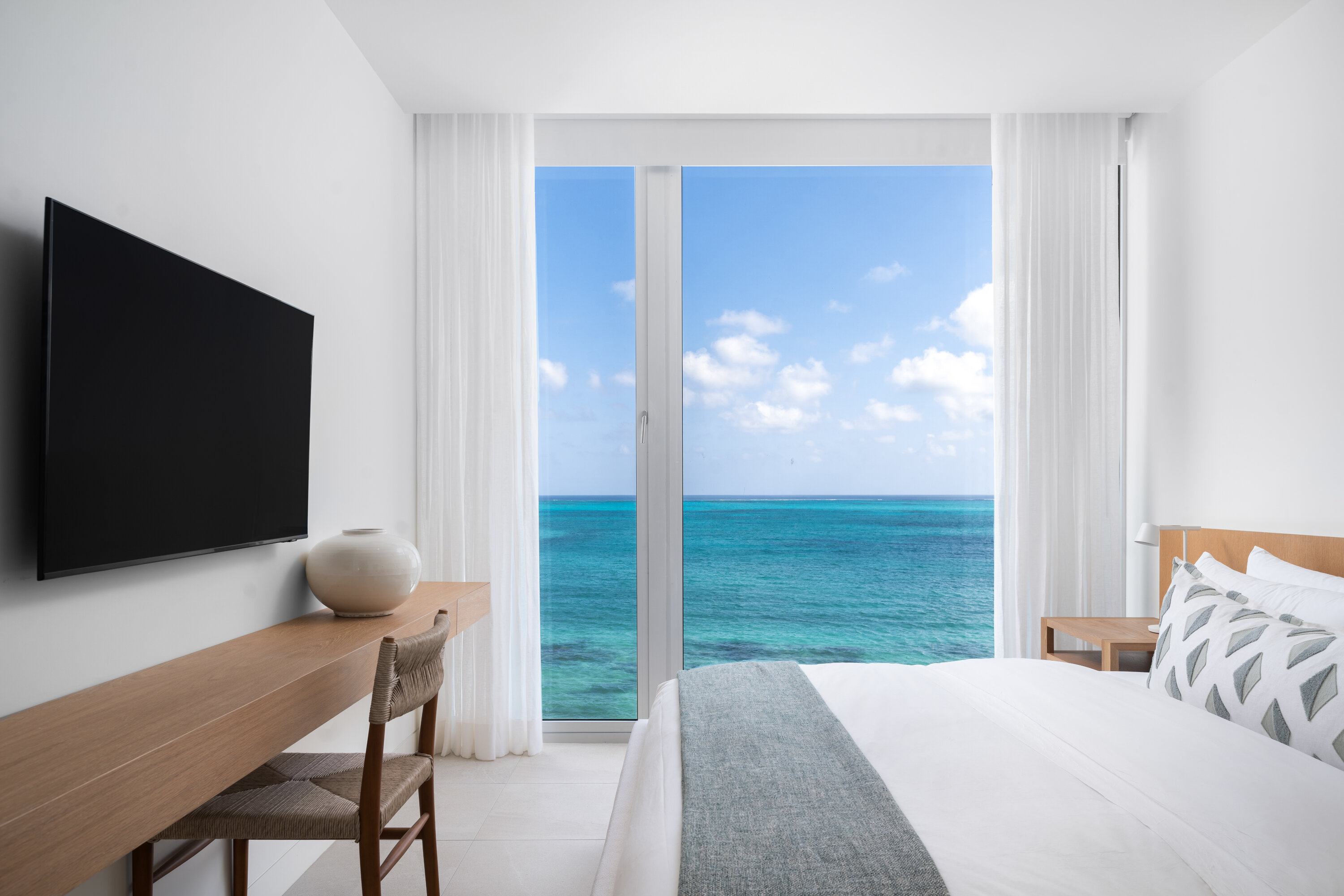 Each of the bedrooms offers breathtaking ocean views, ceiling fans, a TV, and an ensuite bathroom. There are three bedrooms with luxurious king-sized beds, while the fourth bedroom has the option to be furnished with either two twin-sized beds or another king.