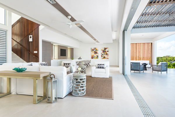 Living Spaces: The downstairs great room of the North Shore Oceanview Villa is open, airy, and spacious. Clean lines and modern style make this place the perfect heart of the home, while the huge glass doors open to bring the tropical island inside.