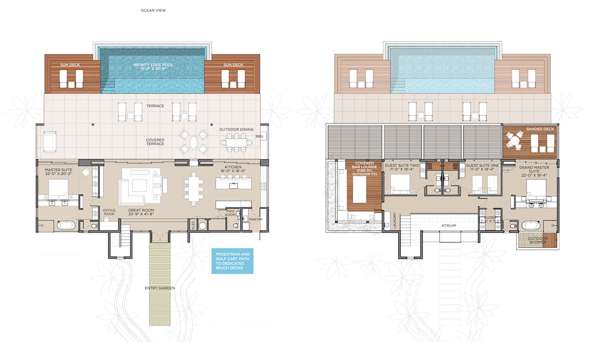 The grand master suite on the top level features an exotic outdoor shower and its own private balconies. Reclining loungers inspire you to sink in and watch the sunset, while a small table is perfect for a quiet night of cocktails and stargazing.