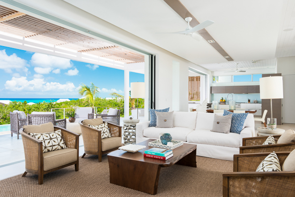 A living room features luxurious white sofas looking out towards the ocean. This is a great spot to relax with a tropical cocktail, or simply enjoy some conversations in comfort. Textured island furnishings and colorful artworks add pops of color.