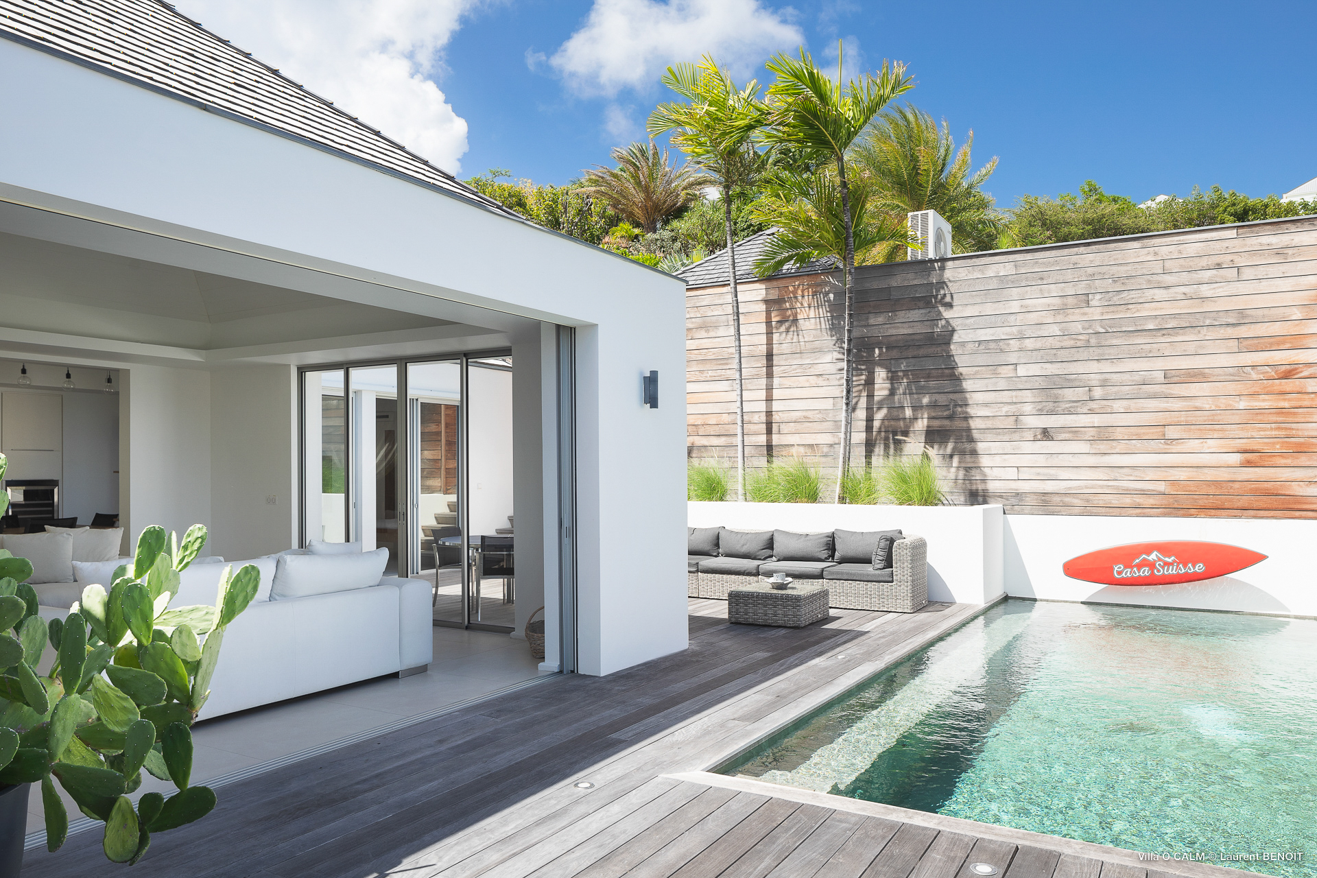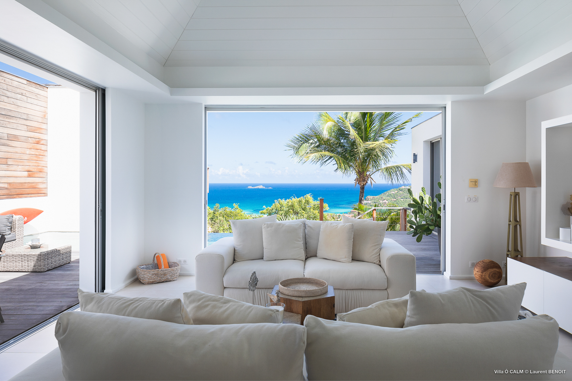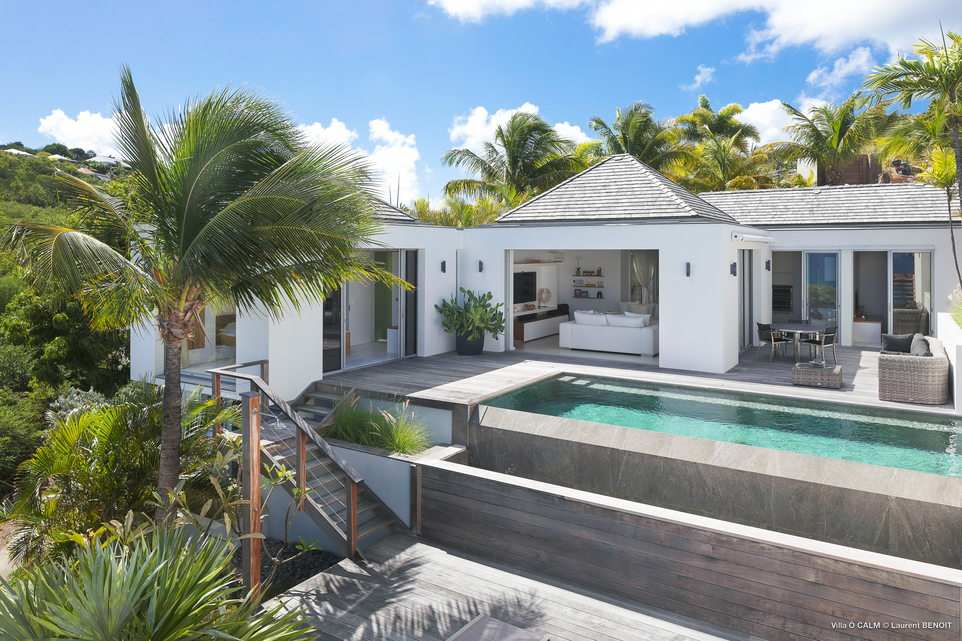 Villa O'Calm, (villa code: WV OKA) is a 1-bedroom villa located in a quiet area of Lurin, just above Gustavia, and offers views of the St. Jean area of St Barts. The living room opens up to three sides and offers great views. A dining area separates the living room from the ultra-modern, fully-equipped kitchen. There is a guest half bath. The bedroom has a large window with an incredible view of the sloping landscape and distant Caribbean Sea and also has a shower that opens up, to give the impression of showering outdoors. At the end of the deck of the heated infinity pool is a stairway leading to the lower sundeck with an outdoor shower. * Notes: Villa does not rent during low season, parking for one small car only, no parties. The 2nd Bedroom on the floor plan is no longer available. .Please fill out the form to begin your inquiry and we will connect you with a seasoned villa rental specialist.