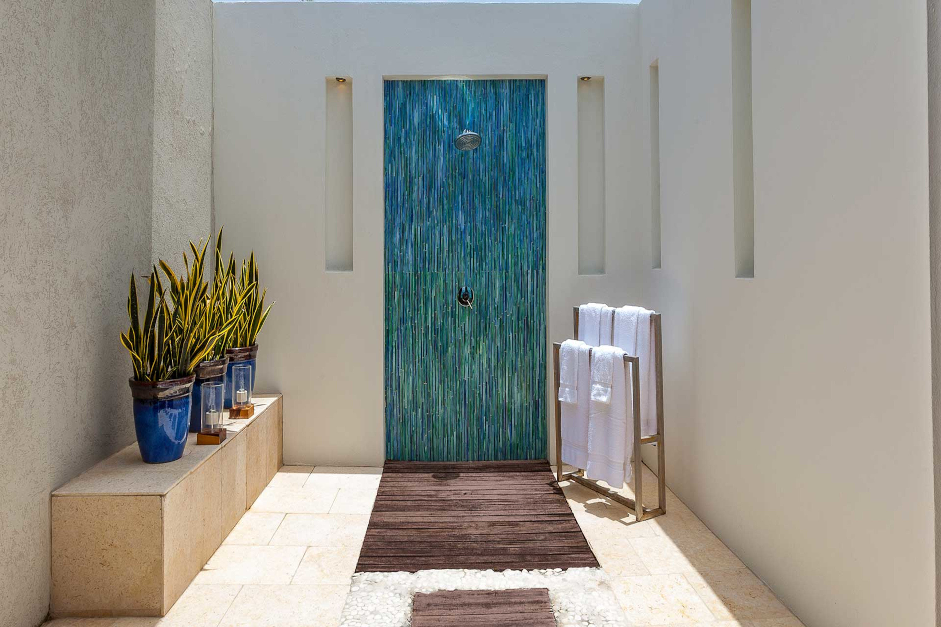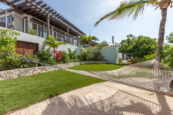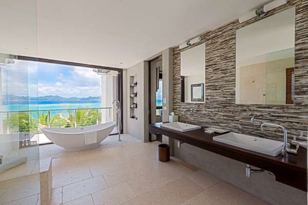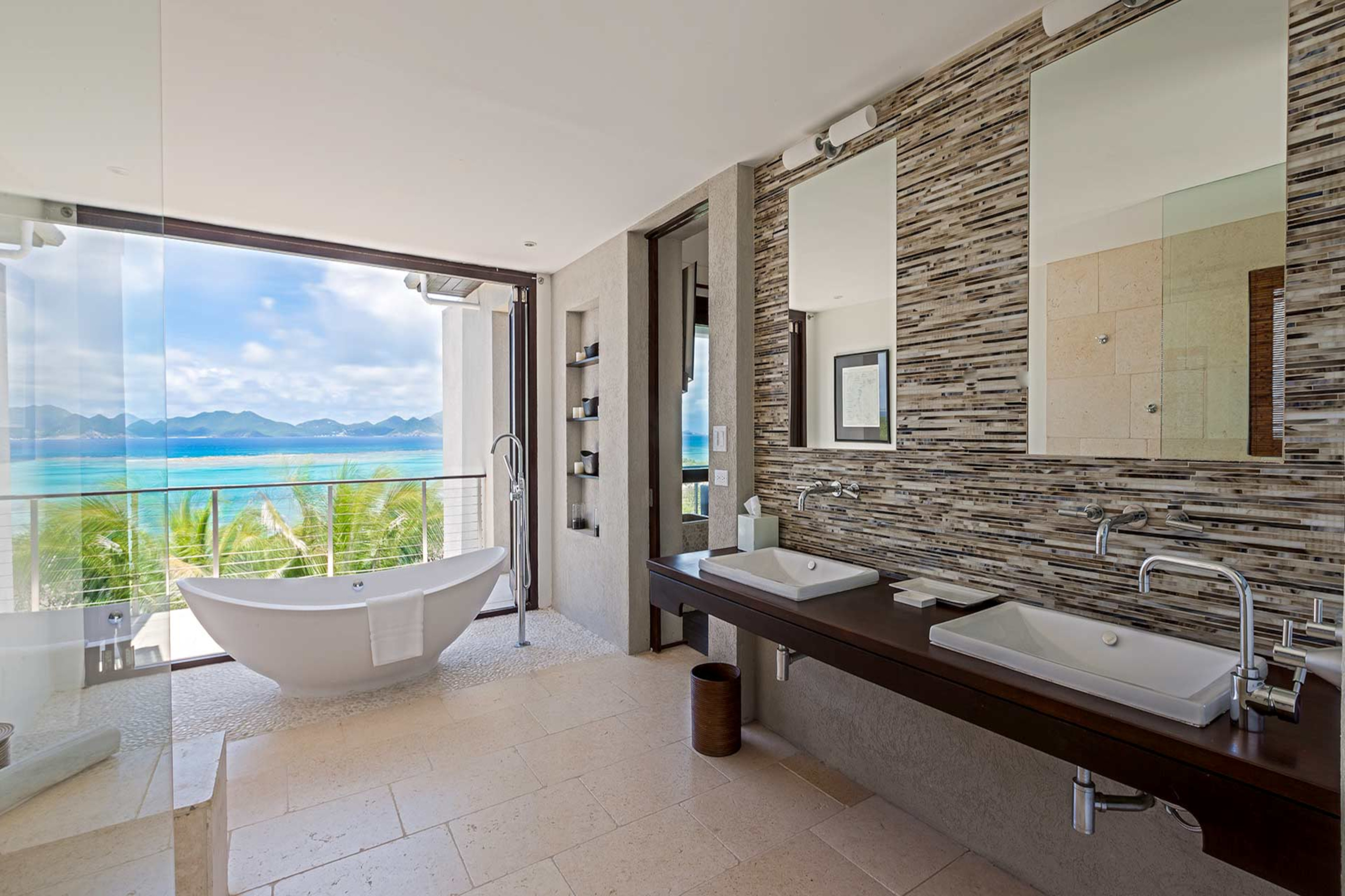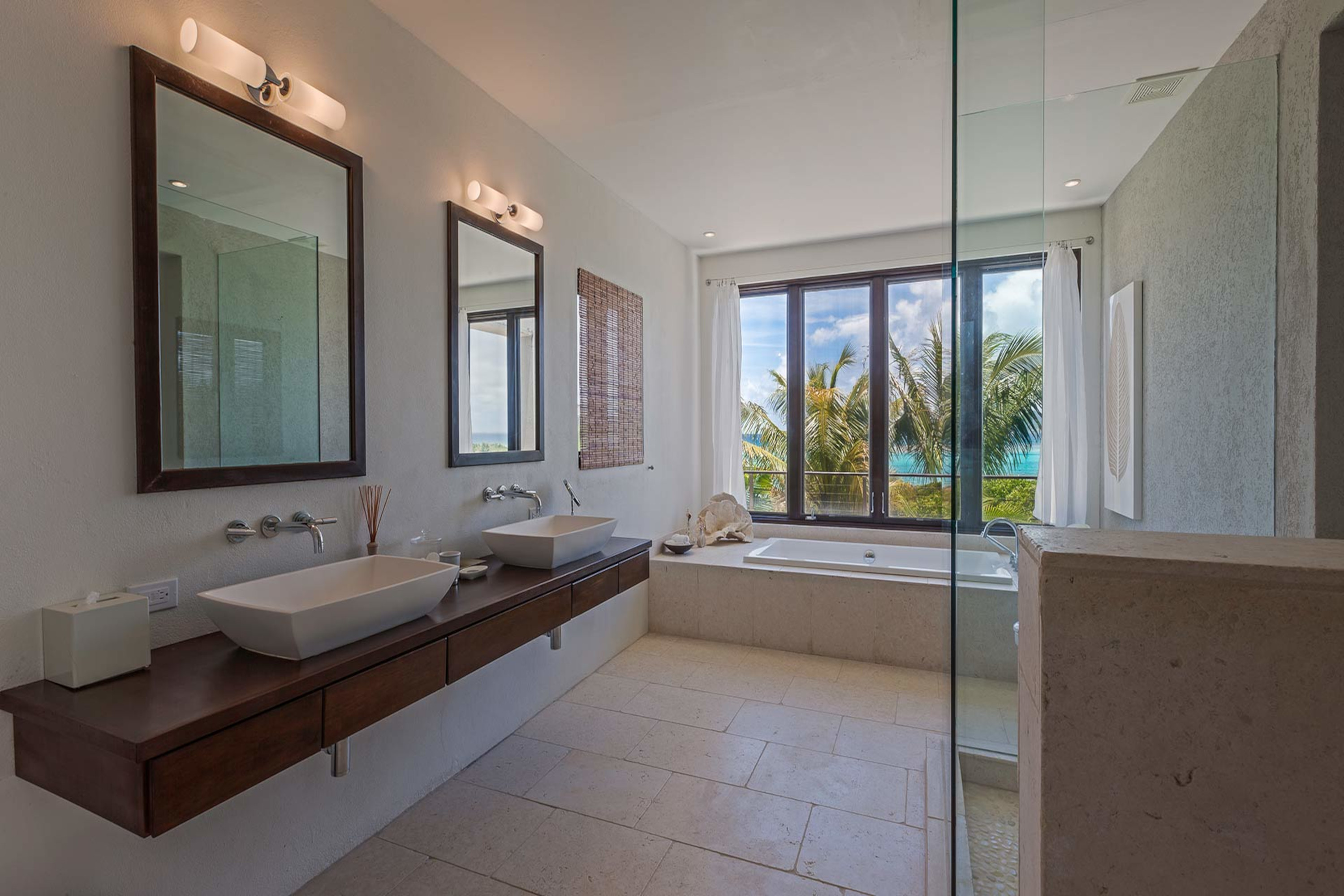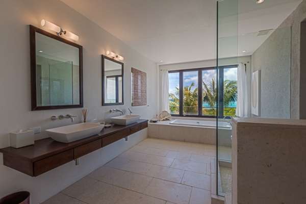 On either side of the great room are two master bedrooms, each with an ensuite, outdoor shower, and stunning views over the Caribbean. Downstairs are two more bedrooms; one with an ocean view, the other facing the garden. This second bedroom can be configured to have a pair of twin beds, ideal for children.