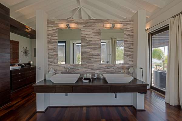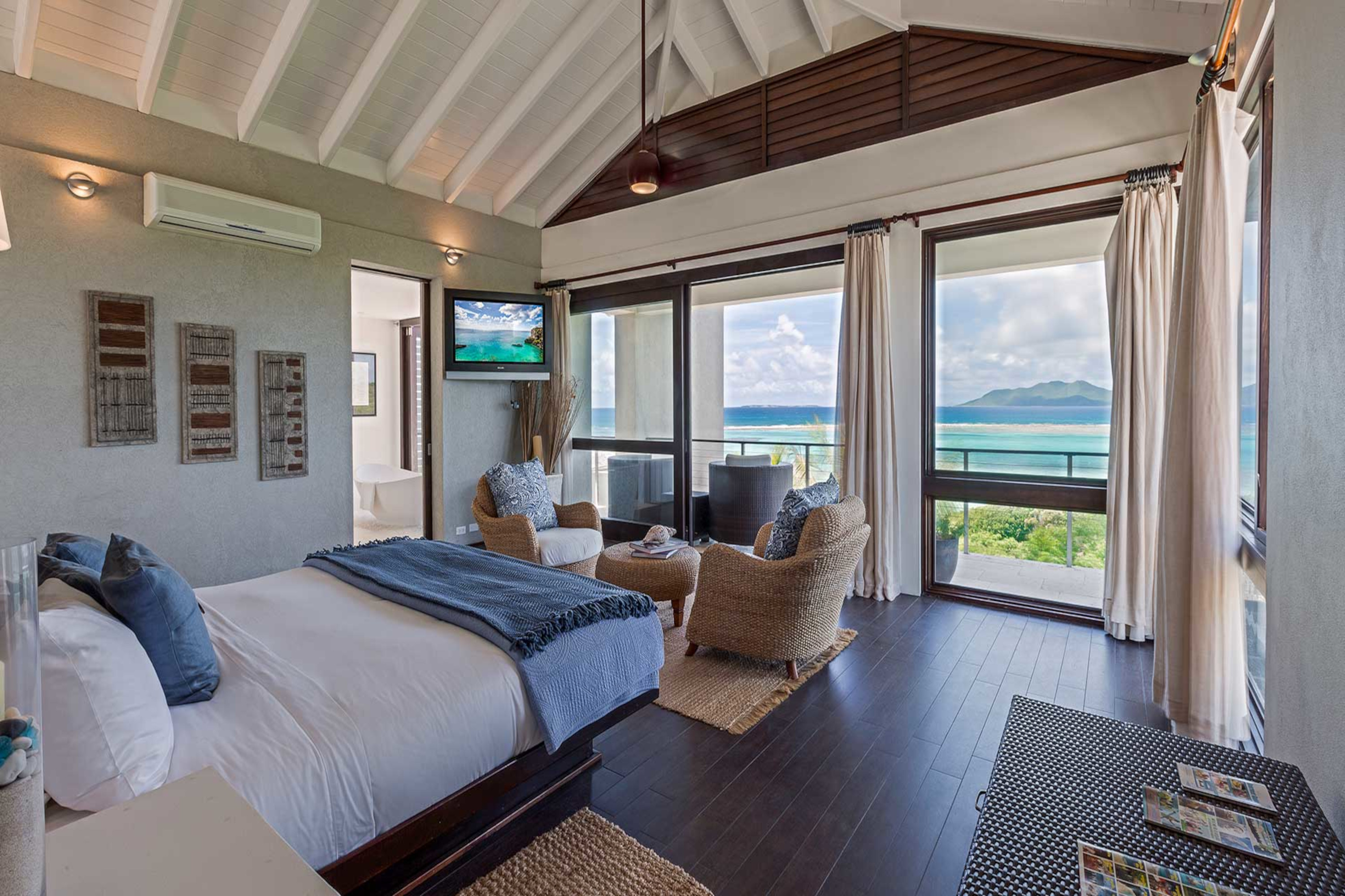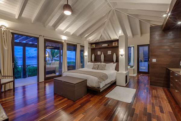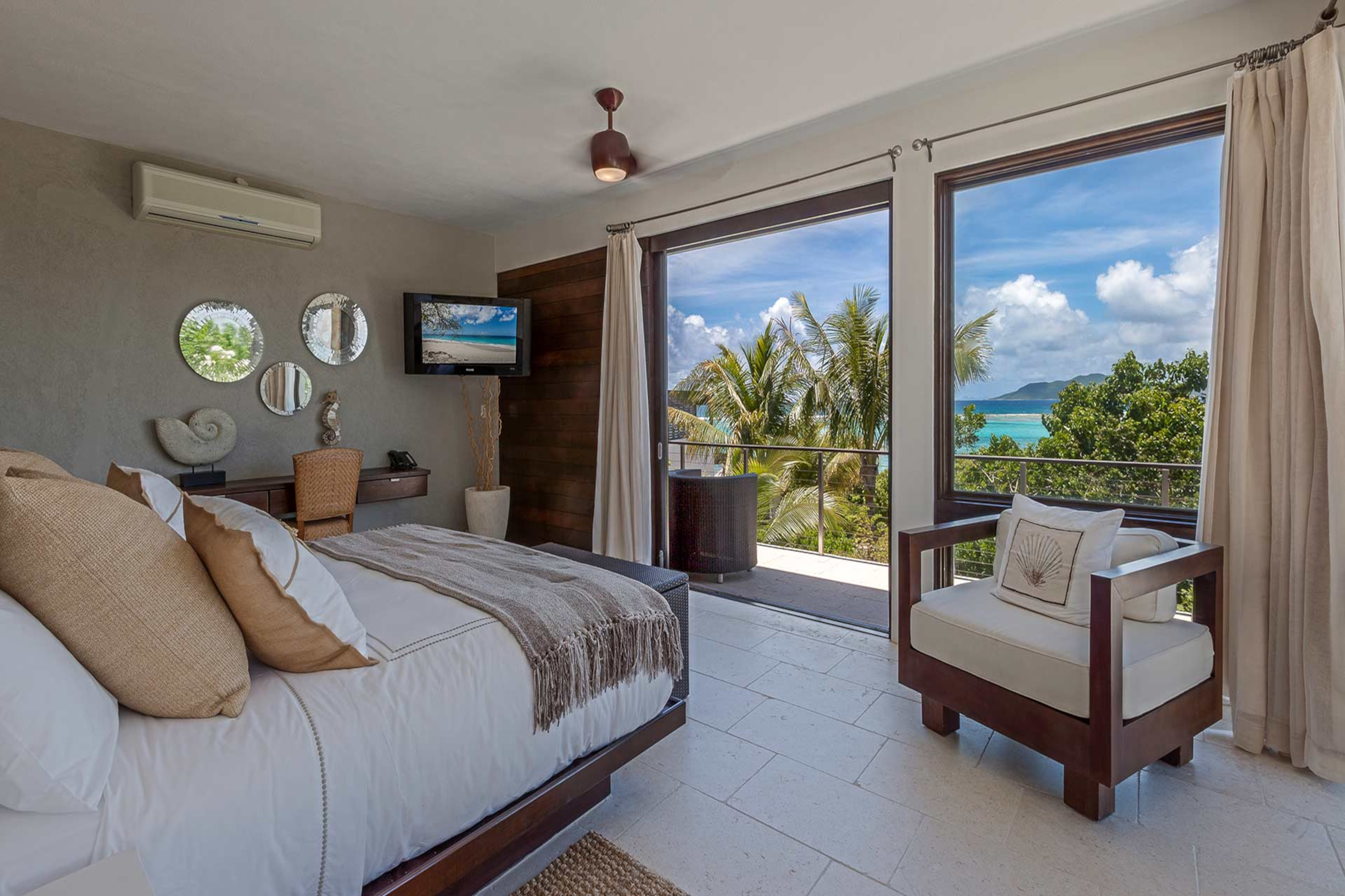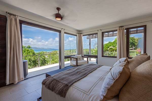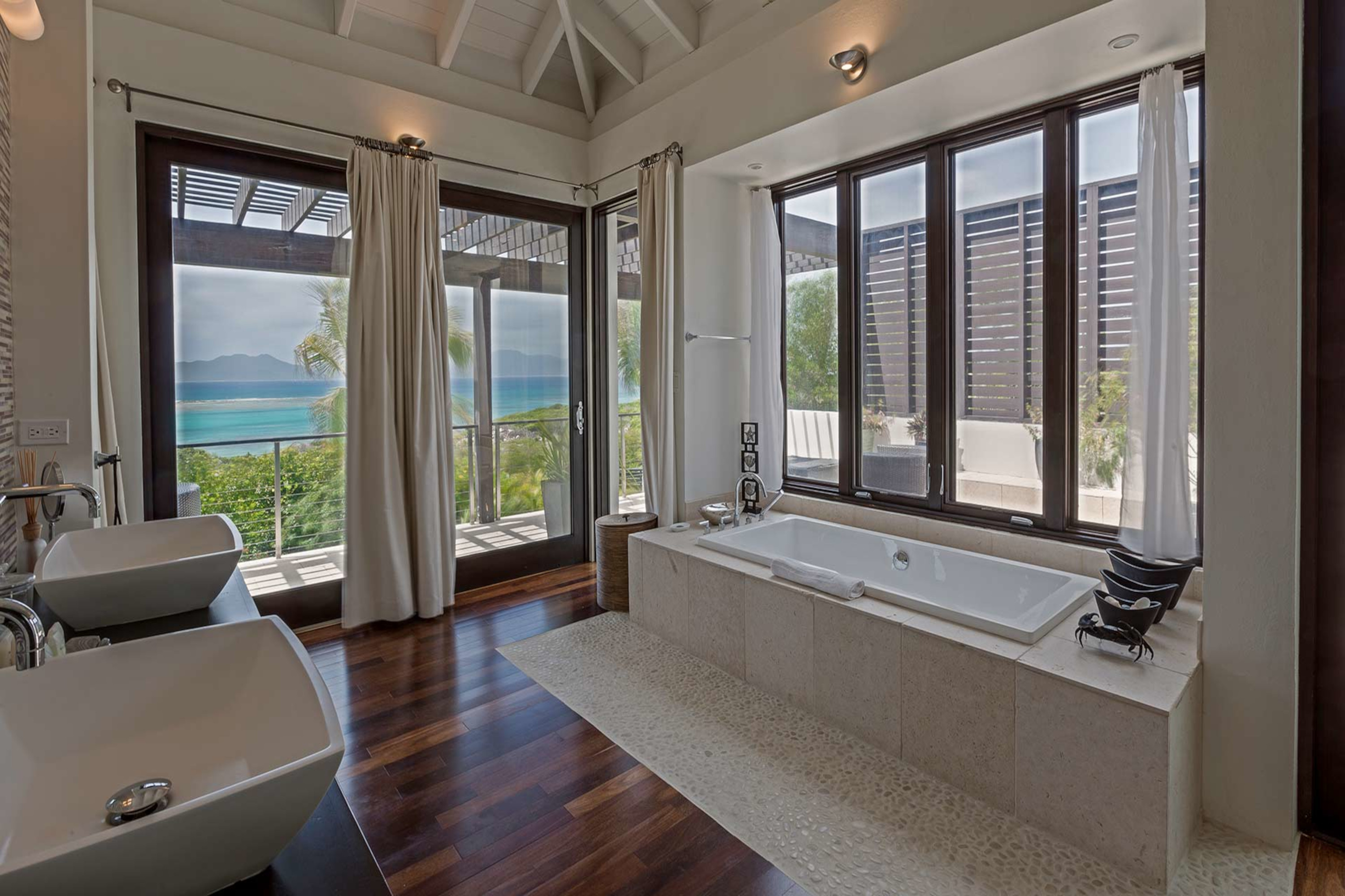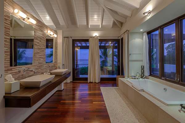 On either side of the great room are two master bedrooms, each with an ensuite, outdoor shower, and stunning views over the Caribbean. Downstairs are two more bedrooms; one with an ocean view, the other facing the garden. This second bedroom can be configured to have a pair of twin beds, ideal for children.