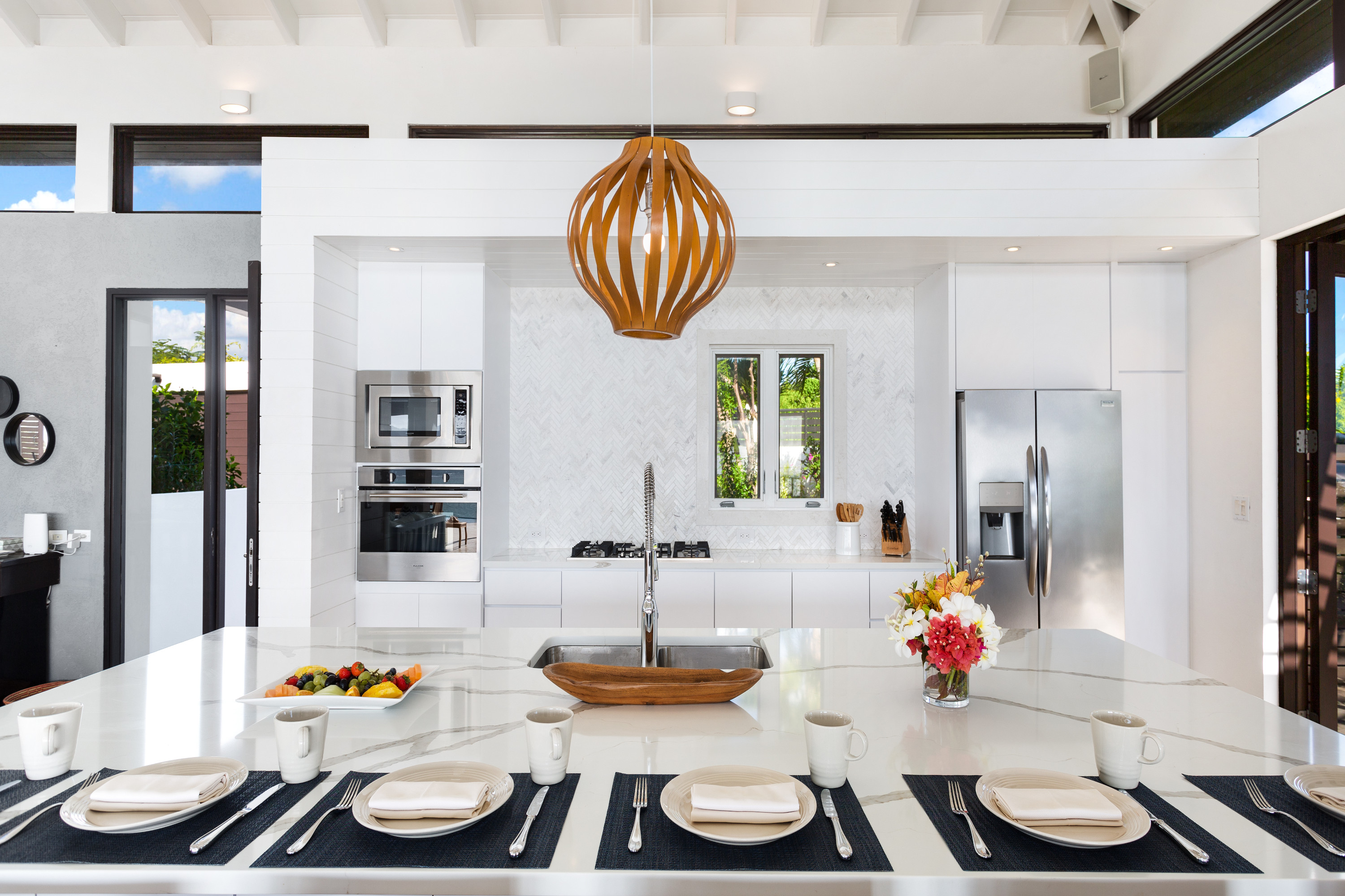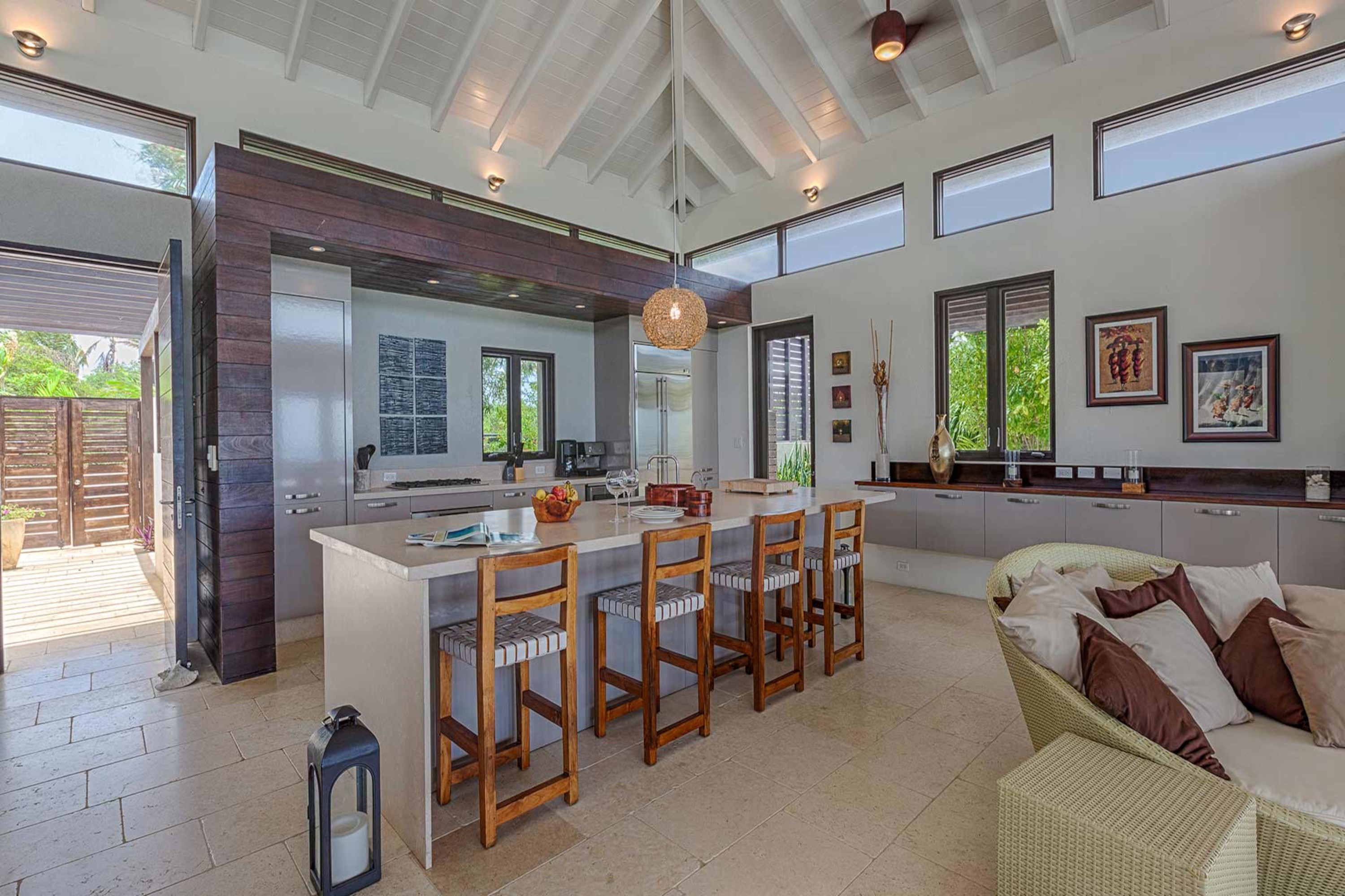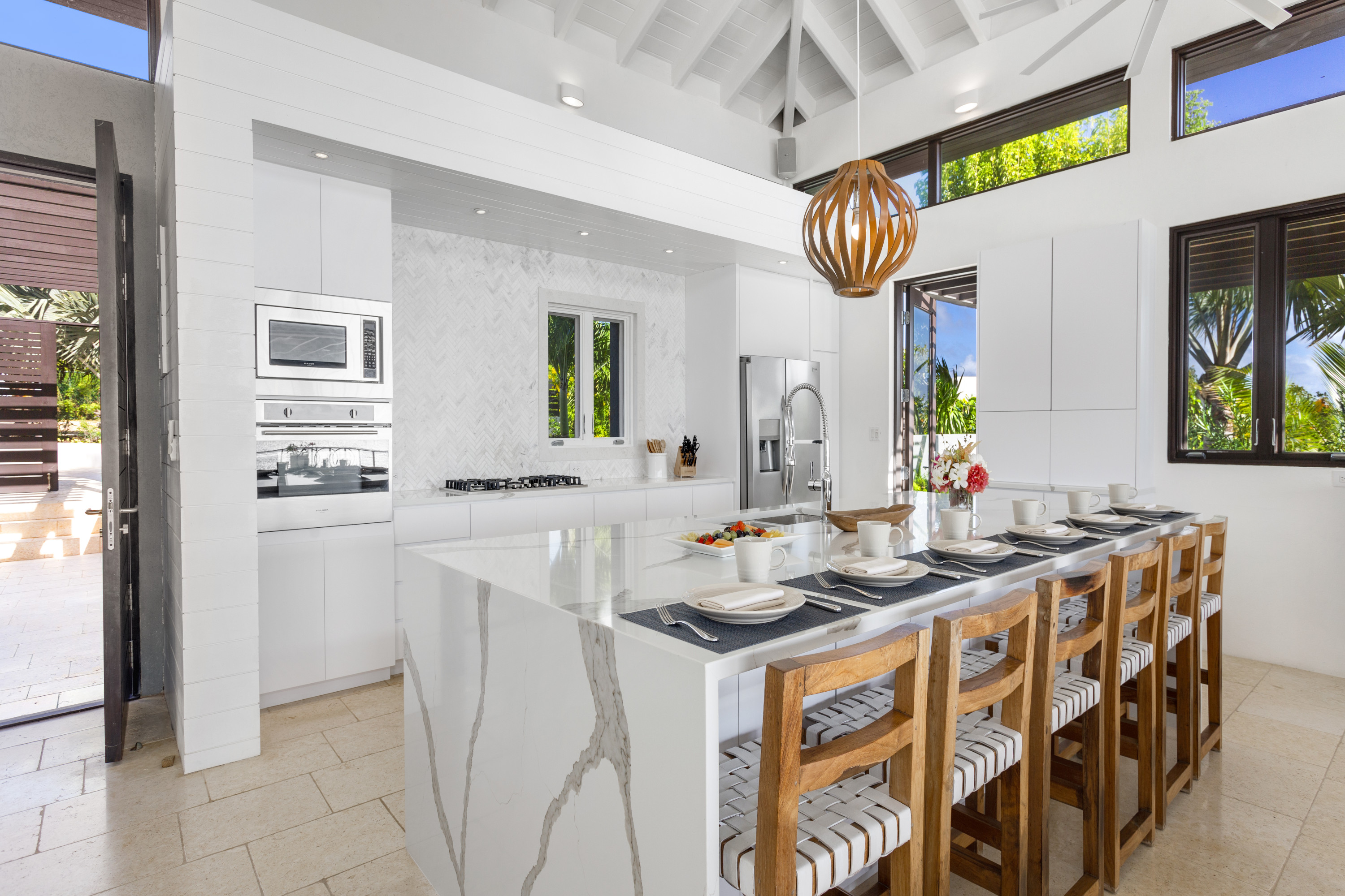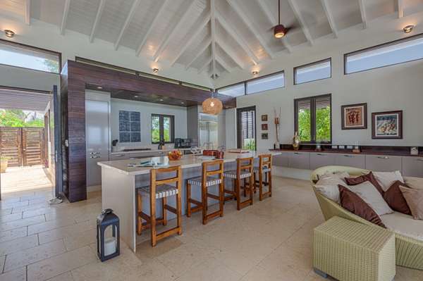 Relaxing, airy, and spacious, the living spaces inside Villa Odyssey will quickly help you slip into the slow pace of life on the island. A great room with vaulted ceilings above is home to the living room, dining area, and kitchen, with wall-to-wall doors opening onto the pool terrace.