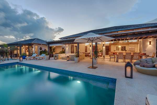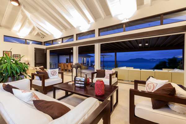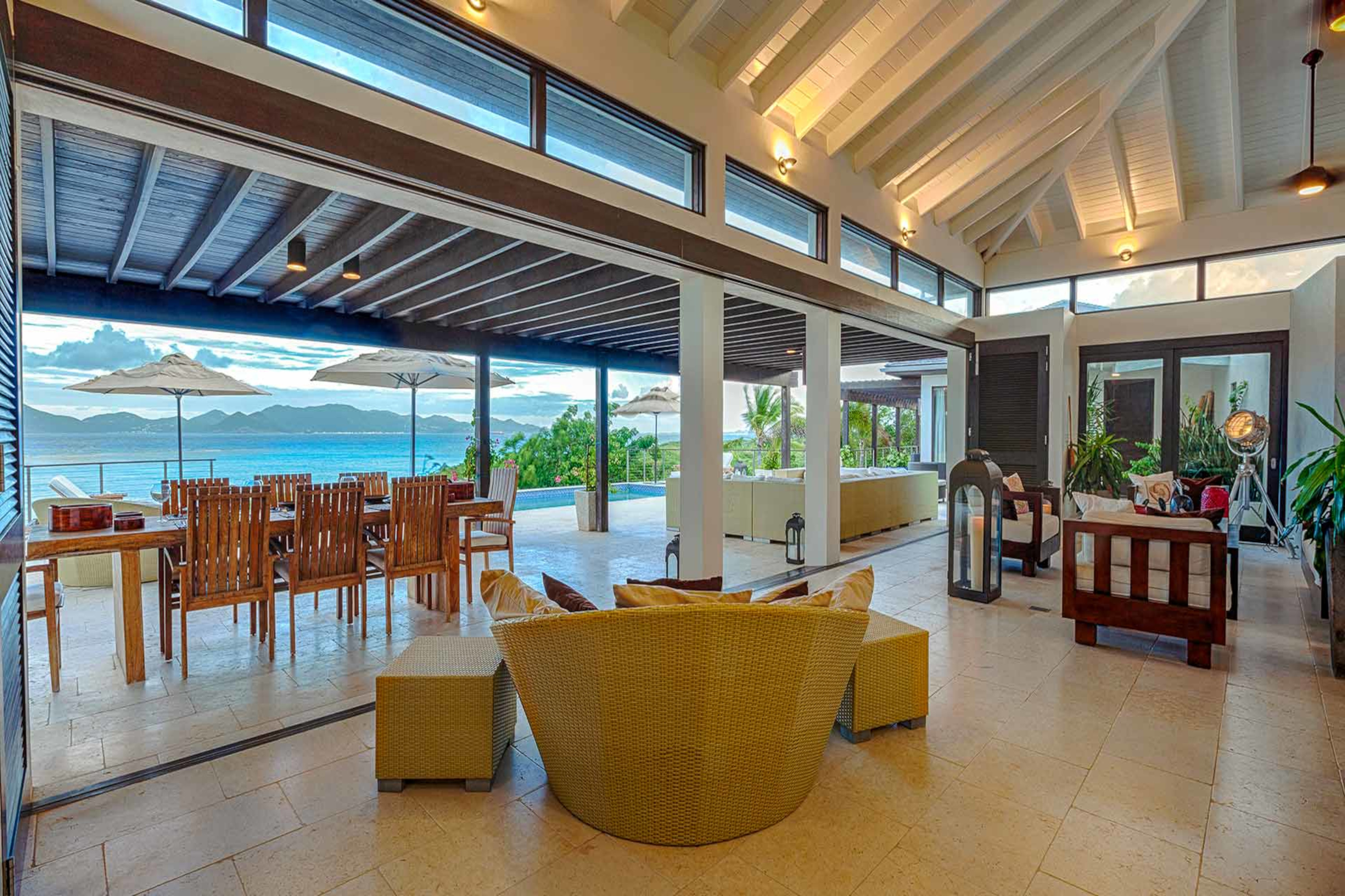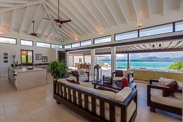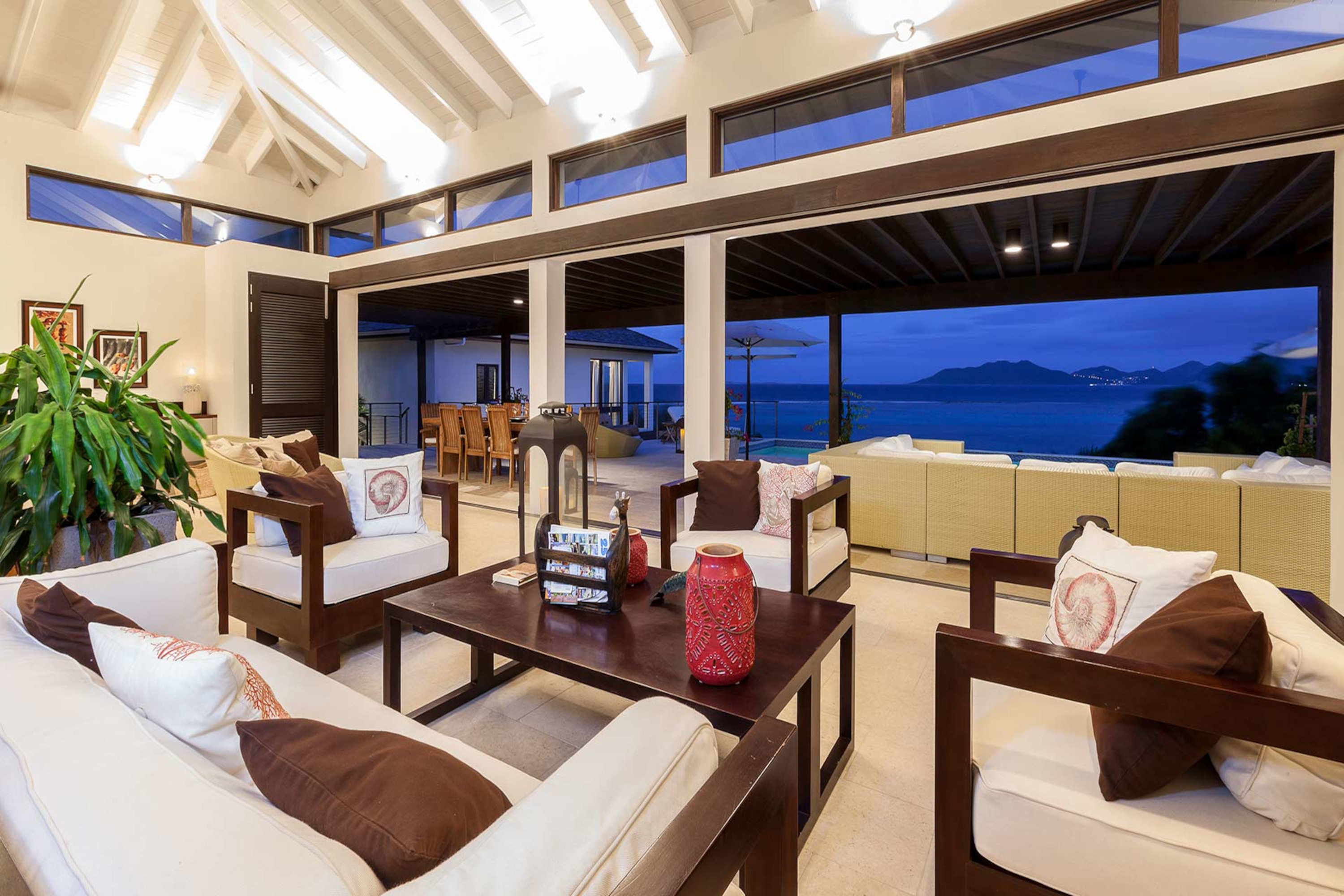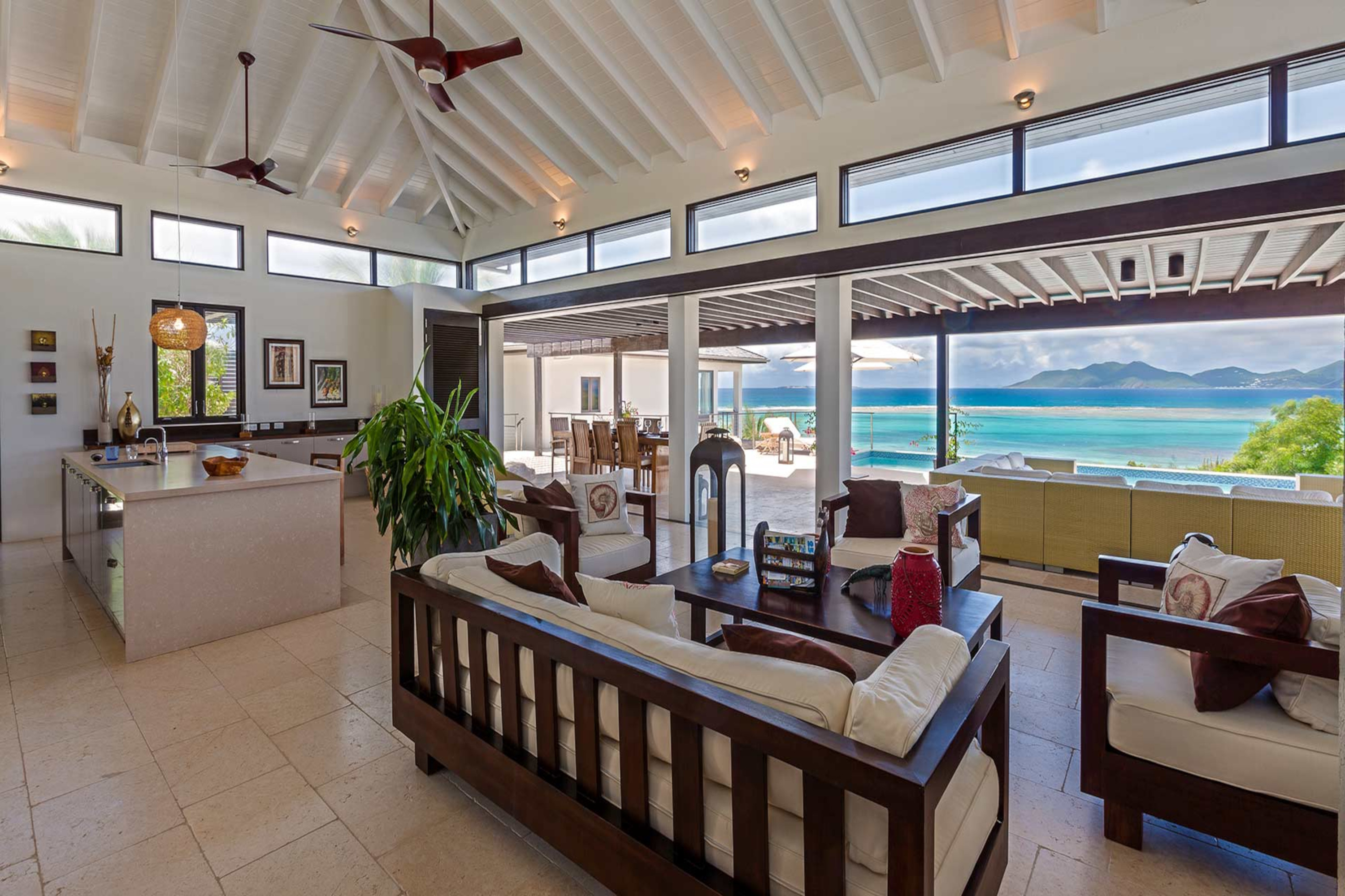 Relaxing, airy, and spacious, the living spaces inside Villa Odyssey will quickly help you slip into the slow pace of life on the island. A great room with vaulted ceilings above is home to the living room, dining area, and kitchen, with wall-to-wall doors opening onto the pool terrace.