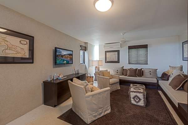The comfortable living room has several sofas and armchairs for sinking in and unwinding. The dark wooden furnishings contrast with the bright space; kick back here and you’re treated to incredible views over the sparkling ocean.