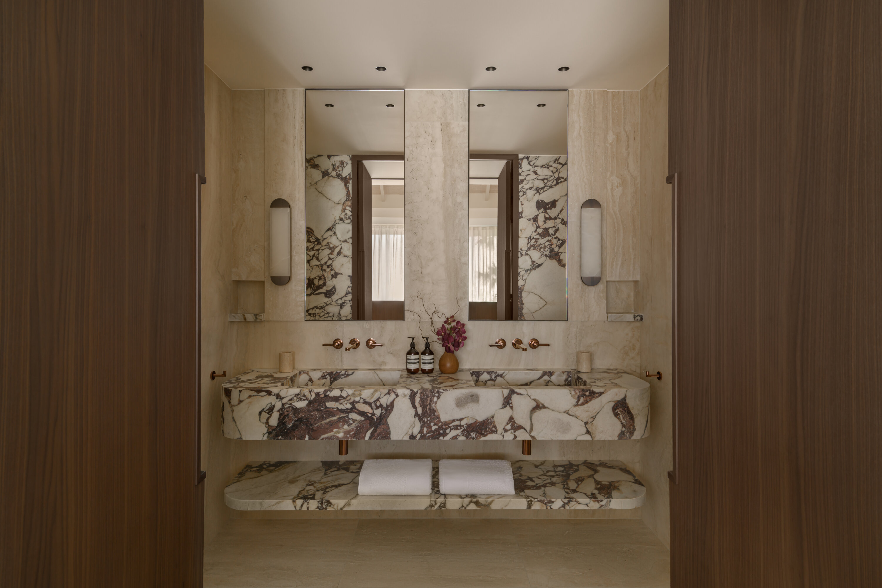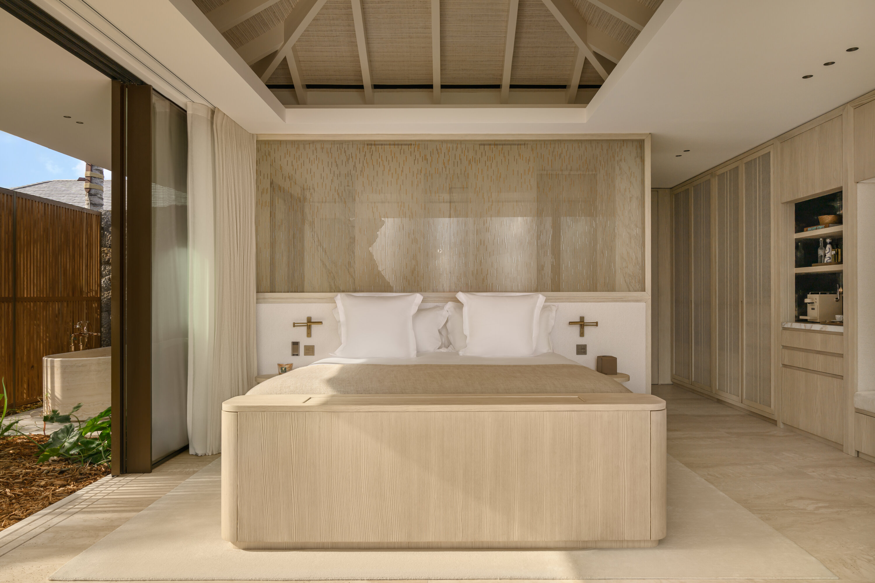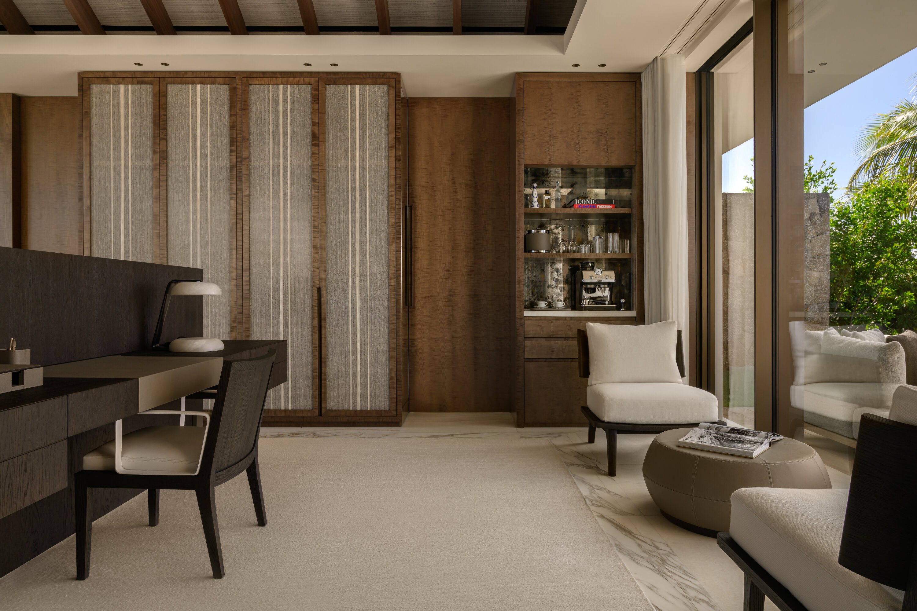 Each of the six suites is conceived as a private retreat facing the horizon, complete with king-size comfort, spa-inspired bathrooms, and terraces that capture the first glow of sunrise and the final shimmer of sunset. The primary suite offers an added layer of indulgence with its spacious living area, dressing room, bar, hammam, and a bathing experience reminiscent of a secluded spa—an intimate world within the villa where tranquility reigns.