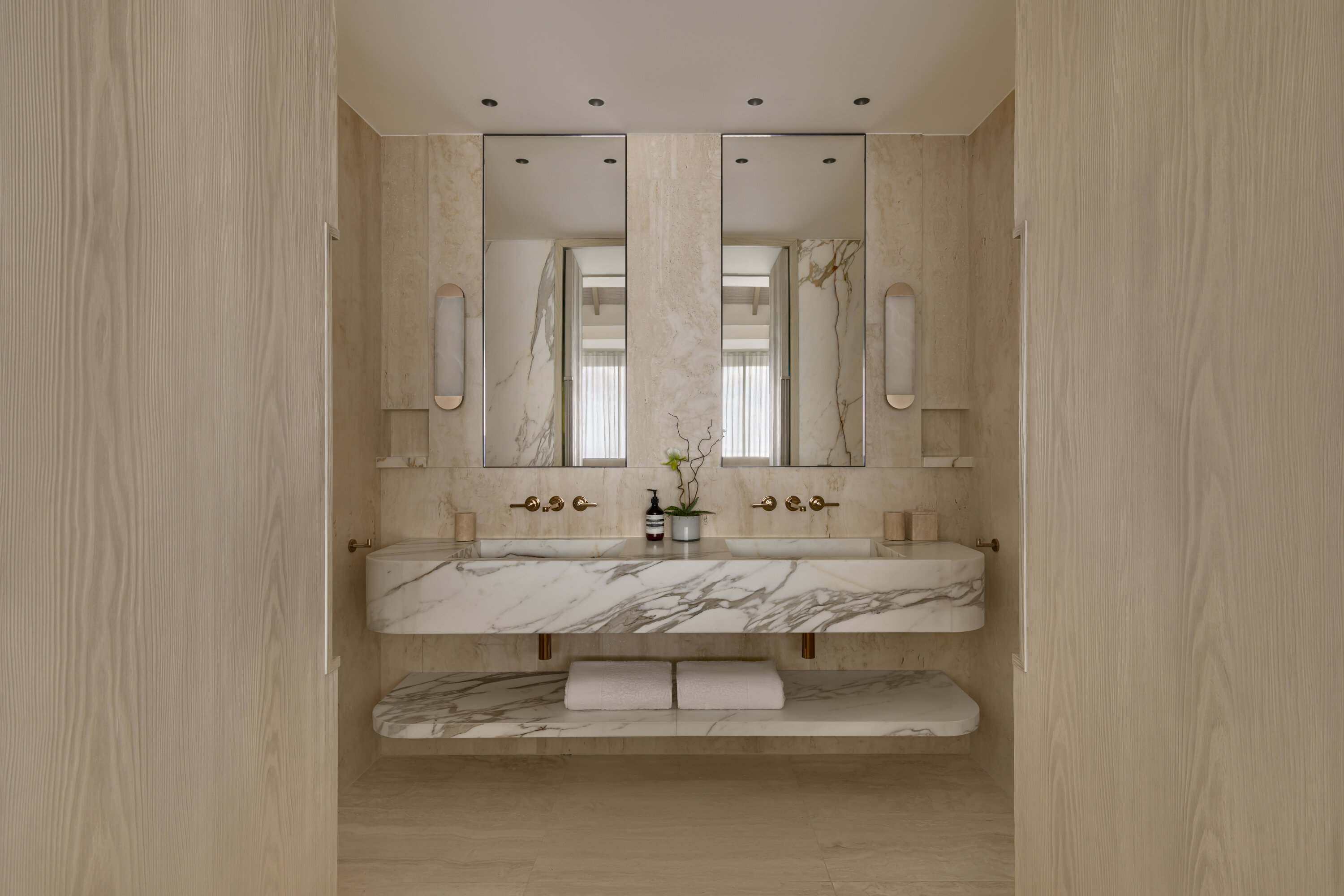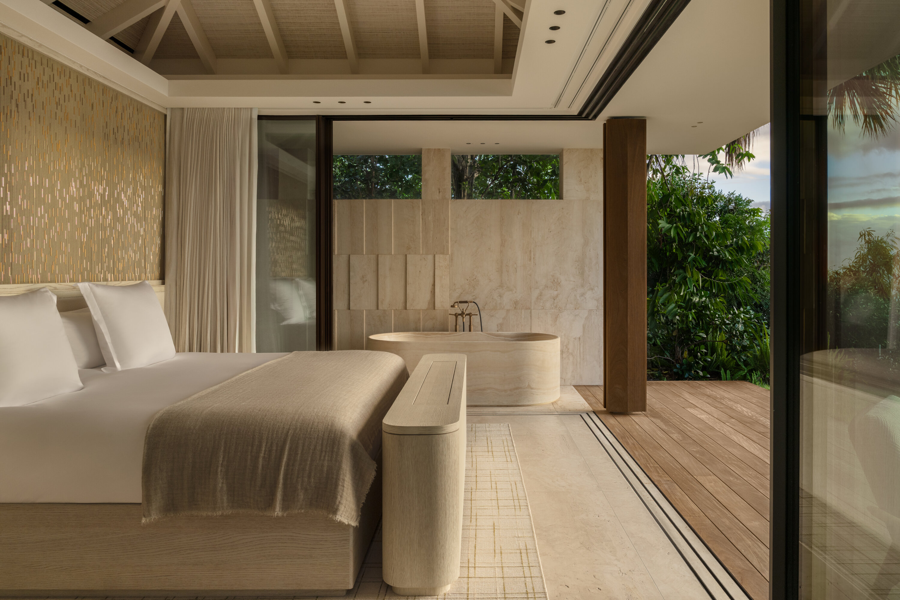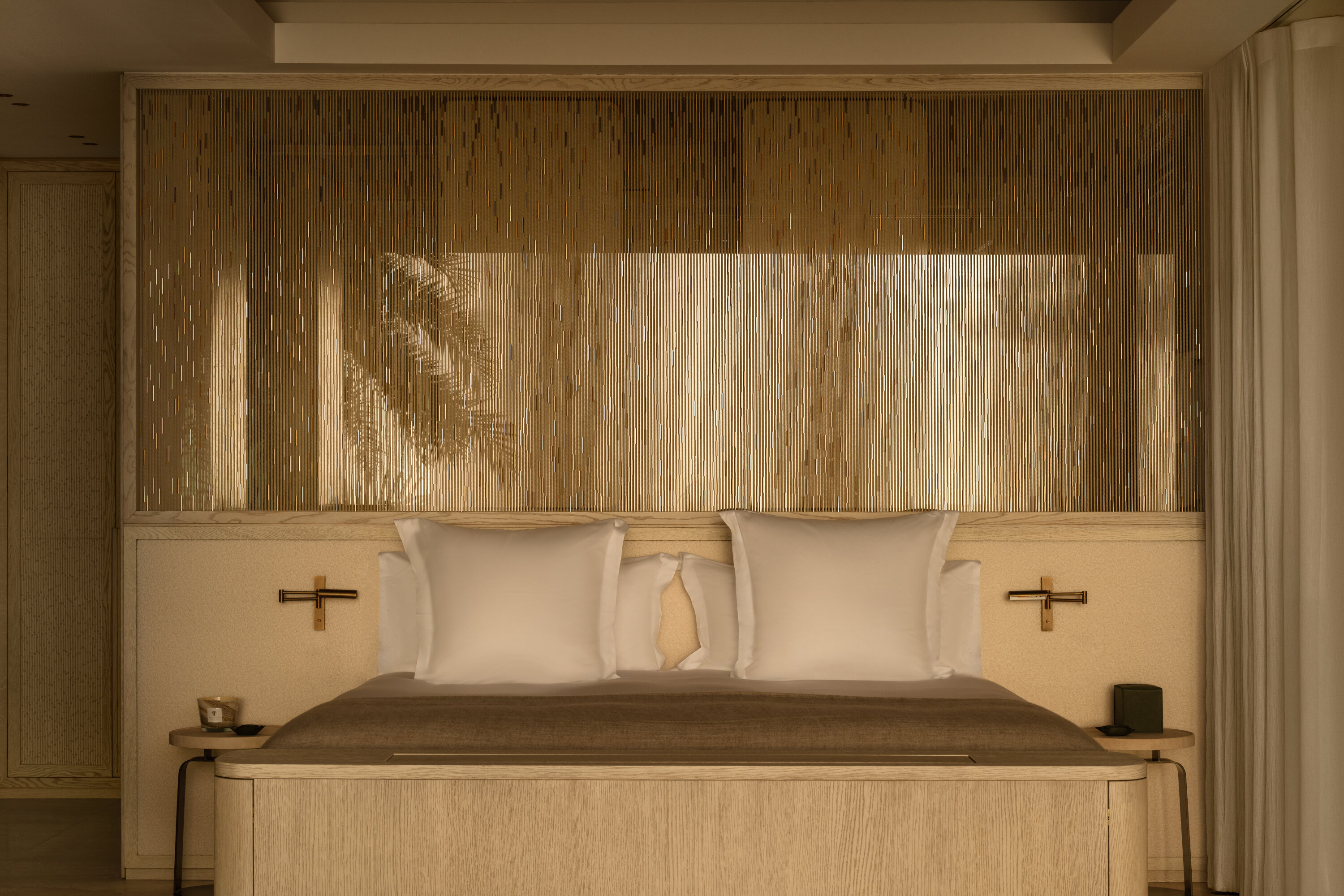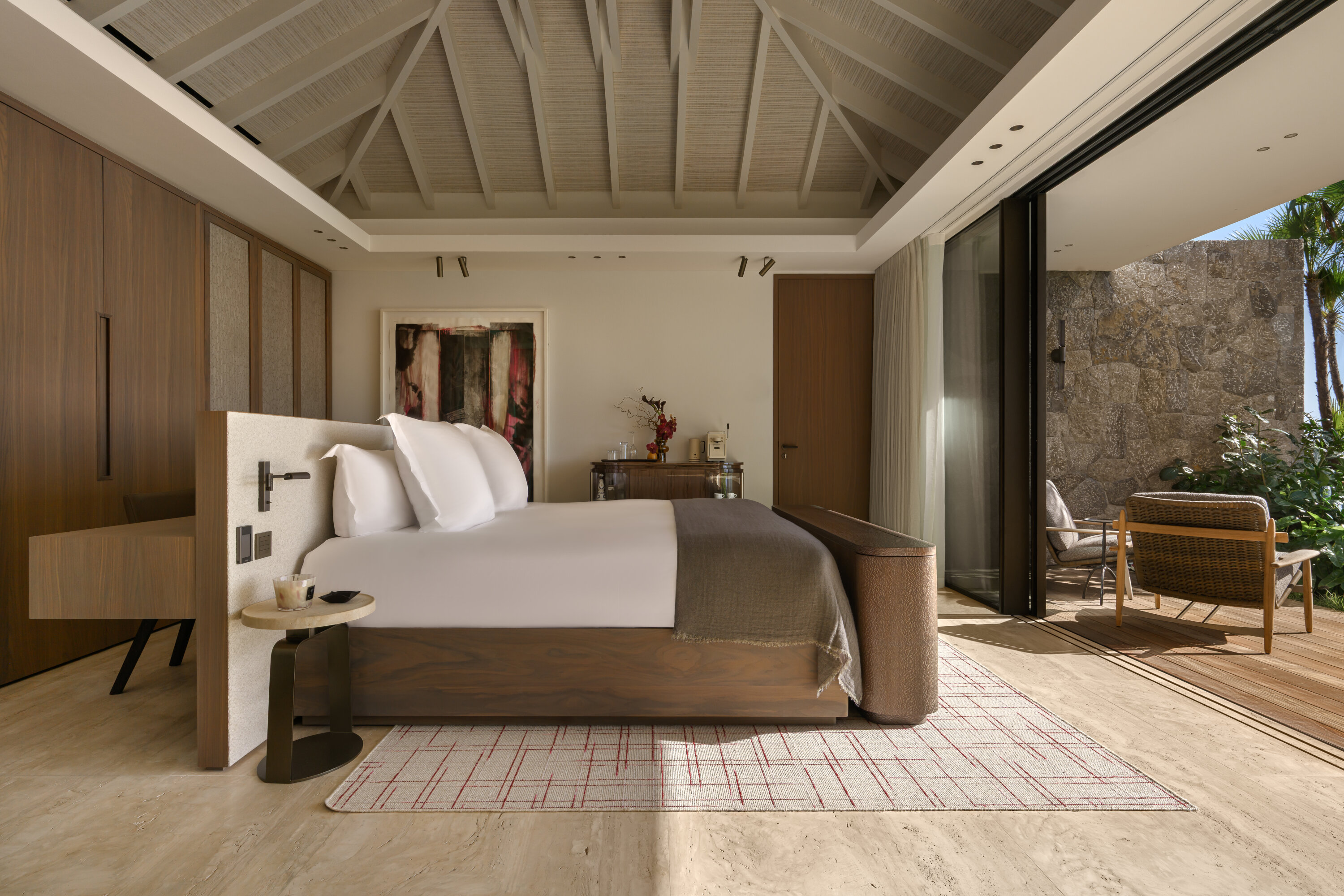 Each of the six suites is conceived as a private retreat facing the horizon, complete with king-size comfort, spa-inspired bathrooms, and terraces that capture the first glow of sunrise and the final shimmer of sunset. The primary suite offers an added layer of indulgence with its spacious living area, dressing room, bar, hammam, and a bathing experience reminiscent of a secluded spa—an intimate world within the villa where tranquility reigns.