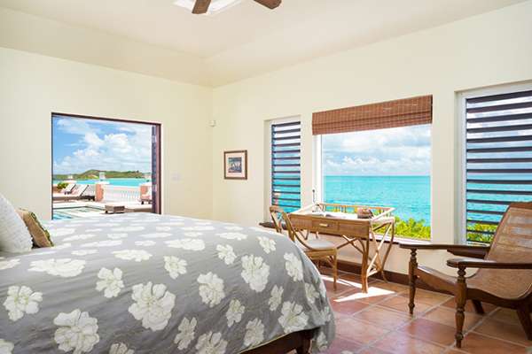 The master suite with a king-sized bed lies next to the main house, featuring alluring views over the pool and ocean. Waking up with these views is sublime.