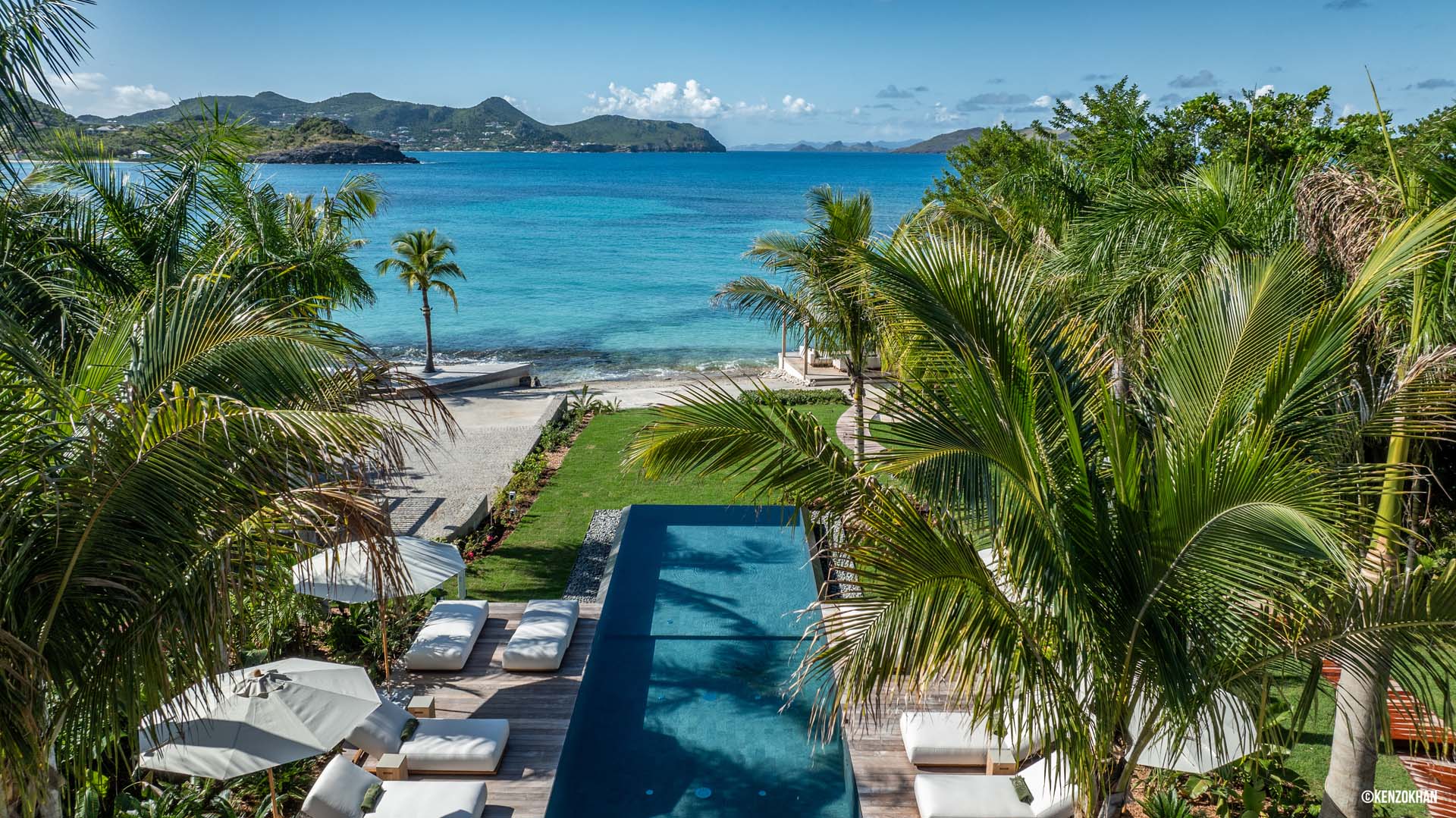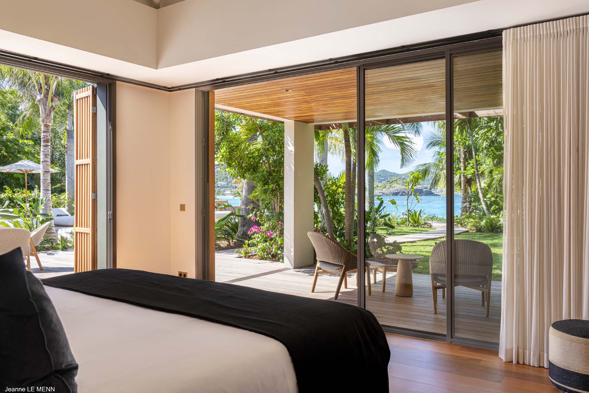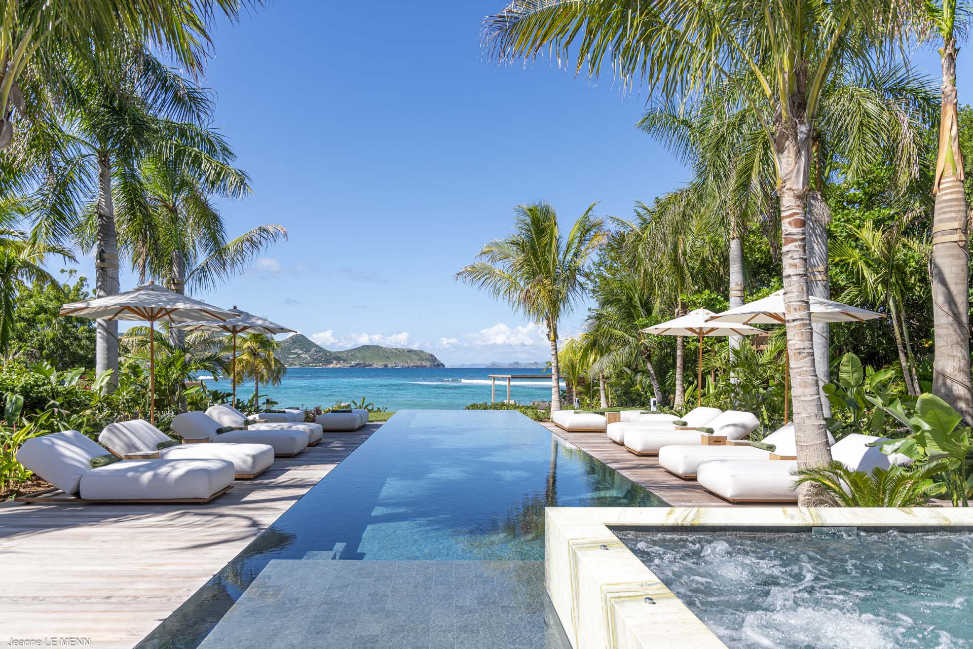 Welcome to Villa Palm Beach (villa code: WV ABV), a luxurious 5-bedroom villa located on the shores of Lorient bay on St. Barts. This waterfront villa is one of the most luxurious vacation rentals on St. Barts. The contemporary interiors are sleek and comfortable, with hardwood floors, vaulted ceilings, and thoughtful décor and artworks. Located on the shores of Lorient Bay, just a short walk to stairs down to the beach, with a waterfront terrace to relax on. From here you have Views of the islands of Île Toc Vers, Île Frégate, and Île Bonhomme, and the restaurants and shops of St. Jean are just 5-minutes away by car. Stepping through the entrance at Palm Beach Villa reveals the airy and gorgeous great room. Here you’ll find a comfortable living room, a gourmet kitchen, and a dining room with a large table. The living room has several soft sofas, great spots to sink in with your morning coffee or a good book. A large flat-screen TV is set in the entertainment unit, ideal for movie nights. When it’s time to experiment with some local French and Creole flavors, Palm Beach Villa’s kitchen has everything you need. Our concierge can even organize grocery pre-stocking or delivery, catered meals, or arrange private chef service. The dining room table has seats for up to 8 guests, a fine choice for dinner parties. If you prefer the open air, on the covered terrace outside is another table, letting you enjoy your meal while gazing out at the shimmering Caribbean. There are 5 bedrooms in total at Palm Beach Villa. Each room is luxurious and quiet, with plush king-sized beds made of dark island teak. The first 4 bedrooms are in the main house, with two on each side of the living room. Each of these rooms looks out west across the pool towards Lorient Bay, with the hill rising on the other side of the water. The fifth bedroom is in its own bungalow, located at the rear of the property. This space has a king-sized bed, and ensuite bathroom, and comes with a small kitchenette and dining area on its outdoor terrace. It’s a great choice for teenagers or a nanny taking care of smaller children. The outdoor living areas are made for entertaining. Why not host a cocktail soiree at sunset, kicking back on the outdoor sofa to enjoy the rosy gold sunset? Spend a day with friends and family by the pool? Or fire up the gas grill for an island-style cookout? At Palm Beach Villa, you can do it all. The infinity pool is the star of the show, framed on either side by loungers for sunbathing or working poolside. Above, palm trees sway in the wind, while the lush gardens on all sides provide peerless privacy, with lazy hammocks strung between trees. To the right, a luxurious daybed underneath a shady gazebo is ideal for settling in with a good book, or simply forgetting the rush of modern life. As night falls, the jacuzzi next to the pool is a fine spot to kick back with a glass of champagne, watching as the stars appear above. The waters in front of the villa are home to coral formations, making it an ideal place for swimming and snorkeling. At the opposite end of Lorient beach, you’ll find good surfing. When you want to explore, the beaches at St. Jean and Marigot Bay Beach are also just 5 minutes away by car. During the Thanksgiving and December holidays, the villa rents at full occupancy rates regardless of how many bedrooms are used. Please note – this villa requires a $6,000 security deposit, which is refundable after departure. A $4,000 party fee is also required.Please fill out the form to begin your inquiry and we will connect you with a seasoned villa rental specialist.