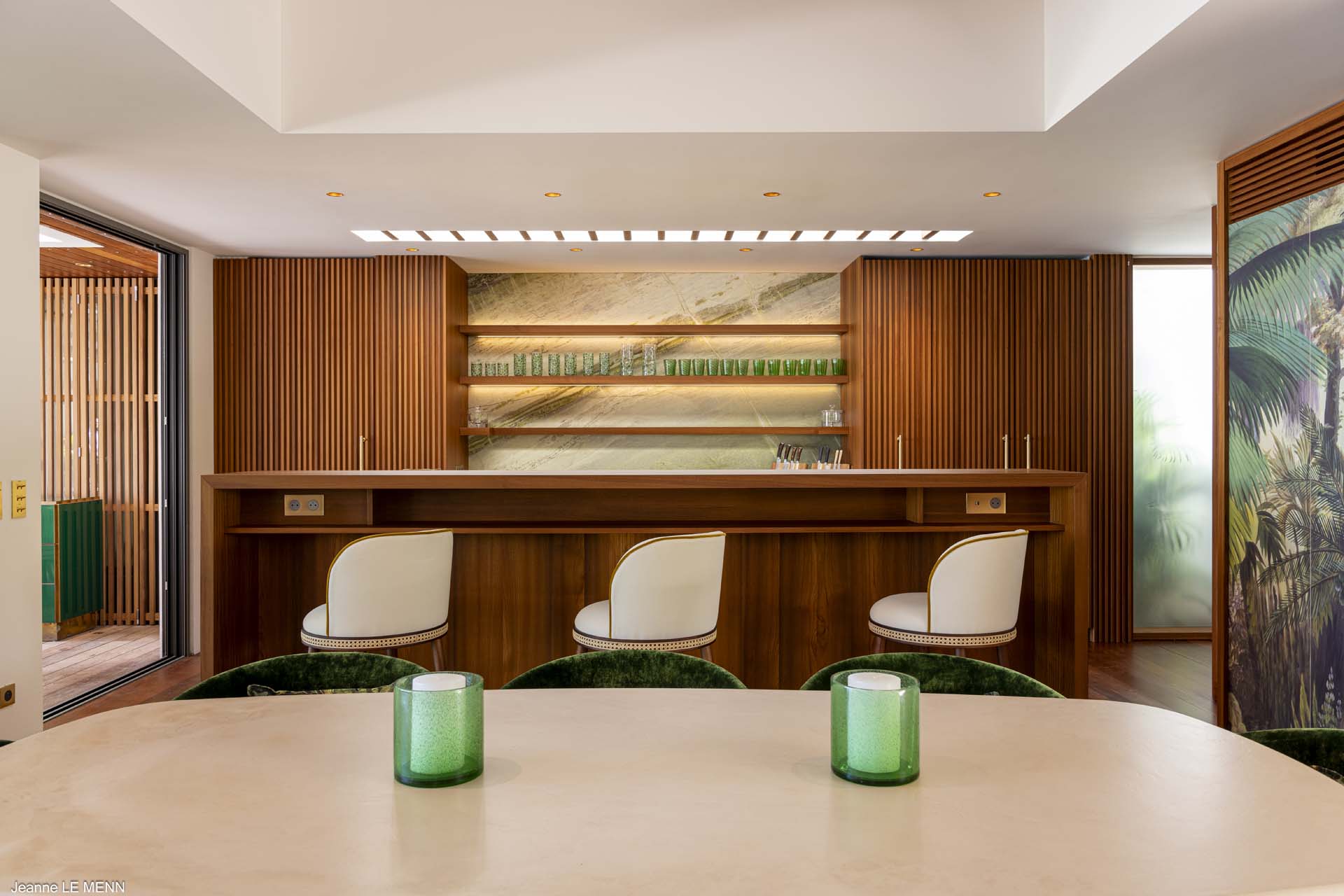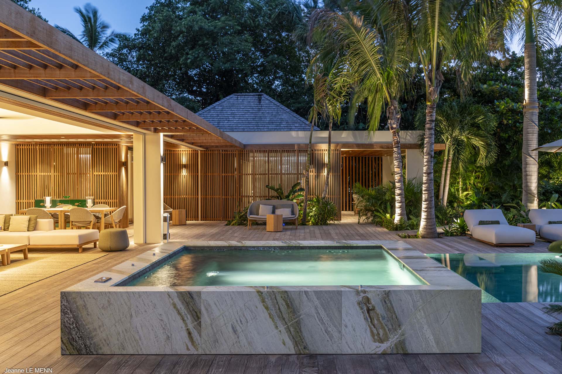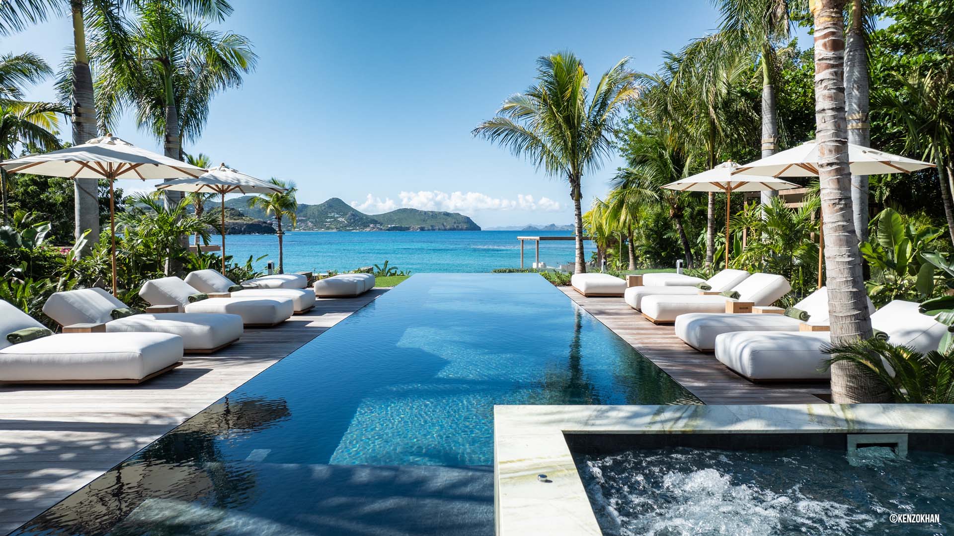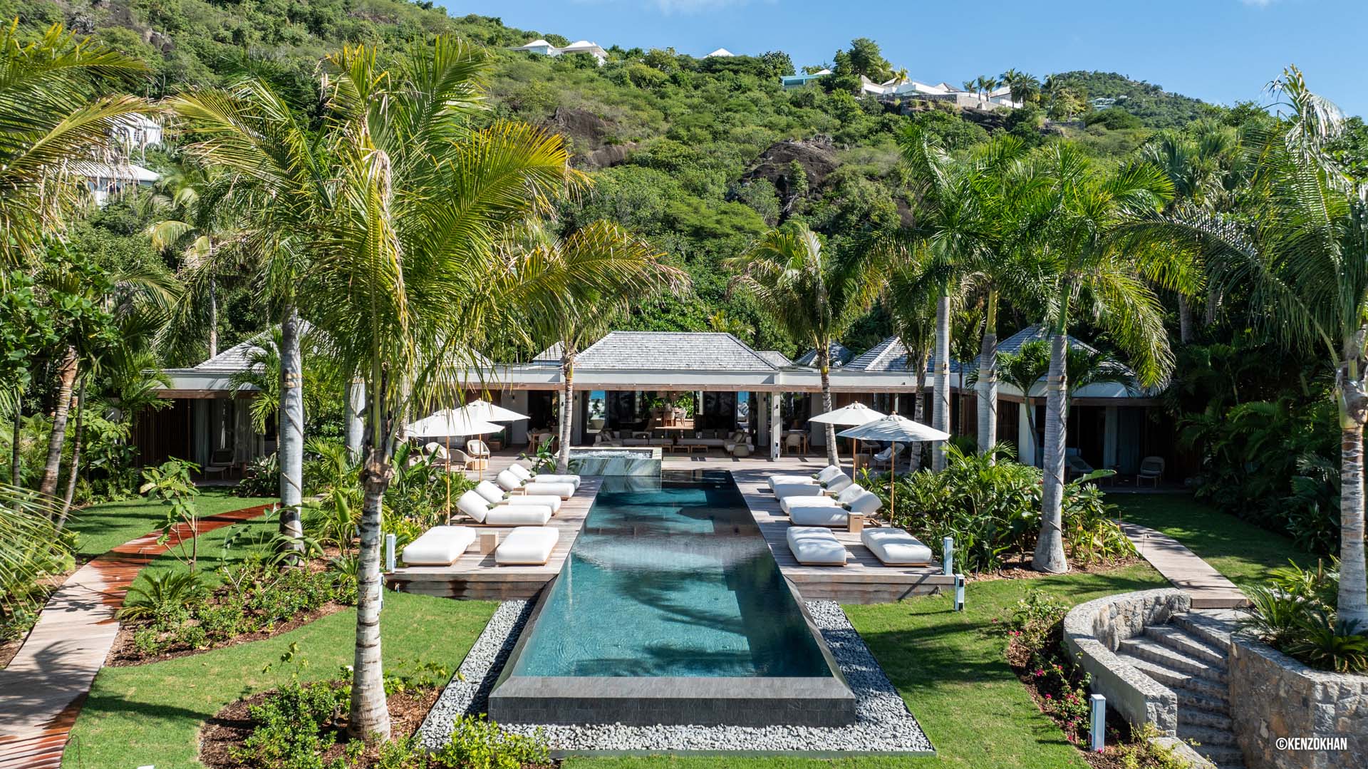 Welcome to Villa Palm Beach (villa code: WV ABV), a luxurious 5-bedroom villa located on the shores of Lorient bay on St. Barts. This waterfront villa is one of the most luxurious vacation rentals on St. Barts. The contemporary interiors are sleek and comfortable, with hardwood floors, vaulted ceilings, and thoughtful décor and artworks. Located on the shores of Lorient Bay, just a short walk to stairs down to the beach, with a waterfront terrace to relax on. From here you have Views of the islands of Île Toc Vers, Île Frégate, and Île Bonhomme, and the restaurants and shops of St. Jean are just 5-minutes away by car. Stepping through the entrance at Palm Beach Villa reveals the airy and gorgeous great room. Here you’ll find a comfortable living room, a gourmet kitchen, and a dining room with a large table. The living room has several soft sofas, great spots to sink in with your morning coffee or a good book. A large flat-screen TV is set in the entertainment unit, ideal for movie nights. When it’s time to experiment with some local French and Creole flavors, Palm Beach Villa’s kitchen has everything you need. Our concierge can even organize grocery pre-stocking or delivery, catered meals, or arrange private chef service. The dining room table has seats for up to 8 guests, a fine choice for dinner parties. If you prefer the open air, on the covered terrace outside is another table, letting you enjoy your meal while gazing out at the shimmering Caribbean. There are 5 bedrooms in total at Palm Beach Villa. Each room is luxurious and quiet, with plush king-sized beds made of dark island teak. The first 4 bedrooms are in the main house, with two on each side of the living room. Each of these rooms looks out west across the pool towards Lorient Bay, with the hill rising on the other side of the water. The fifth bedroom is in its own bungalow, located at the rear of the property. This space has a king-sized bed, and ensuite bathroom, and comes with a small kitchenette and dining area on its outdoor terrace. It’s a great choice for teenagers or a nanny taking care of smaller children. The outdoor living areas are made for entertaining. Why not host a cocktail soiree at sunset, kicking back on the outdoor sofa to enjoy the rosy gold sunset? Spend a day with friends and family by the pool? Or fire up the gas grill for an island-style cookout? At Palm Beach Villa, you can do it all. The infinity pool is the star of the show, framed on either side by loungers for sunbathing or working poolside. Above, palm trees sway in the wind, while the lush gardens on all sides provide peerless privacy, with lazy hammocks strung between trees. To the right, a luxurious daybed underneath a shady gazebo is ideal for settling in with a good book, or simply forgetting the rush of modern life. As night falls, the jacuzzi next to the pool is a fine spot to kick back with a glass of champagne, watching as the stars appear above. The waters in front of the villa are home to coral formations, making it an ideal place for swimming and snorkeling. At the opposite end of Lorient beach, you’ll find good surfing. When you want to explore, the beaches at St. Jean and Marigot Bay Beach are also just 5 minutes away by car. During the Thanksgiving and December holidays, the villa rents at full occupancy rates regardless of how many bedrooms are used. Please note – this villa requires a $6,000 security deposit, which is refundable after departure. A $4,000 party fee is also required.Please fill out the form to begin your inquiry and we will connect you with a seasoned villa rental specialist.