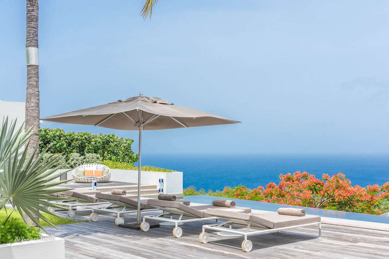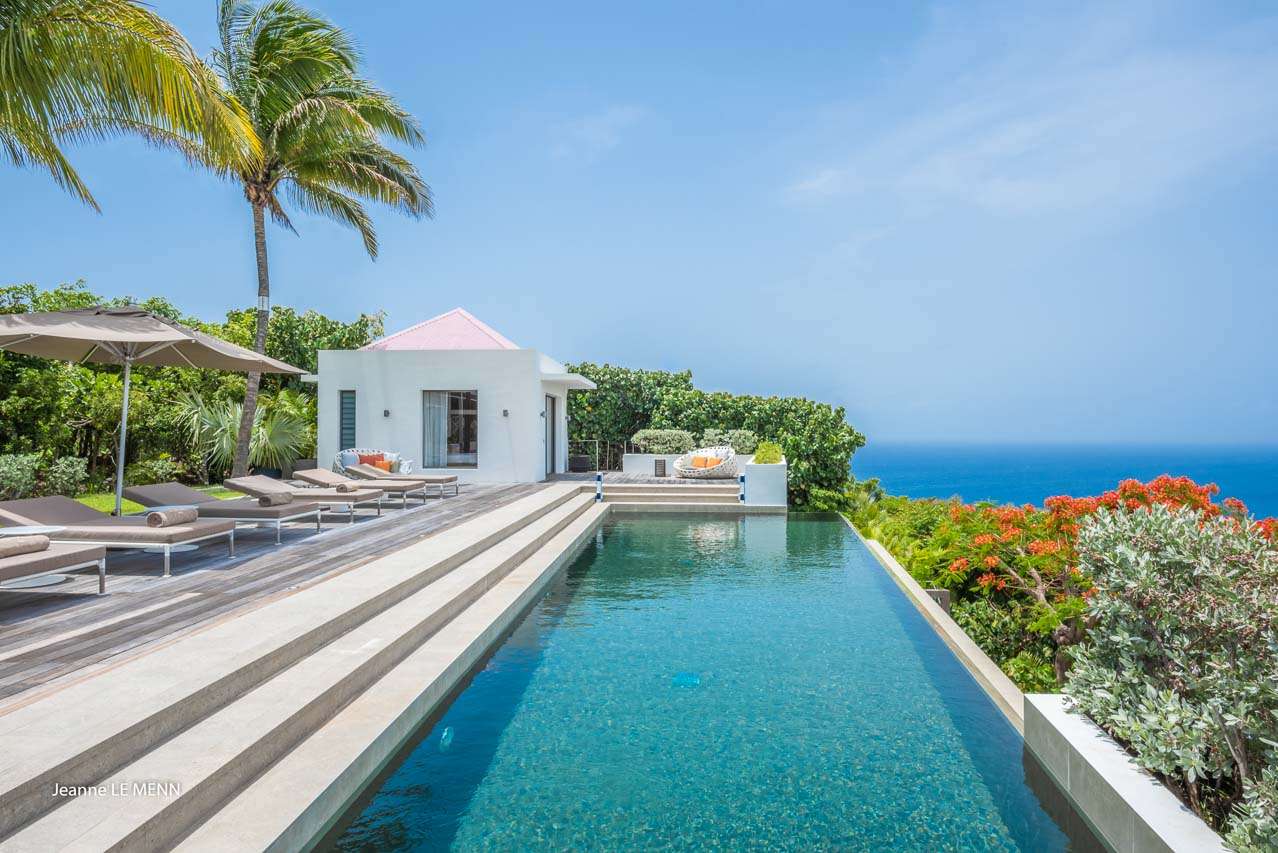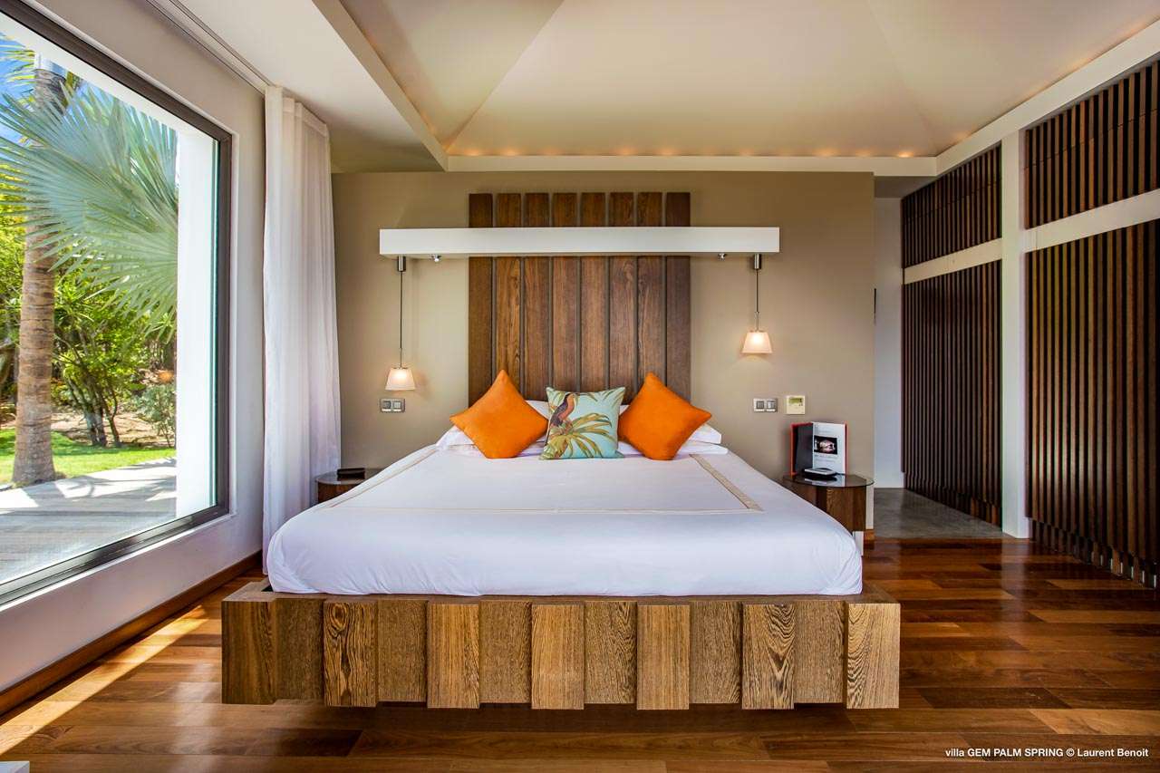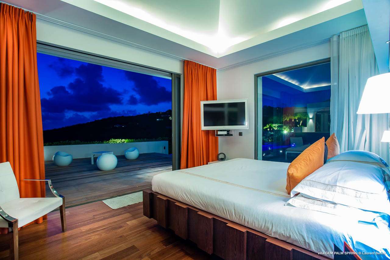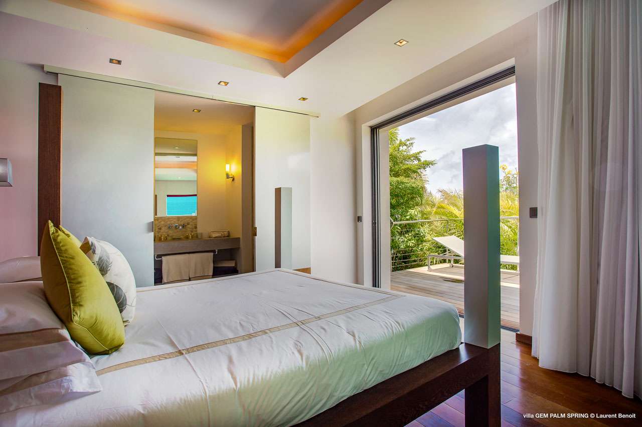 Welcome to Villa Palm Springs (villa code: WV GEM), a luxurious 5-bedroom villa in Gouverneur, St. Barts. This property offers outstanding sunset views and ocean breezes. Inspired by the design of Southern California homes in the '60s’, Villa Palm Springs is elegant, stylish, and contemporary. Blurring the line between inside and out, staying here lets you immerse yourself in the beauty of St. Barts. Chic décor, luxurious furnishings, and eye-catching photography add the finishing touches to this sophisticated vacation home. Nestled in the hills above Gouverneur, the location is hard to beat. Gouverneur Beach is just a short drive away, as are the beaches at Saline and St. Jean. Shops, restaurants, and bars are available in Gustavia, under 10 minutes away by car. Spread across a series of pavilions and bungalows, the living spaces at Palm Springs Villa are sublime. The main house features a living room and kitchen, with ingenious floor-to-ceiling windows opening to the view. The relaxing living room features a pair of sofas and a luxurious ottoman, ideal for unwinding. Sinking in here with a coffee, a good book, or a movie on the flat-screen TV is a great way to spend your day. From this cozy vantage point, the ocean views are incredible. Next to the living room is Villa Palm Springs’s gourmet kitchen. Equipped with the latest appliances, it can handle any culinary challenge thrown its way. Our concierge can organize grocery pre-stocking or delivery, catered meals, or arrange private chef service for a special occasion The dining table is on the covered terrace next to the living room, although thanks to the unique design you’ll feel as if you’re still in the main pavilion. There’s seating for up to 10 guests, making it a fabulous setting for gourmet meals in the cool evening air. There are 5 bedrooms at Palm Spring Villa, spread over the two levels to ensure the utmost privacy for each guest. Stylish prints from photographer Slim Aarons give each room a vintage feel, while TVs provide entertainment. In the main house is a 600-sq. ft. master suite, complete with an ensuite bathroom, his and her dressing areas, and a pebble-stoned rain shower. Two other bedrooms are below the master bedroom, each with an ensuite bathroom. A separate bungalow beyond the pool is home to the final two bedrooms, each spacious and quiet. Both rooms feature an ensuite and a private terrace, with vistas over the hills towards the shimmering Caribbean. The outdoor living spaces at Villa Palm Springs are sublime. There’s space to relax in the sun or shade, enjoying the glorious Caribbean weather on lounges or sunbeds. Next to the main house is the outdoor living area in a stylish pavilion. A glass wall at its back reveals a tropical garden, while in front are the stunning views of the Caribbean. It’s a luxurious spot to relax, whether you settle in with a good book or enjoy a sunset cocktail soiree. Steps away, the heated infinity pool is another tempting spot to kick back and enjoy the good life. For days at the beach, Gouverneur is a few minutes away by car, while within 10 minutes you could be lazing on the beach at St. Jean or Saline. During the Thanksgiving and December holidays, the villa rents at full occupancy rates regardless of how many bedrooms are used.Please fill out the form to begin your inquiry and we will connect you with a seasoned villa rental specialist.