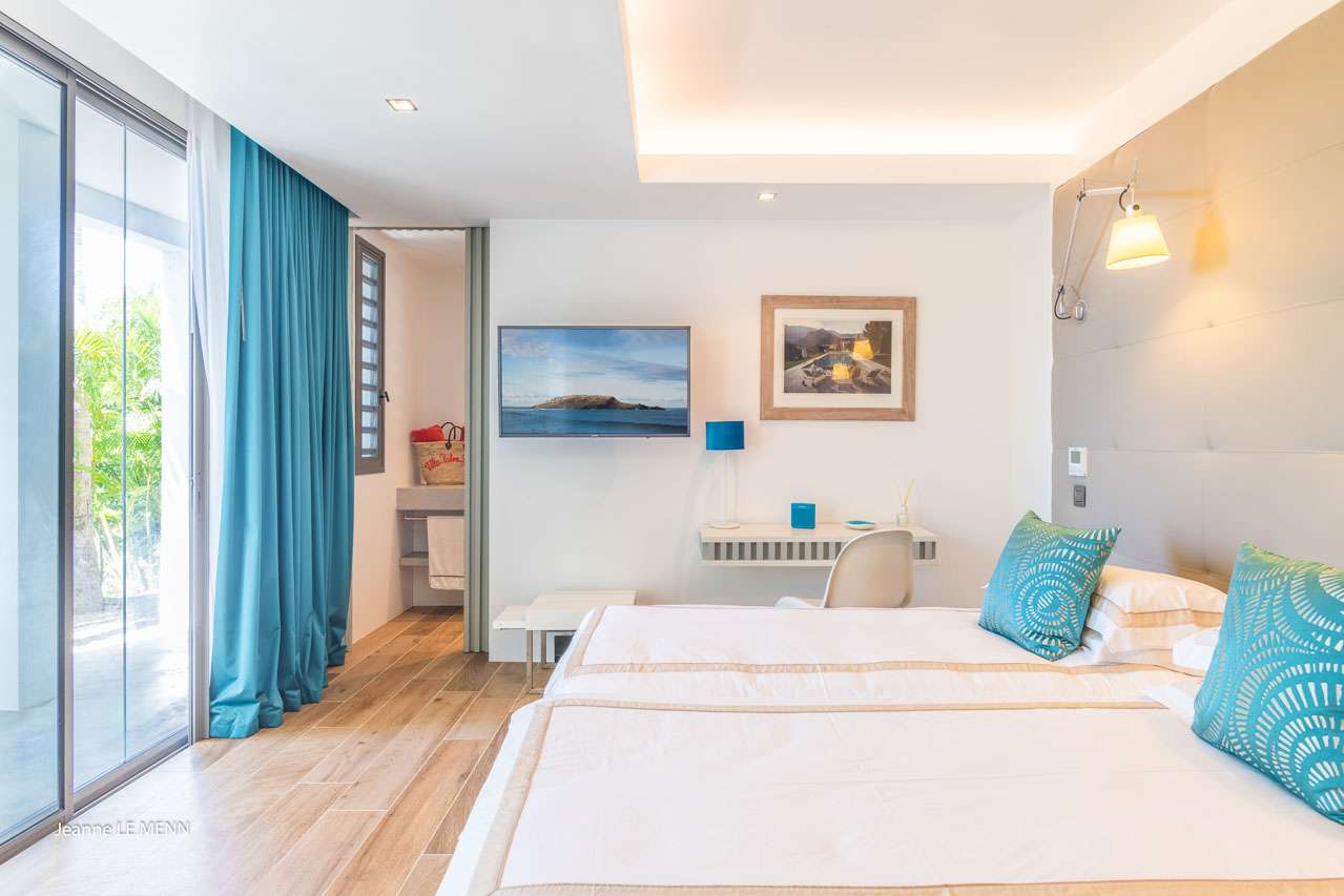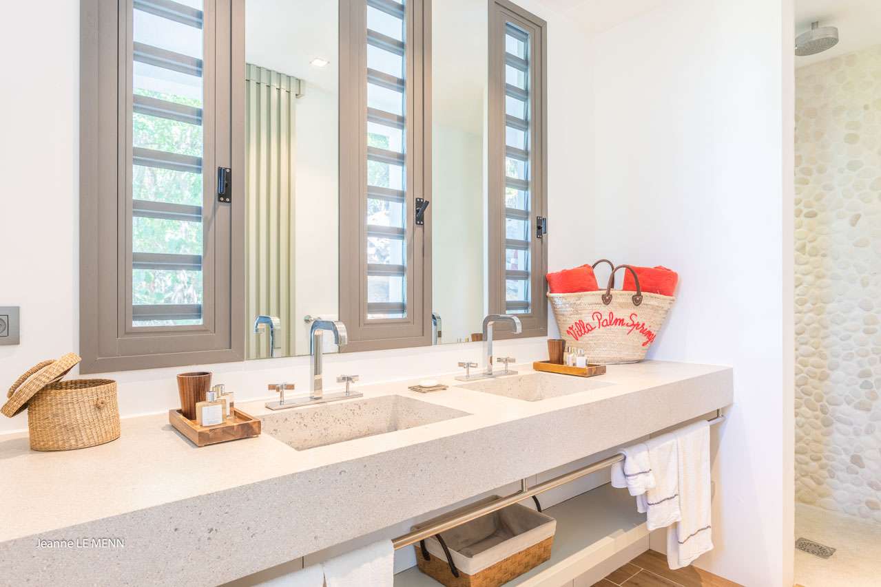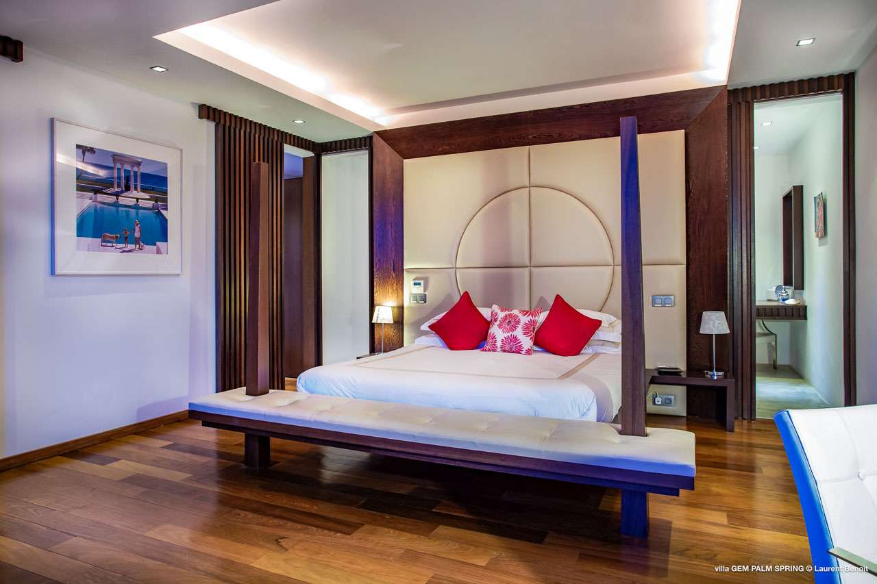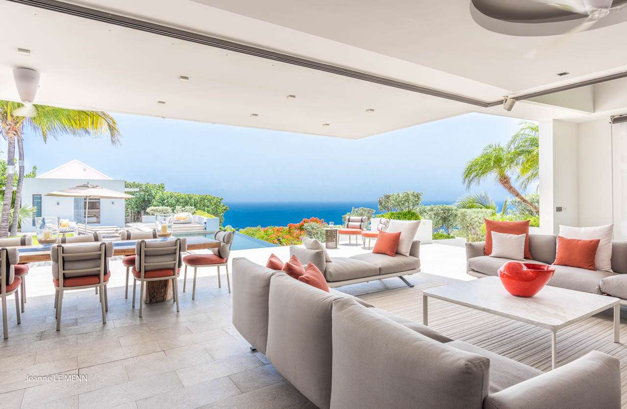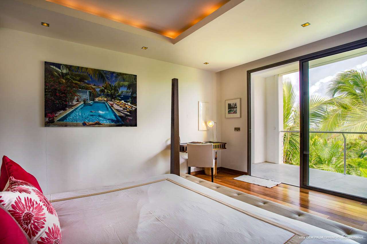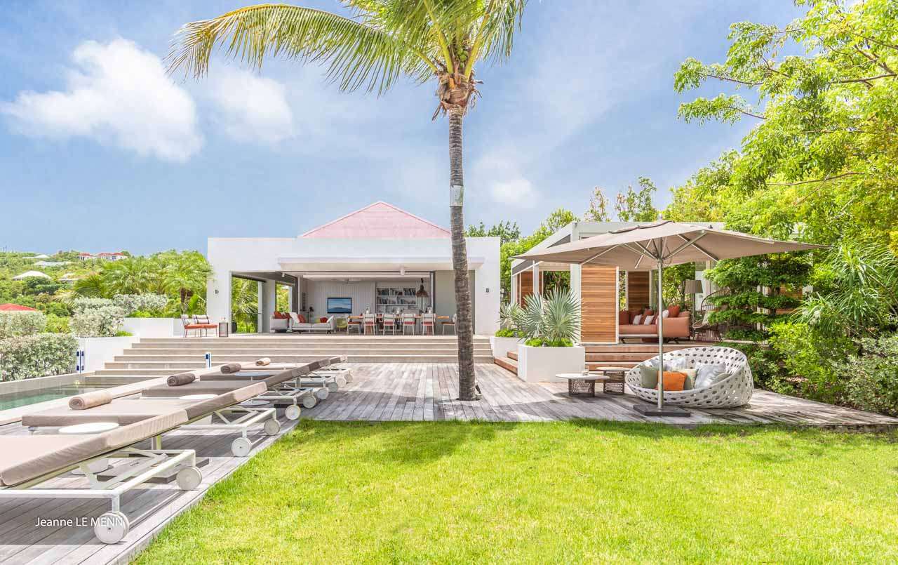 Welcome to Villa Palm Springs (villa code: WV GEM), a luxurious 5-bedroom villa in Gouverneur, St. Barts. This property offers outstanding sunset views and ocean breezes. Inspired by the design of Southern California homes in the '60s’, Villa Palm Springs is elegant, stylish, and contemporary. Blurring the line between inside and out, staying here lets you immerse yourself in the beauty of St. Barts. Chic décor, luxurious furnishings, and eye-catching photography add the finishing touches to this sophisticated vacation home. Nestled in the hills above Gouverneur, the location is hard to beat. Gouverneur Beach is just a short drive away, as are the beaches at Saline and St. Jean. Shops, restaurants, and bars are available in Gustavia, under 10 minutes away by car. Spread across a series of pavilions and bungalows, the living spaces at Palm Springs Villa are sublime. The main house features a living room and kitchen, with ingenious floor-to-ceiling windows opening to the view. The relaxing living room features a pair of sofas and a luxurious ottoman, ideal for unwinding. Sinking in here with a coffee, a good book, or a movie on the flat-screen TV is a great way to spend your day. From this cozy vantage point, the ocean views are incredible. Next to the living room is Villa Palm Springs’s gourmet kitchen. Equipped with the latest appliances, it can handle any culinary challenge thrown its way. Our concierge can organize grocery pre-stocking or delivery, catered meals, or arrange private chef service for a special occasion The dining table is on the covered terrace next to the living room, although thanks to the unique design you’ll feel as if you’re still in the main pavilion. There’s seating for up to 10 guests, making it a fabulous setting for gourmet meals in the cool evening air. There are 5 bedrooms at Palm Spring Villa, spread over the two levels to ensure the utmost privacy for each guest. Stylish prints from photographer Slim Aarons give each room a vintage feel, while TVs provide entertainment. In the main house is a 600-sq. ft. master suite, complete with an ensuite bathroom, his and her dressing areas, and a pebble-stoned rain shower. Two other bedrooms are below the master bedroom, each with an ensuite bathroom. A separate bungalow beyond the pool is home to the final two bedrooms, each spacious and quiet. Both rooms feature an ensuite and a private terrace, with vistas over the hills towards the shimmering Caribbean. The outdoor living spaces at Villa Palm Springs are sublime. There’s space to relax in the sun or shade, enjoying the glorious Caribbean weather on lounges or sunbeds. Next to the main house is the outdoor living area in a stylish pavilion. A glass wall at its back reveals a tropical garden, while in front are the stunning views of the Caribbean. It’s a luxurious spot to relax, whether you settle in with a good book or enjoy a sunset cocktail soiree. Steps away, the heated infinity pool is another tempting spot to kick back and enjoy the good life. For days at the beach, Gouverneur is a few minutes away by car, while within 10 minutes you could be lazing on the beach at St. Jean or Saline. During the Thanksgiving and December holidays, the villa rents at full occupancy rates regardless of how many bedrooms are used.Please fill out the form to begin your inquiry and we will connect you with a seasoned villa rental specialist.