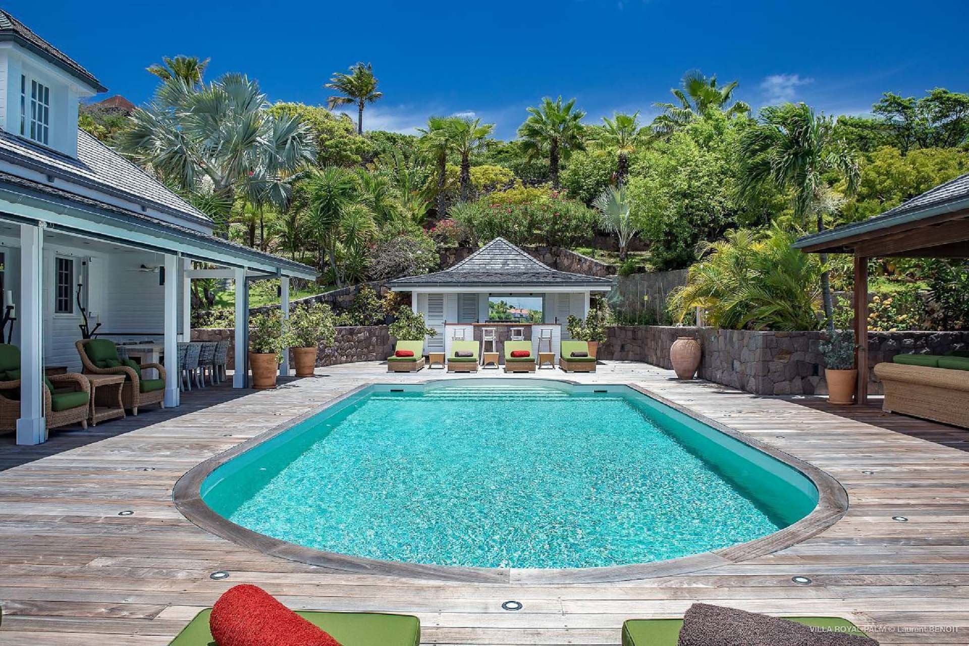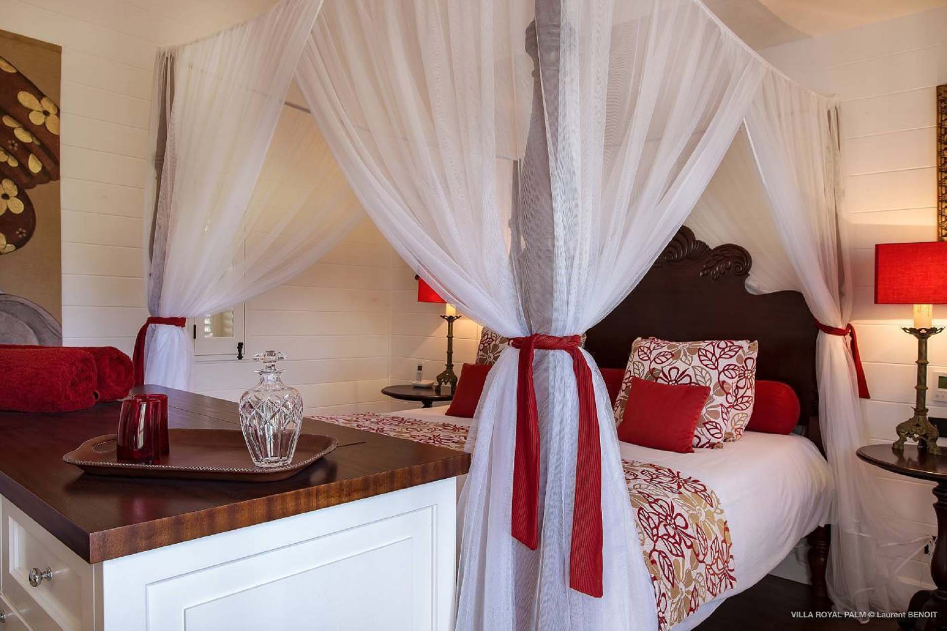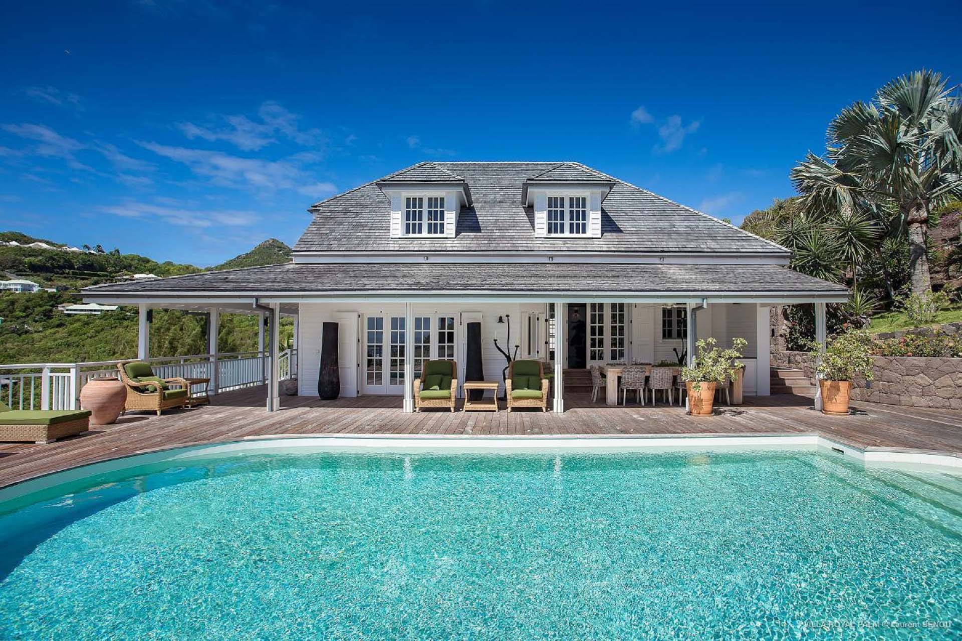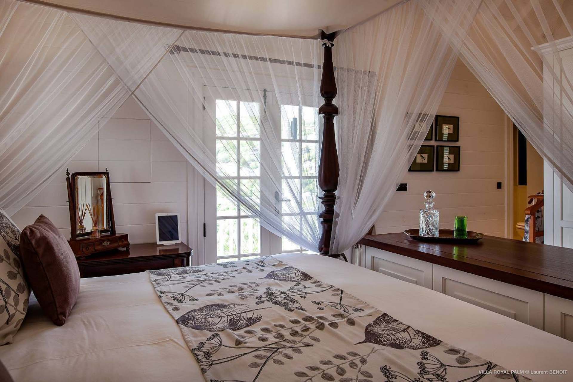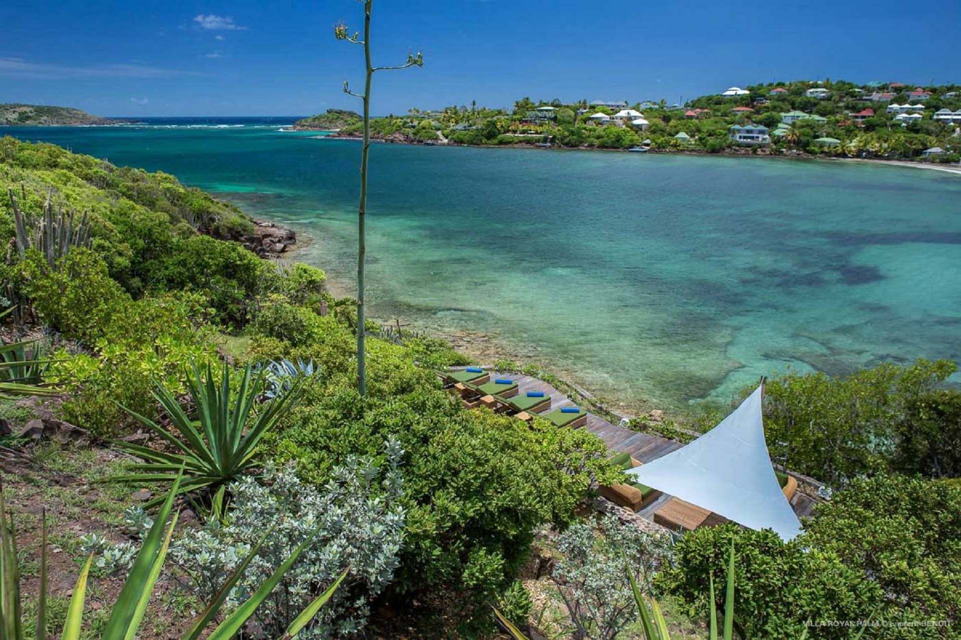 Villa Palmier Royal Four, (villa code: WV PRO) is a luxurious 4-bedroom villa with direct access to Marigot bay lagoon. Villa Palmier Royal Four is a contemporary, West Indies style villa with two full master bedrooms and two guest rooms on the lower level. The spacious villa has stylish furnishings and bedding, and a large pool overlooking the bay of Marigot. Gorgeous views can be enjoyed from almost every corner of the estate, and are arguably among the best views of Marigot Bay. A beautiful terrace sits just above the water, which allows access for swimming, or to explore the Marigot Bay nature reserve with the provided canoes and paddle boards. A large, air-conditioned main room consisting of a gourmet kitchen, living area, and a loft with a TV area for kids provides comfortable indoor space. The outdoor setting is spectacular, with a large, heated pool as the centerpiece of the spacious terrace, which comes with a pool-house and covered dining, as well as gorgeous views. Comfortable seating underneath a gazebo allows for conversing or having a drink in the shade while enjoying the breezes and the views. The two master bedrooms are accessed from the covered terrace. Each has a European king-sized bed, and ensuite bathroom with both shower and bathtub, dressing, U.S. satellite and AppleTV. Directly below the two master bedrooms are two guest rooms, with a terrace and a separate pool outside. The first bedroom has 2 twin beds that can be made up as a U.S. king-sized bed, and an ensuite bathroom with shower. The second guest bedroom connects with the first, and has a queen-sized bed and ensuite bathroom with shower and bathtub. A paved pathway leads down to the waterfront where a large deck sits just above the water with ample seating, including loungers, and a large dining table. The deck also gives direct access to the protected bay, where turtles swim without fear of being hit by boats or jet skis.Please fill out the form to begin your inquiry and we will connect you with a seasoned villa rental specialist.