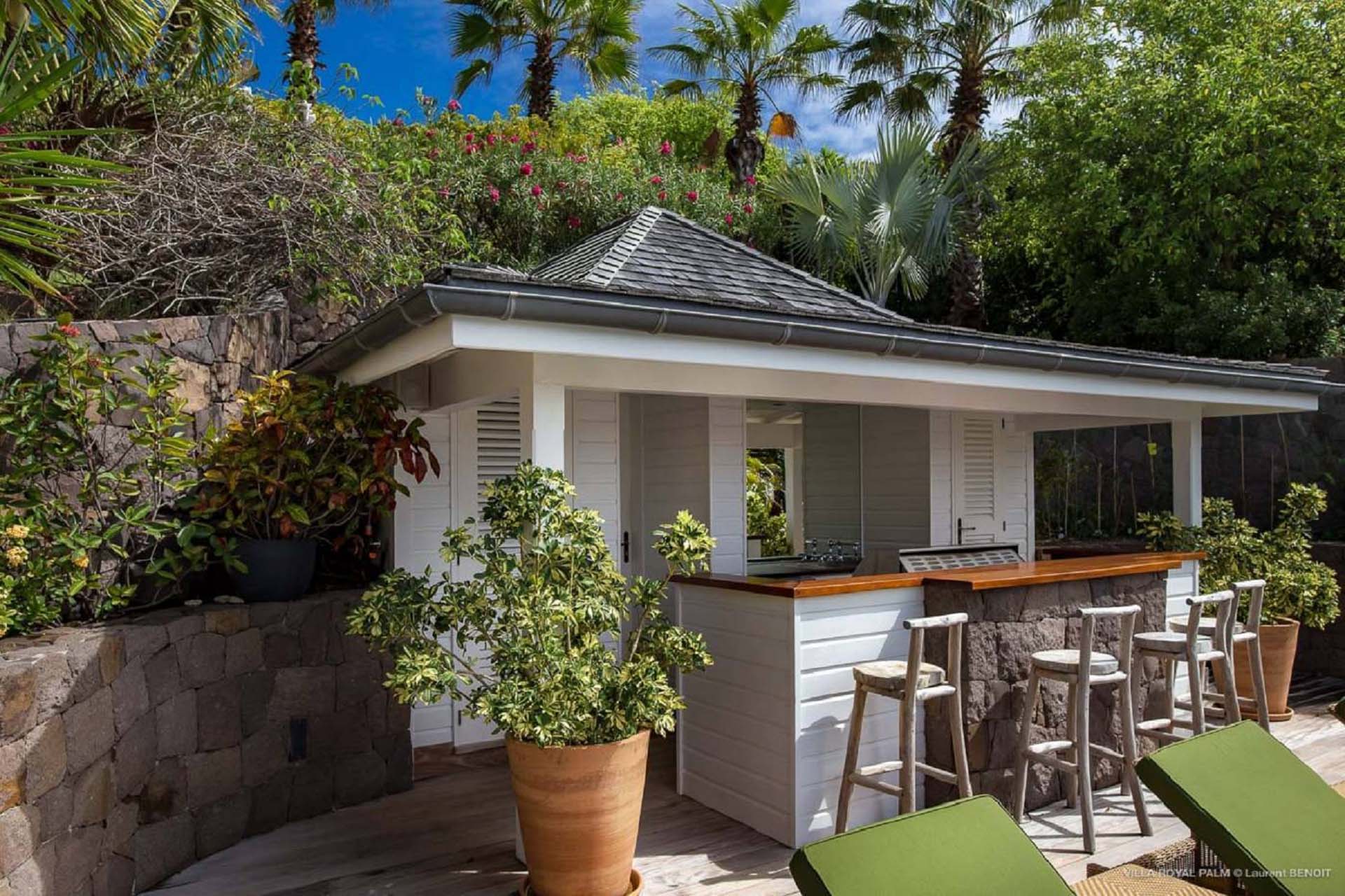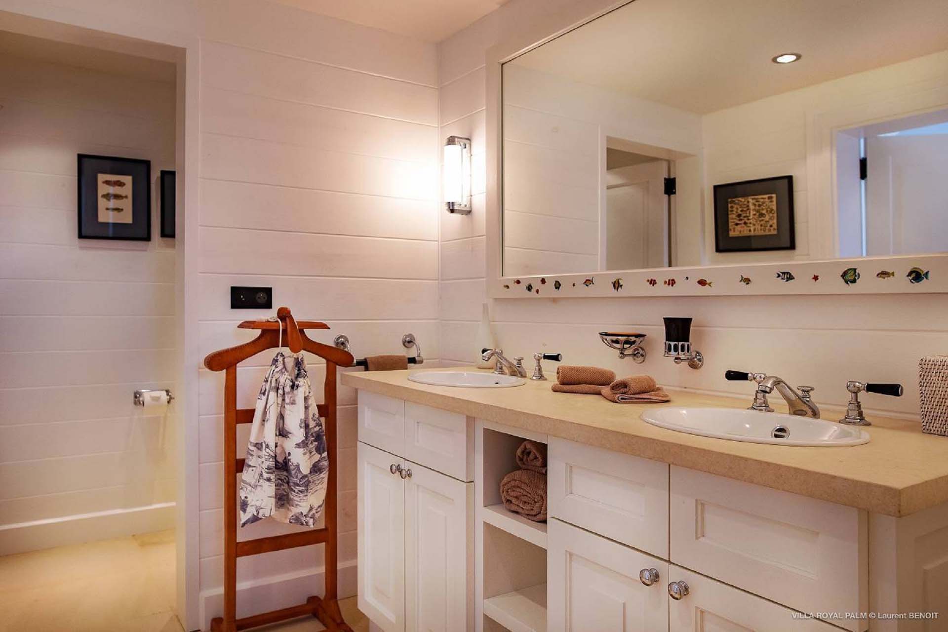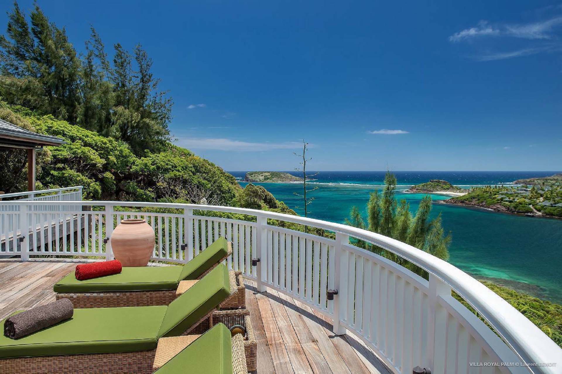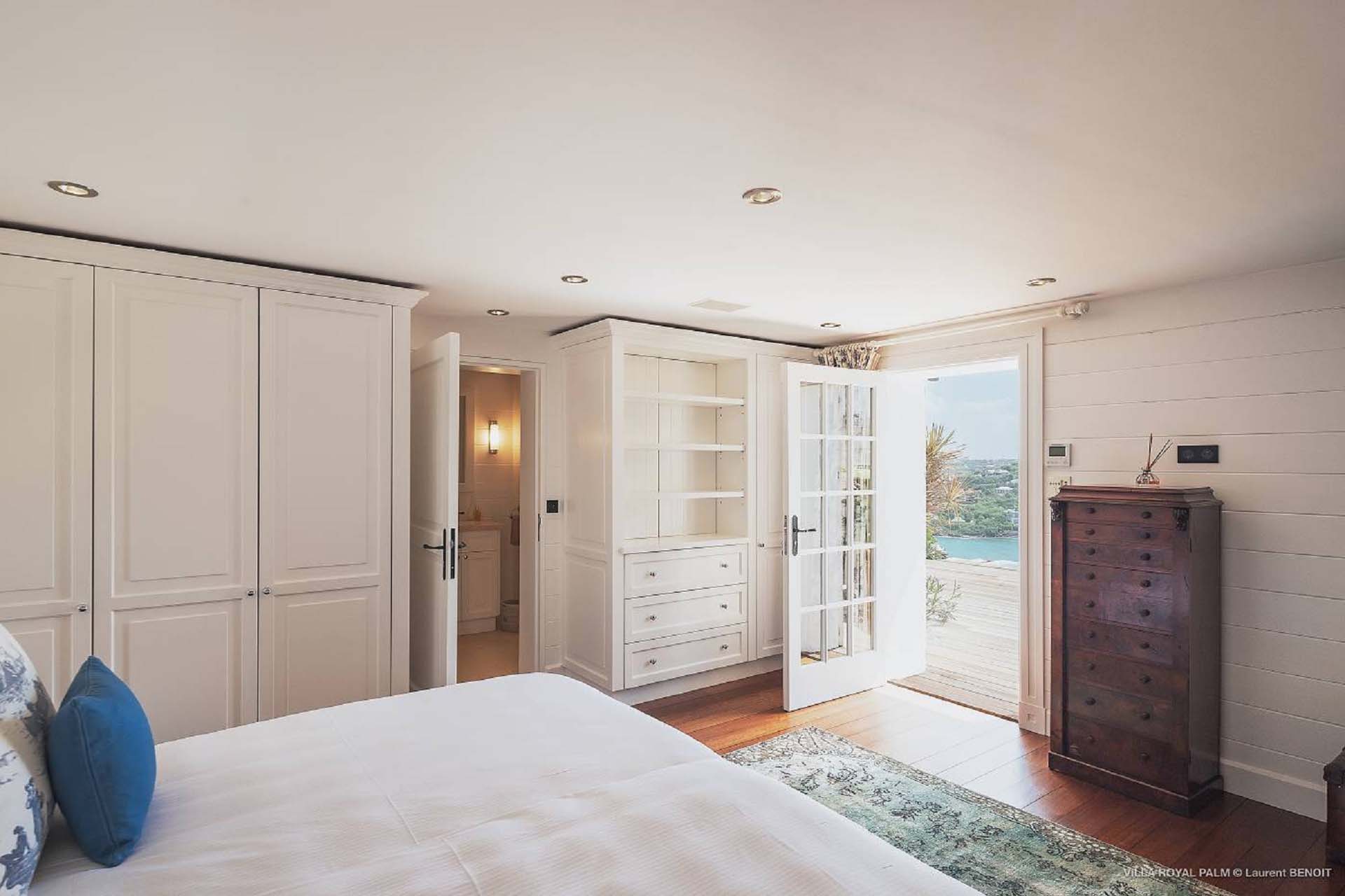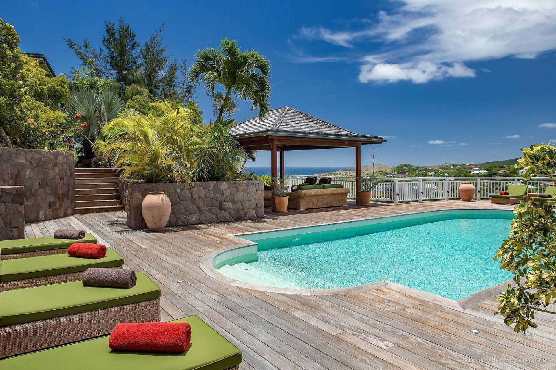 Villa Palmier Royal Four, (villa code: WV PRO) is a luxurious 4-bedroom villa with direct access to Marigot bay lagoon. Villa Palmier Royal Four is a contemporary, West Indies style villa with two full master bedrooms and two guest rooms on the lower level. The spacious villa has stylish furnishings and bedding, and a large pool overlooking the bay of Marigot. Gorgeous views can be enjoyed from almost every corner of the estate, and are arguably among the best views of Marigot Bay. A beautiful terrace sits just above the water, which allows access for swimming, or to explore the Marigot Bay nature reserve with the provided canoes and paddle boards. A large, air-conditioned main room consisting of a gourmet kitchen, living area, and a loft with a TV area for kids provides comfortable indoor space. The outdoor setting is spectacular, with a large, heated pool as the centerpiece of the spacious terrace, which comes with a pool-house and covered dining, as well as gorgeous views. Comfortable seating underneath a gazebo allows for conversing or having a drink in the shade while enjoying the breezes and the views. The two master bedrooms are accessed from the covered terrace. Each has a European king-sized bed, and ensuite bathroom with both shower and bathtub, dressing, U.S. satellite and AppleTV. Directly below the two master bedrooms are two guest rooms, with a terrace and a separate pool outside. The first bedroom has 2 twin beds that can be made up as a U.S. king-sized bed, and an ensuite bathroom with shower. The second guest bedroom connects with the first, and has a queen-sized bed and ensuite bathroom with shower and bathtub. A paved pathway leads down to the waterfront where a large deck sits just above the water with ample seating, including loungers, and a large dining table. The deck also gives direct access to the protected bay, where turtles swim without fear of being hit by boats or jet skis.Please fill out the form to begin your inquiry and we will connect you with a seasoned villa rental specialist.