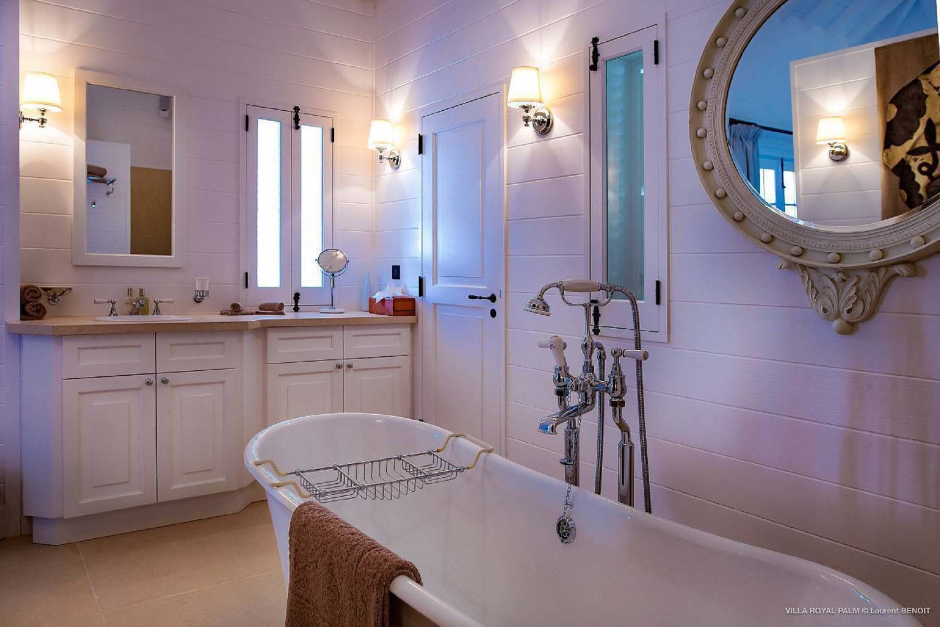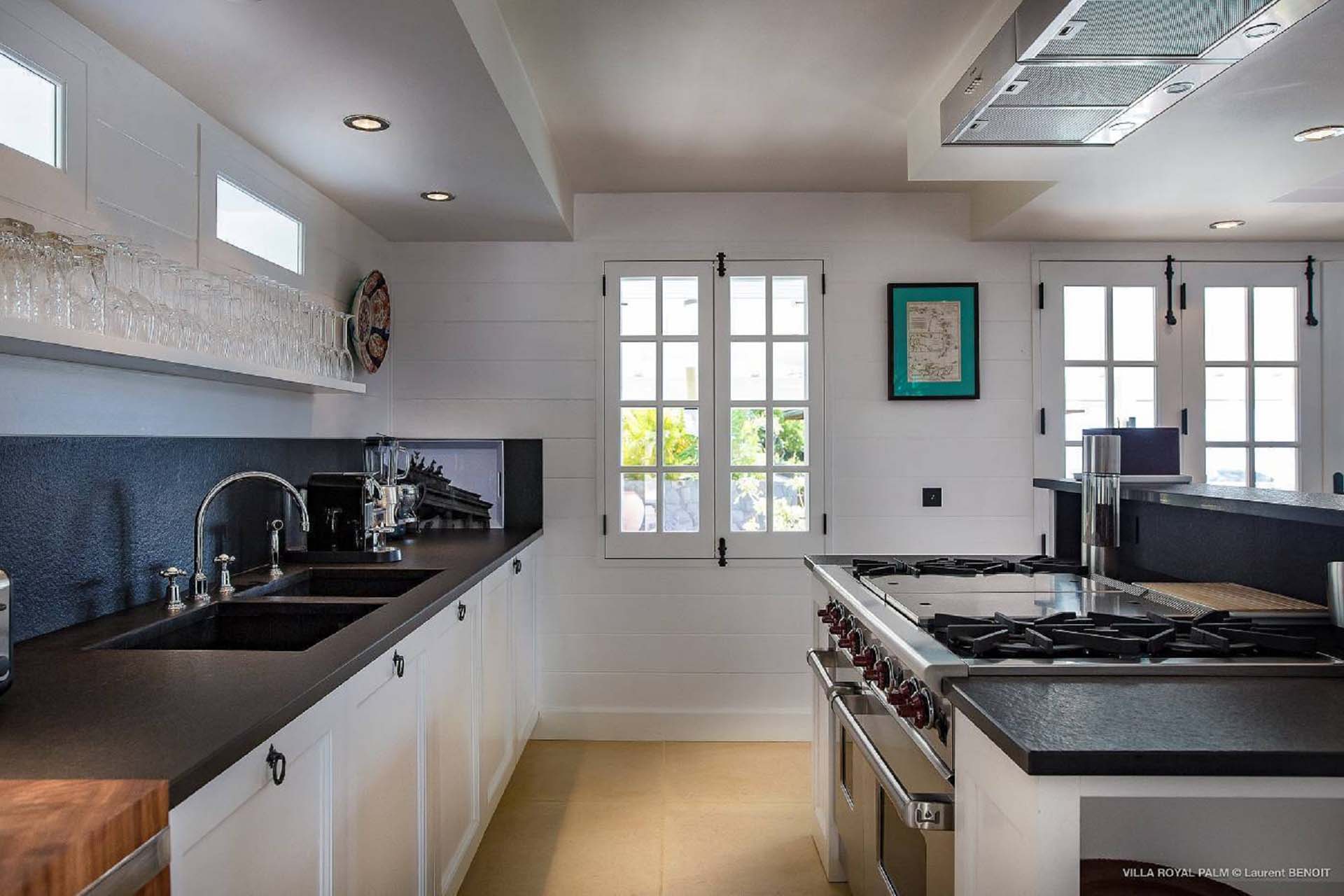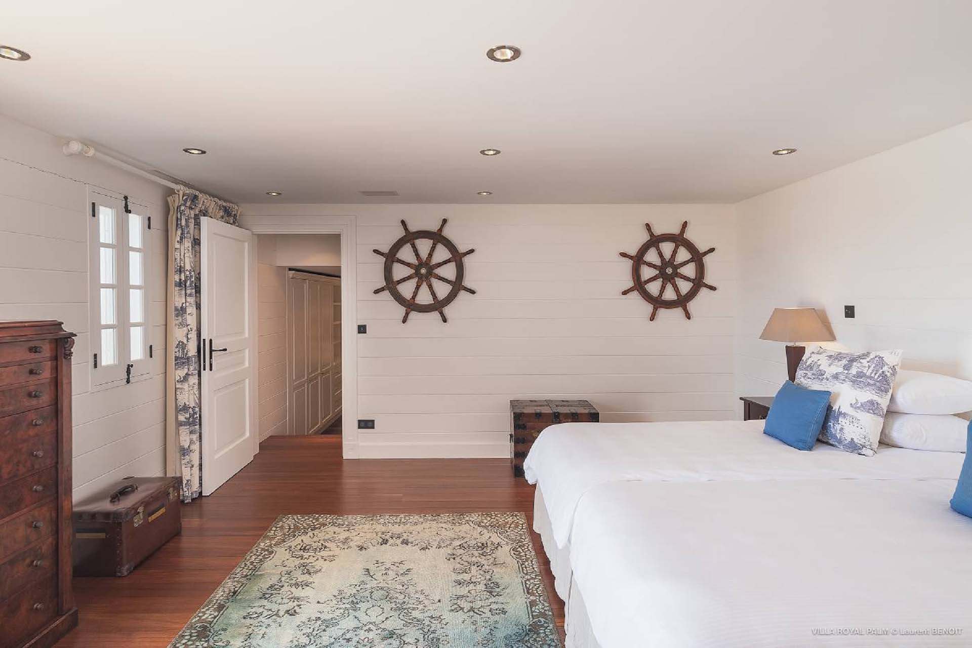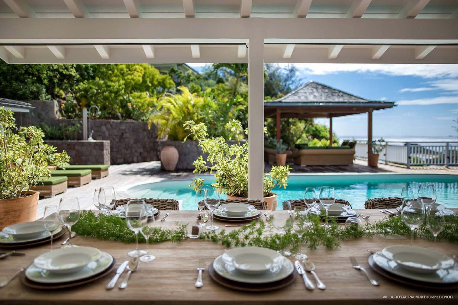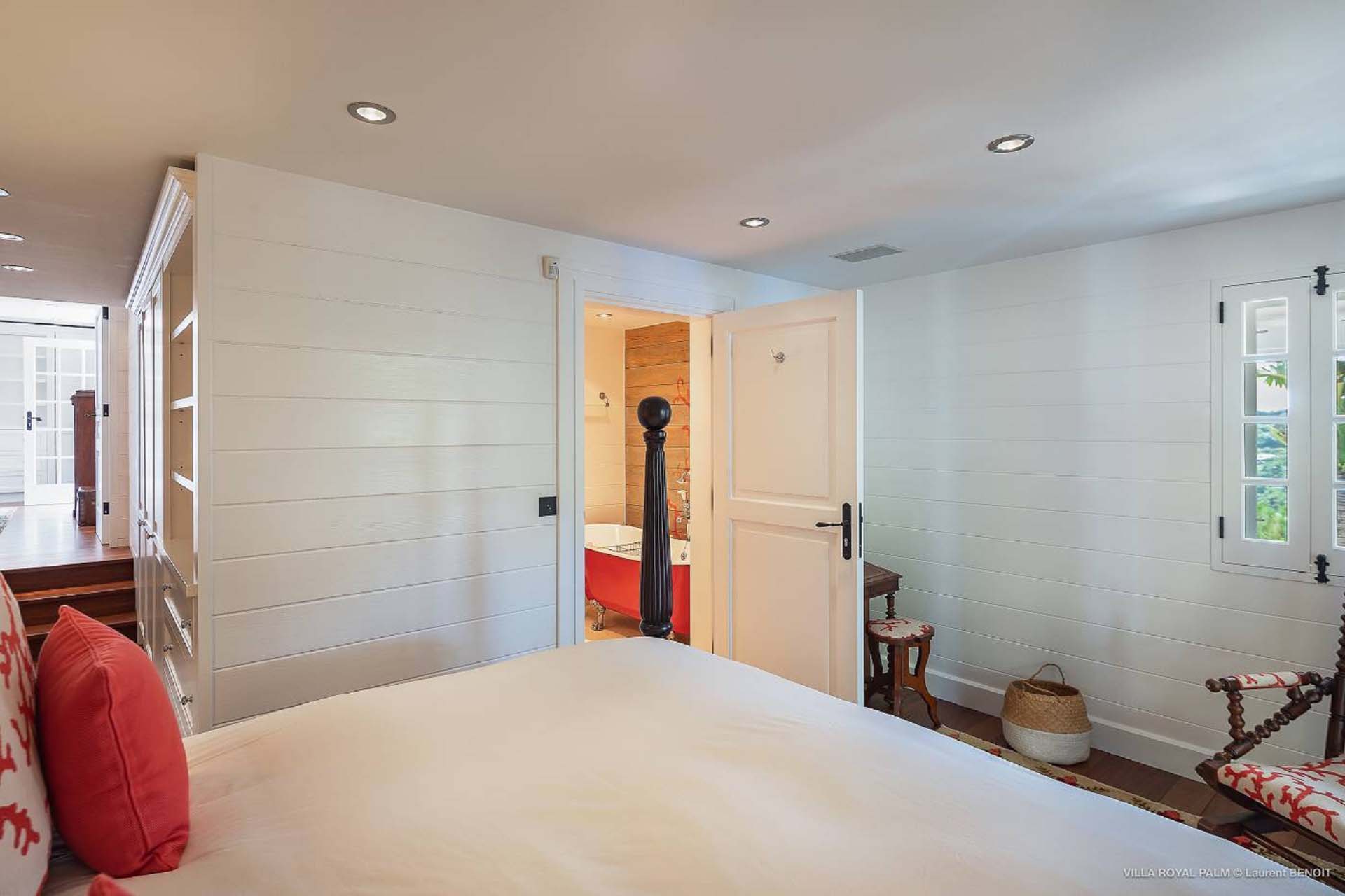 Villa Palmier Royal Four, (villa code: WV PRO) is a luxurious 4-bedroom villa with direct access to Marigot bay lagoon. Villa Palmier Royal Four is a contemporary, West Indies style villa with two full master bedrooms and two guest rooms on the lower level. The spacious villa has stylish furnishings and bedding, and a large pool overlooking the bay of Marigot. Gorgeous views can be enjoyed from almost every corner of the estate, and are arguably among the best views of Marigot Bay. A beautiful terrace sits just above the water, which allows access for swimming, or to explore the Marigot Bay nature reserve with the provided canoes and paddle boards. A large, air-conditioned main room consisting of a gourmet kitchen, living area, and a loft with a TV area for kids provides comfortable indoor space. The outdoor setting is spectacular, with a large, heated pool as the centerpiece of the spacious terrace, which comes with a pool-house and covered dining, as well as gorgeous views. Comfortable seating underneath a gazebo allows for conversing or having a drink in the shade while enjoying the breezes and the views. The two master bedrooms are accessed from the covered terrace. Each has a European king-sized bed, and ensuite bathroom with both shower and bathtub, dressing, U.S. satellite and AppleTV. Directly below the two master bedrooms are two guest rooms, with a terrace and a separate pool outside. The first bedroom has 2 twin beds that can be made up as a U.S. king-sized bed, and an ensuite bathroom with shower. The second guest bedroom connects with the first, and has a queen-sized bed and ensuite bathroom with shower and bathtub. A paved pathway leads down to the waterfront where a large deck sits just above the water with ample seating, including loungers, and a large dining table. The deck also gives direct access to the protected bay, where turtles swim without fear of being hit by boats or jet skis.Please fill out the form to begin your inquiry and we will connect you with a seasoned villa rental specialist.