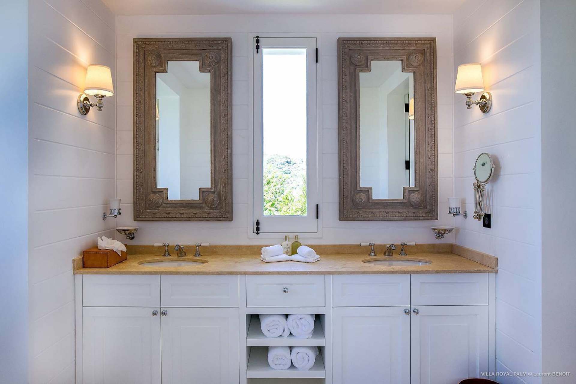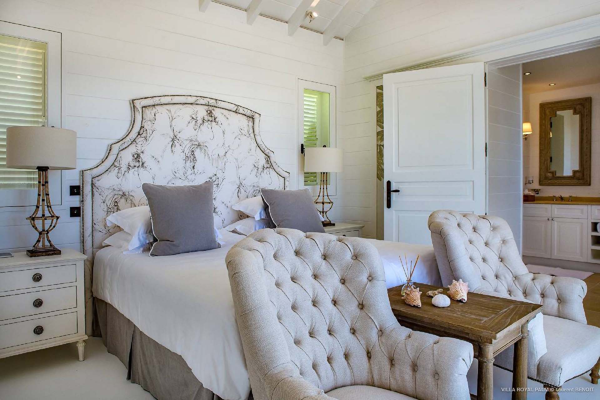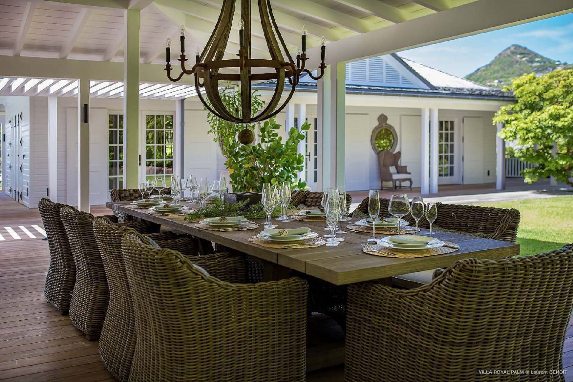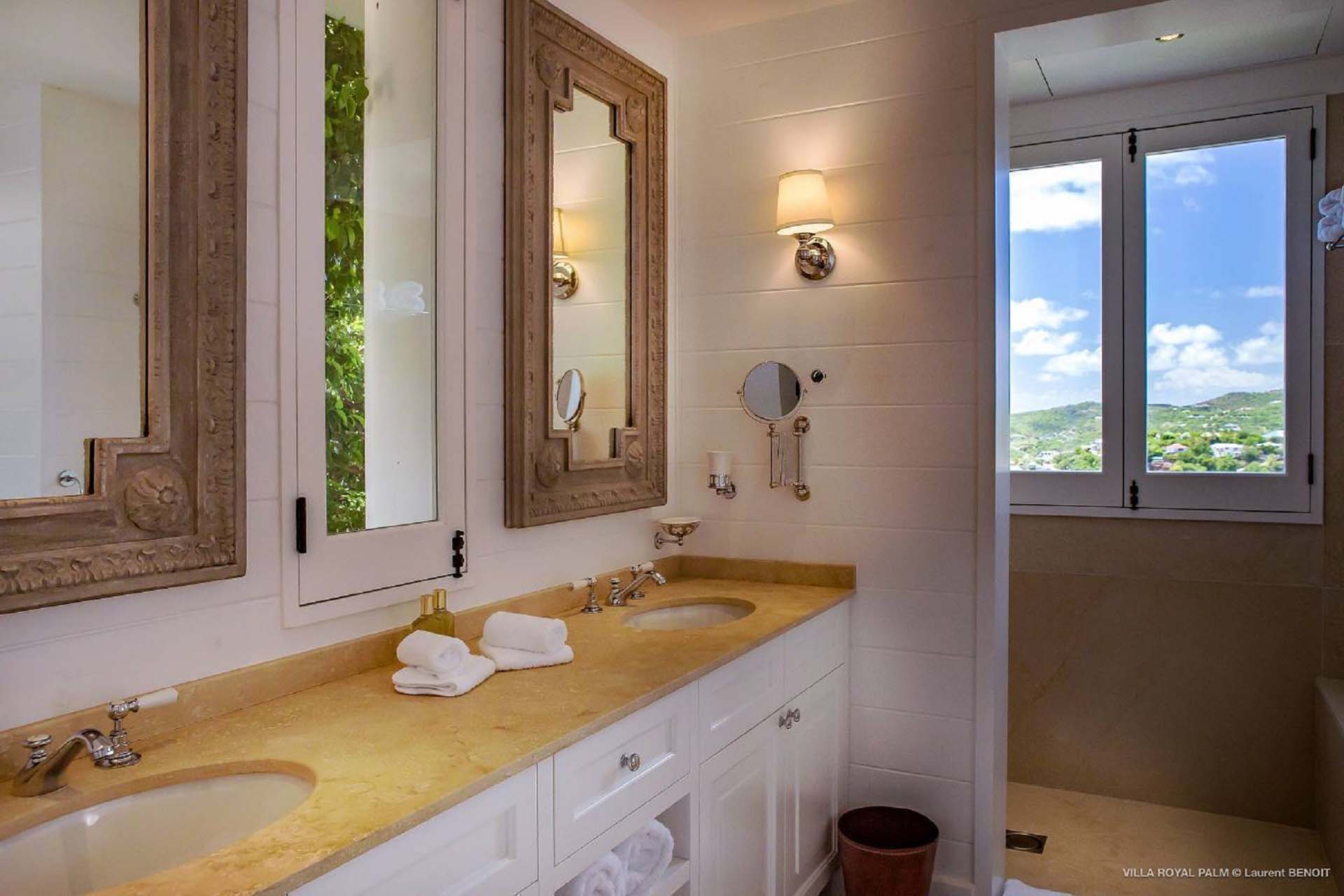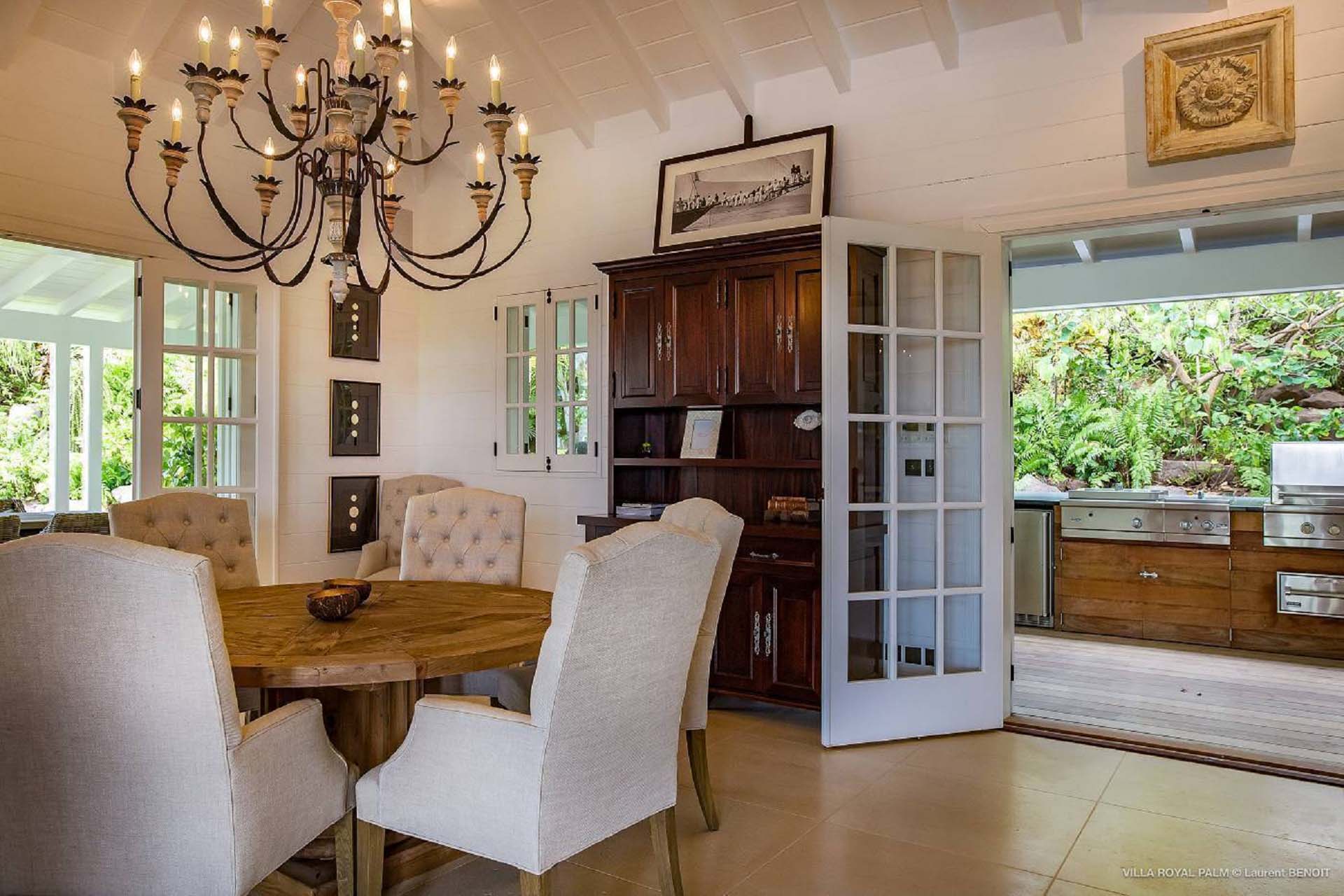Castaway to Villa Palmier Royal Seven (villa code: WV PRT), a luxurious 7-bedroom villa in Mont Jean, St. Barts. This stunning island home enjoys gorgeous views over Marigot Bay and the shimmering Caribbean beyond, all within walking distance of the beach. Villa Palmier Royal Seven is a contemporary, West Indies villa that’s spread across several pavilions. The design embraces the beautiful natural setting of St. Barts, bringing it in as a part of the interior design. Wooden walkways lead between each pavilion, inside which you’ll find meticulous attention to detail, elegant furnishings, and charming, old-world décor. Nestled near the shoreline of Marigot Bay, Villa Palmier Royal Seven is a few minutes' walk from the pristine stretch of sand. Shops are a 10-minute drive away, and the enchanting town of St. Jean is 15 minutes by car. Blending indoors with the outdoors, the shared living spaces at Villa Palmier Royal Seven are all about embracing the island lifestyle. There are plenty of areas to relax in sun and shade, inside and out, with all paths eventually leading to a central main pavilion. It’s here where you’ll find the large and plush living room, comfortably furnished and featuring a décor that effortlessly shows off an island character. It’s a blissful spot to kick back and chill out, with a beautiful chesterfield sofa and vaulted ceilings above capturing the dappled island light. At the other end, a second luxurious sofa faces an entertainment cabinet, ideal for watching movies or nestling in with a good book. Following a walkway from the living room brings you to a second pavilion, this one featuring a generous, gourmet kitchen. Spacious and well-equipped, you’ll have no trouble preparing delicious meals during your stay. A breakfast corner is a picturesque setting for a fresh coffee in the morning, which leads to an outdoor grilling kitchen that complements the alfresco dining area in the garden. A small indoor table also sits between the living room and the TV area in the main pavilion. The 7 bedrooms at Villa Palmier Royal Seven are spread across 5 separate pavilions. On the lower level are two master suites, each in its own pavilion. Both come with a plush king-sized bed, dressing room, and an ensuite with a bathroom, shower, and outdoor bathtub and shower out the back. Identical private terraces out the front provide an intimate setting to relax and gaze out at the views over Marigot Bay. Two smaller guest rooms are inside a separate pavilion at street level. Each room comes with a king-sized bed, dressing room, ensuite bathroom, and a cozy balcony. Another guest room is situated in a separate bungalow halfway between the lower suites and the upper master bedrooms. This room comes with a king-sized bed, dressing, ensuite bathroom with shower, as well as a private balcony with seating. The final pavilion is home to two children’s rooms. One has a bunk bed, while the other has a king-sized bed. Both come with an ensuite. Wandering the walkways between pavilions, the lush garden is incredible, with alluring views down towards the striking turquoise waters of the bay. In the center of the property, a large deck wraps around a heated infinity pool, with ample space for long days in sun and shade. An outdoor living area is inside a large, open pavilion, a decadent spot to gather with friends and family over a cool drink. Within a few minutes, you could also be lounging on the powder-soft sands of Marigot Bay. The tranquil waters offer idyllic swimming and snorkeling, a tempting spot to spend an entire day. During the high season only, guests at the villa enjoy the services of a private chef and waitress (food not included), along with two maids providing daily service and turndown, seven days a week. A mini fridge is stocked with still and sparkling water for your convenience. For on-the-water adventures, guests have access to two paddle boards, two kayaks, and four life jackets. Please note: a security deposit of $10,000 is required.Please fill out the form to begin your inquiry and we will connect you with a seasoned villa rental specialist.