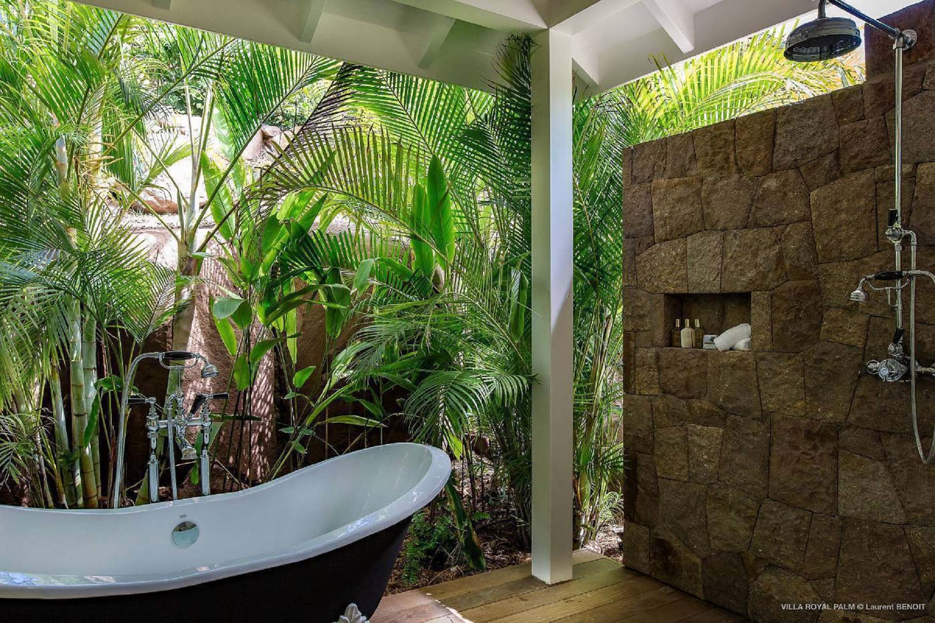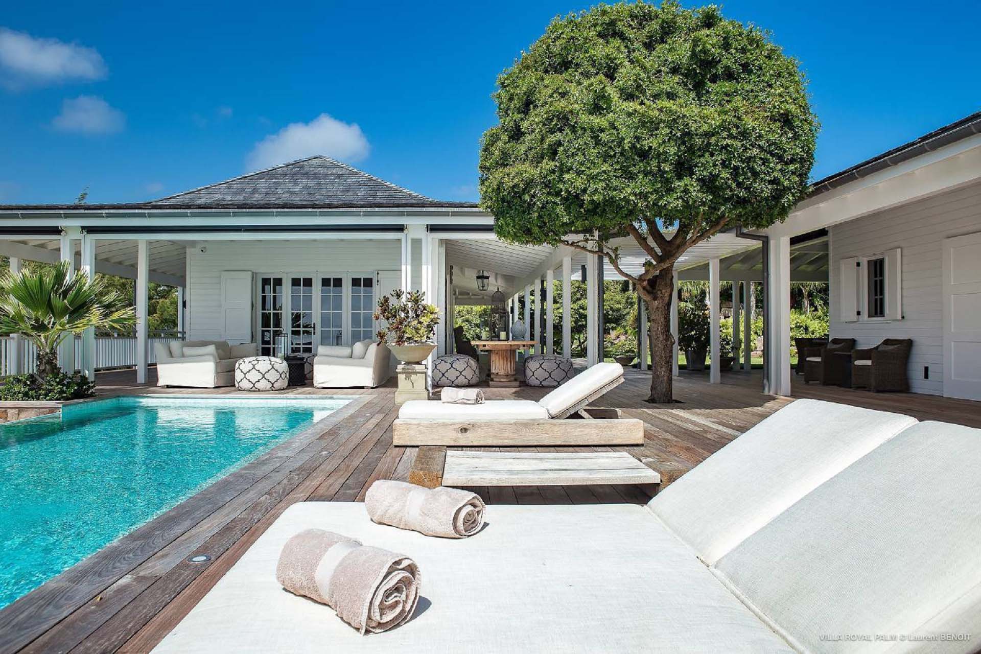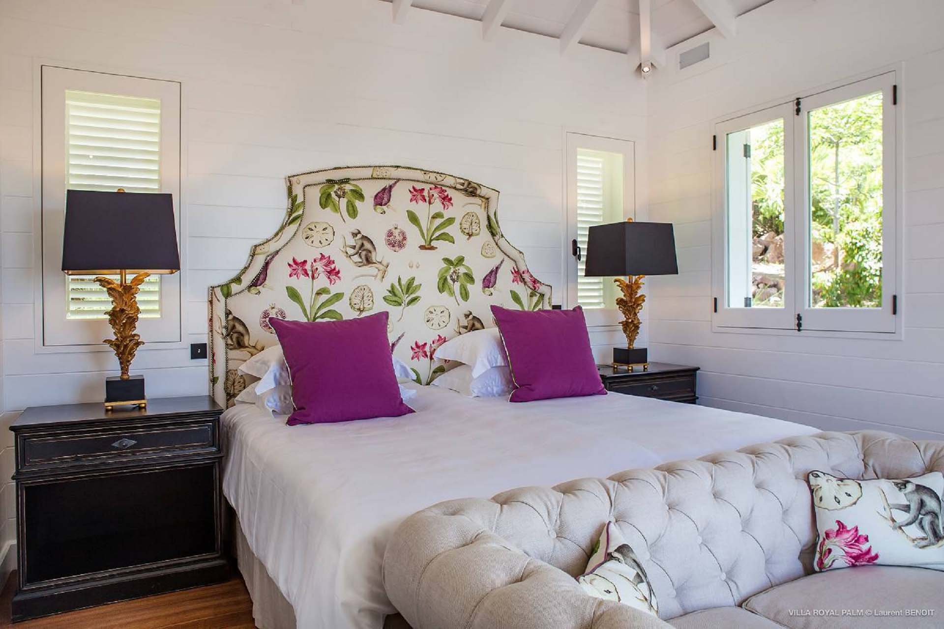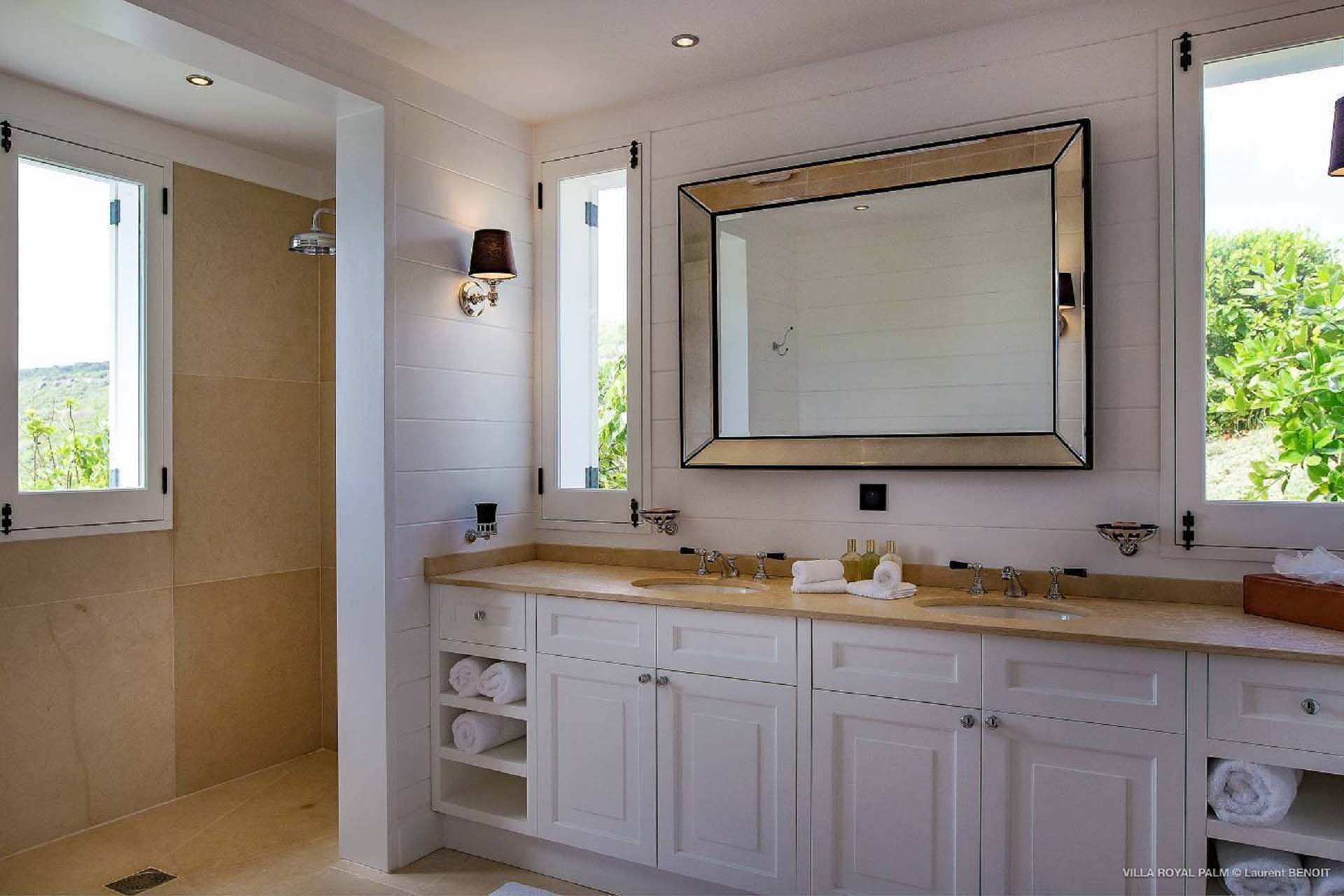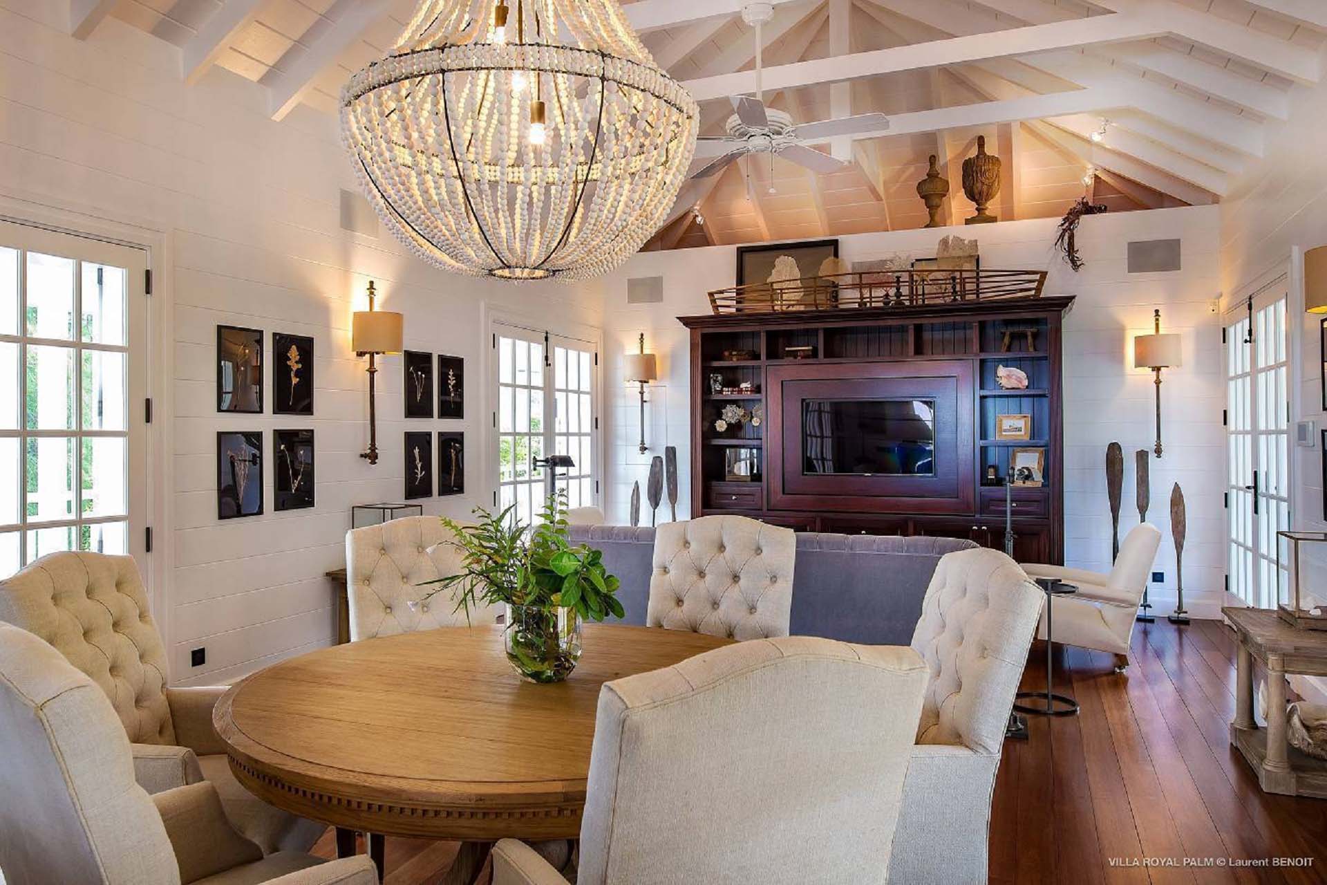 Castaway to Villa Palmier Royal Seven (villa code: WV PRT), a luxurious 7-bedroom villa in Mont Jean, St. Barts. This stunning island home enjoys gorgeous views over Marigot Bay and the shimmering Caribbean beyond, all within walking distance of the beach. Villa Palmier Royal Seven is a contemporary, West Indies villa that’s spread across several pavilions. The design embraces the beautiful natural setting of St. Barts, bringing it in as a part of the interior design. Wooden walkways lead between each pavilion, inside which you’ll find meticulous attention to detail, elegant furnishings, and charming, old-world décor. Nestled near the shoreline of Marigot Bay, Villa Palmier Royal Seven is a few minutes' walk from the pristine stretch of sand. Shops are a 10-minute drive away, and the enchanting town of St. Jean is 15 minutes by car. Blending indoors with the outdoors, the shared living spaces at Villa Palmier Royal Seven are all about embracing the island lifestyle. There are plenty of areas to relax in sun and shade, inside and out, with all paths eventually leading to a central main pavilion. It’s here where you’ll find the large and plush living room, comfortably furnished and featuring a décor that effortlessly shows off an island character. It’s a blissful spot to kick back and chill out, with a beautiful chesterfield sofa and vaulted ceilings above capturing the dappled island light. At the other end, a second luxurious sofa faces an entertainment cabinet, ideal for watching movies or nestling in with a good book. Following a walkway from the living room brings you to a second pavilion, this one featuring a generous, gourmet kitchen. Spacious and well-equipped, you’ll have no trouble preparing delicious meals during your stay. A breakfast corner is a picturesque setting for a fresh coffee in the morning, which leads to an outdoor grilling kitchen that complements the alfresco dining area in the garden. A small indoor table also sits between the living room and the TV area in the main pavilion. The 7 bedrooms at Villa Palmier Royal Seven are spread across 5 separate pavilions. On the lower level are two master suites, each in its own pavilion. Both come with a plush king-sized bed, dressing room, and an ensuite with a bathroom, shower, and outdoor bathtub and shower out the back. Identical private terraces out the front provide an intimate setting to relax and gaze out at the views over Marigot Bay. Two smaller guest rooms are inside a separate pavilion at street level. Each room comes with a king-sized bed, dressing room, ensuite bathroom, and a cozy balcony. Another guest room is situated in a separate bungalow halfway between the lower suites and the upper master bedrooms. This room comes with a king-sized bed, dressing, ensuite bathroom with shower, as well as a private balcony with seating. The final pavilion is home to two children’s rooms. One has a bunk bed, while the other has a king-sized bed. Both come with an ensuite. Wandering the walkways between pavilions, the lush garden is incredible, with alluring views down towards the striking turquoise waters of the bay. In the center of the property, a large deck wraps around a heated infinity pool, with ample space for long days in sun and shade. An outdoor living area is inside a large, open pavilion, a decadent spot to gather with friends and family over a cool drink. Within a few minutes, you could also be lounging on the powder-soft sands of Marigot Bay. The tranquil waters offer idyllic swimming and snorkeling, a tempting spot to spend an entire day. During the high season only, guests at the villa enjoy the services of a private chef and waitress (food not included), along with two maids providing daily service and turndown, seven days a week. A mini fridge is stocked with still and sparkling water for your convenience. For on-the-water adventures, guests have access to two paddle boards, two kayaks, and four life jackets. Please note: a security deposit of $10,000 is required.Please fill out the form to begin your inquiry and we will connect you with a seasoned villa rental specialist.