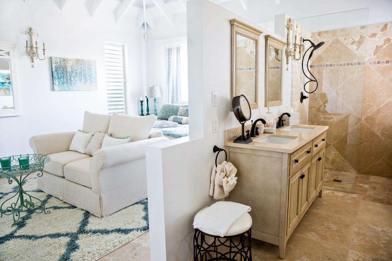 Following the long wooden path from the villa leads you to the beach deck furnished with loungers and daybeds. From here, it’s just steps to the crystal-clear water of Long Bay Beach, inviting you in for a refreshing swim.