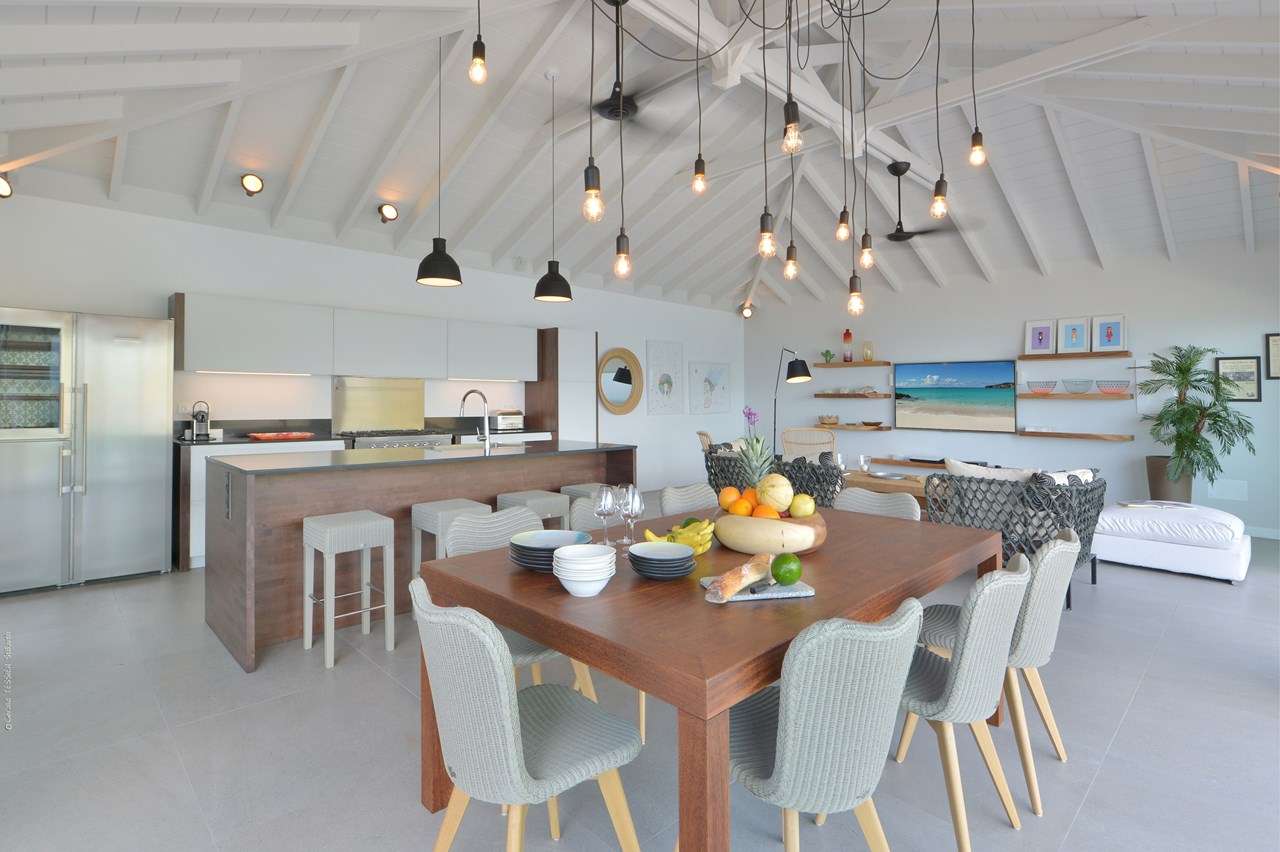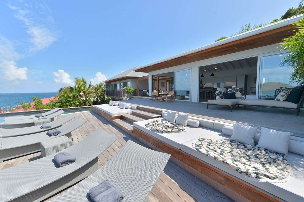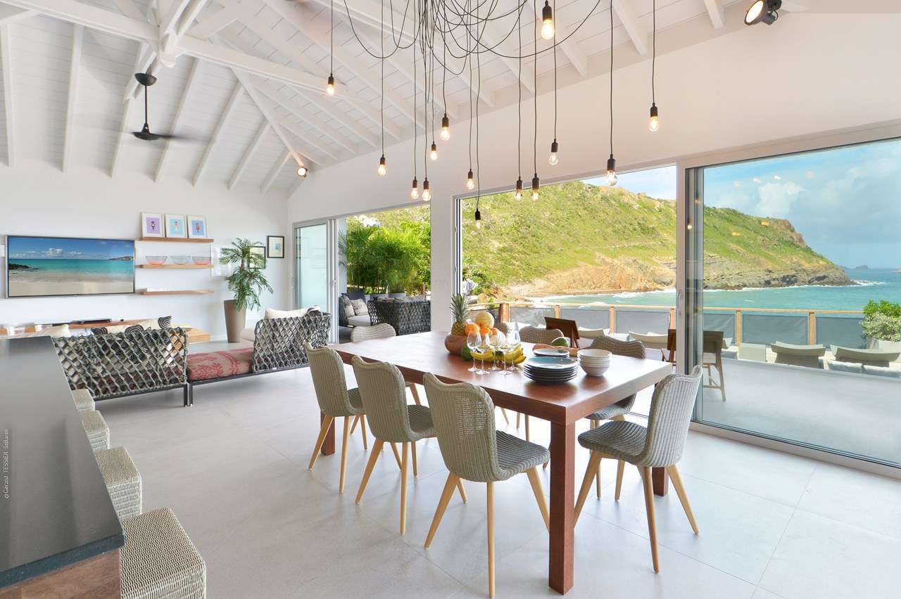 Embrace the island life at Villa Pelican (villa code: WV ABR), a stunning 4-bedroom villa overlooking the expansive bay of Anse des Lezards. Surrounded by the incredible natural beauty and intoxicating island calm, this villa’s location alone makes it one of the most coveted spots in St. Barts. The interiors at Villa Pelican do well to enhance all that natural beauty, yet also have plenty of character of their own. Designed in the breezy Caribbean style, it’s all about barefoot luxury here: accents of wood contrasted by creamy hues of white, high-end furnishings, and stylish décor that creates a feeling of elegance and grace. Set amid an area of unspoiled beauty that’s increasingly rare in the Caribbean, Villa Pelican’s location is incredible. You can watch pelicans flying around the bay, and within 5 minutes, be lounging on a nearby beach. And the capital Gustavia is only a 10-minute drive. Villa Pelican enjoys a great layout, with several units connected by the covered terrace outside. The first unit is home to the 4 bedrooms spread over two levels, while the second unit is where the main living space is. Here, the open-plan design combines the living room, dining area, and kitchen. Fantastic views, beautiful furnishings, and sliding doors that open to the natural breezes make this space a wonderful place to gather with family and friends. For some indoor entertainment, there’s a large TV in front of the plush sofas in the living room. The open, fully equipped kitchen at Villa Pelican has a breakfast island, great for morning coffee and fresh pastries. High-end appliances make cooking here a breeze; our concierge is also happy to organize anything from an in-villa wine tasting to a private chef for an evening. In front of the kitchen is the main dining table, benefiting from the terrific views framed by the large glass doors. Meals here will be a highlight of your stay, whether it’s a home-cooked dinner or a gourmet Caribbean feast prepared by a chef. The 4 bedrooms at Villa Pelican are located in the other building, all of them nearly identical. The effortless style and elegance of the rooms make them ideal oases for relaxing at the end of each day. All four bedrooms feature a European king-sized bed and luxurious ensuite bathrooms with showers. The main level rooms are easily accessed on the entrance side, as well as the terrace on the other. The rooms on the lower floor are situated in front of a garden with a small ocean view and a private terrace with seating. Spreading out in front of the main room is the large two-level deck, the star attraction of Villa Pelican. There’s ample seating, letting you kick back and gaze out at the sparkling water, passing the afternoons by sunbathing and enjoying tropical cocktails. There are four large daybeds, plush spots to nestle in with a good book, and loungers for sunbathing. The pool is tucked into a corner next to the main deck, the infinity-edge stretching towards the ocean below. It’s a dreamy setting for a swim, but just as nice are the nearby beaches within a 5-minute drive. During the Thanksgiving and December holidays, the villa rents at full occupancy rates regardless of how many bedrooms are used.Please fill out the form to begin your inquiry and we will connect you with a seasoned villa rental specialist.