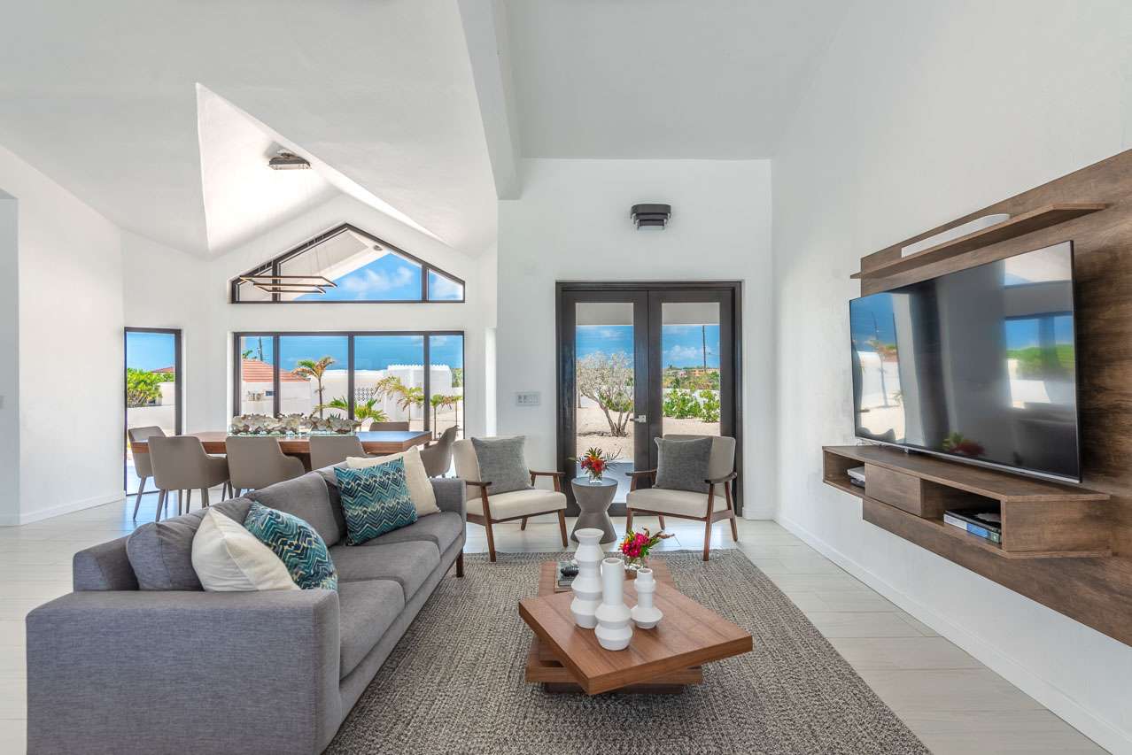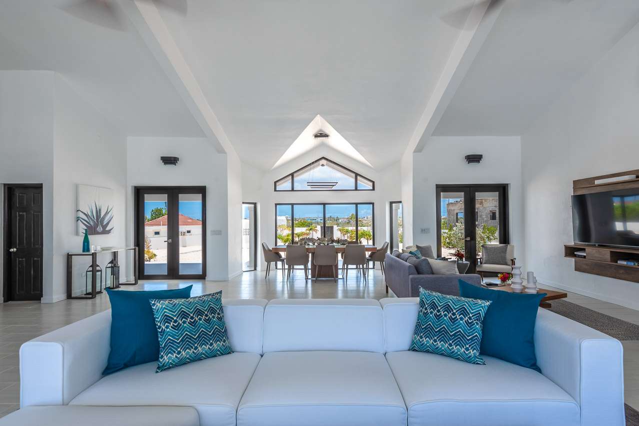 At the center overlooking the pool terrace is the sitting area, a nice spot to sink in with your morning coffee or an afternoon aperitif. Facing the large windows, the views from here are unbeatable. In one corner of the great room is another soft sofa in front of a flat-screen TV, ideal for movie nights inside.