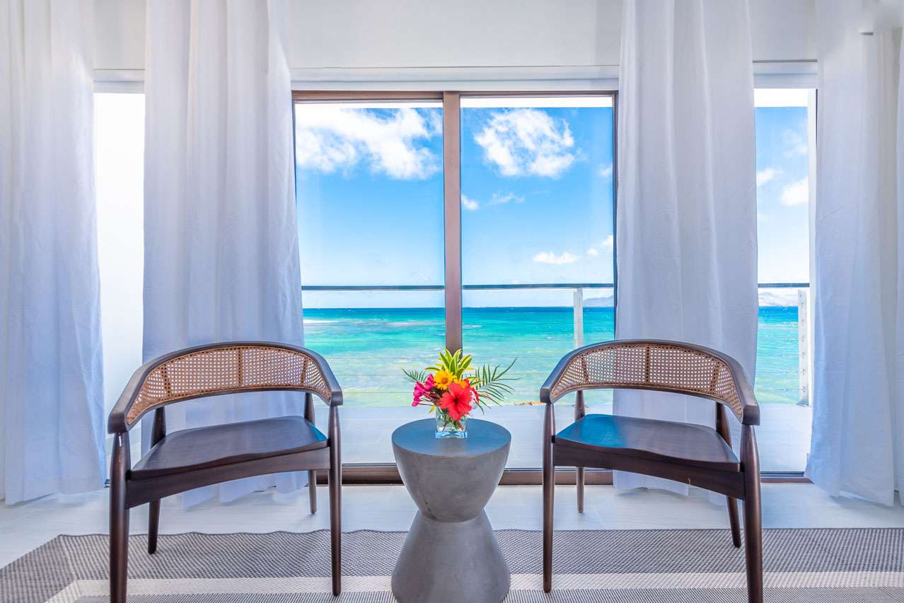 The kitchen island comes with stools on one side, a nice spot for a quick meal or to watch your private chef go to work. The dining table is a magnificent setting for dinners, with seating for up to 8 guests. Alfresco dinners can also be set up on the lanai outside.