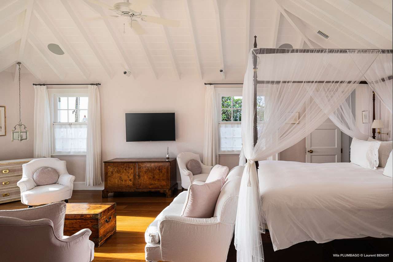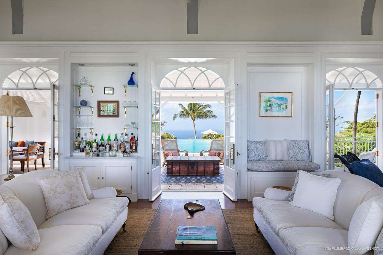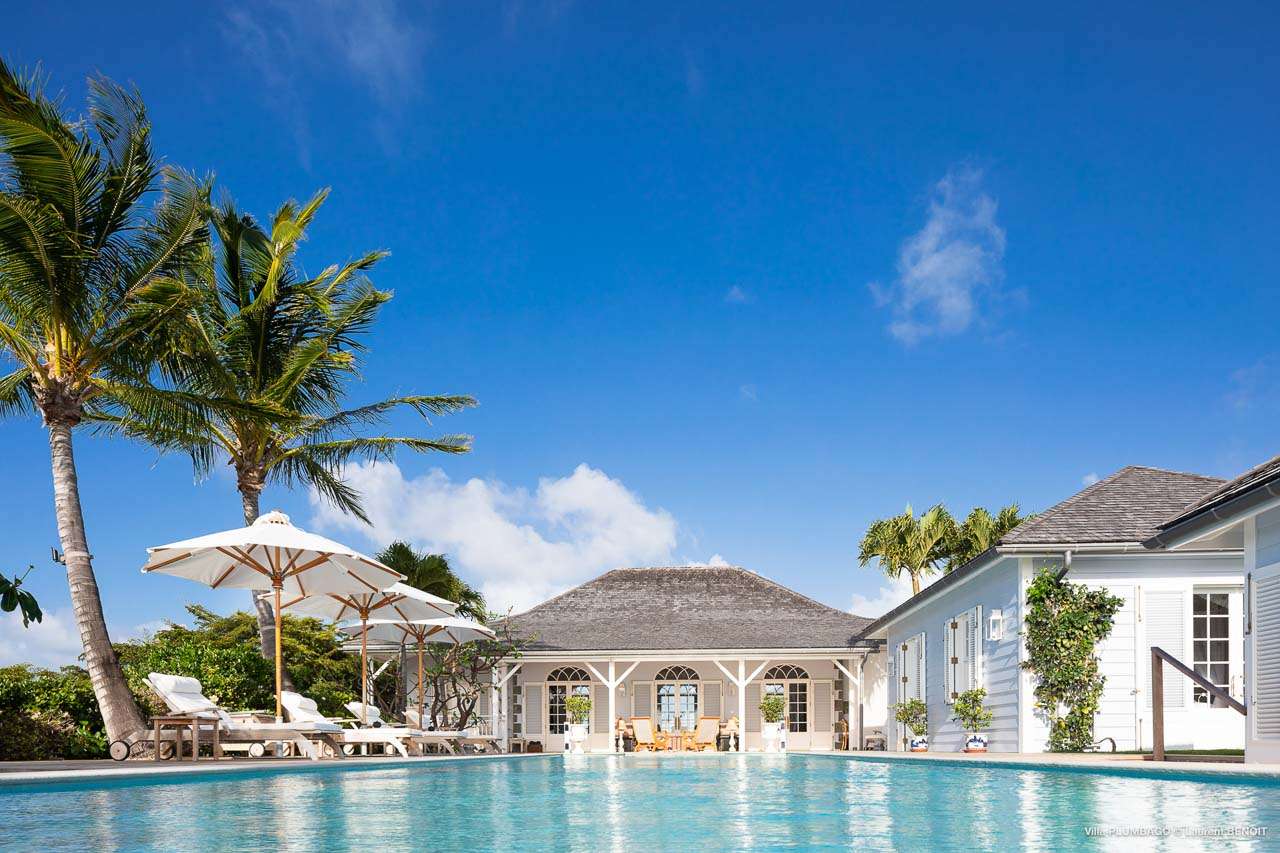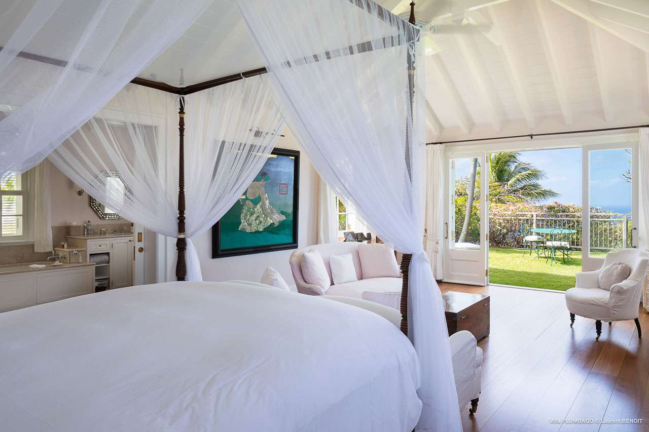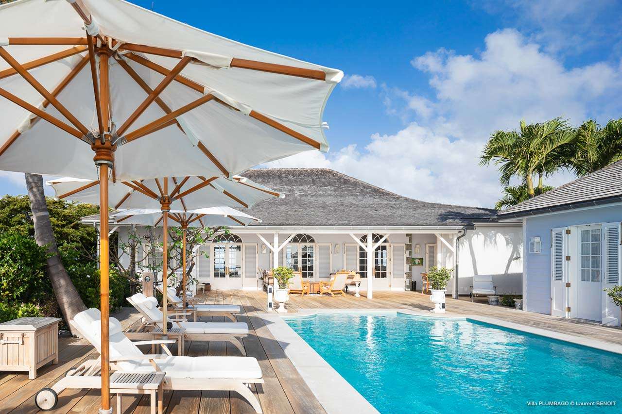 Welcome to Villa Plumbago (villa code: WV PBO), a stunning 4-bedroom villa at the far end of Colombier, St. Barts. Private, luxurious, and meticulously designed, this elegant villa enjoys superb Caribbean views. Villa Plumbago stands out as a fabulous example of a classic West-Indies villa that can easily compete with modern-day architecture. Designed to take in the breezes and views at every turn, the timeless and stylish interiors feature splendid attention to detail, with high-end furnishings providing every comfort for your stay. Sitting on top of a hill facing both east and west, Villa Plumbago enjoys terrific views both east and west. With all-day sun, this private villa is a wonderful place to lounge around, gazing out at the sparkling Caribbean across the lush, landscaped gardens. Restaurants and shops in Gustavia are only around 10 minutes by car. Inside Villa Plumbago, all roads lead to the main room, which combines the living room and kitchen. The grand and elegant feeling of the home creates an enticing atmosphere, with unique details adding touches of character to each room. The central living room is the social heart of the house, with a pair of elegant sofas and armchairs for relaxing. There is a small office space in the back, which also serves as a second TV room. The kitchen at Villa Plumbago is a social space, designed for your group to spend time together while preparing a meal. The high-end appliances make cooking easy, while the breakfast bar with stools encourages breezy aperitifs while the food is being prepared. There is a large dining table outside the kitchen on the main terrace, with bench-style seating along one end. It’s a fantastic setting to come together over a meal, lingering with a glass of wine as the warm Caribbean evening descends over the island. There are 4 bedrooms at Villa Plumbago, quiet places to go for some privacy and downtime during your stay. Expect plush mattresses, crisp white linens, and TVs in every room. There are two bedrooms on the main level, both in a separate bungalow around the pool. The first master offers gorgeous ocean and sunset views, as well as a private garden and terrace. This bedroom has a four-poster king-sized bed, while the ensuite comes with a special outdoor shower. The first guest room is situated in a bungalow between the main house and the master bungalow. This room is slightly smaller and comes with another four-poster king and a luxury ensuite. The second master bedroom is situated directly below the first. It has a large, covered terrace and a beautiful garden out front. This room also has a separate sitting area that can be closed off and comes with a pull-out sleeper sofa, ideal for parents with children. The second guest room is situated next to the second master in a separate unit. This room has two twin beds that can be made up as a European-king bed. The outdoor spaces at Villa Plumbago are incredible, with plenty of spots to come together as a group or find a quiet corner. Ample seating around the pool and throughout the beautiful gardens invites you to sink in and relax, immersing yourself in the sensational island views. At the center of it all is the 60 ft long, heated infinity pool, an eye-catching spot for a cool dip – especially when the sunset is on. There are loungers here for sunbathing, and the nearby covered terrace of the main home features an outdoor living area for a post-swim drink. The main house keeps the wind away from the rear terrace, a sheltered spot to relax during the day. Yet another terrace overlooks Flamands Bay, providing incredible sunrise views.Please fill out the form to begin your inquiry and we will connect you with a seasoned villa rental specialist.
