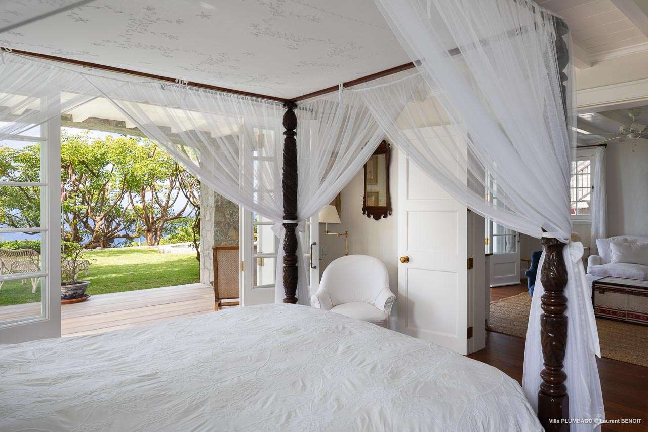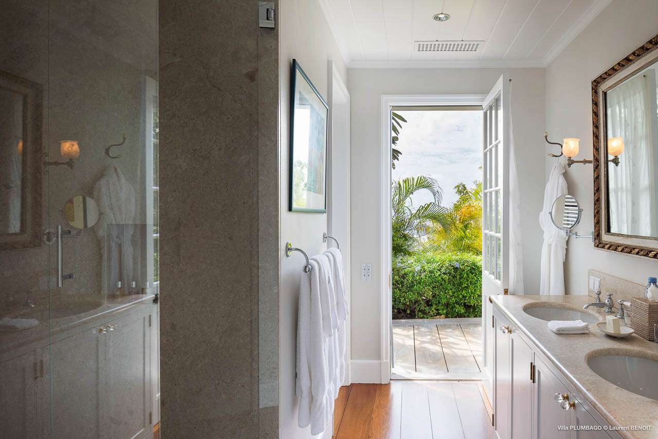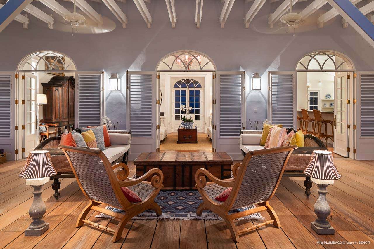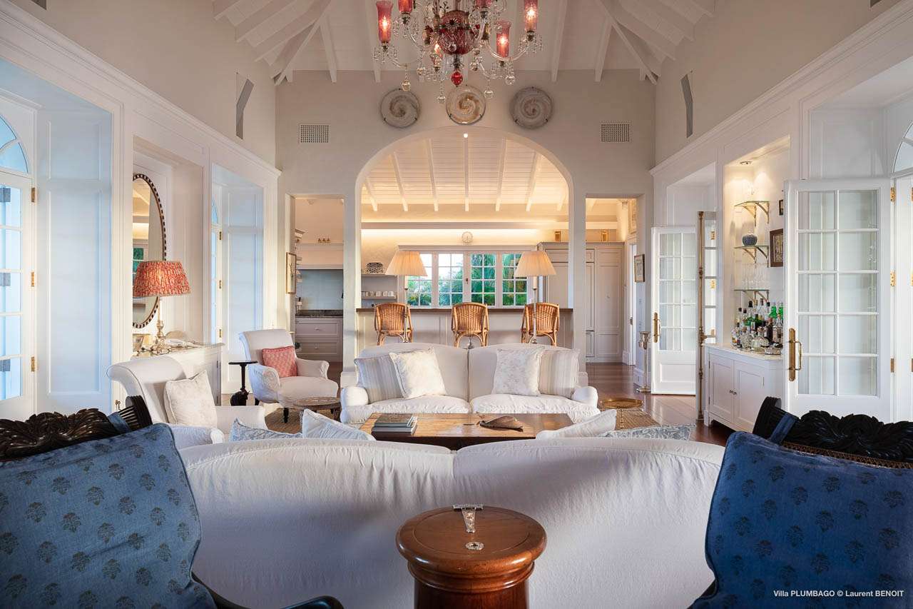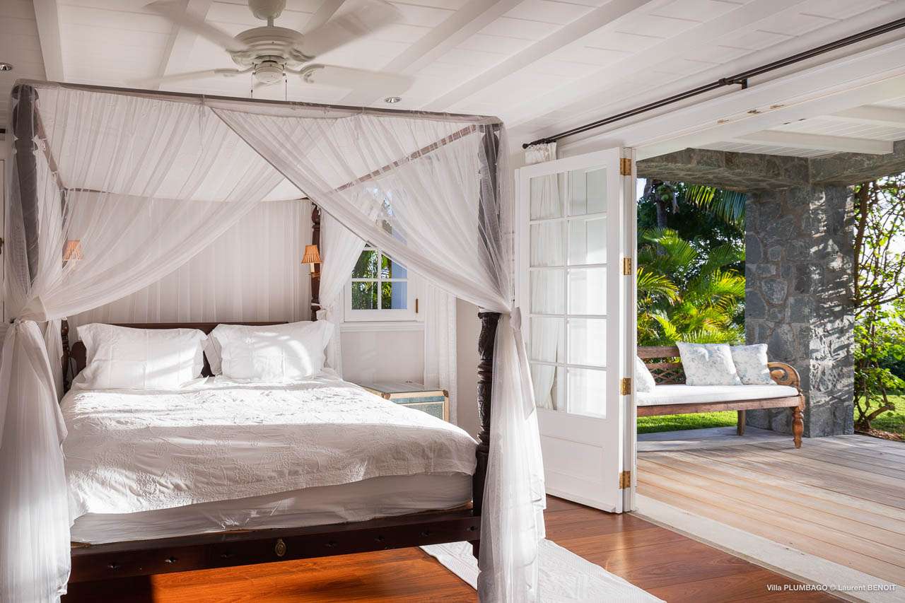 Welcome to Villa Plumbago (villa code: WV PBO), a stunning 4-bedroom villa at the far end of Colombier, St. Barts. Private, luxurious, and meticulously designed, this elegant villa enjoys superb Caribbean views. Villa Plumbago stands out as a fabulous example of a classic West-Indies villa that can easily compete with modern-day architecture. Designed to take in the breezes and views at every turn, the timeless and stylish interiors feature splendid attention to detail, with high-end furnishings providing every comfort for your stay. Sitting on top of a hill facing both east and west, Villa Plumbago enjoys terrific views both east and west. With all-day sun, this private villa is a wonderful place to lounge around, gazing out at the sparkling Caribbean across the lush, landscaped gardens. Restaurants and shops in Gustavia are only around 10 minutes by car. Inside Villa Plumbago, all roads lead to the main room, which combines the living room and kitchen. The grand and elegant feeling of the home creates an enticing atmosphere, with unique details adding touches of character to each room. The central living room is the social heart of the house, with a pair of elegant sofas and armchairs for relaxing. There is a small office space in the back, which also serves as a second TV room. The kitchen at Villa Plumbago is a social space, designed for your group to spend time together while preparing a meal. The high-end appliances make cooking easy, while the breakfast bar with stools encourages breezy aperitifs while the food is being prepared. There is a large dining table outside the kitchen on the main terrace, with bench-style seating along one end. It’s a fantastic setting to come together over a meal, lingering with a glass of wine as the warm Caribbean evening descends over the island. There are 4 bedrooms at Villa Plumbago, quiet places to go for some privacy and downtime during your stay. Expect plush mattresses, crisp white linens, and TVs in every room. There are two bedrooms on the main level, both in a separate bungalow around the pool. The first master offers gorgeous ocean and sunset views, as well as a private garden and terrace. This bedroom has a four-poster king-sized bed, while the ensuite comes with a special outdoor shower. The first guest room is situated in a bungalow between the main house and the master bungalow. This room is slightly smaller and comes with another four-poster king and a luxury ensuite. The second master bedroom is situated directly below the first. It has a large, covered terrace and a beautiful garden out front. This room also has a separate sitting area that can be closed off and comes with a pull-out sleeper sofa, ideal for parents with children. The second guest room is situated next to the second master in a separate unit. This room has two twin beds that can be made up as a European-king bed. The outdoor spaces at Villa Plumbago are incredible, with plenty of spots to come together as a group or find a quiet corner. Ample seating around the pool and throughout the beautiful gardens invites you to sink in and relax, immersing yourself in the sensational island views. At the center of it all is the 60 ft long, heated infinity pool, an eye-catching spot for a cool dip – especially when the sunset is on. There are loungers here for sunbathing, and the nearby covered terrace of the main home features an outdoor living area for a post-swim drink. The main house keeps the wind away from the rear terrace, a sheltered spot to relax during the day. Yet another terrace overlooks Flamands Bay, providing incredible sunrise views.Please fill out the form to begin your inquiry and we will connect you with a seasoned villa rental specialist.