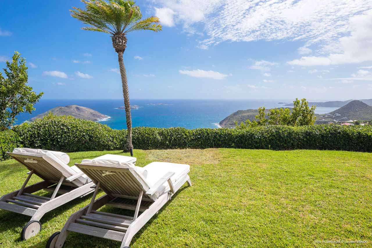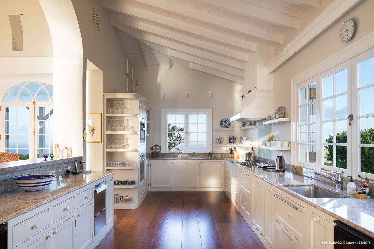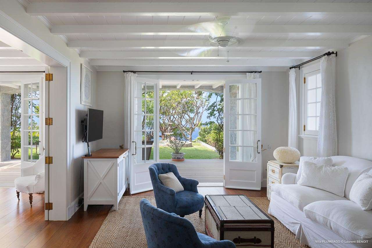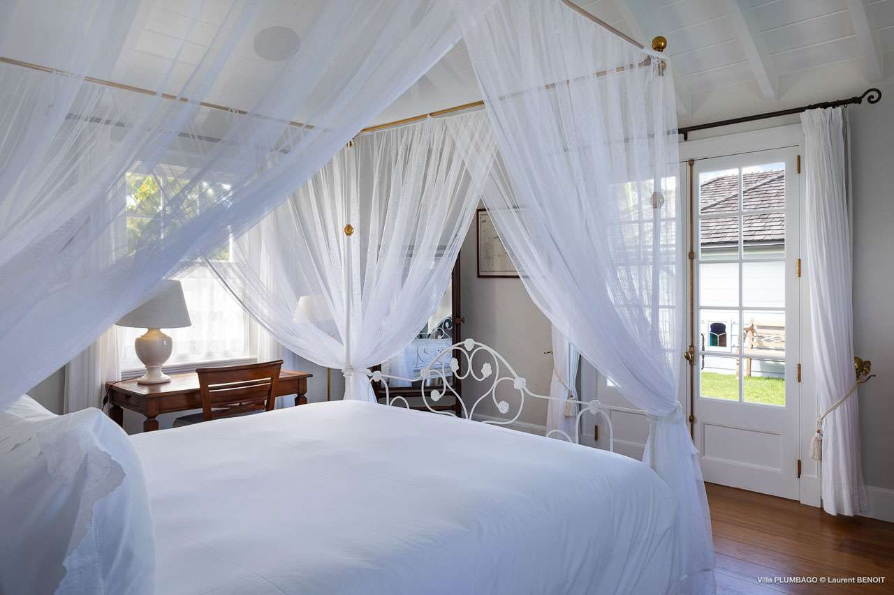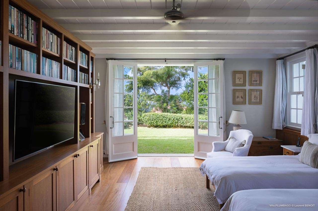 Welcome to Villa Plumbago (villa code: WV PBO), a stunning 4-bedroom villa at the far end of Colombier, St. Barts. Private, luxurious, and meticulously designed, this elegant villa enjoys superb Caribbean views. Villa Plumbago stands out as a fabulous example of a classic West-Indies villa that can easily compete with modern-day architecture. Designed to take in the breezes and views at every turn, the timeless and stylish interiors feature splendid attention to detail, with high-end furnishings providing every comfort for your stay. Sitting on top of a hill facing both east and west, Villa Plumbago enjoys terrific views both east and west. With all-day sun, this private villa is a wonderful place to lounge around, gazing out at the sparkling Caribbean across the lush, landscaped gardens. Restaurants and shops in Gustavia are only around 10 minutes by car. Inside Villa Plumbago, all roads lead to the main room, which combines the living room and kitchen. The grand and elegant feeling of the home creates an enticing atmosphere, with unique details adding touches of character to each room. The central living room is the social heart of the house, with a pair of elegant sofas and armchairs for relaxing. There is a small office space in the back, which also serves as a second TV room. The kitchen at Villa Plumbago is a social space, designed for your group to spend time together while preparing a meal. The high-end appliances make cooking easy, while the breakfast bar with stools encourages breezy aperitifs while the food is being prepared. There is a large dining table outside the kitchen on the main terrace, with bench-style seating along one end. It’s a fantastic setting to come together over a meal, lingering with a glass of wine as the warm Caribbean evening descends over the island. There are 4 bedrooms at Villa Plumbago, quiet places to go for some privacy and downtime during your stay. Expect plush mattresses, crisp white linens, and TVs in every room. There are two bedrooms on the main level, both in a separate bungalow around the pool. The first master offers gorgeous ocean and sunset views, as well as a private garden and terrace. This bedroom has a four-poster king-sized bed, while the ensuite comes with a special outdoor shower. The first guest room is situated in a bungalow between the main house and the master bungalow. This room is slightly smaller and comes with another four-poster king and a luxury ensuite. The second master bedroom is situated directly below the first. It has a large, covered terrace and a beautiful garden out front. This room also has a separate sitting area that can be closed off and comes with a pull-out sleeper sofa, ideal for parents with children. The second guest room is situated next to the second master in a separate unit. This room has two twin beds that can be made up as a European-king bed. The outdoor spaces at Villa Plumbago are incredible, with plenty of spots to come together as a group or find a quiet corner. Ample seating around the pool and throughout the beautiful gardens invites you to sink in and relax, immersing yourself in the sensational island views. At the center of it all is the 60 ft long, heated infinity pool, an eye-catching spot for a cool dip – especially when the sunset is on. There are loungers here for sunbathing, and the nearby covered terrace of the main home features an outdoor living area for a post-swim drink. The main house keeps the wind away from the rear terrace, a sheltered spot to relax during the day. Yet another terrace overlooks Flamands Bay, providing incredible sunrise views.Please fill out the form to begin your inquiry and we will connect you with a seasoned villa rental specialist.