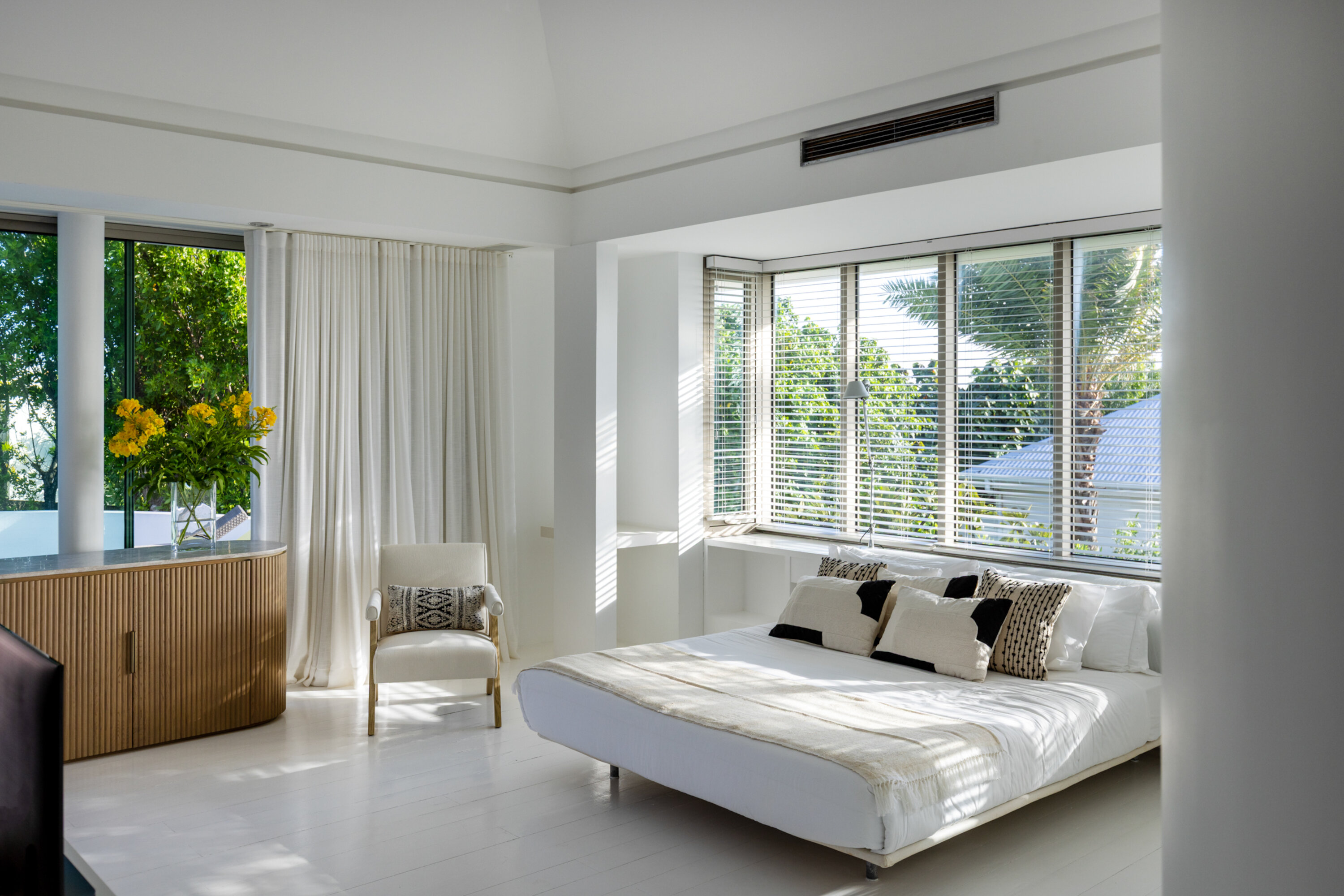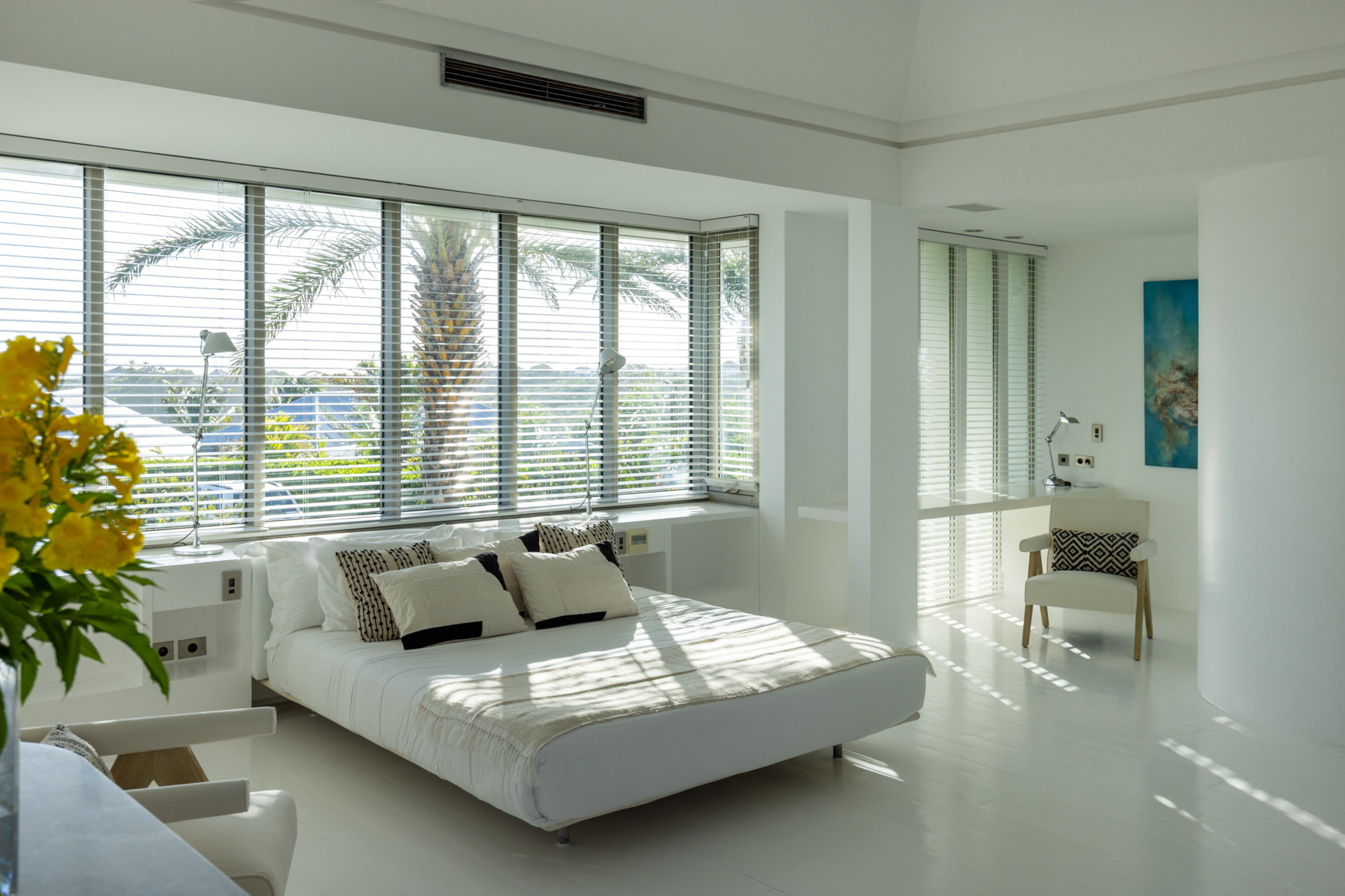 The third bedroom is also air-conditioned and offers an ensuite bathroom, an additional completely private terrace, a Smart TV, and an independent music system. This bedroom is smaller than the 2 master bedrooms and is located on the lower level, off the garden.