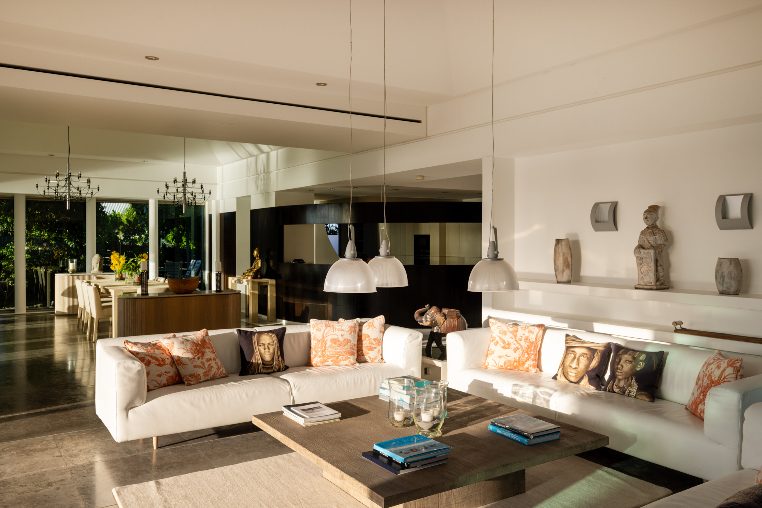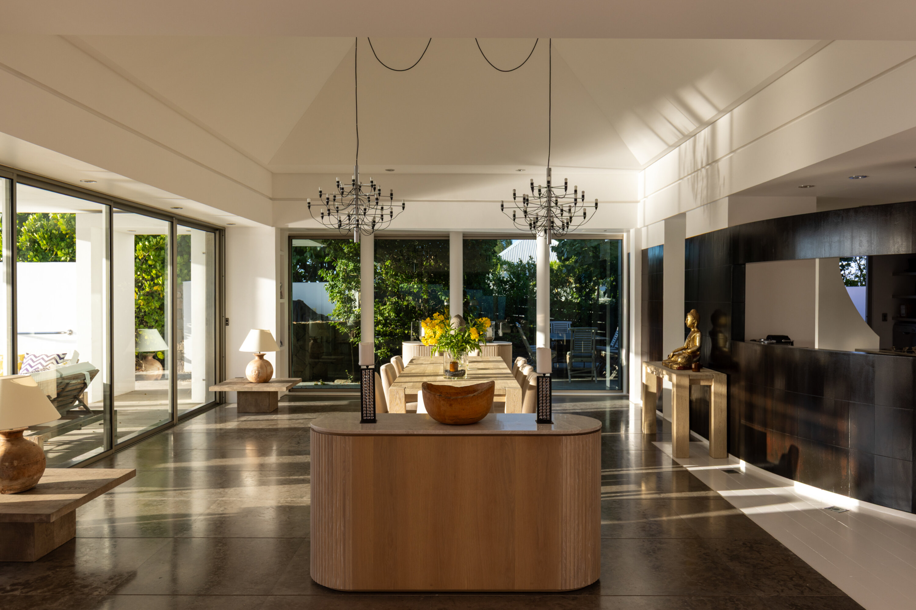 At the heart of Villa Pyramide is an expansive great room, with both the living and dining areas rolled into one. It’s the ideal place to entertain, opening to the outdoor terrace with plenty more seating as well. Sofas in this living area are a great spot to relax and enjoy some conversation and drinks with family and friends.