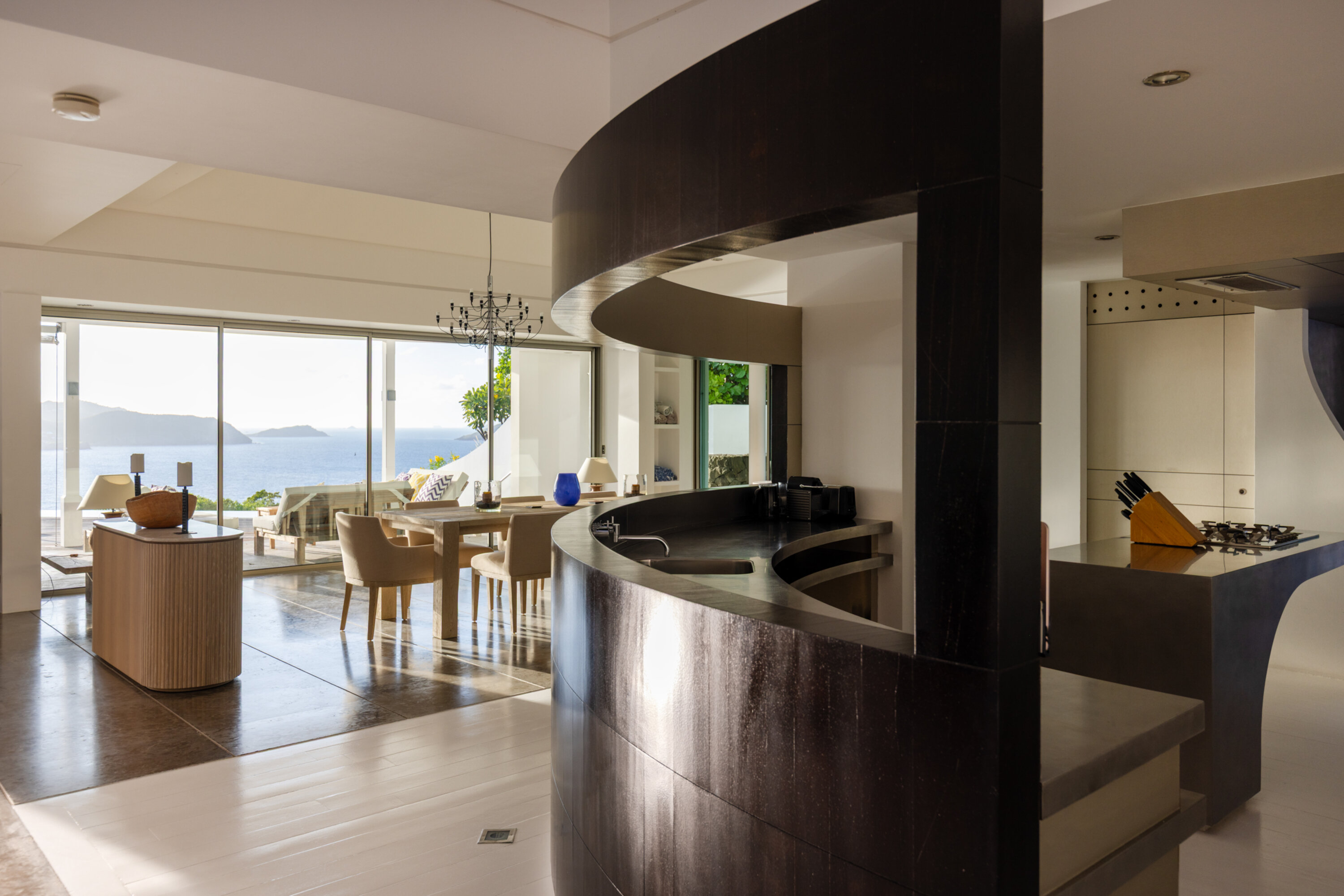 The dining table in the great room also faces the ocean views, making for an idyllic backdrop while you dine. For those who prefer to eat outside, there’s a second table on the terrace, an elegant setting for dinners with the fading glow of the late afternoon.