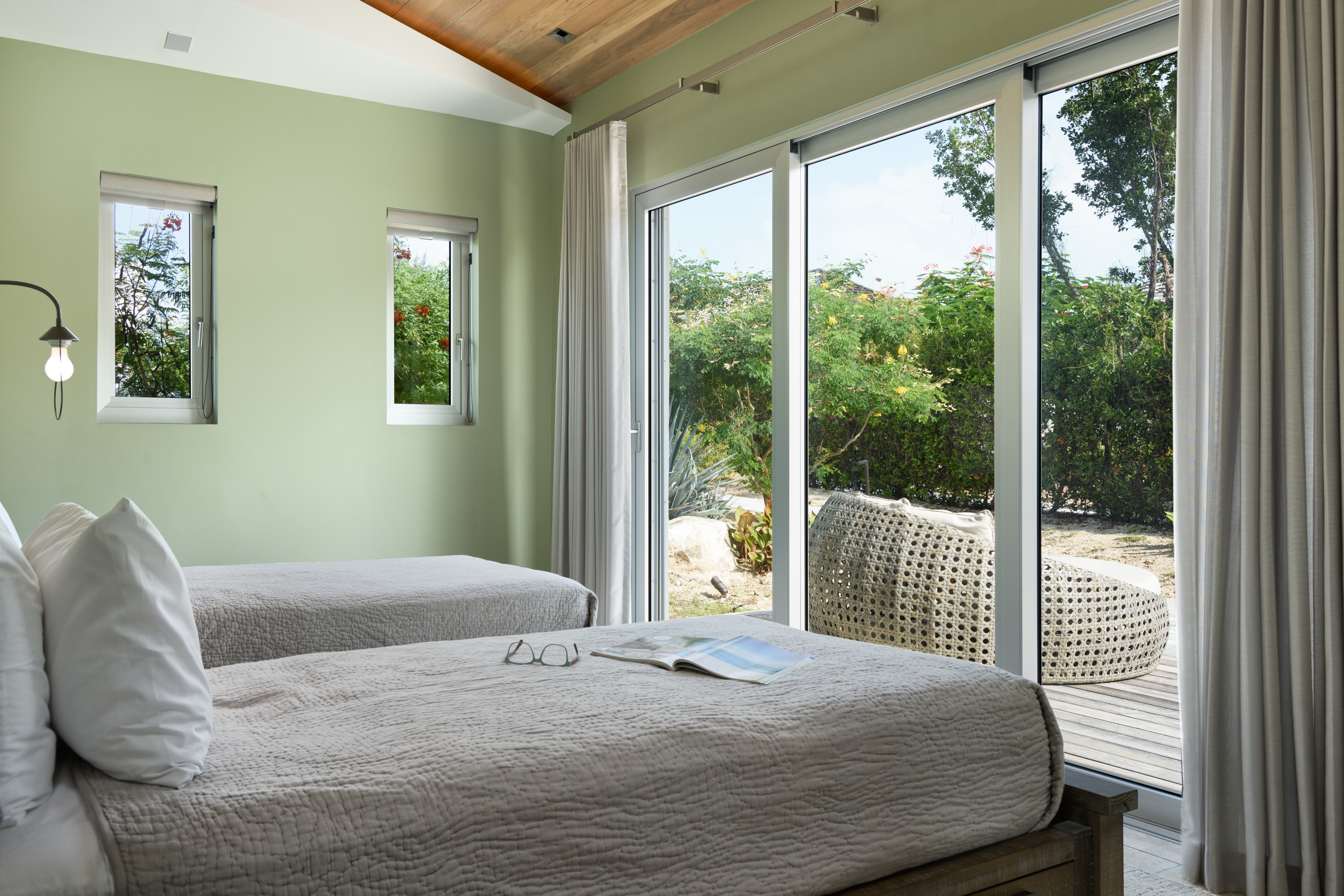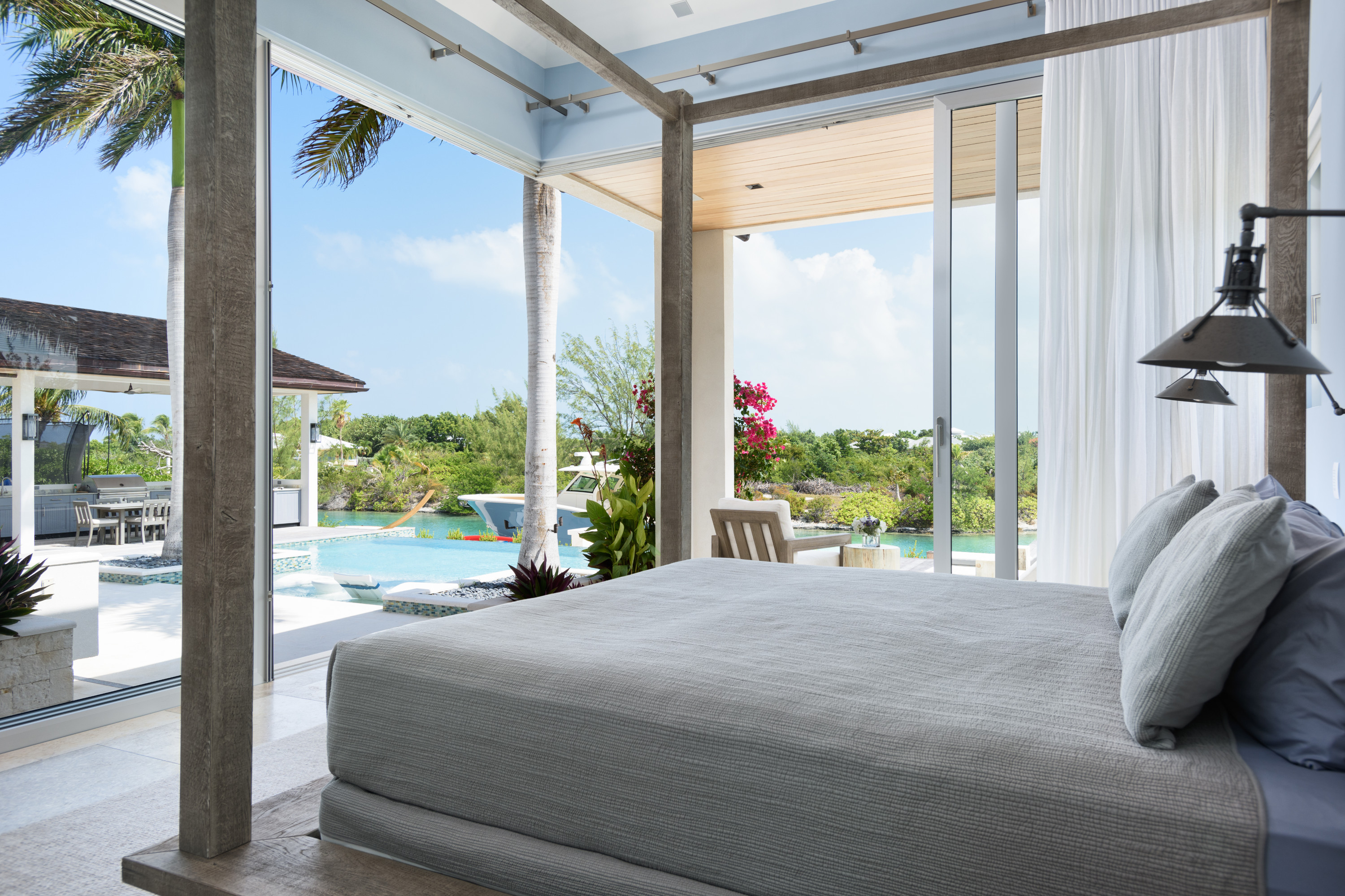 The main house boasts four bedrooms, each in soft pastel shades and positioned for privacy, along with their own bathrooms. The primary suite features a four-poster king bed with a view of the pool, and the bathroom offers a freestanding soaking tub and both indoor and outdoor showers. The second guest suite also overlooks the pool and canal, while the third and fourth suites have views of the garden.