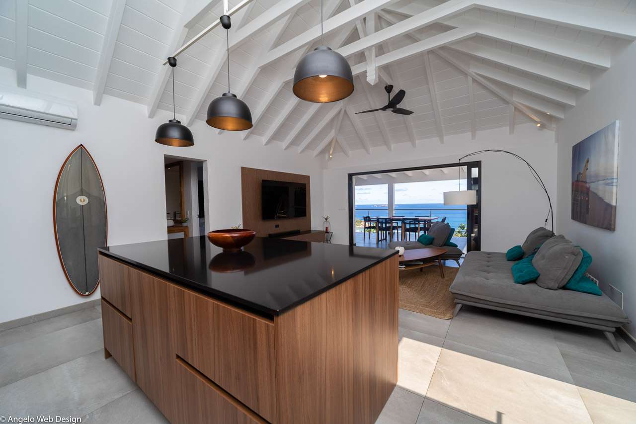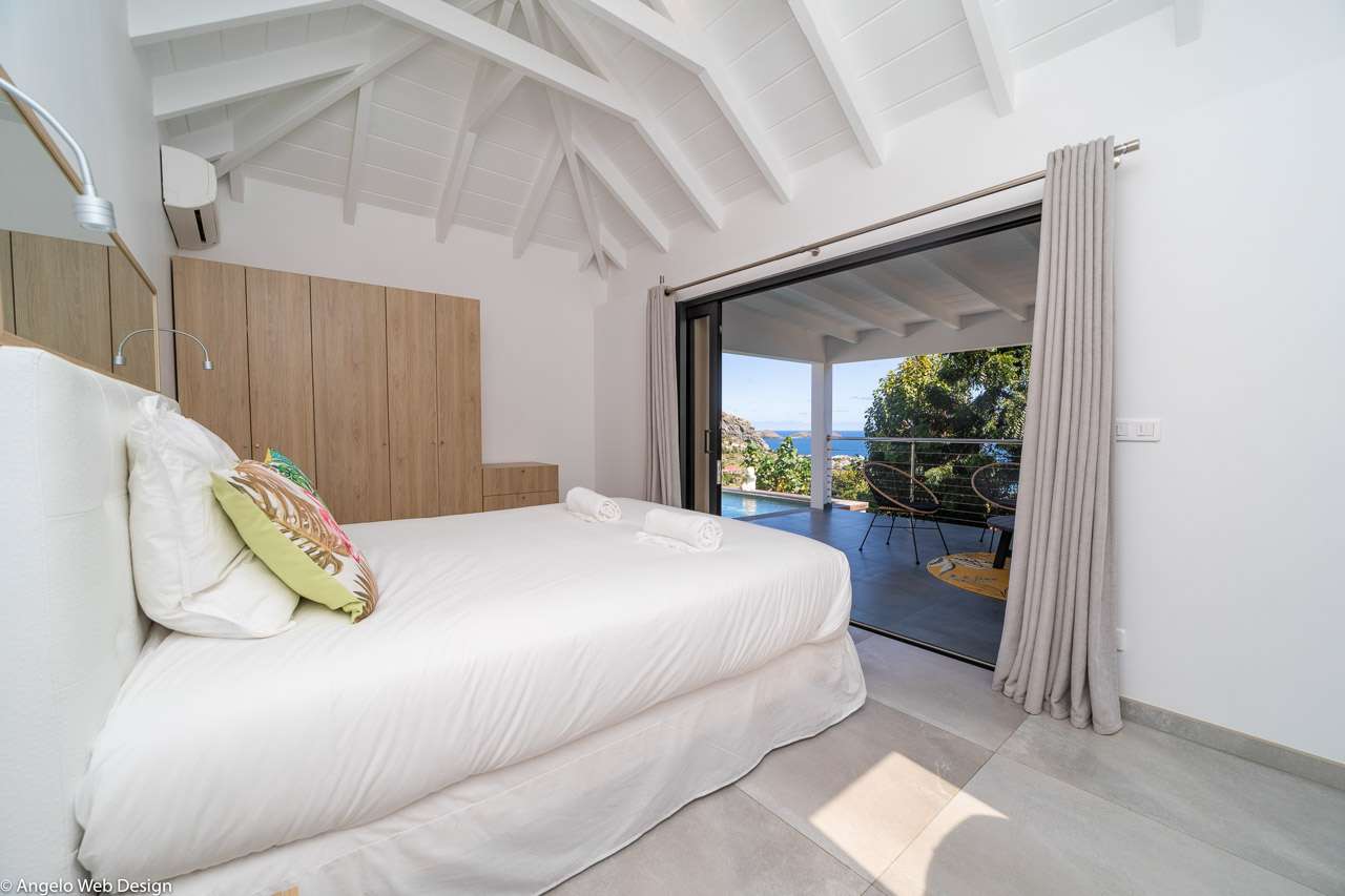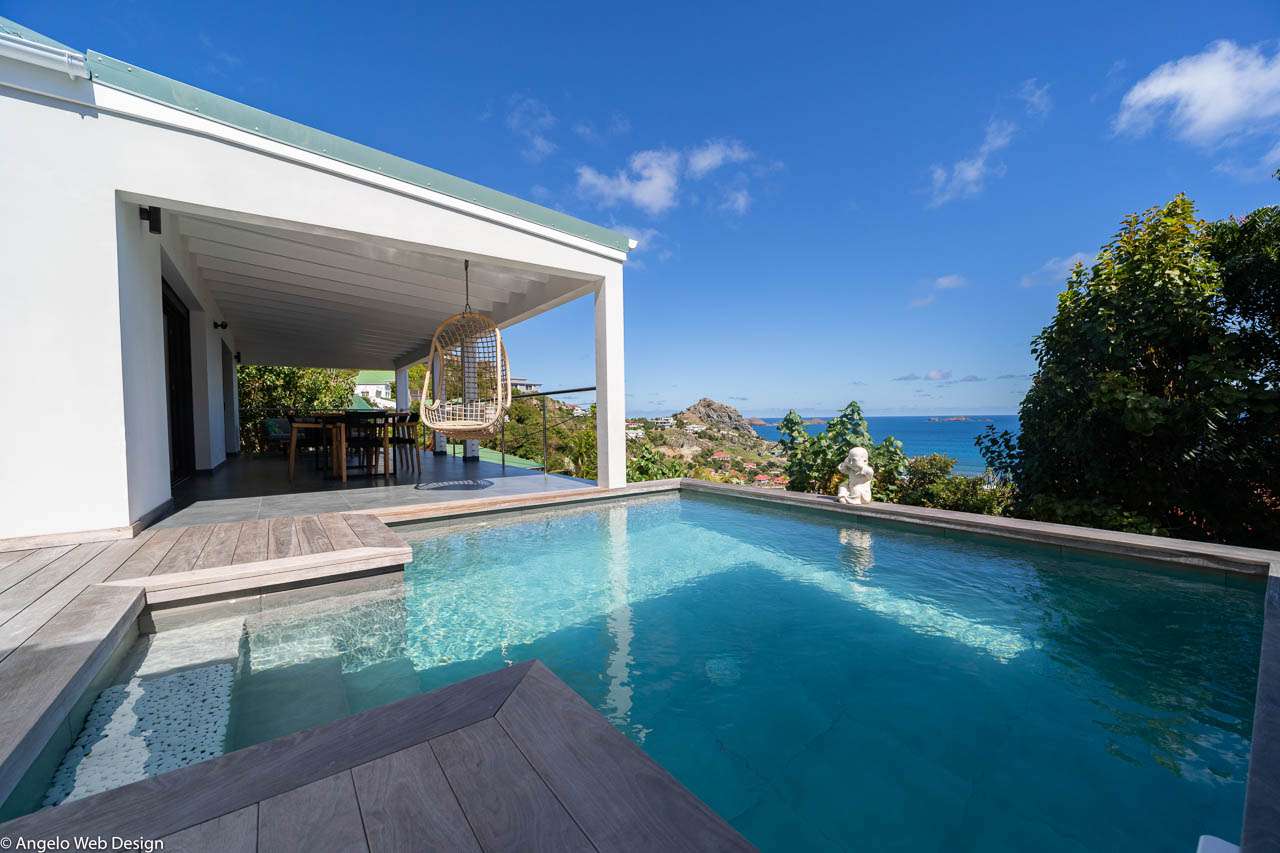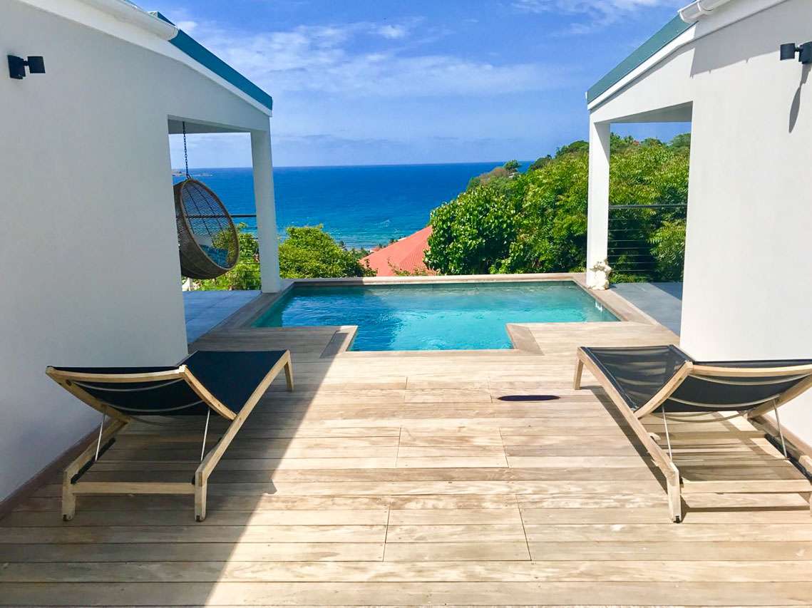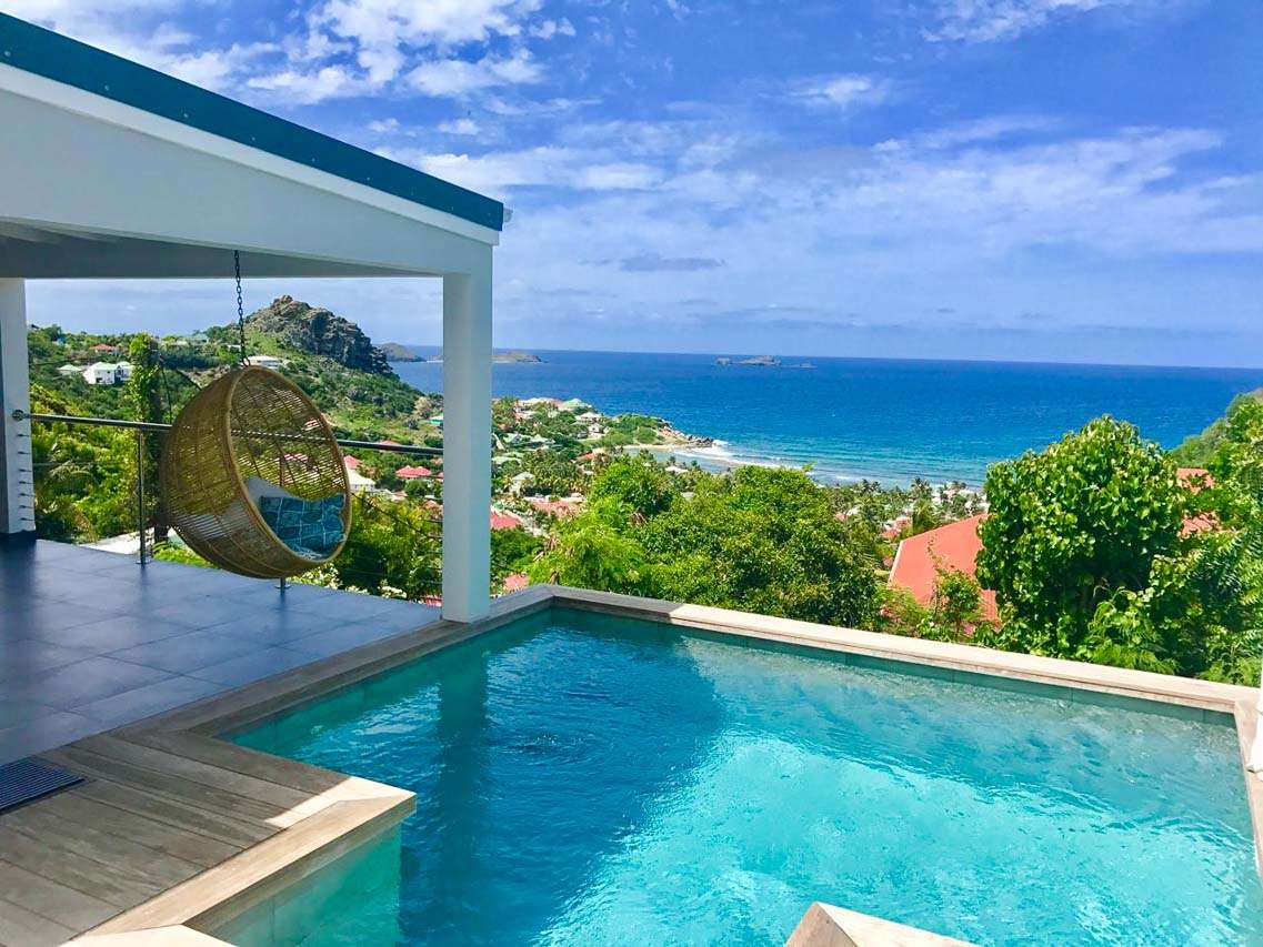 Castaway to Villa Ride (villa code: WV RID), a contemporary 2-bedroom villa in Anse des Cayes, St. Barts. This airy villa tucked in the hills enjoys lovely ocean views, with its effortless and minimalist style ideal for a relaxing Caribbean getaway. The modern interiors at Villa Ride feature clean lines, superb attention to detail, and laid-back décor. Your gaze will be drawn immediately through the windows, where the striking blue of the ocean captures the imagination. All the creature comforts are available, with the furnishings providing you with idyllic spots to forget the rushes of modern life. Located in the hills above Anse des Cayes, Villa Ride puts the stunning natural beauty of St. Barts at your feet. Private and quiet, yet within a few minutes by car of the capital Gustavia, it’s the best of both worlds. The beach at Anse des Cayes is also a short drive away. The simple layout at Villa Ride is designed to help you relax as soon as you step inside. Airy, bright, and minimalist, the dark wooden furnishings contrast with the hues of white. At the heart of the home is an open-plan great room, with the living area and kitchen rolled into one, opening to the outdoor terrace. Quiet days inside reading a book or watching TV in the living room are wonderful. The graceful and comfortable sofas are as inviting as they come. A breakfast bar separates the living area from the large, modern kitchen at Villa Ride. It’s designed so that whoever is cooking can stay a part of the conversation in the living area. Otherwise, our concierge is also happy to organize a private chef for an evening, leaving you to sip a cocktail on the terrace, enjoying the views. It’s out here where you’ll find the long dining table, which has seating for up to six guests. That means that you’ll be able to entertain for meals as well, with the near-constant island breezes washing over everything and keeping things nice and cool. The 2 bedrooms at Villa Ride are similar to the rest of the home: tranquil, luxurious, and elegant. The all-white décor creates a peaceful atmosphere, one that’s ideal for recharging after your days exploring the beauty of St. Barts. The master bedroom is next to the living room, featuring a European king-sized bed and a spacious ensuite bathroom with a shower. A separate bungalow near the pool houses the second bedroom, which has a private terrace with seating. This bedroom also features a European king-sized bed and a large bathroom. The living spaces continue outside, offering plenty more spots to kick back and relax. There are two outdoor lounges, one in the sun and the other in the shade, that are excellent for reading, soaking up the island rays, and admiring the late afternoon light cast across the ocean. In front, a small wooden deck frames the T-shaped plunge pool, which can be heated over the winter. There are loungers for sunbathing, and a comfortable hanging swing chair as well.Please fill out the form to begin your inquiry and we will connect you with a seasoned villa rental specialist.