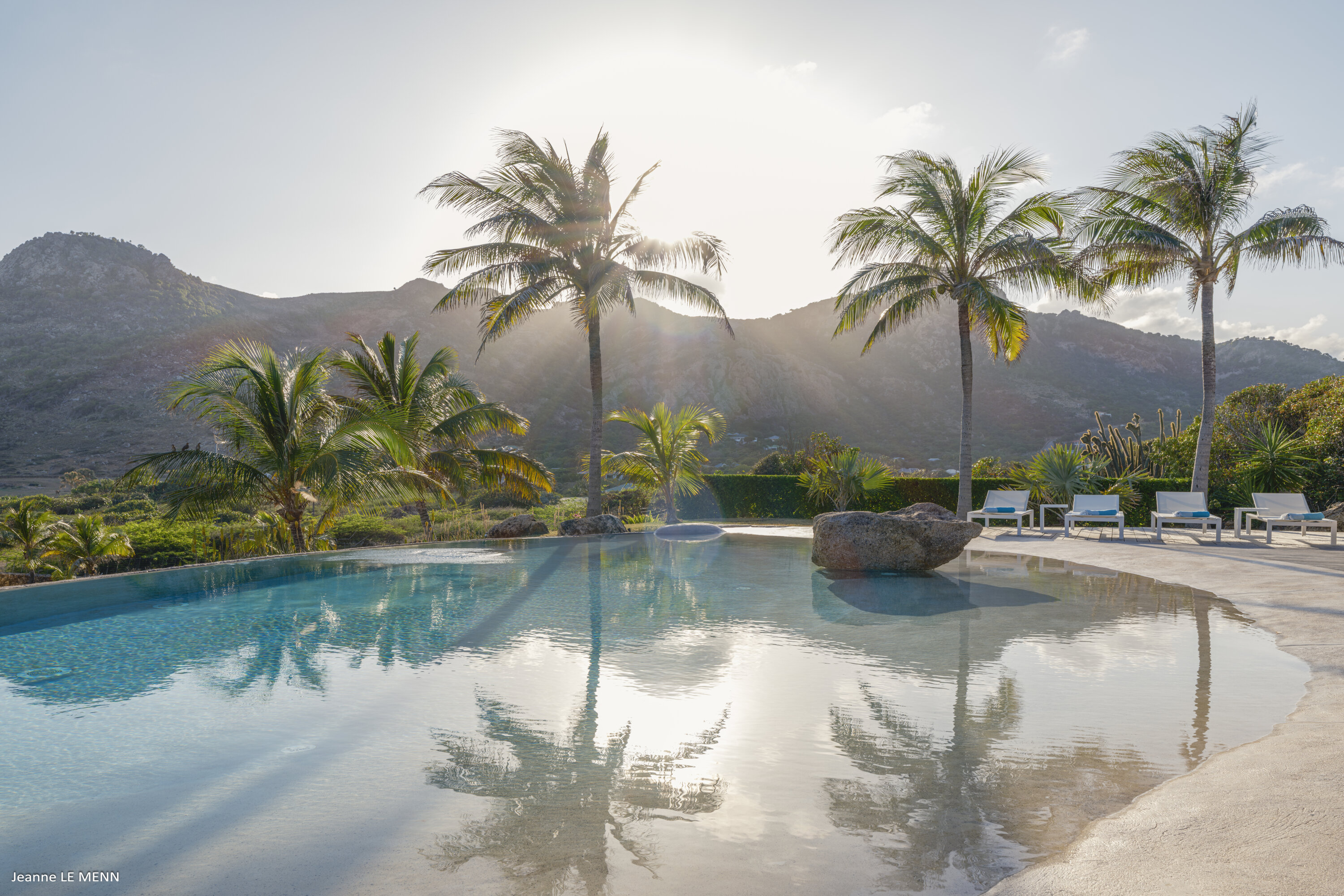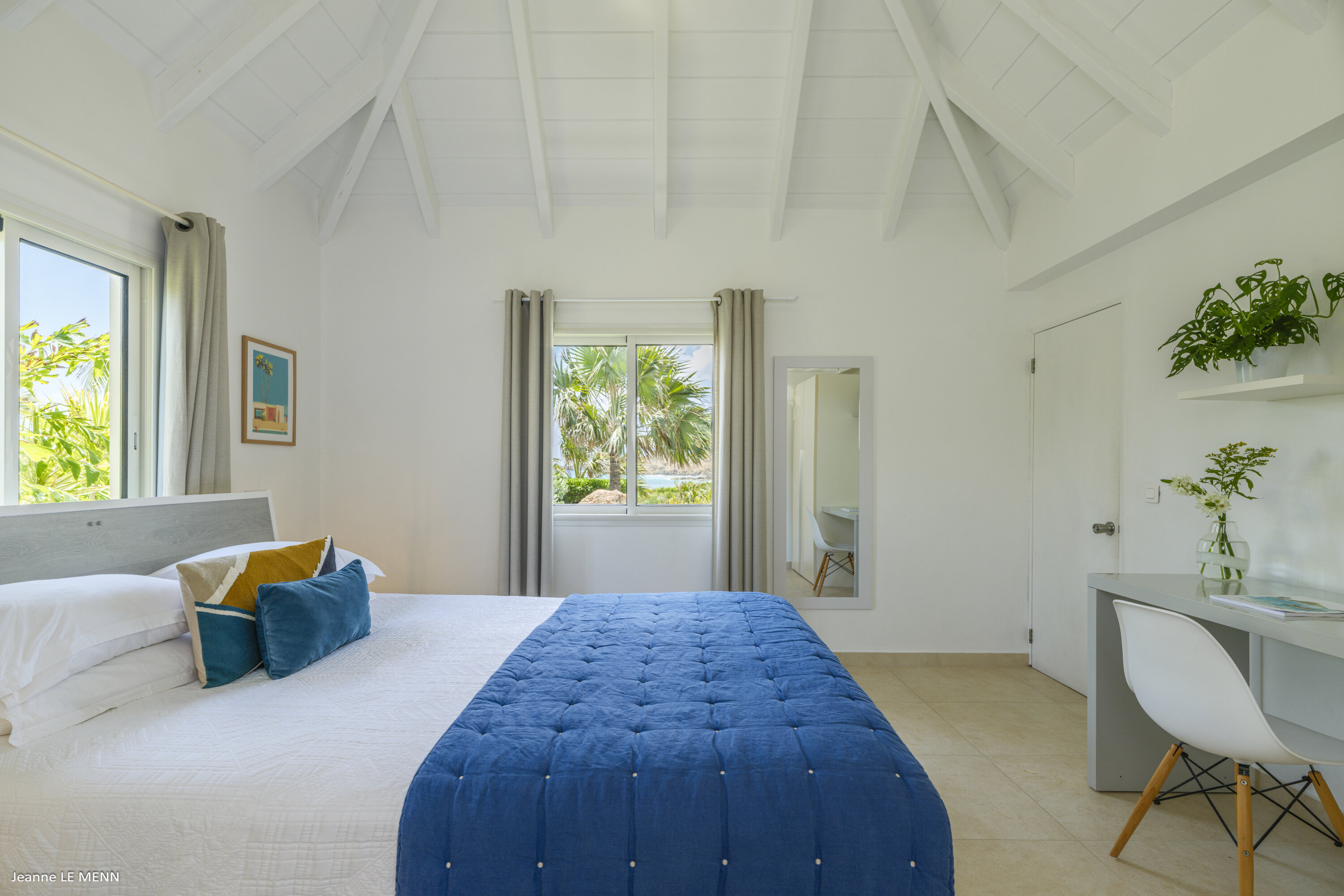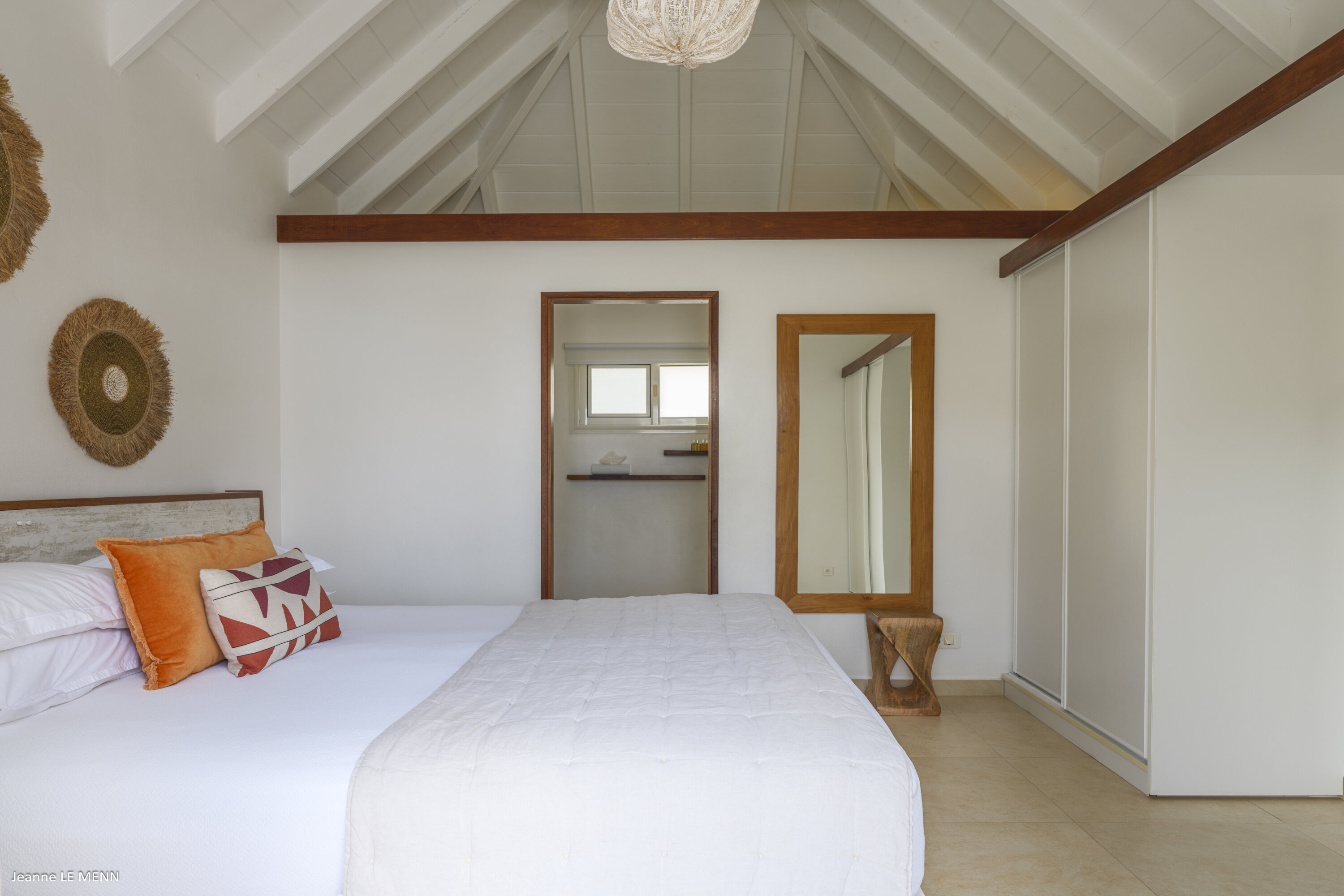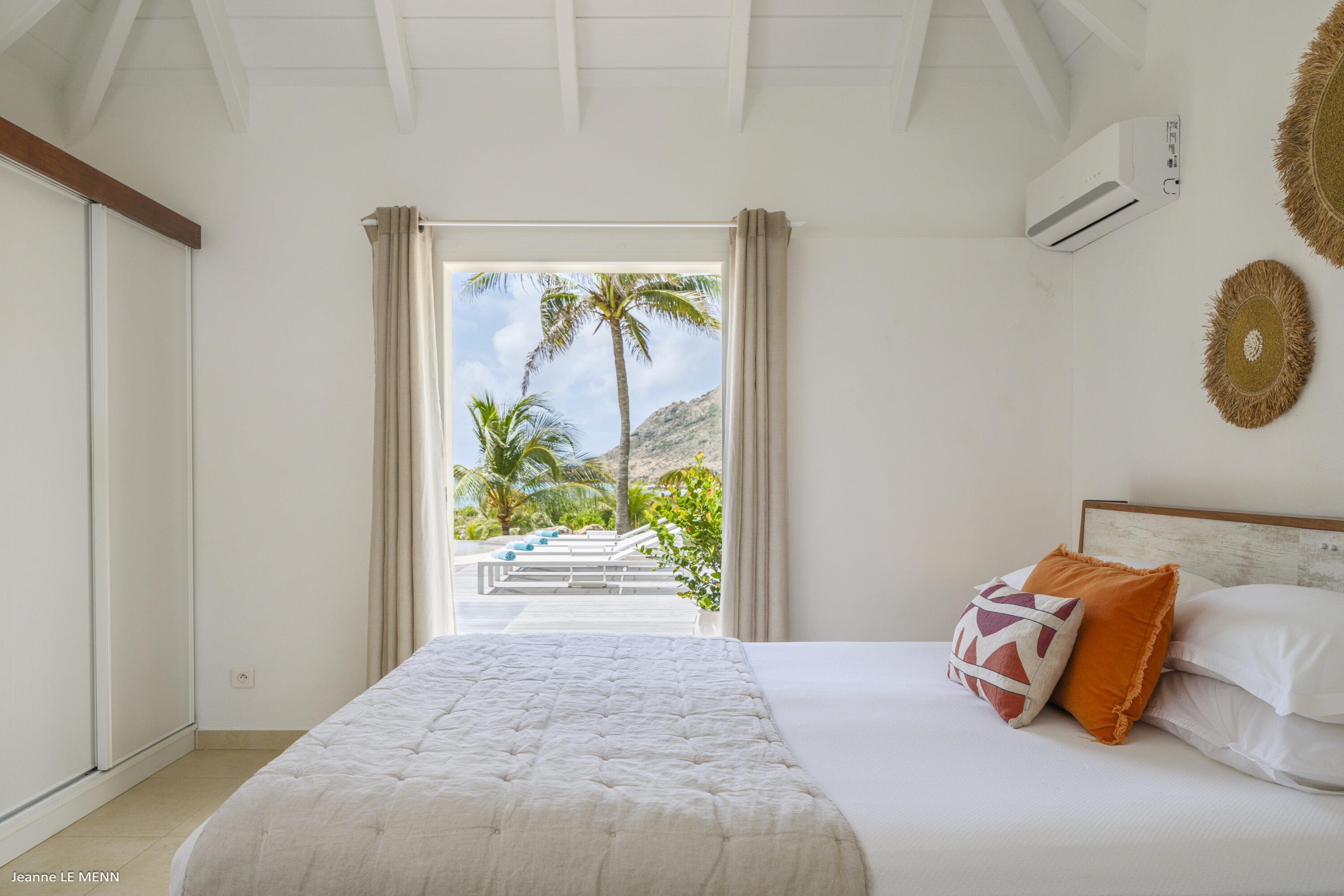 Castaway to Villa La Roche dans l’Eau (villa code: WV GFR), a modern 3-bedroom villa located in Grand Fond, St. Barts. This area is in a quiet part of the island and is an excellent choice for a relaxing island getaway. Contemporary and stylish, the interiors of the villa feature impeccable design and comfort. The creamy white color scheme contrasts with wooden ceilings, while modish and luxurious furnishings offer every comfort. Stripped back décor and several large houseplants add the finishing touches to the elegant property. Located on a rise in the landscape, from the grounds of La Roche dans l’Eau you can see the curving bay, rugged headland, and the shimmering Caribbean sea. The beaches at Grand Cul de Sac and Petit Cul de Sac are both just a short drive away. The great room in Villa La Roche dans l’Eau is home to the modern living room and dining area. The room opens to the outdoor terrace and pool. In the living room, minimalist décor complements the retro-style semicircular sofa, an ideal spot to sink in and enjoy the ocean breeze blowing through the house. A large TV lets you unwind with your favorite TV series or the latest film. The well-equipped kitchen has everything you’ll need to create gourmet meals during your stay. Our concierge can organize grocery pre-stocking or delivery, catered meals, or arrange private chef service for a special occasion. The indoor dining area has seating for up to eight guests, a fine setting for festive dinners. For those who prefer to dine alfresco, another table is under the covered terrace outside. There are 3 bedrooms at Villa La Roche dans l’Eau, spread across the villa to ensure peace, quiet, and privacy for guests. Each room has an ensuite bathroom with a spacious shower. On the second level is the master suite, accessed by an exterior staircase. The unique loft-style roof adds a rustic touch, while a small sitting area lets you relax in seclusion. On either side of the living room downstairs are the other two bedrooms, each with a plush queen-size bed. The remarkable outdoor living areas at Villa La Roche dans l’Eau will sweep you off your feet. A covered area offers space to lounge in the shade, while the sunny terrace is ideal for soaking up the island rays on the loungers. The centerpiece of the property is the gorgeous swimming pool, an inviting place to spend your day. Featuring a graduated slope into the water and a current system, lazing in the pool simulates being at the beach. The rock in the middle of the water is what inspired the villa’s name, which translates to “Rock in the Water”. As the afternoon begins to fade, retreating to the lounge area on the covered deck is encouraged. It’s a fabulous spot to enjoy a cocktail with the sunset, watching as the rosy gold colors light up the sea and sky. In the distance, the twinkling lights of St. Kitts coming to life are alluring. Out the back of the house is another terrace area with a garden. A relaxing and quiet area, it’s ideal for settling in with a good book or your morning coffee. For days on the beach, swinging around to the north side of the island to either Petit Cul de Sac or Grand Cul de Sac is an easy 5-minute drive. For something more adventurous, a 25-minute trek along the headland brings you to the “Washing Machine”, several natural rock pools embedded into the coastline. During the December holidays, the villa rents at the full occupancy rate regardless of how many bedrooms are used.Please fill out the form to begin your inquiry and we will connect you with a seasoned villa rental specialist.