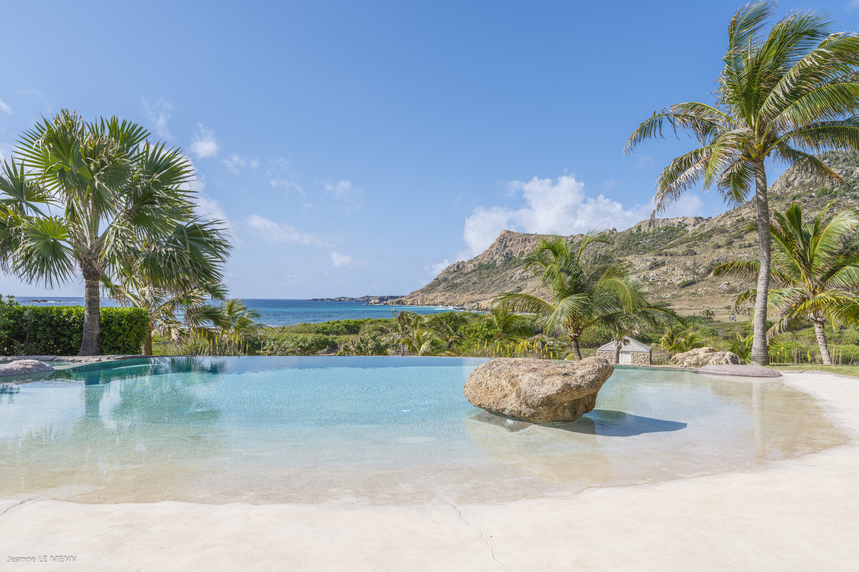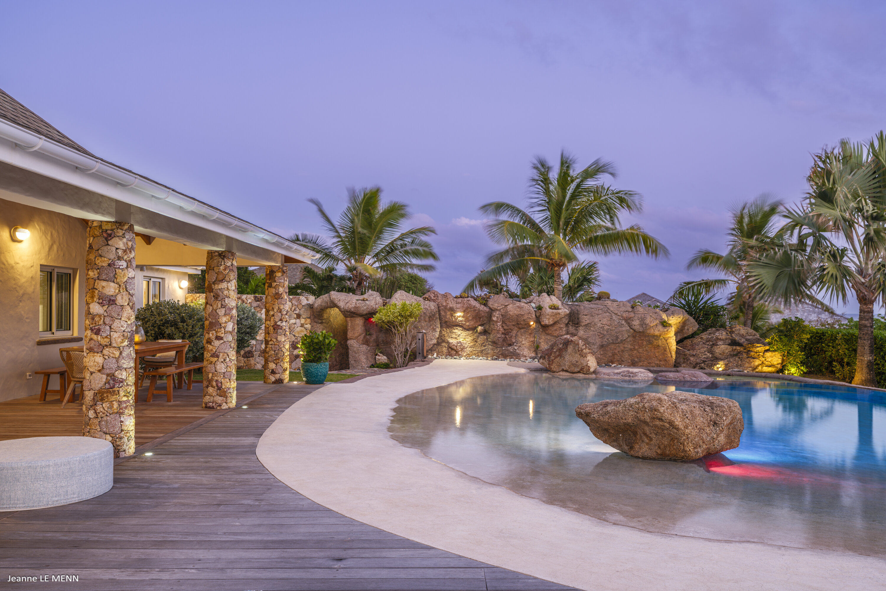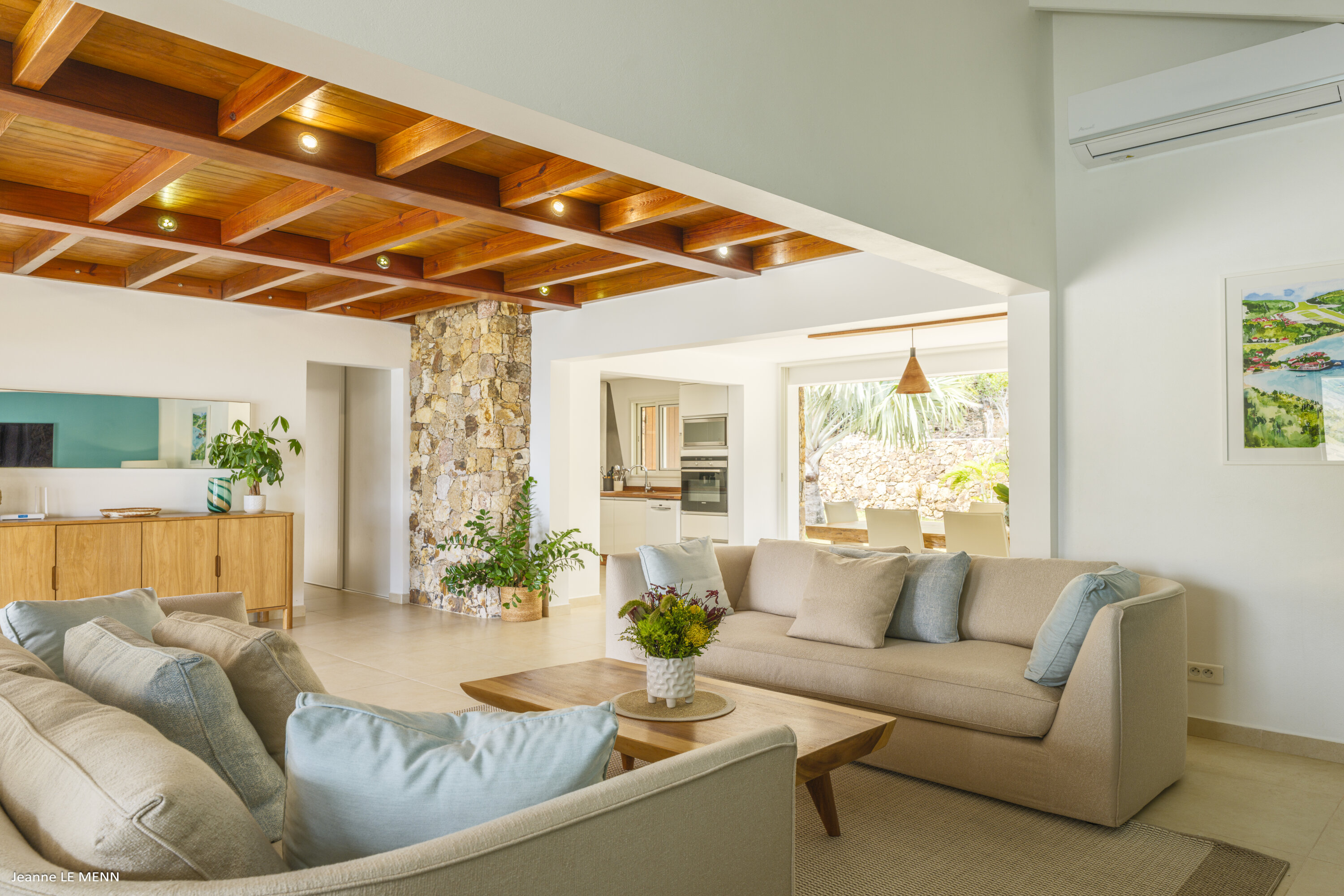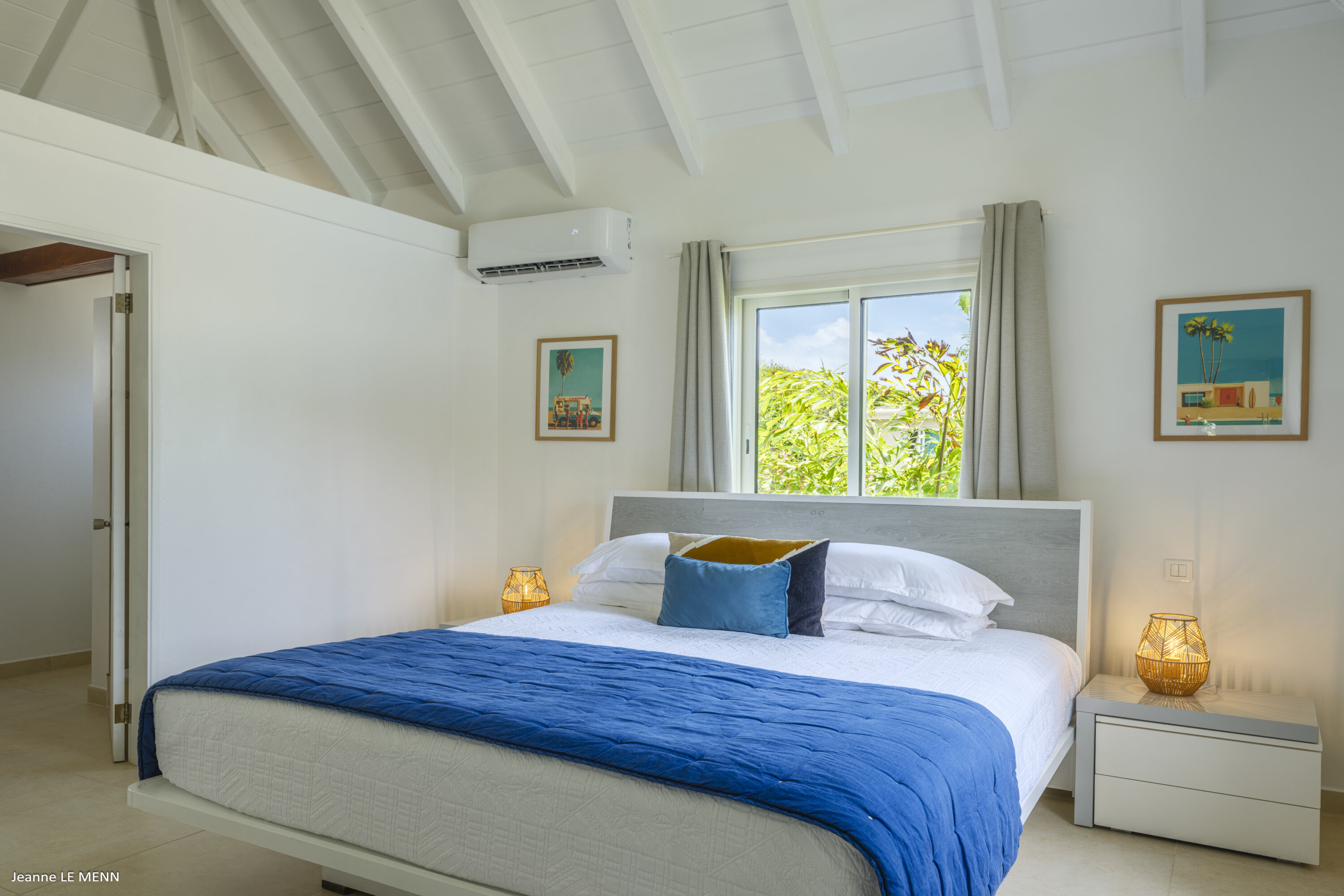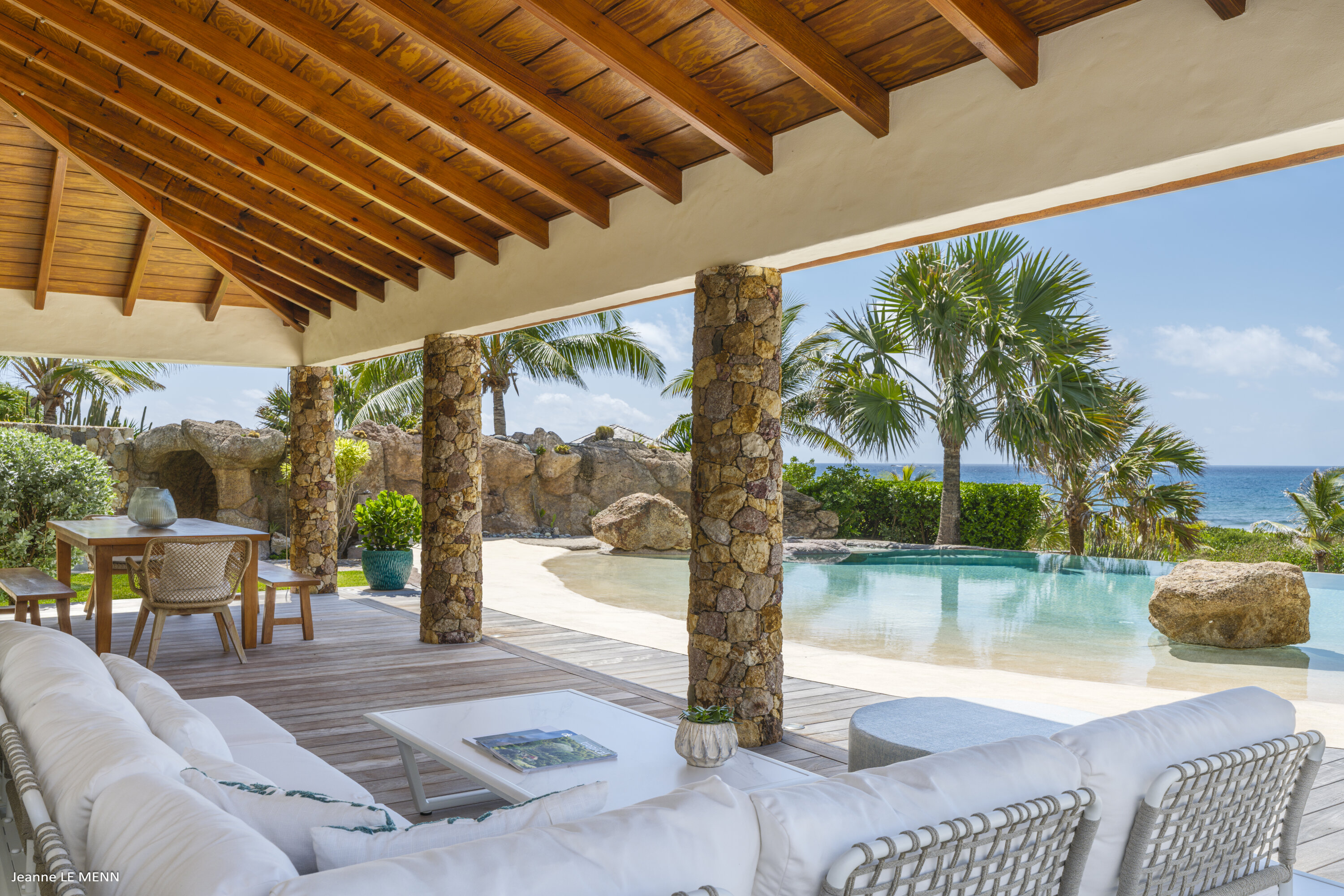 Castaway to Villa La Roche dans l’Eau (villa code: WV GFR), a modern 3-bedroom villa located in Grand Fond, St. Barts. This area is in a quiet part of the island and is an excellent choice for a relaxing island getaway. Contemporary and stylish, the interiors of the villa feature impeccable design and comfort. The creamy white color scheme contrasts with wooden ceilings, while modish and luxurious furnishings offer every comfort. Stripped back décor and several large houseplants add the finishing touches to the elegant property. Located on a rise in the landscape, from the grounds of La Roche dans l’Eau you can see the curving bay, rugged headland, and the shimmering Caribbean sea. The beaches at Grand Cul de Sac and Petit Cul de Sac are both just a short drive away. The great room in Villa La Roche dans l’Eau is home to the modern living room and dining area. The room opens to the outdoor terrace and pool. In the living room, minimalist décor complements the retro-style semicircular sofa, an ideal spot to sink in and enjoy the ocean breeze blowing through the house. A large TV lets you unwind with your favorite TV series or the latest film. The well-equipped kitchen has everything you’ll need to create gourmet meals during your stay. Our concierge can organize grocery pre-stocking or delivery, catered meals, or arrange private chef service for a special occasion. The indoor dining area has seating for up to eight guests, a fine setting for festive dinners. For those who prefer to dine alfresco, another table is under the covered terrace outside. There are 3 bedrooms at Villa La Roche dans l’Eau, spread across the villa to ensure peace, quiet, and privacy for guests. Each room has an ensuite bathroom with a spacious shower. On the second level is the master suite, accessed by an exterior staircase. The unique loft-style roof adds a rustic touch, while a small sitting area lets you relax in seclusion. On either side of the living room downstairs are the other two bedrooms, each with a plush queen-size bed. The remarkable outdoor living areas at Villa La Roche dans l’Eau will sweep you off your feet. A covered area offers space to lounge in the shade, while the sunny terrace is ideal for soaking up the island rays on the loungers. The centerpiece of the property is the gorgeous swimming pool, an inviting place to spend your day. Featuring a graduated slope into the water and a current system, lazing in the pool simulates being at the beach. The rock in the middle of the water is what inspired the villa’s name, which translates to “Rock in the Water”. As the afternoon begins to fade, retreating to the lounge area on the covered deck is encouraged. It’s a fabulous spot to enjoy a cocktail with the sunset, watching as the rosy gold colors light up the sea and sky. In the distance, the twinkling lights of St. Kitts coming to life are alluring. Out the back of the house is another terrace area with a garden. A relaxing and quiet area, it’s ideal for settling in with a good book or your morning coffee. For days on the beach, swinging around to the north side of the island to either Petit Cul de Sac or Grand Cul de Sac is an easy 5-minute drive. For something more adventurous, a 25-minute trek along the headland brings you to the “Washing Machine”, several natural rock pools embedded into the coastline. During the December holidays, the villa rents at the full occupancy rate regardless of how many bedrooms are used.Please fill out the form to begin your inquiry and we will connect you with a seasoned villa rental specialist.