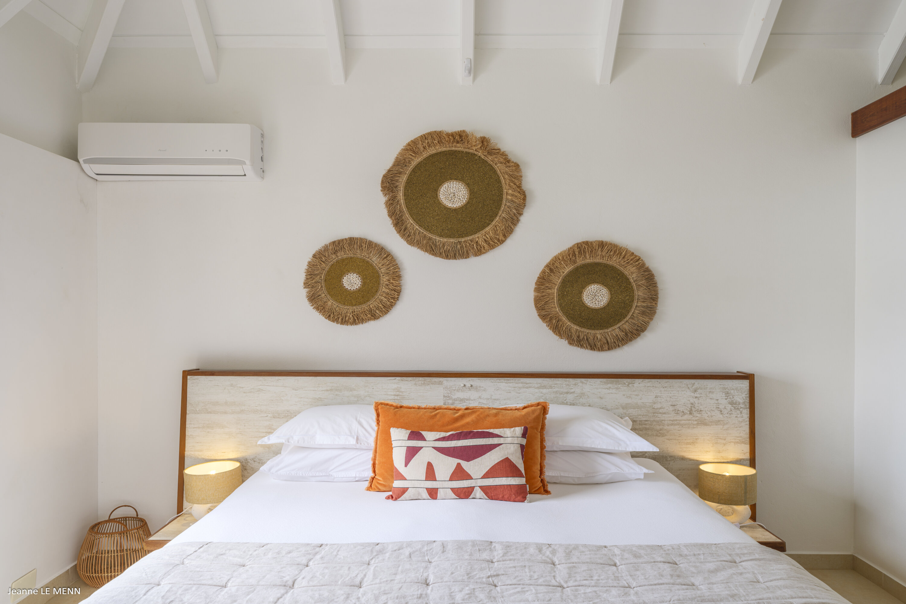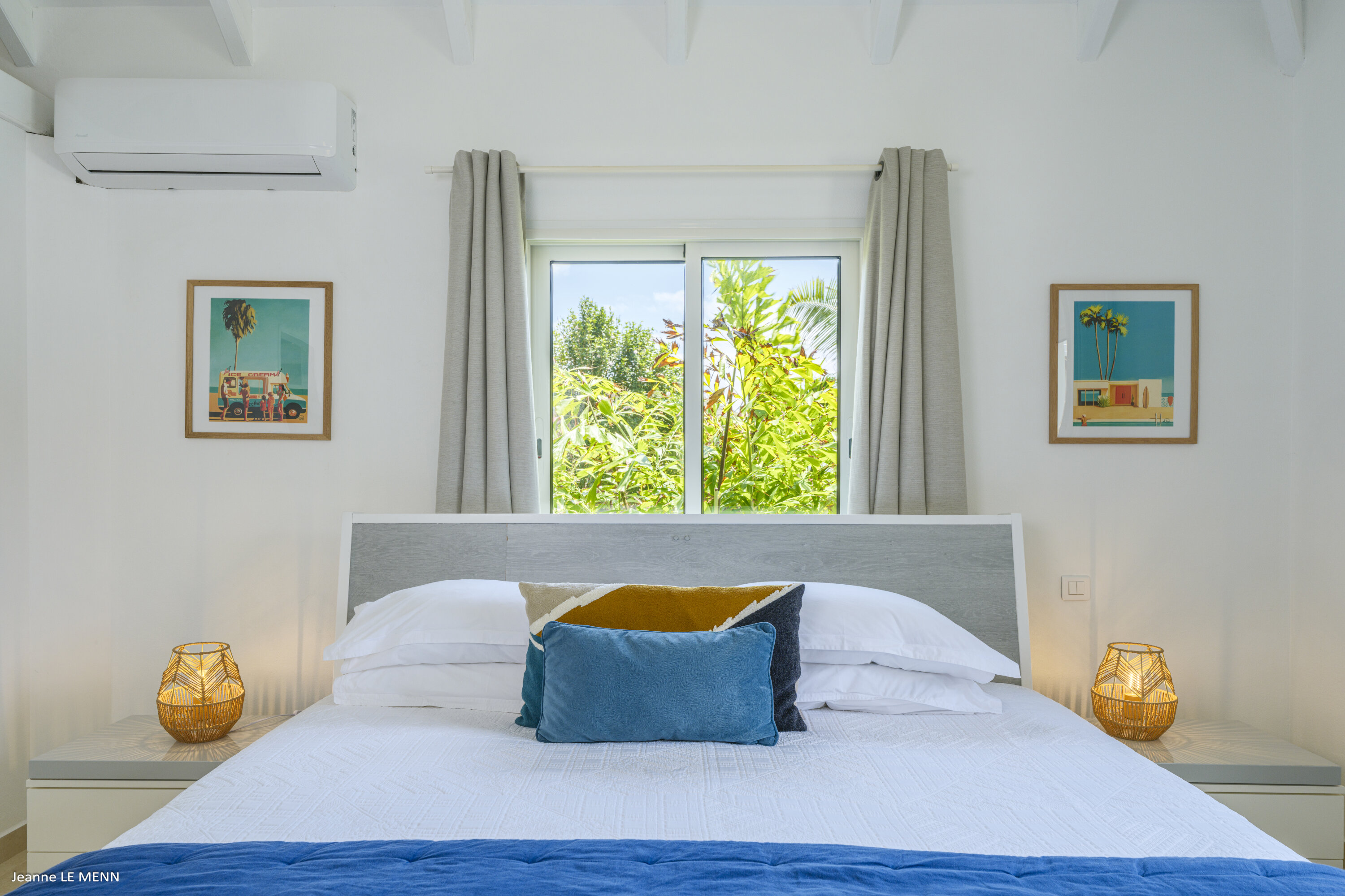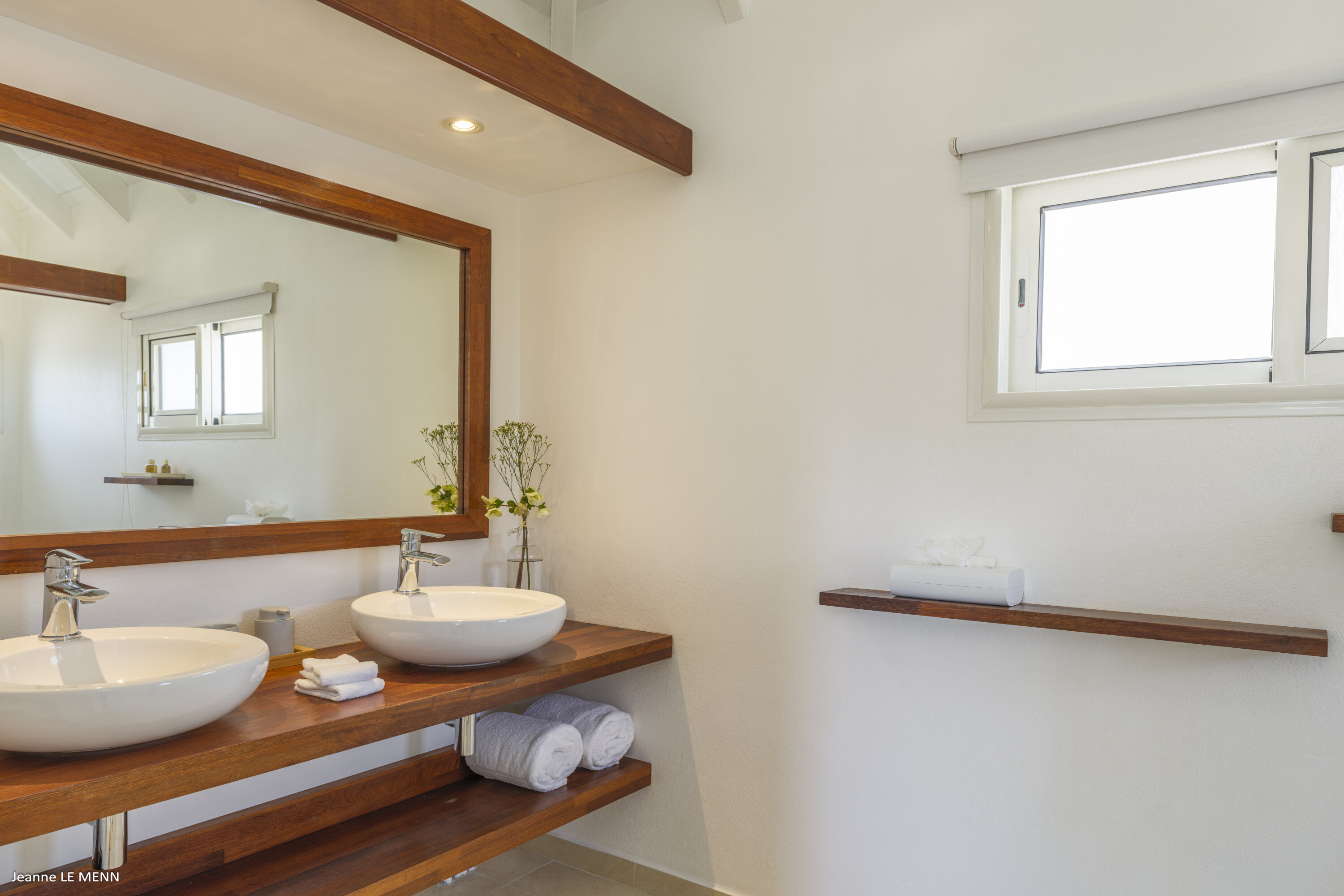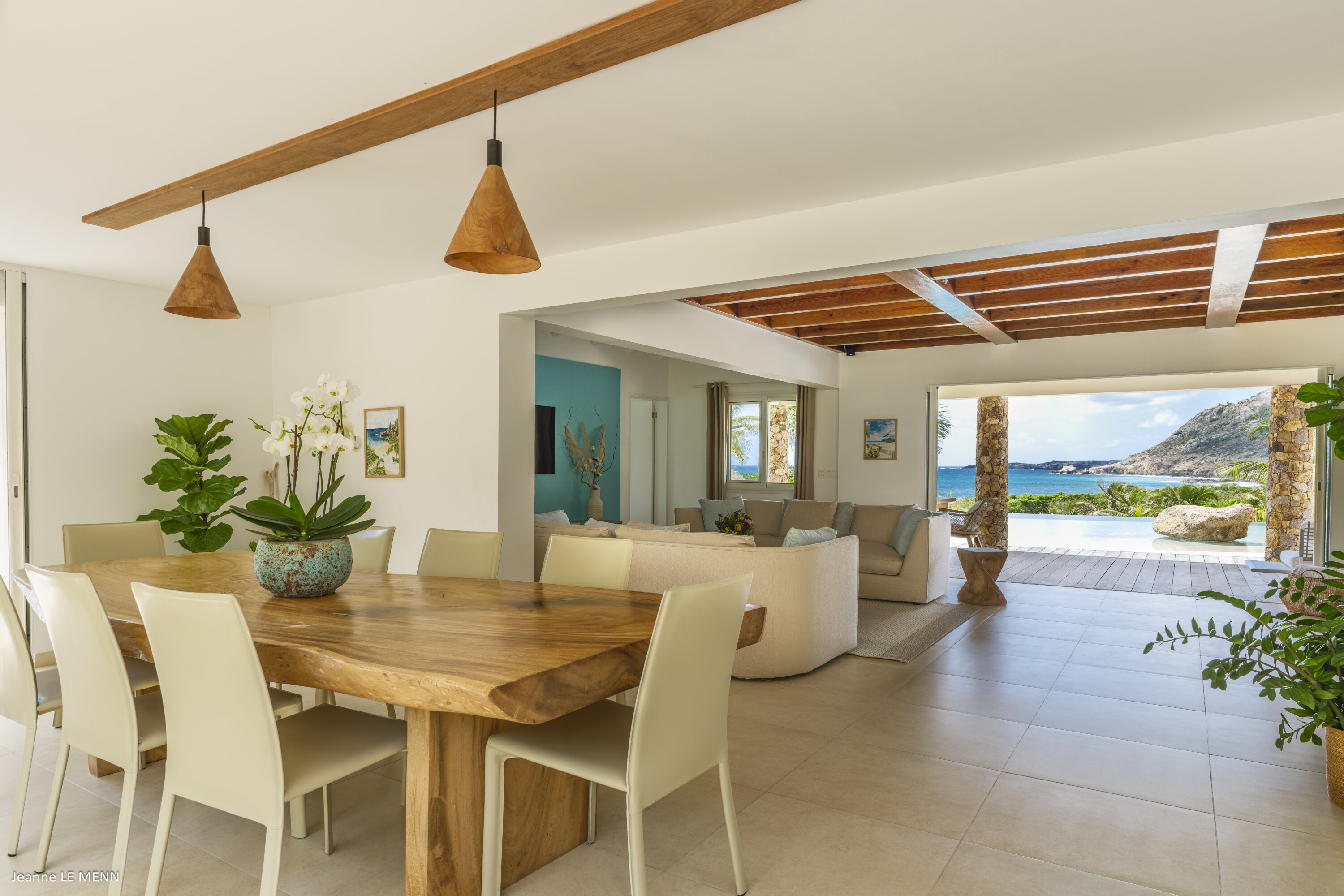 Castaway to Villa La Roche dans l’Eau (villa code: WV GFR), a modern 3-bedroom villa located in Grand Fond, St. Barts. This area is in a quiet part of the island and is an excellent choice for a relaxing island getaway. Contemporary and stylish, the interiors of the villa feature impeccable design and comfort. The creamy white color scheme contrasts with wooden ceilings, while modish and luxurious furnishings offer every comfort. Stripped back décor and several large houseplants add the finishing touches to the elegant property. Located on a rise in the landscape, from the grounds of La Roche dans l’Eau you can see the curving bay, rugged headland, and the shimmering Caribbean sea. The beaches at Grand Cul de Sac and Petit Cul de Sac are both just a short drive away. The great room in Villa La Roche dans l’Eau is home to the modern living room and dining area. The room opens to the outdoor terrace and pool. In the living room, minimalist décor complements the retro-style semicircular sofa, an ideal spot to sink in and enjoy the ocean breeze blowing through the house. A large TV lets you unwind with your favorite TV series or the latest film. The well-equipped kitchen has everything you’ll need to create gourmet meals during your stay. Our concierge can organize grocery pre-stocking or delivery, catered meals, or arrange private chef service for a special occasion. The indoor dining area has seating for up to eight guests, a fine setting for festive dinners. For those who prefer to dine alfresco, another table is under the covered terrace outside. There are 3 bedrooms at Villa La Roche dans l’Eau, spread across the villa to ensure peace, quiet, and privacy for guests. Each room has an ensuite bathroom with a spacious shower. On the second level is the master suite, accessed by an exterior staircase. The unique loft-style roof adds a rustic touch, while a small sitting area lets you relax in seclusion. On either side of the living room downstairs are the other two bedrooms, each with a plush queen-size bed. The remarkable outdoor living areas at Villa La Roche dans l’Eau will sweep you off your feet. A covered area offers space to lounge in the shade, while the sunny terrace is ideal for soaking up the island rays on the loungers. The centerpiece of the property is the gorgeous swimming pool, an inviting place to spend your day. Featuring a graduated slope into the water and a current system, lazing in the pool simulates being at the beach. The rock in the middle of the water is what inspired the villa’s name, which translates to “Rock in the Water”. As the afternoon begins to fade, retreating to the lounge area on the covered deck is encouraged. It’s a fabulous spot to enjoy a cocktail with the sunset, watching as the rosy gold colors light up the sea and sky. In the distance, the twinkling lights of St. Kitts coming to life are alluring. Out the back of the house is another terrace area with a garden. A relaxing and quiet area, it’s ideal for settling in with a good book or your morning coffee. For days on the beach, swinging around to the north side of the island to either Petit Cul de Sac or Grand Cul de Sac is an easy 5-minute drive. For something more adventurous, a 25-minute trek along the headland brings you to the “Washing Machine”, several natural rock pools embedded into the coastline. During the December holidays, the villa rents at the full occupancy rate regardless of how many bedrooms are used.Please fill out the form to begin your inquiry and we will connect you with a seasoned villa rental specialist.