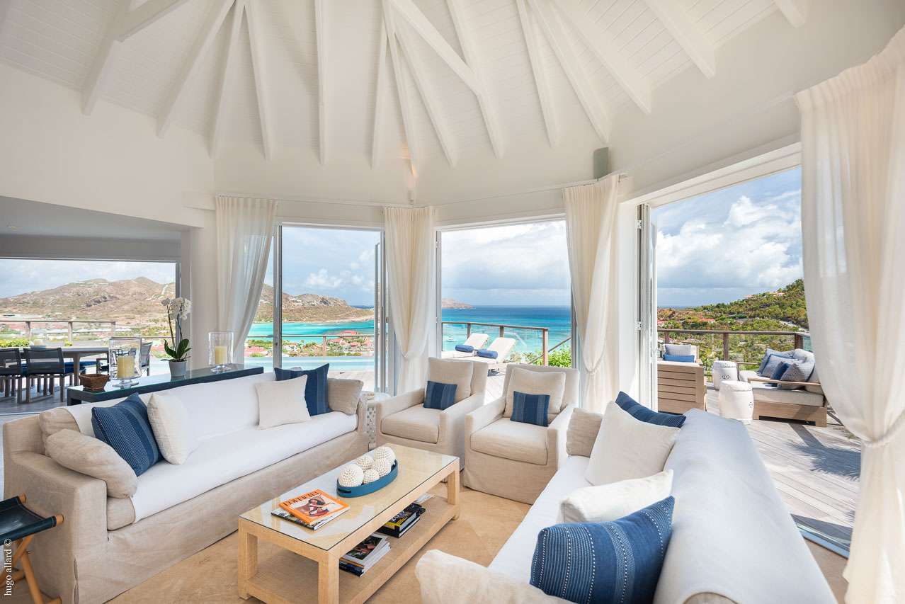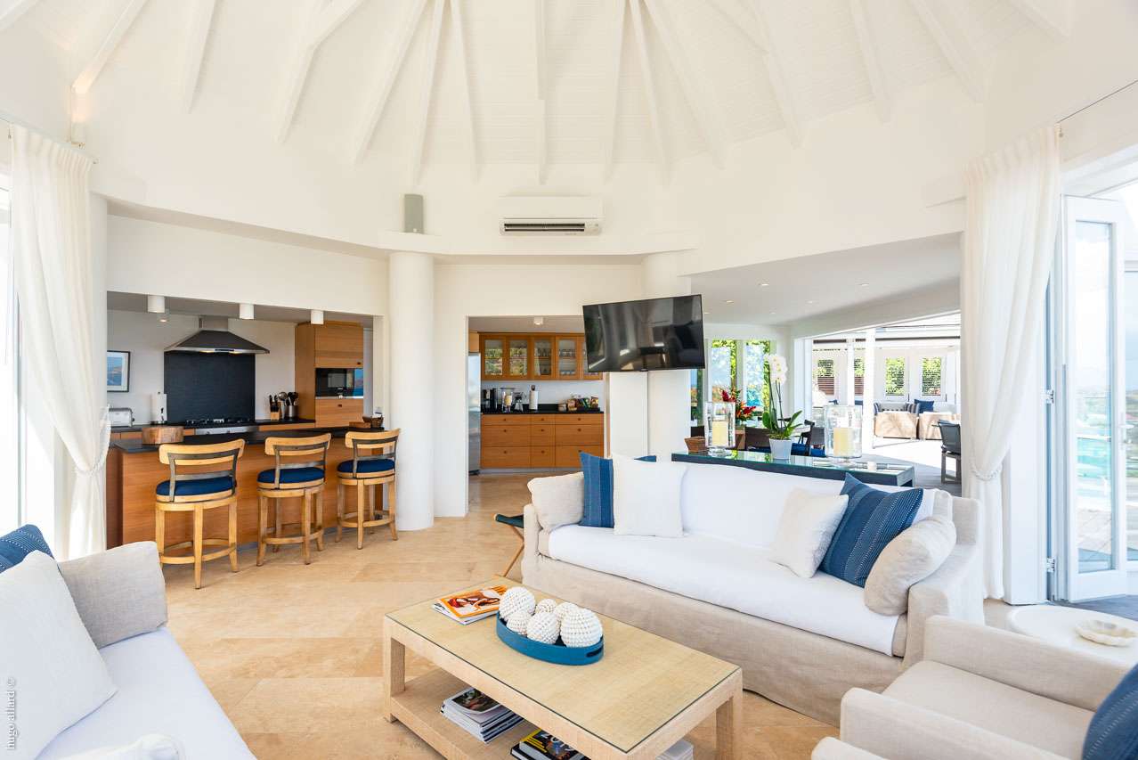 The living room faces the ocean, featuring a wall of windows to take advantage of the view. There are comfortable white sofas and armchairs for sinking in, relaxing, and forgetting the rushes of modern life, enjoying incredible vistas over the hills and ocean.
