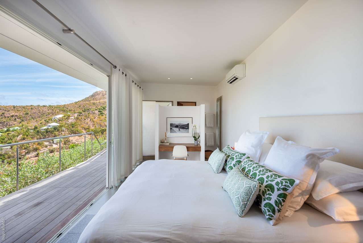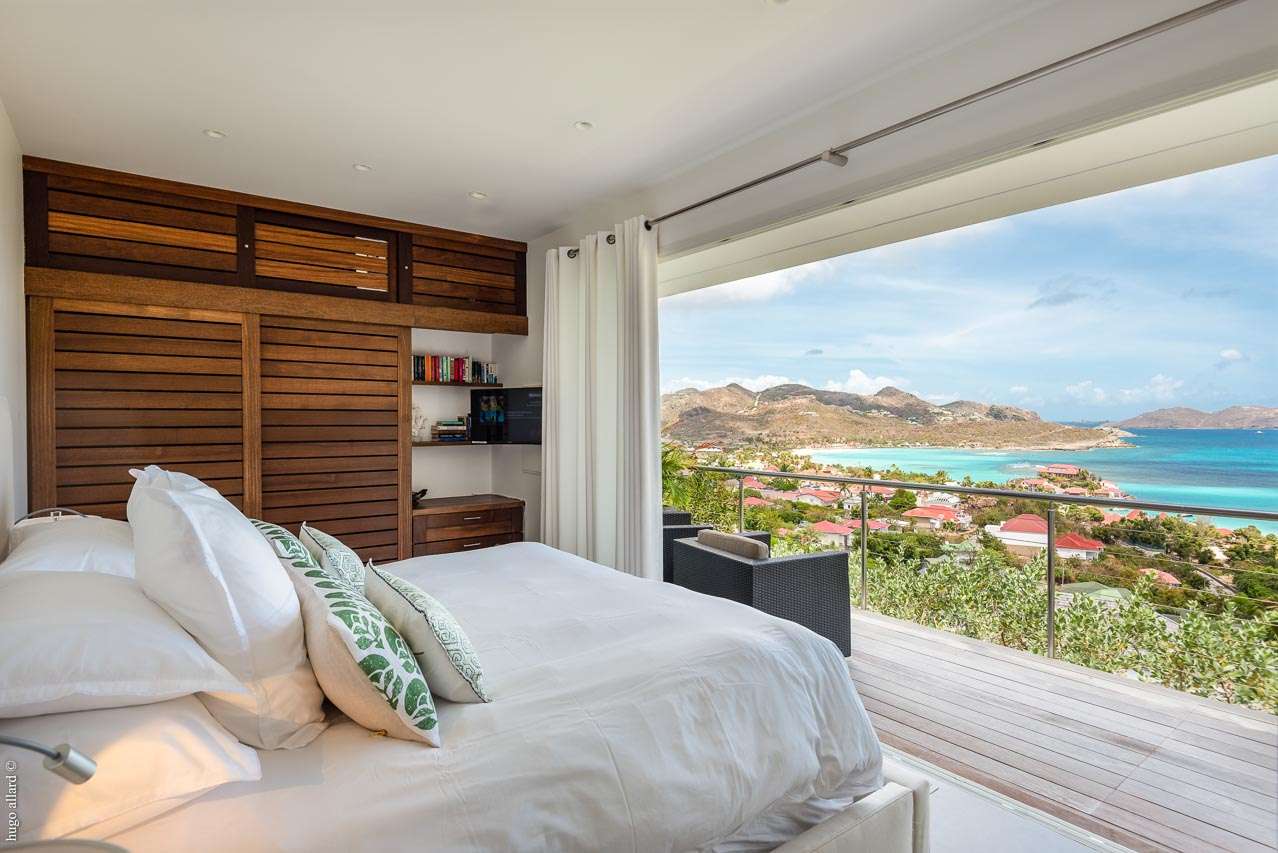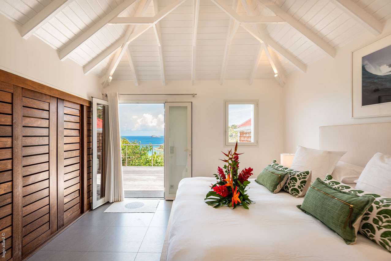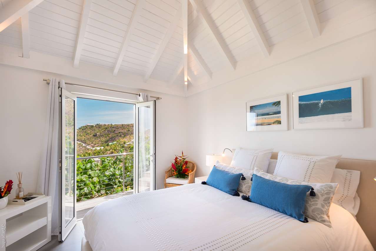 The fourth bedroom is on a lower level, accessed via a staircase by the swimming pool. This room is ideal for those who are after a bit more privacy; it features a king-sized bed and incredible views over St. Jean below.