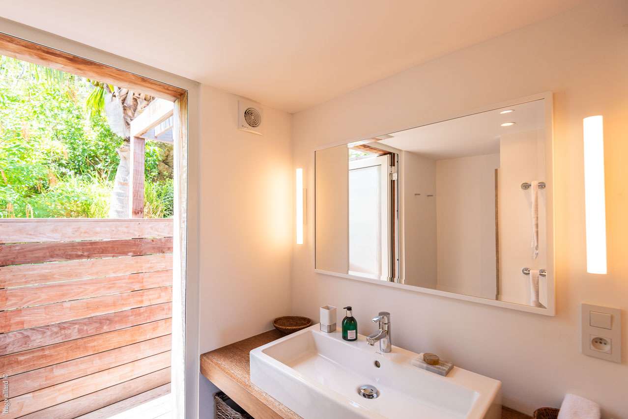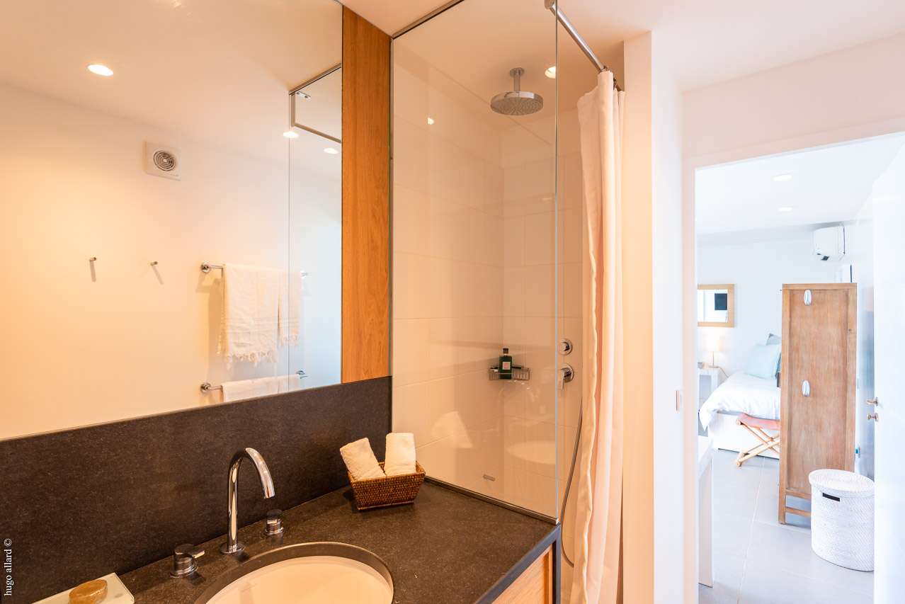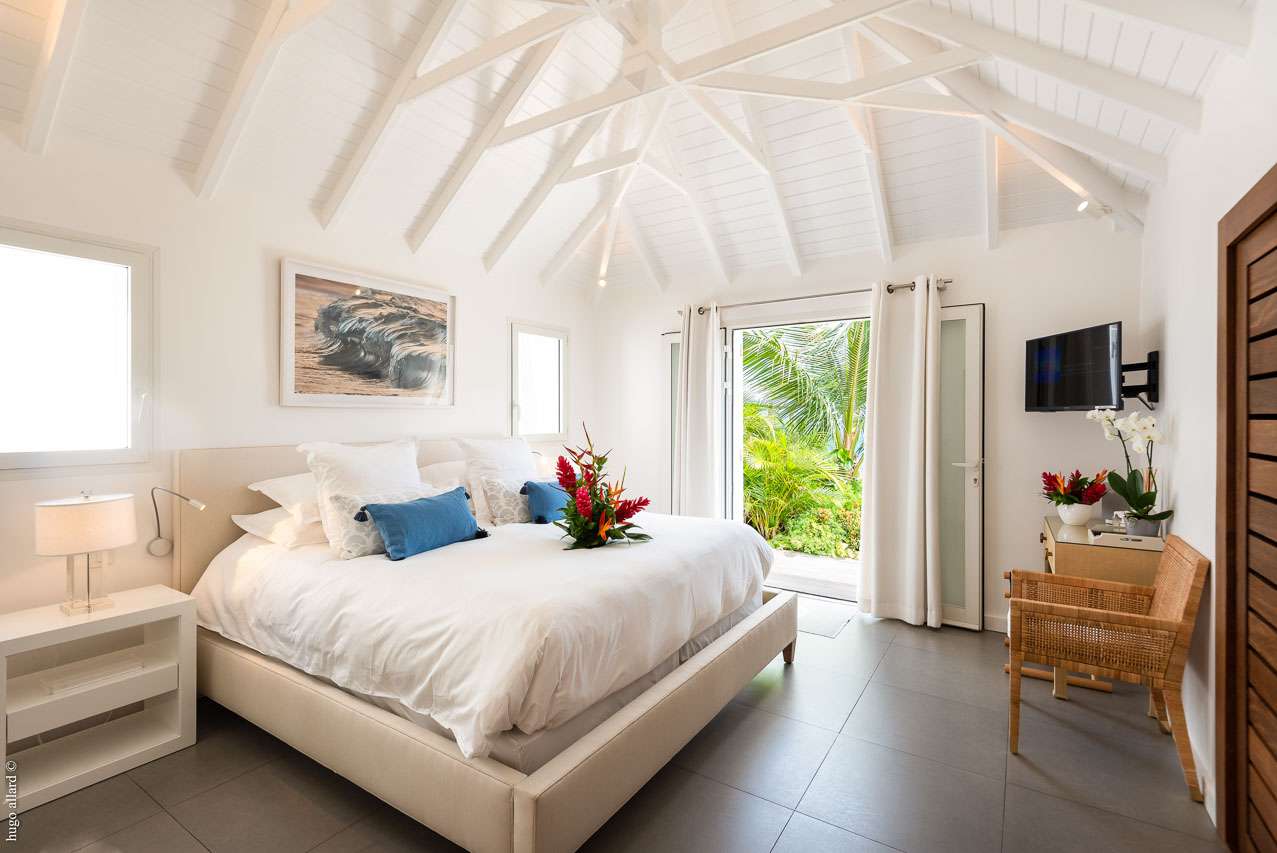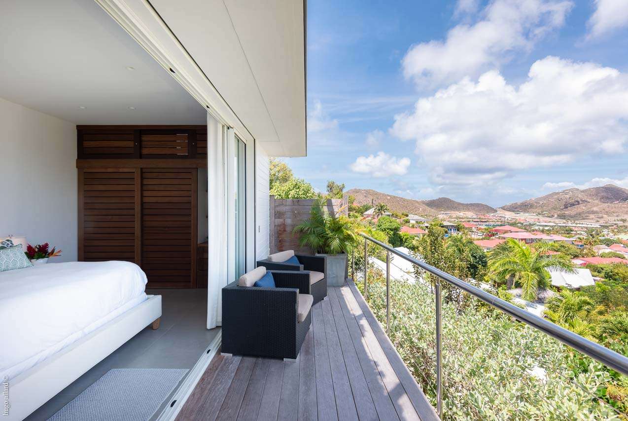 The fourth bedroom is on a lower level, accessed via a staircase by the swimming pool. This room is ideal for those who are after a bit more privacy; it features a king-sized bed and incredible views over St. Jean below.